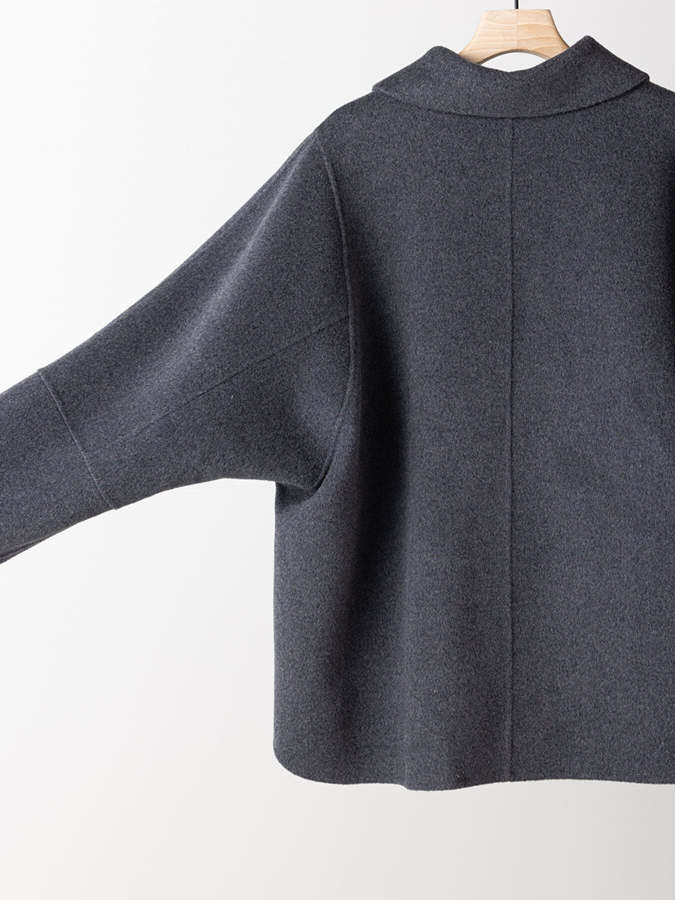 リバー仕立ての衿付きミドル丈コートです。 リバー仕立てとは、2枚の生地を貼り合わせ、手作業でまつり縫いをすることで、縫い目が見えない洗練されたデザインになる仕立てで、軽くて柔らかい着心地が特徴です。