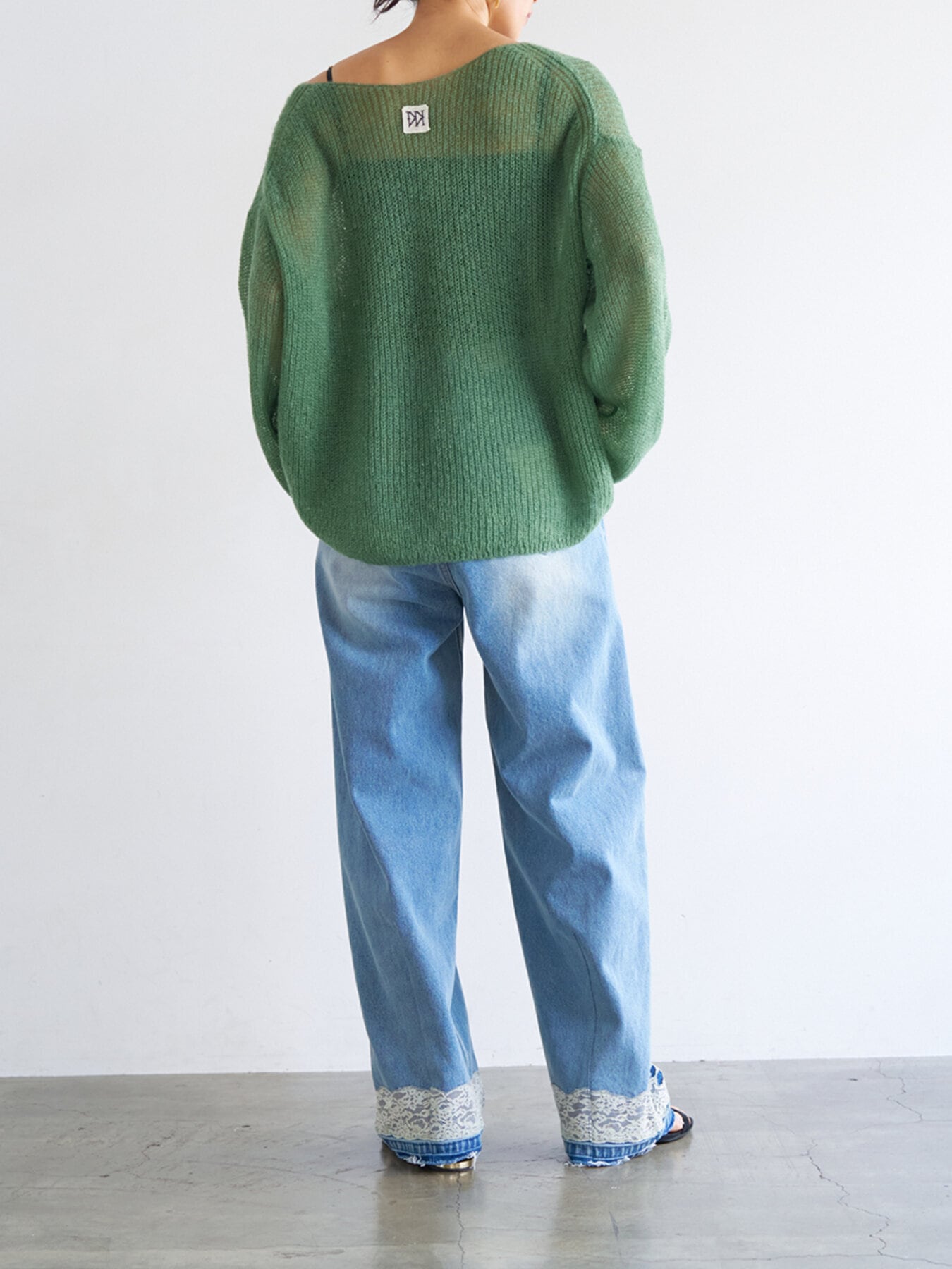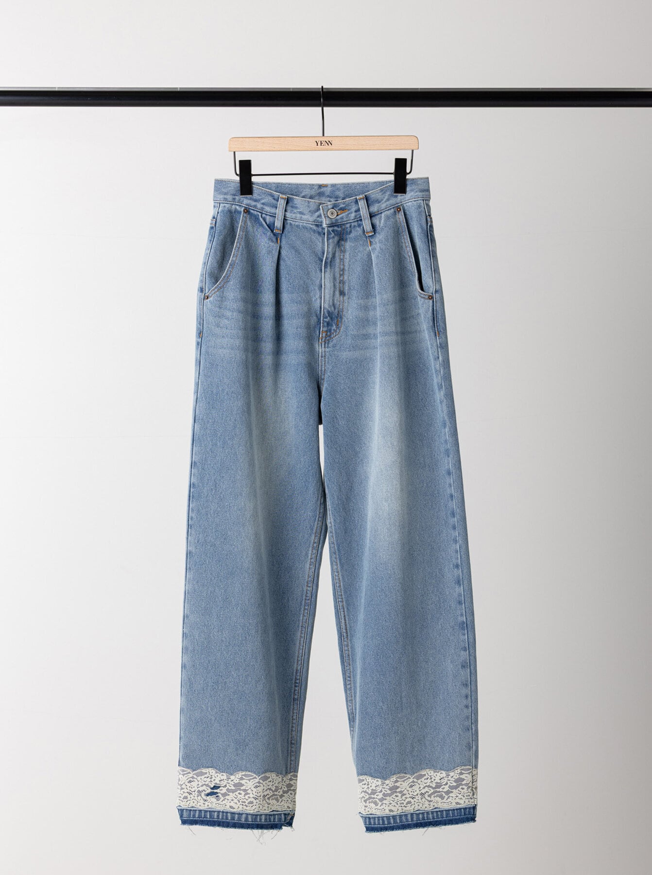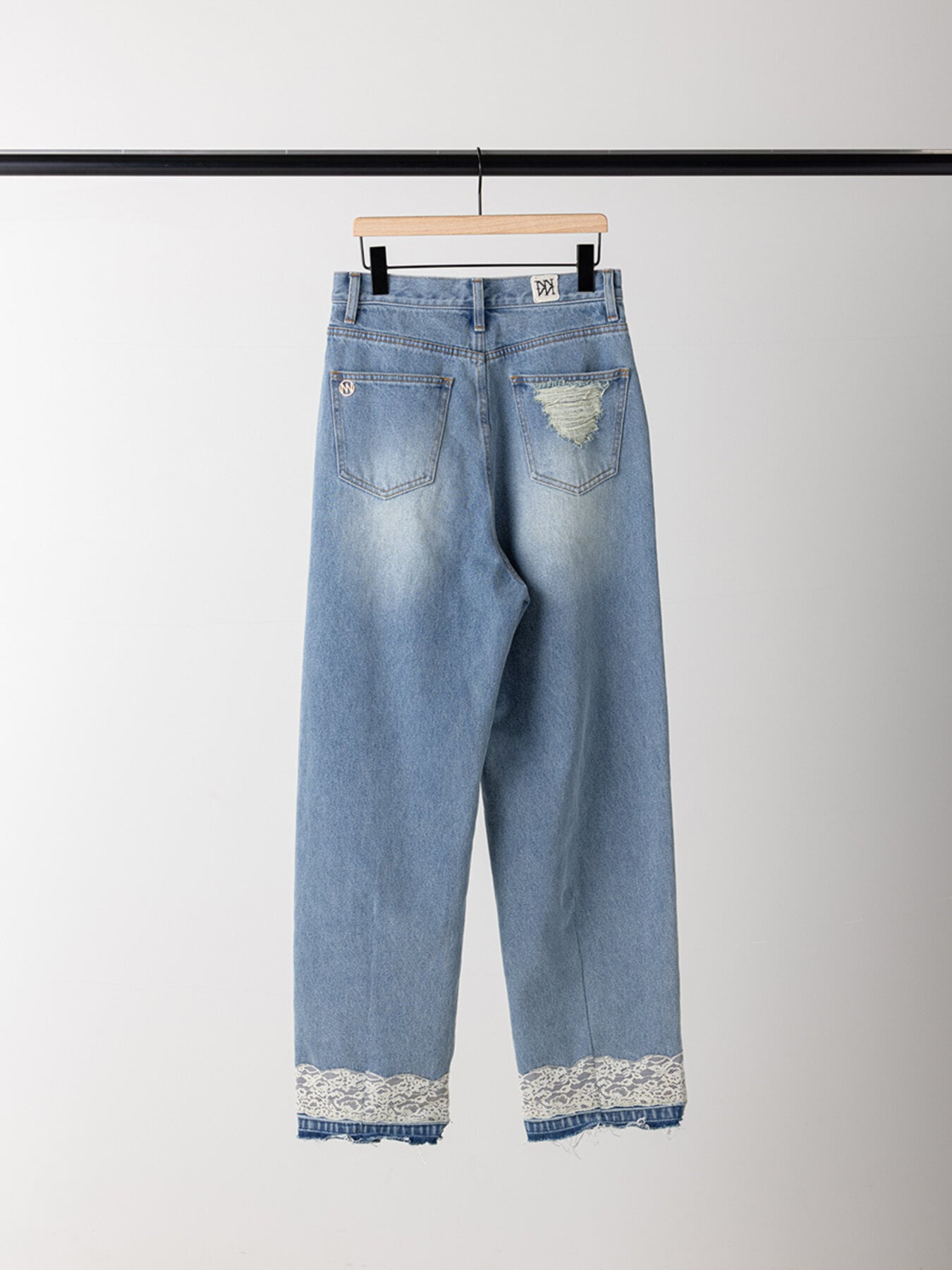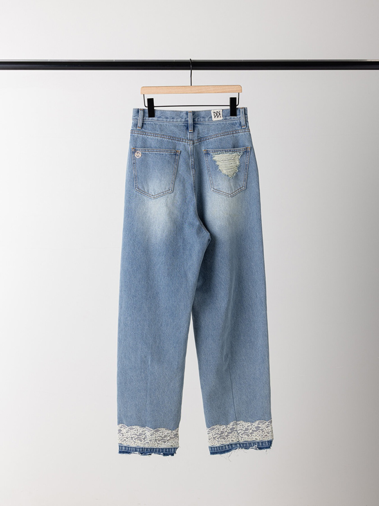 無骨な印象のデニムにフェミニンなレースが相反するデザインで、レースを付けてから加工をすることでレースとデニムの風合いを馴染ませたビンテージ感がポイントです。