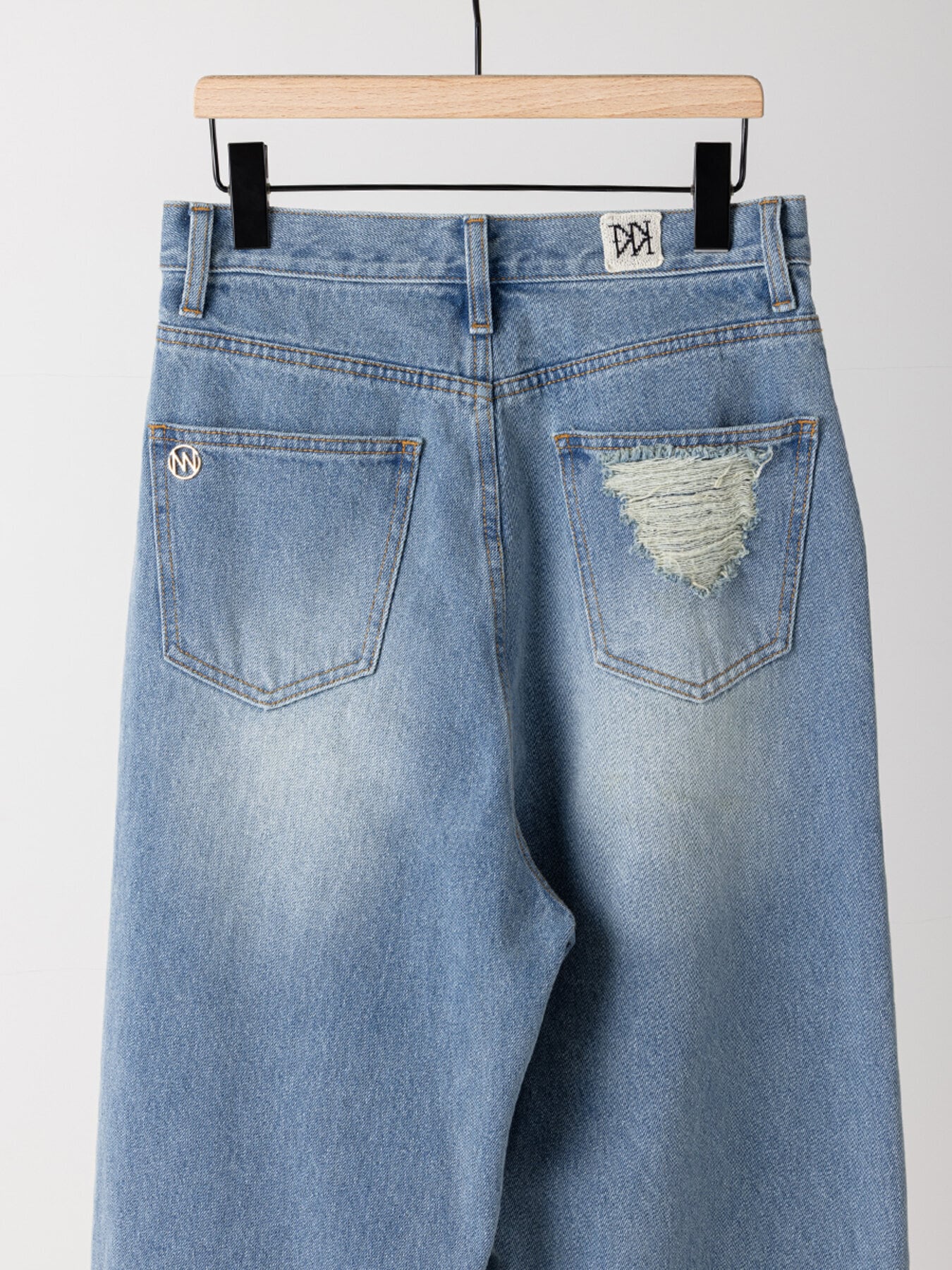 後のベルトとポケットには金属チャームやニットパッチを付けてカスタマイズデニム風に仕上げています。