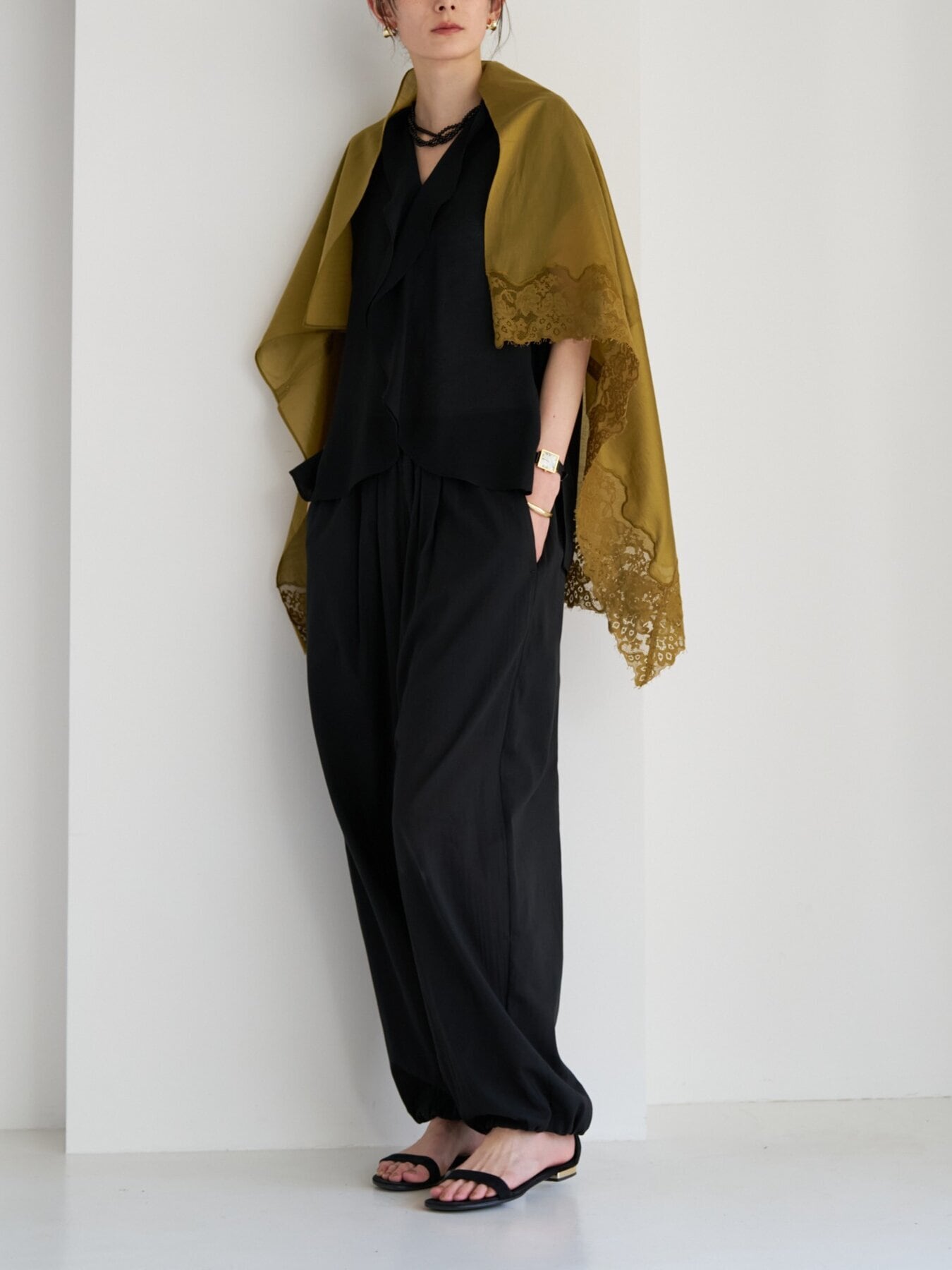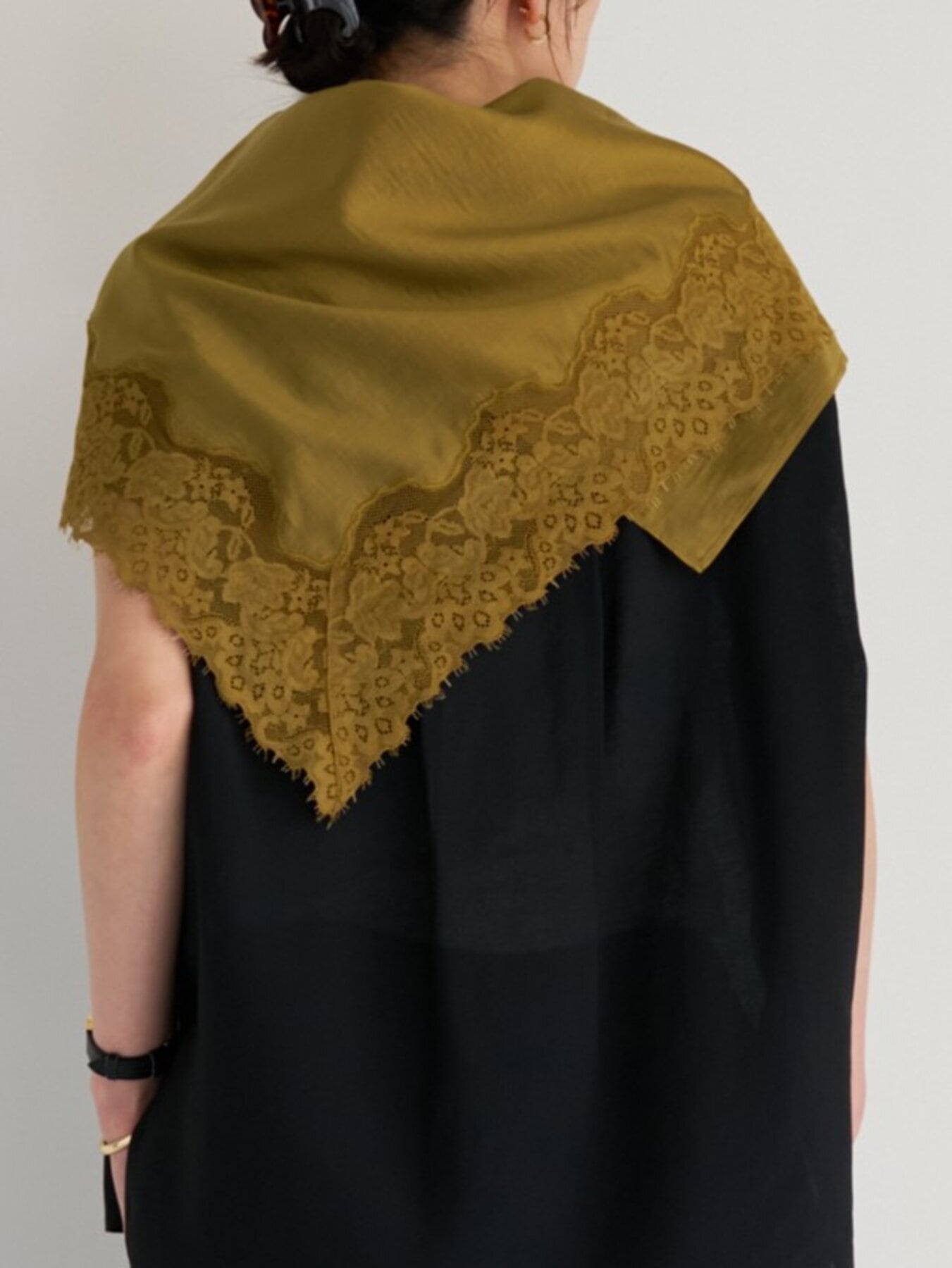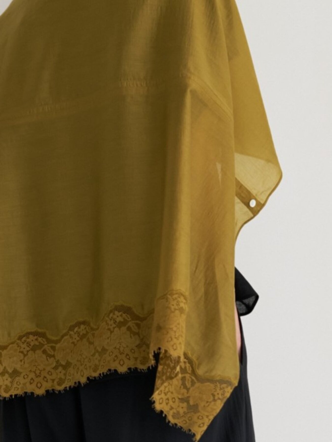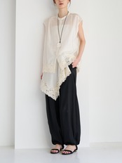 透け感のある生地と同色染したレースの陰影が重なり、奥行きのあるニュアンススタイルを演出します。