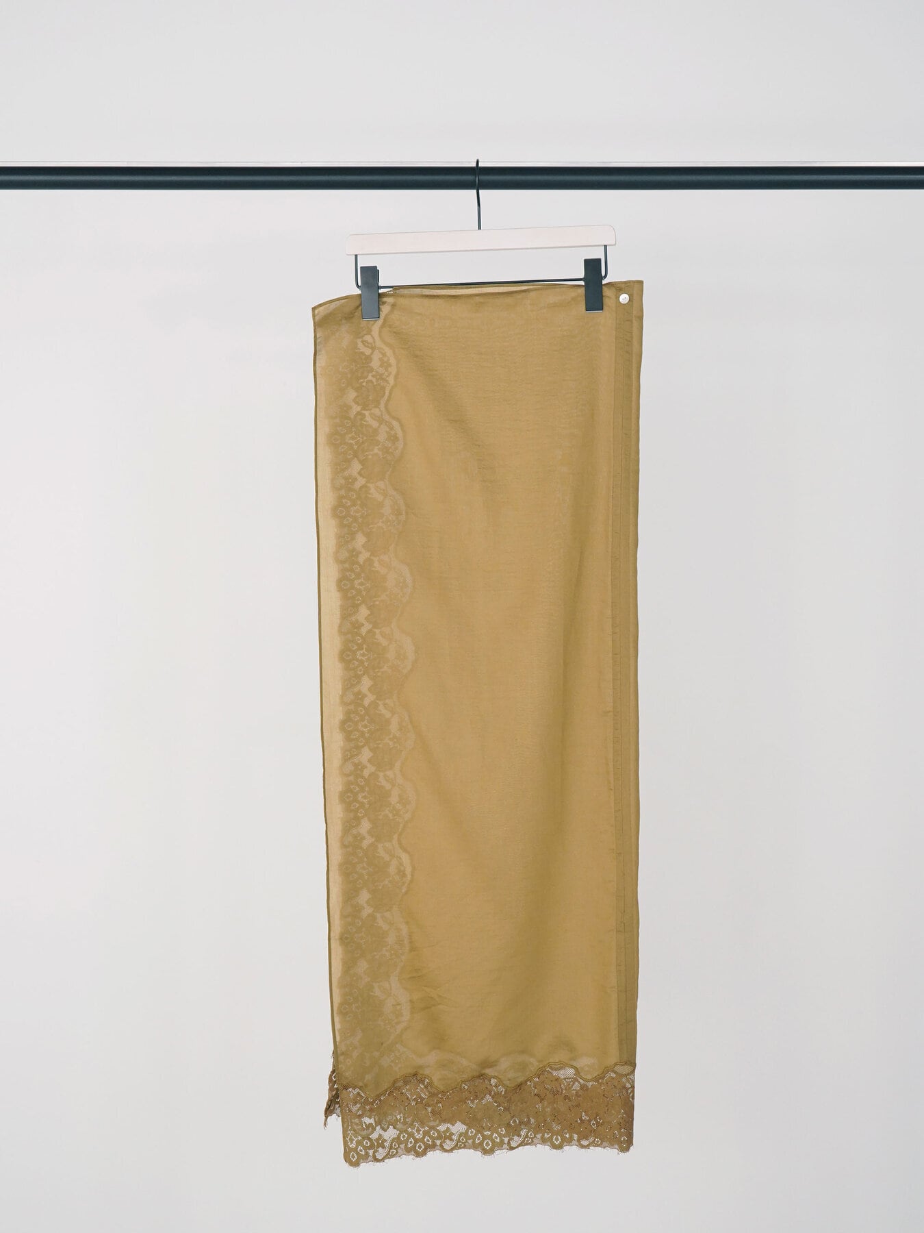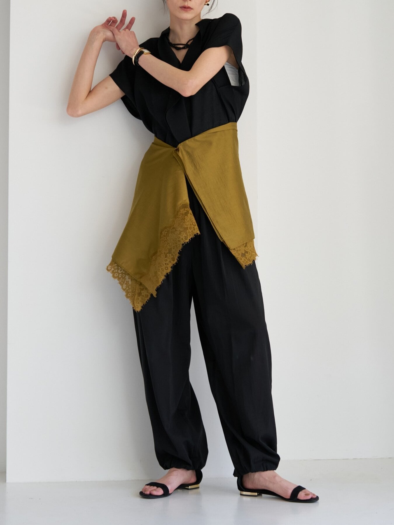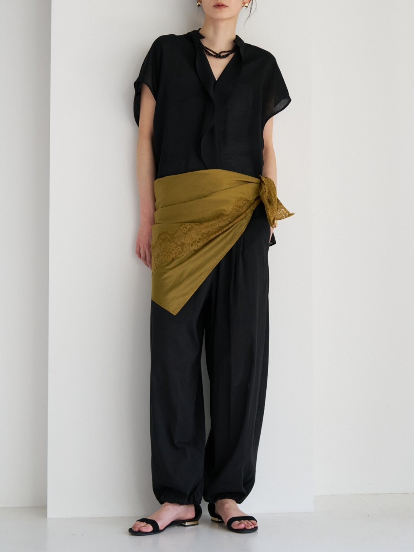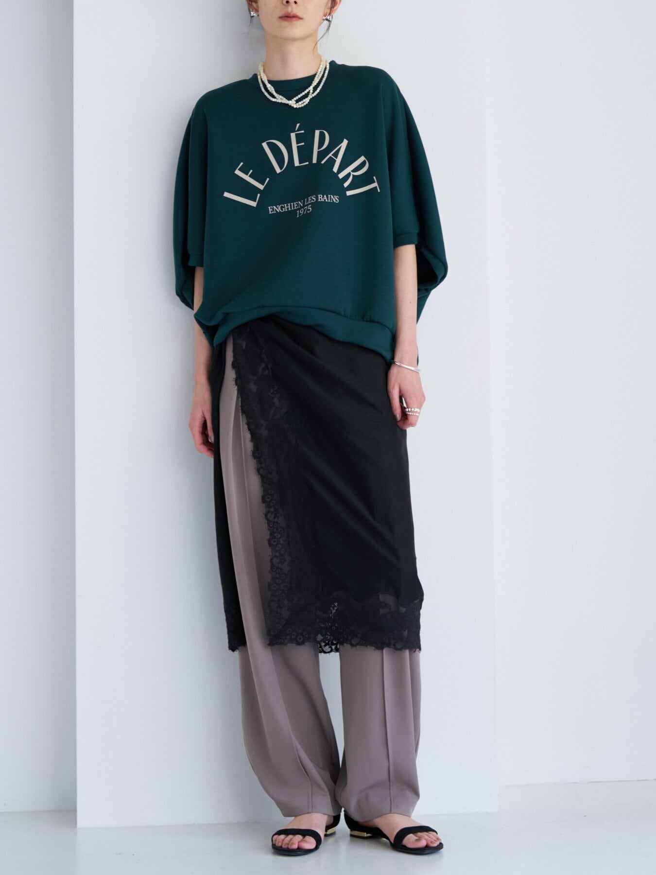 透け感のある生地と同色染したレースの陰影が重なり、奥行きのあるニュアンススタイルを演出します。