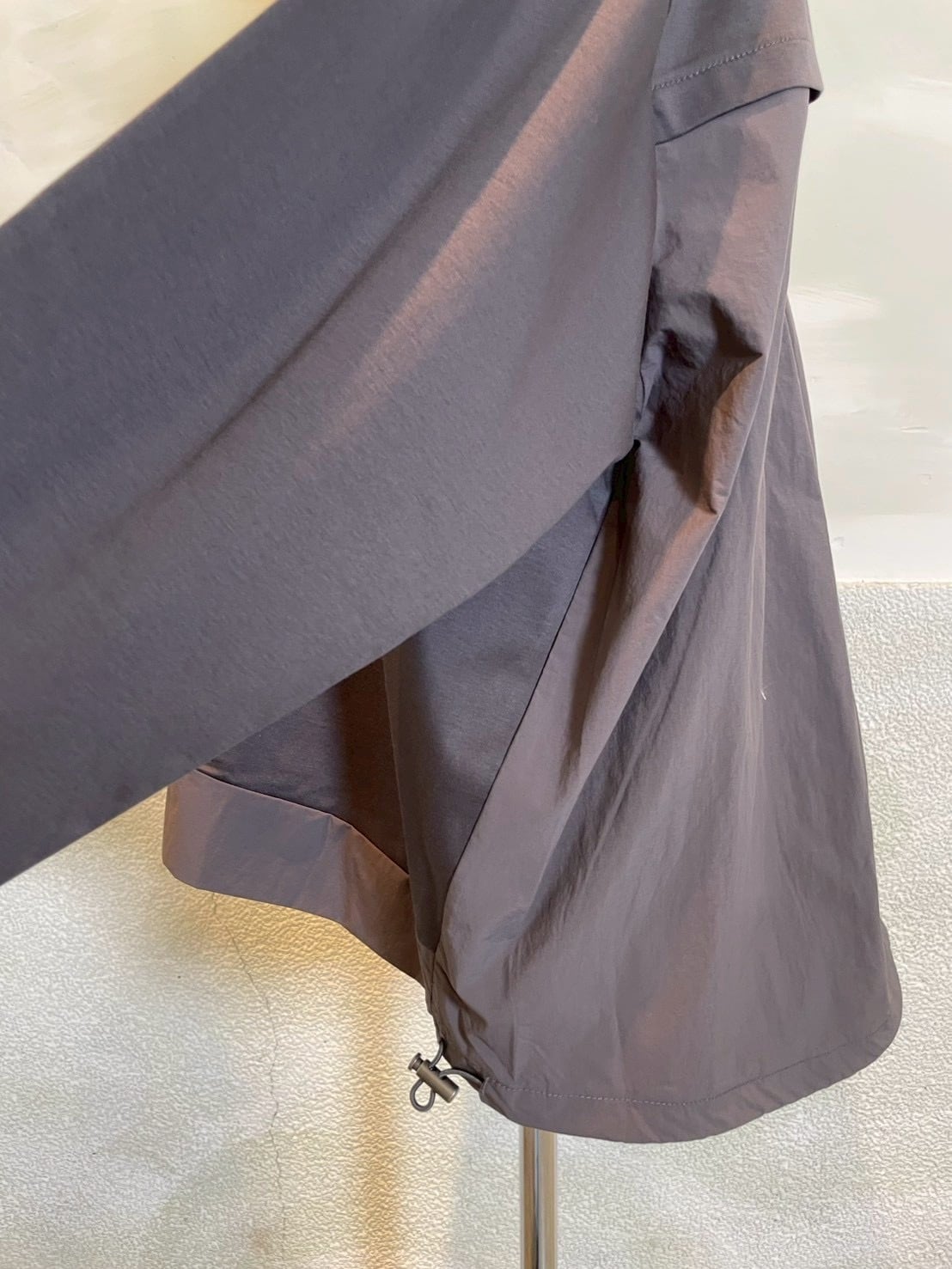 裾にはアジャスターと丸ゴムをいれているので、ぎゅっと絞ってバルーンスタイルにし、デザインの変化を楽しめます。