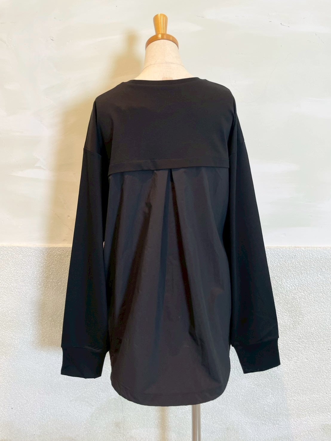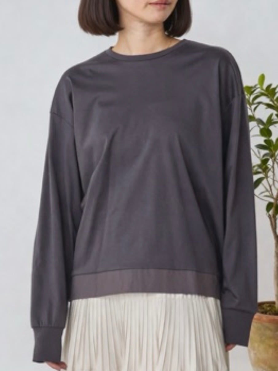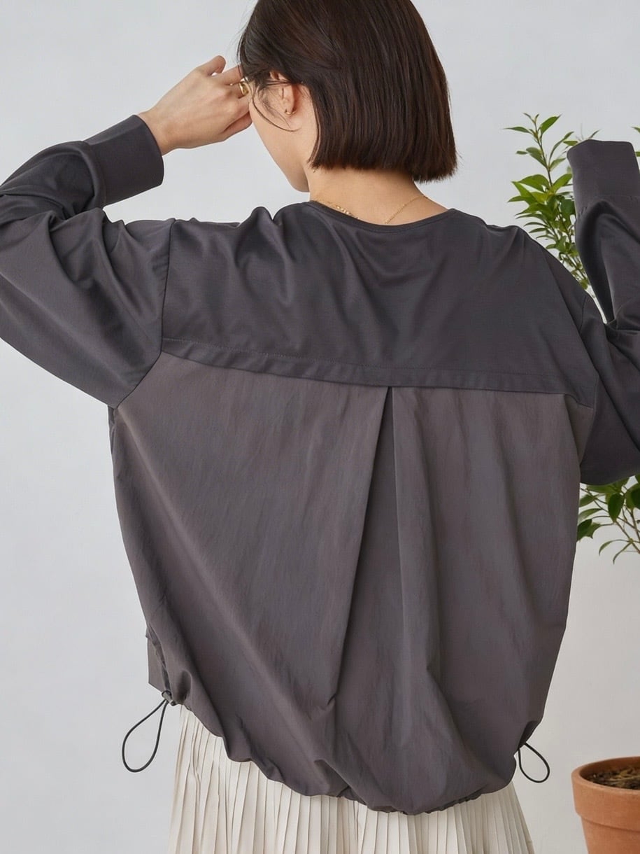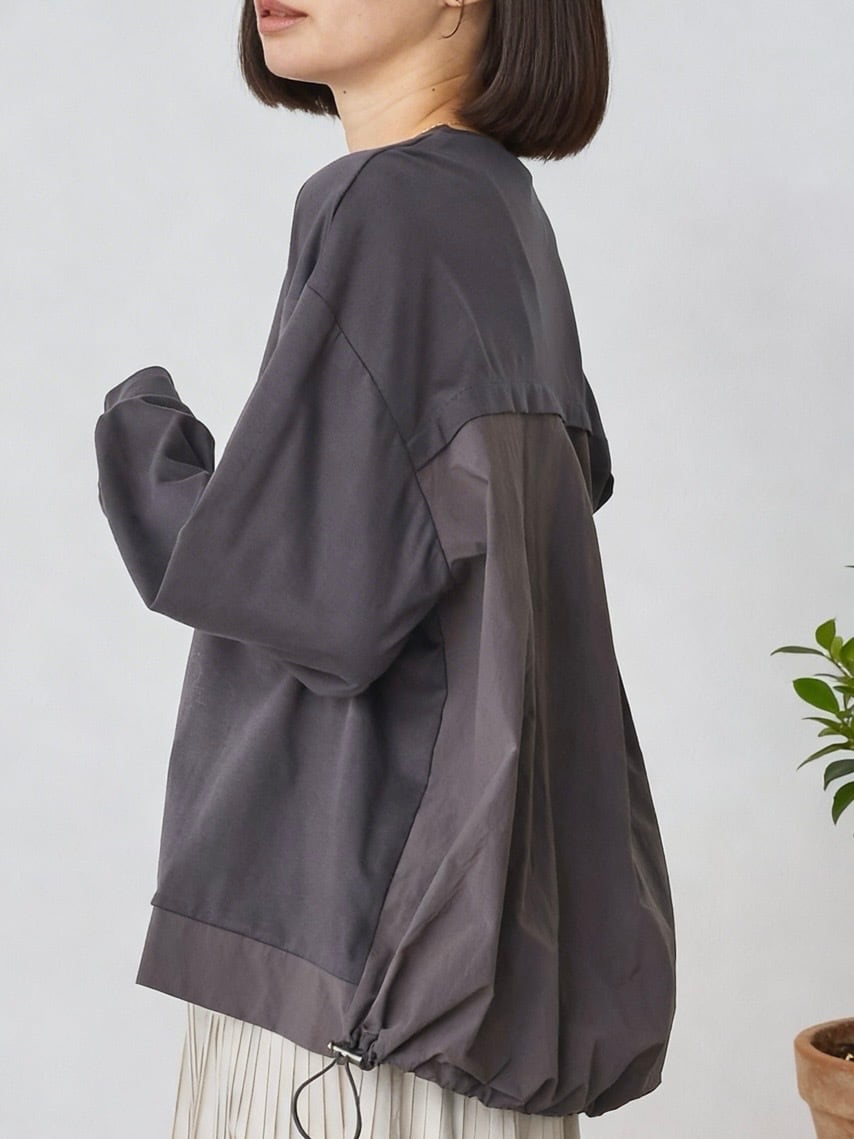 裾とバックスタイルに同色系の布帛をドッキングしたプルオーバー。