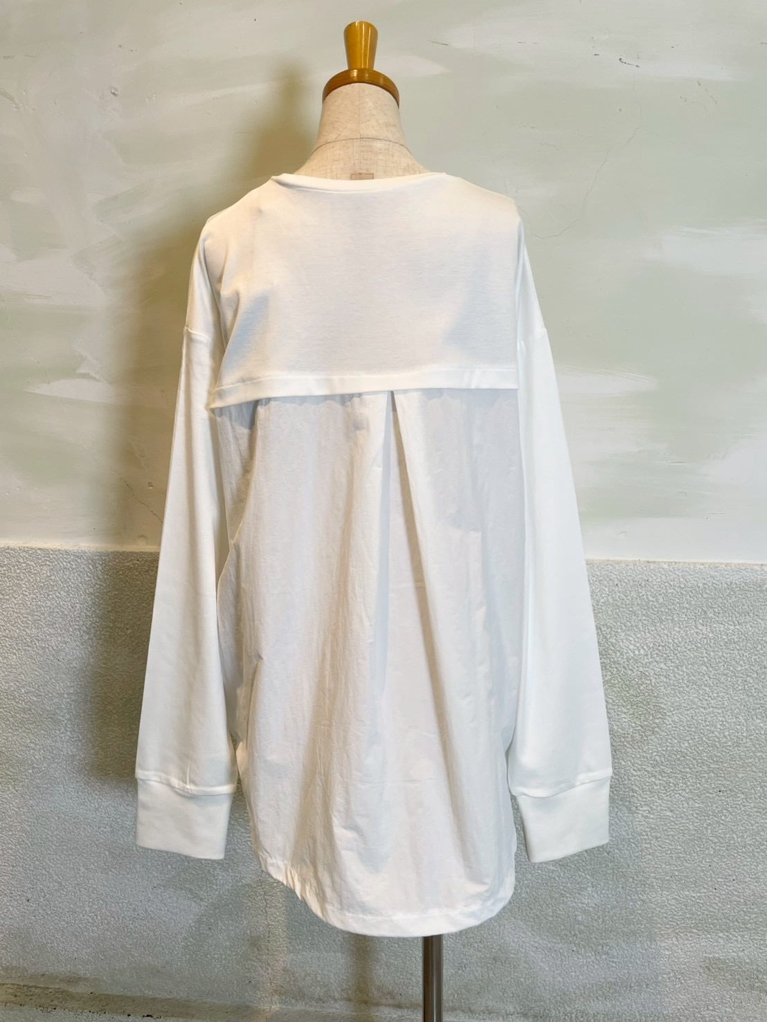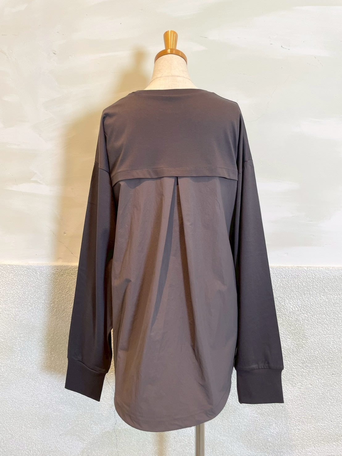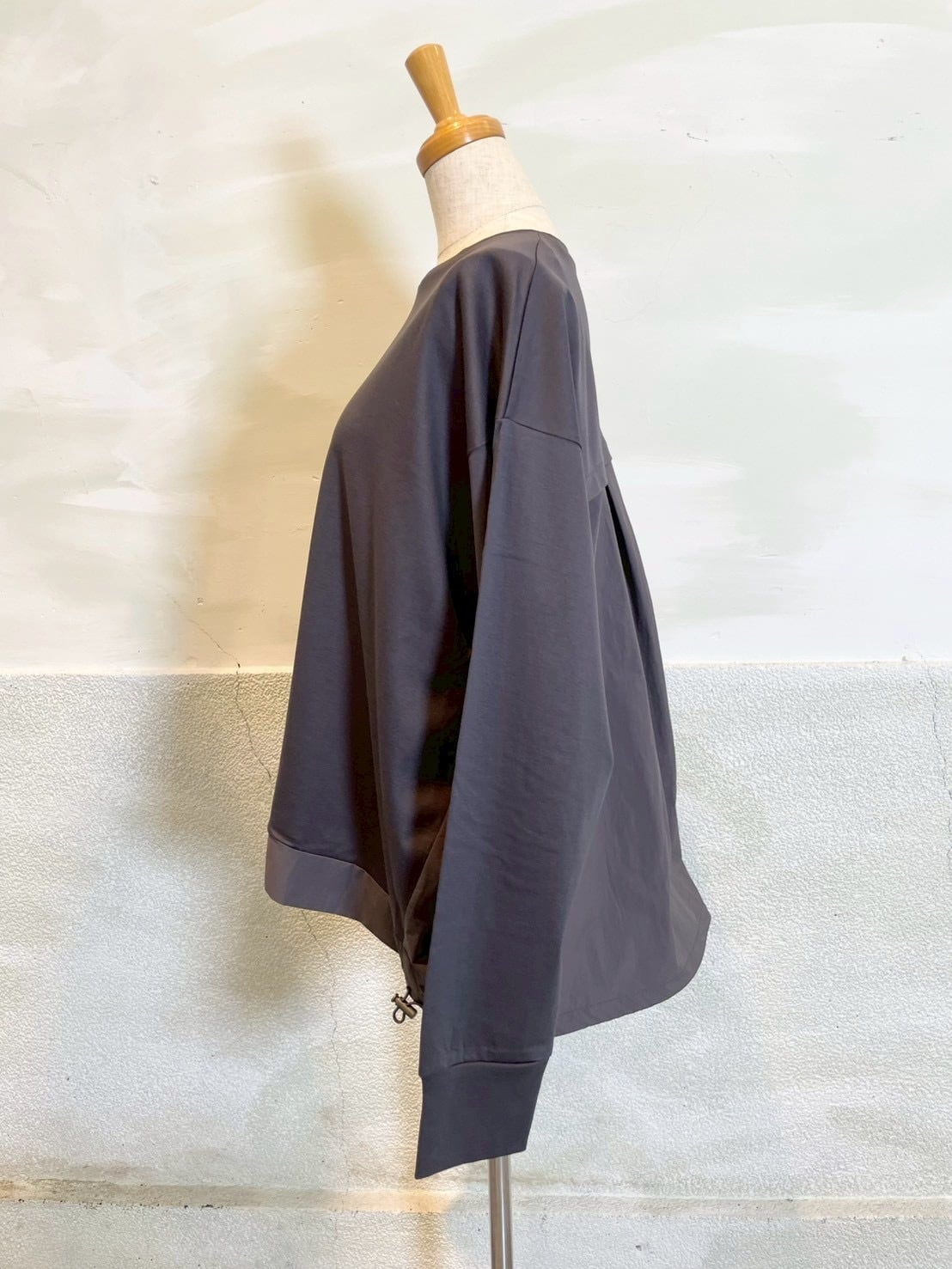 裾とバックスタイルに同色系の布帛をドッキングしたプルオーバー。