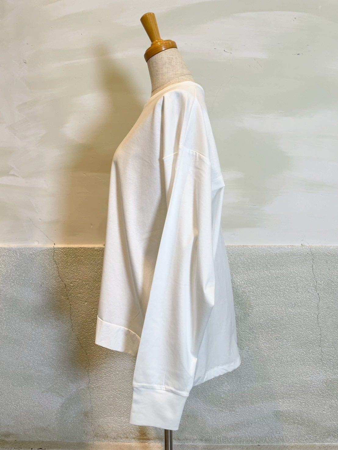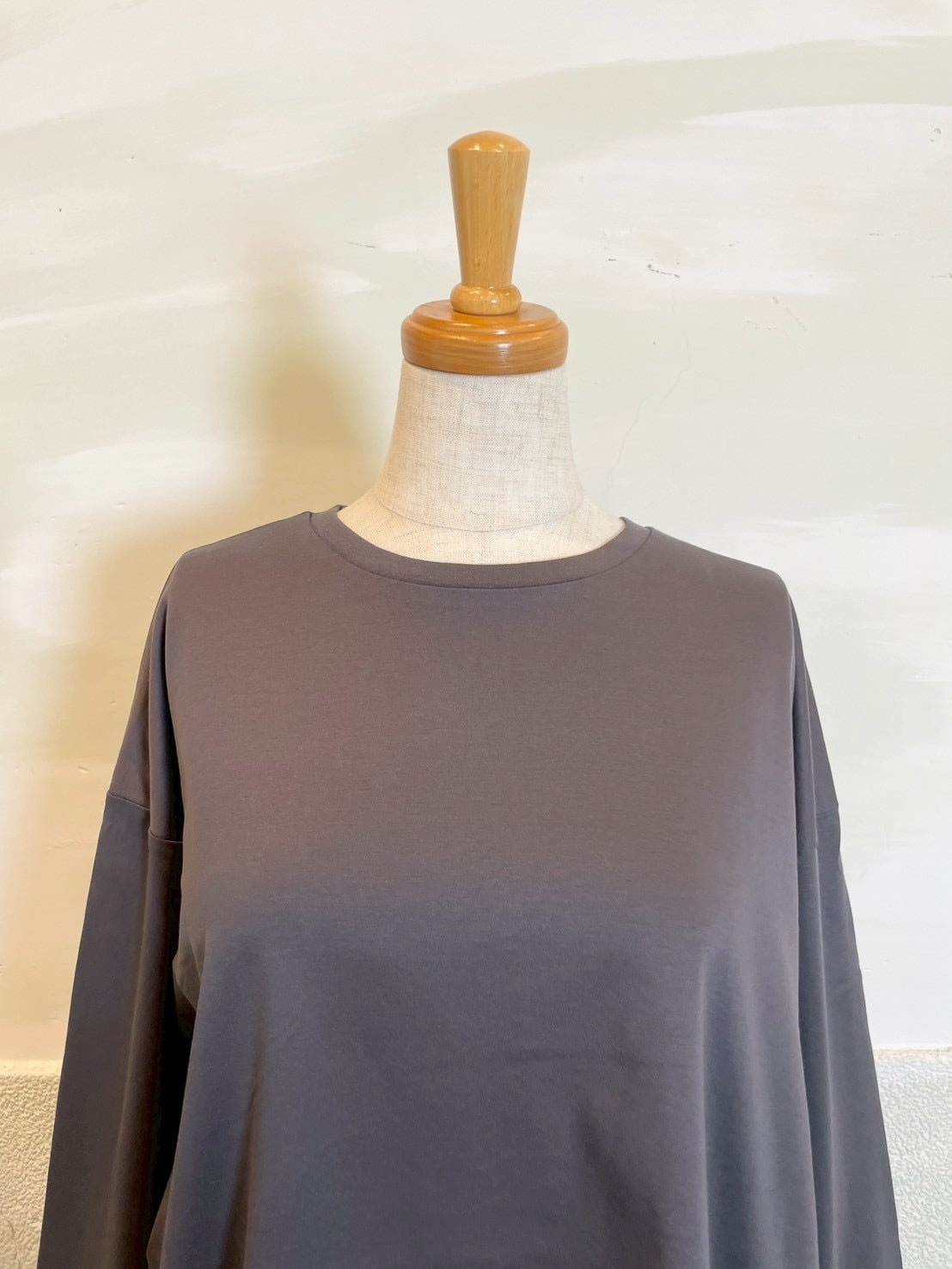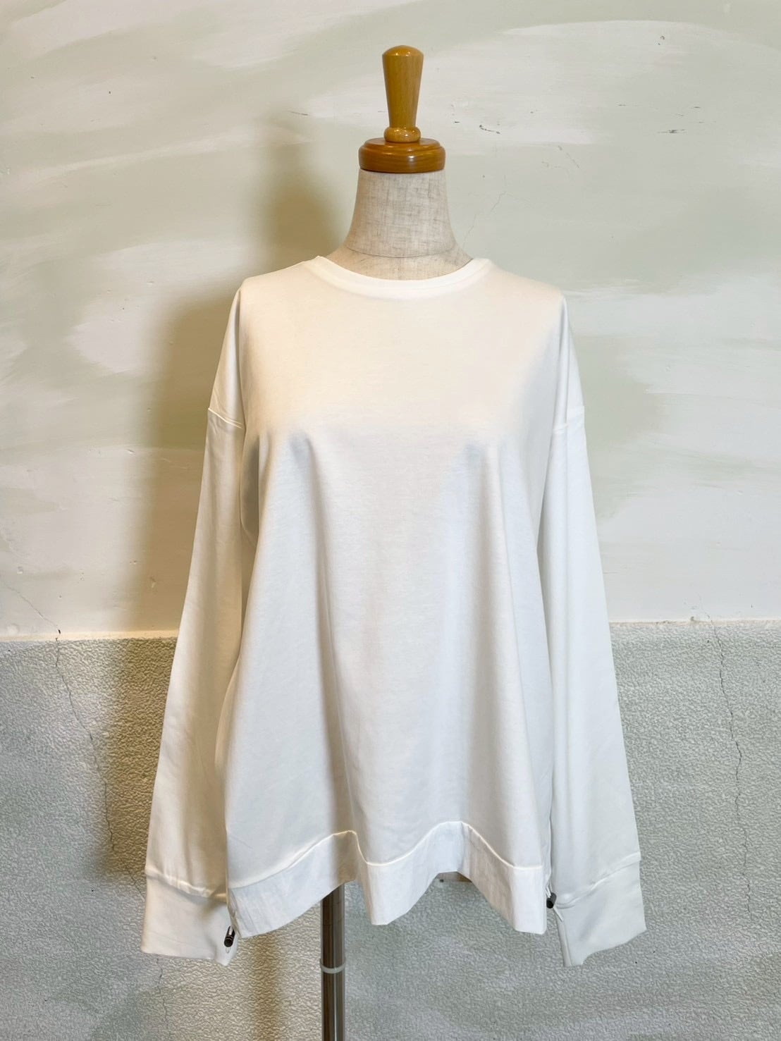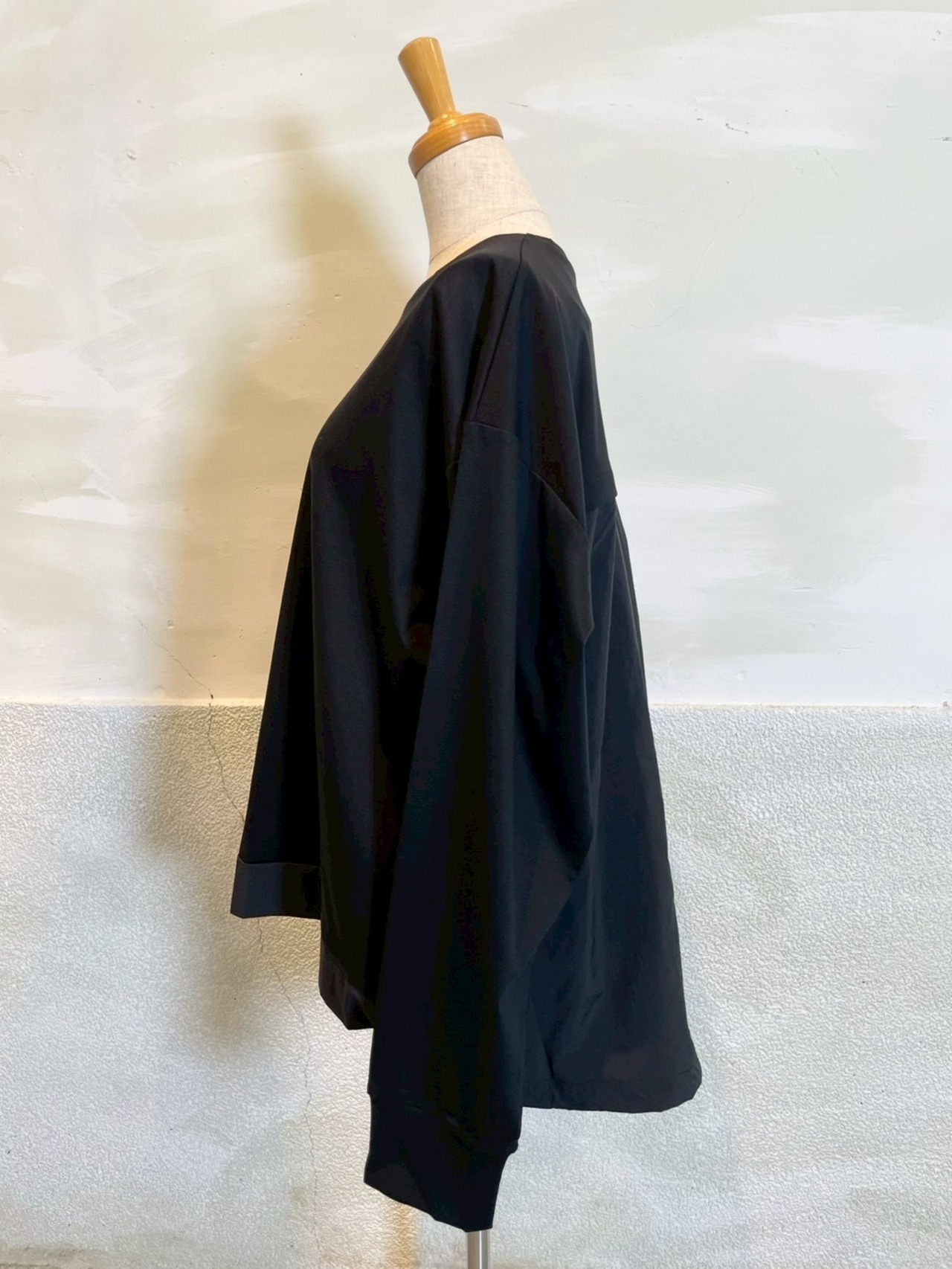 裾とバックスタイルに同色系の布帛をドッキングしたプルオーバー。