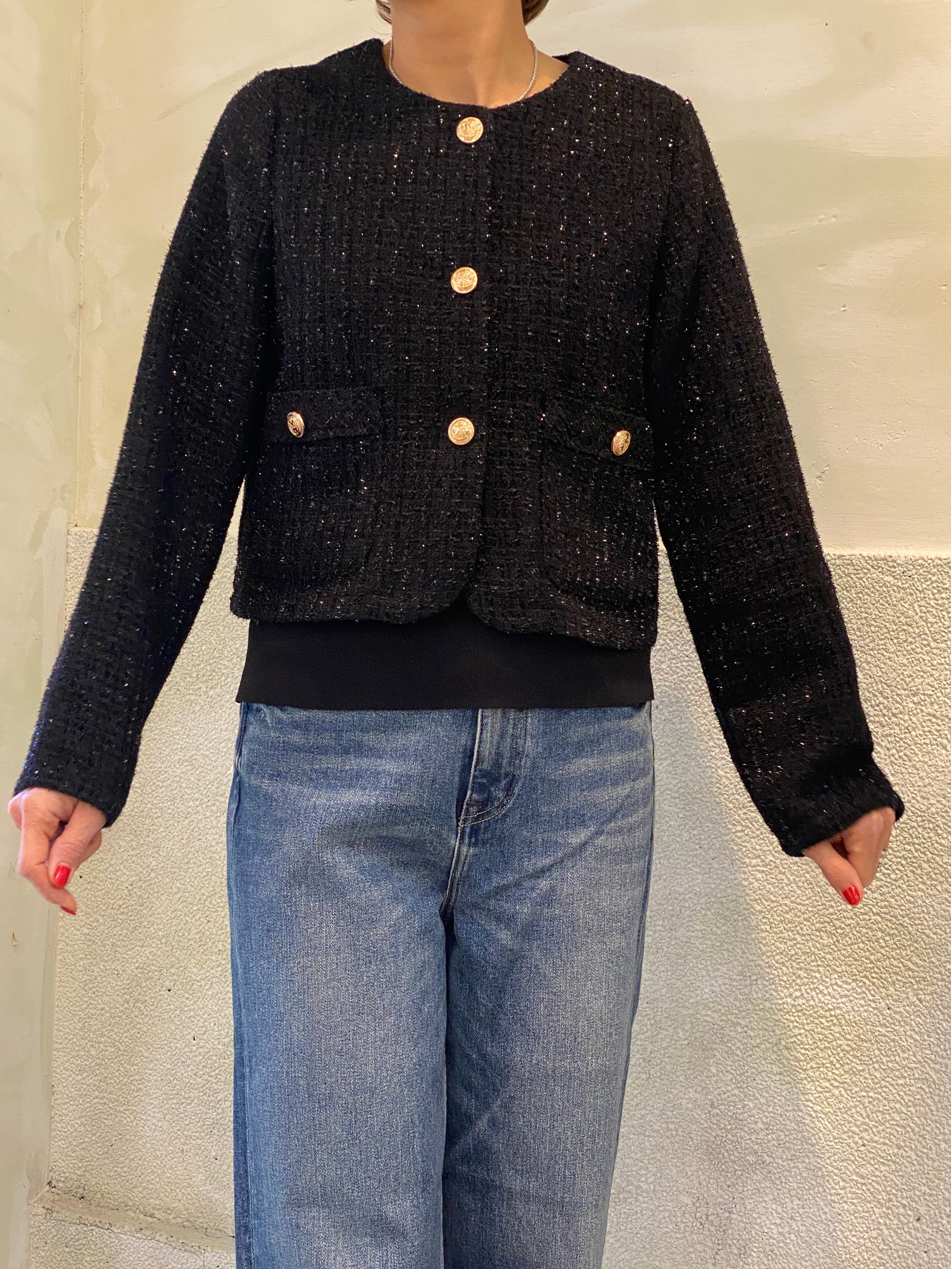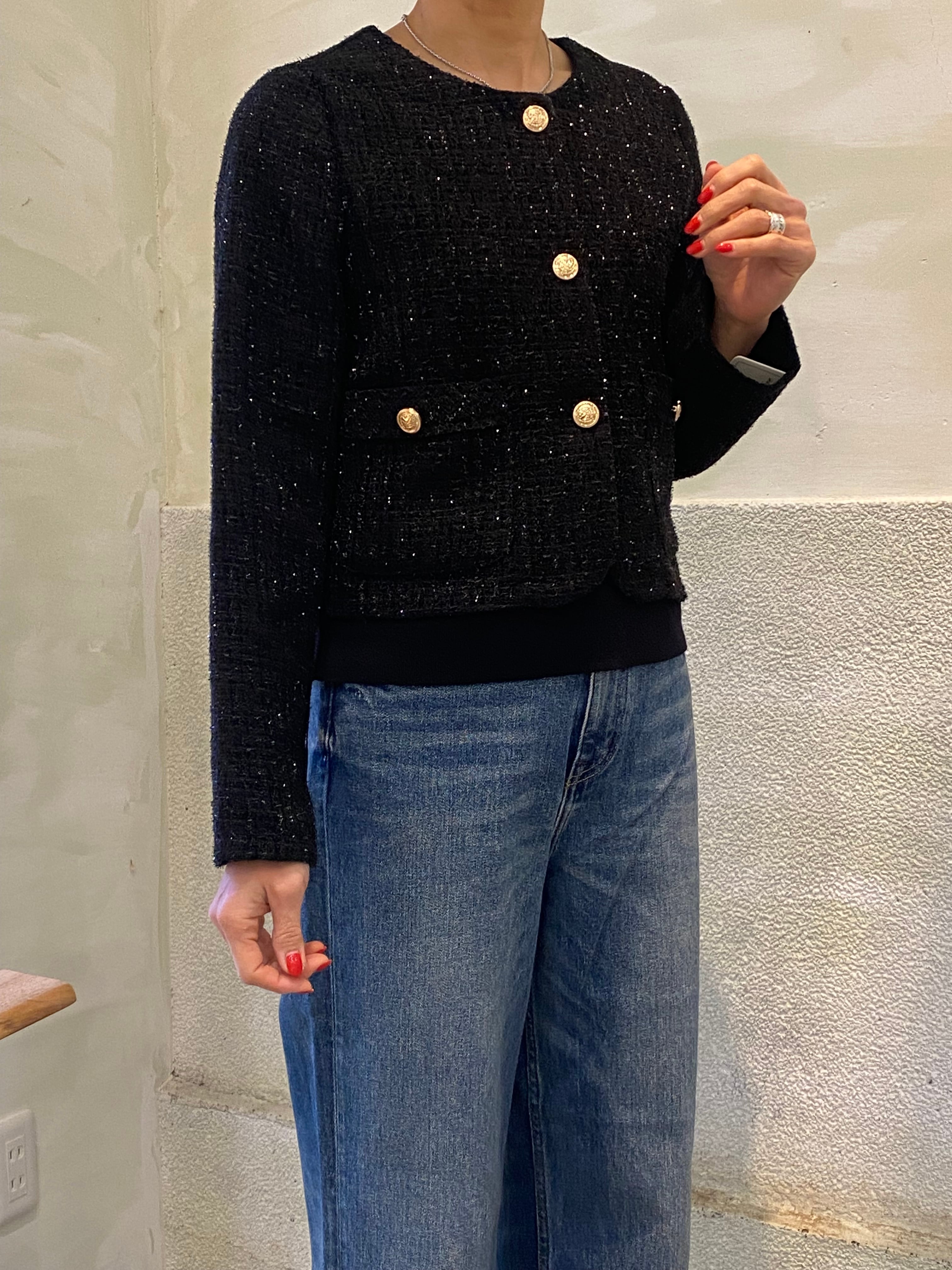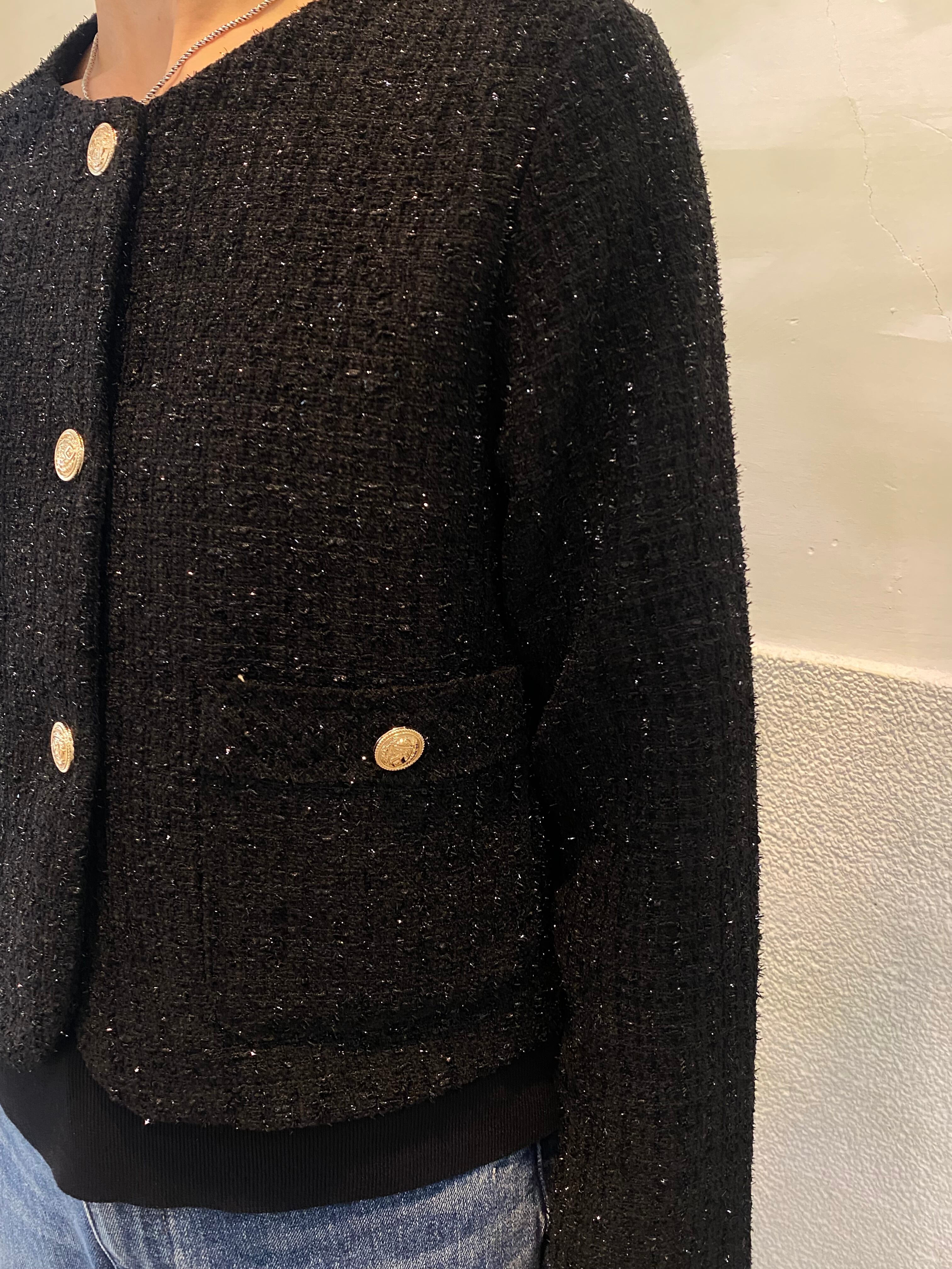 上品なツイード素材にゴールドボタンが映える、