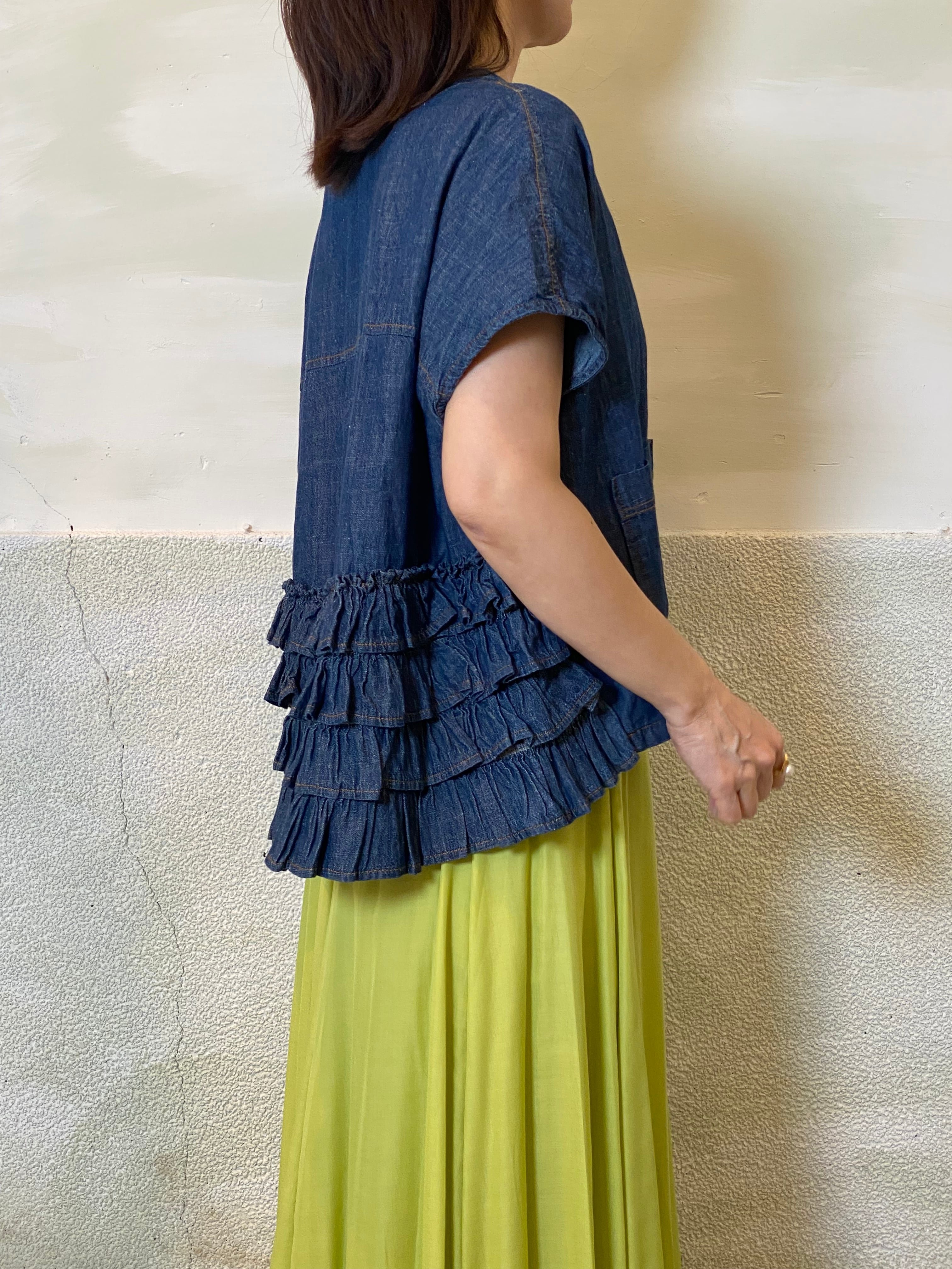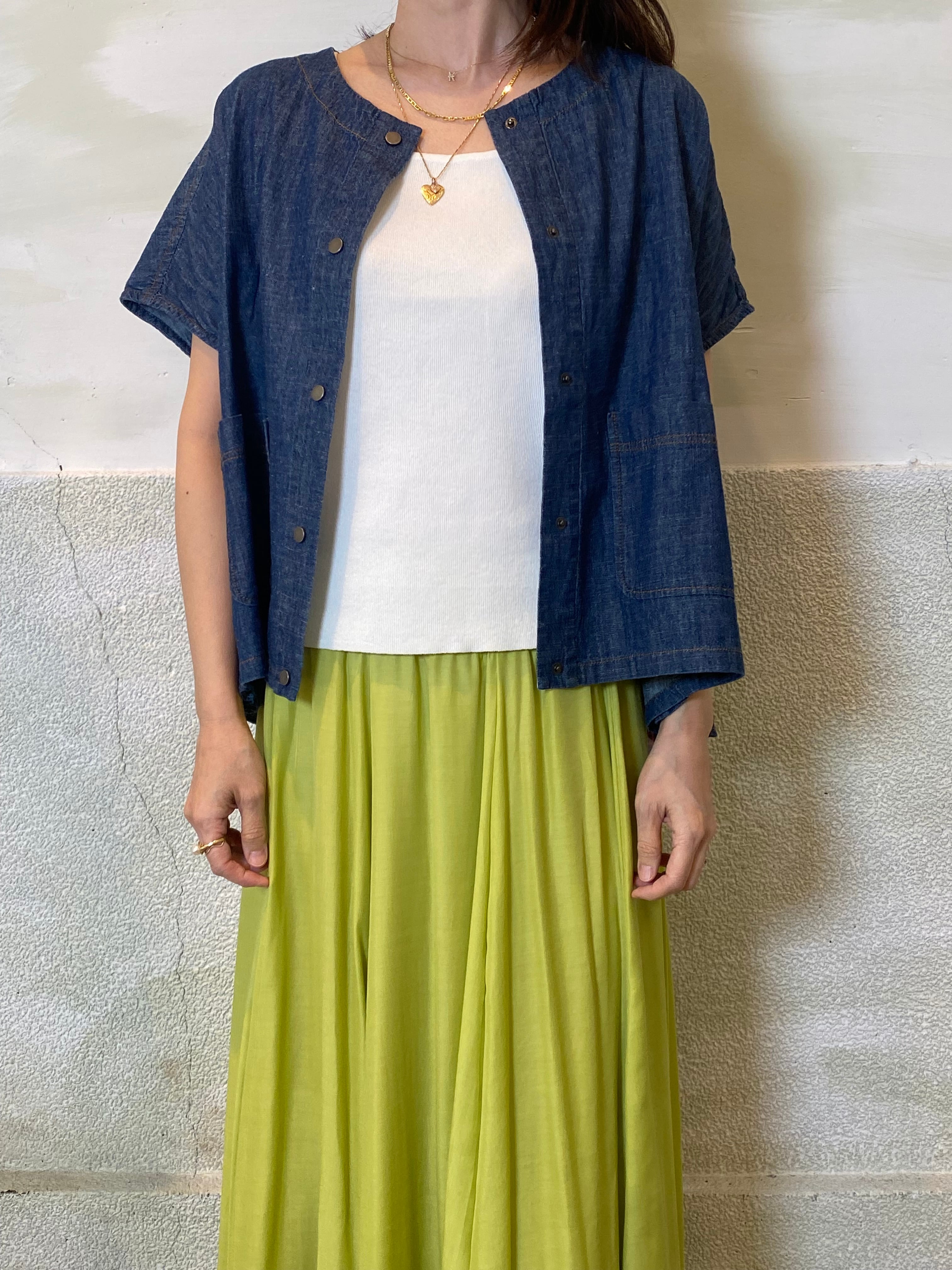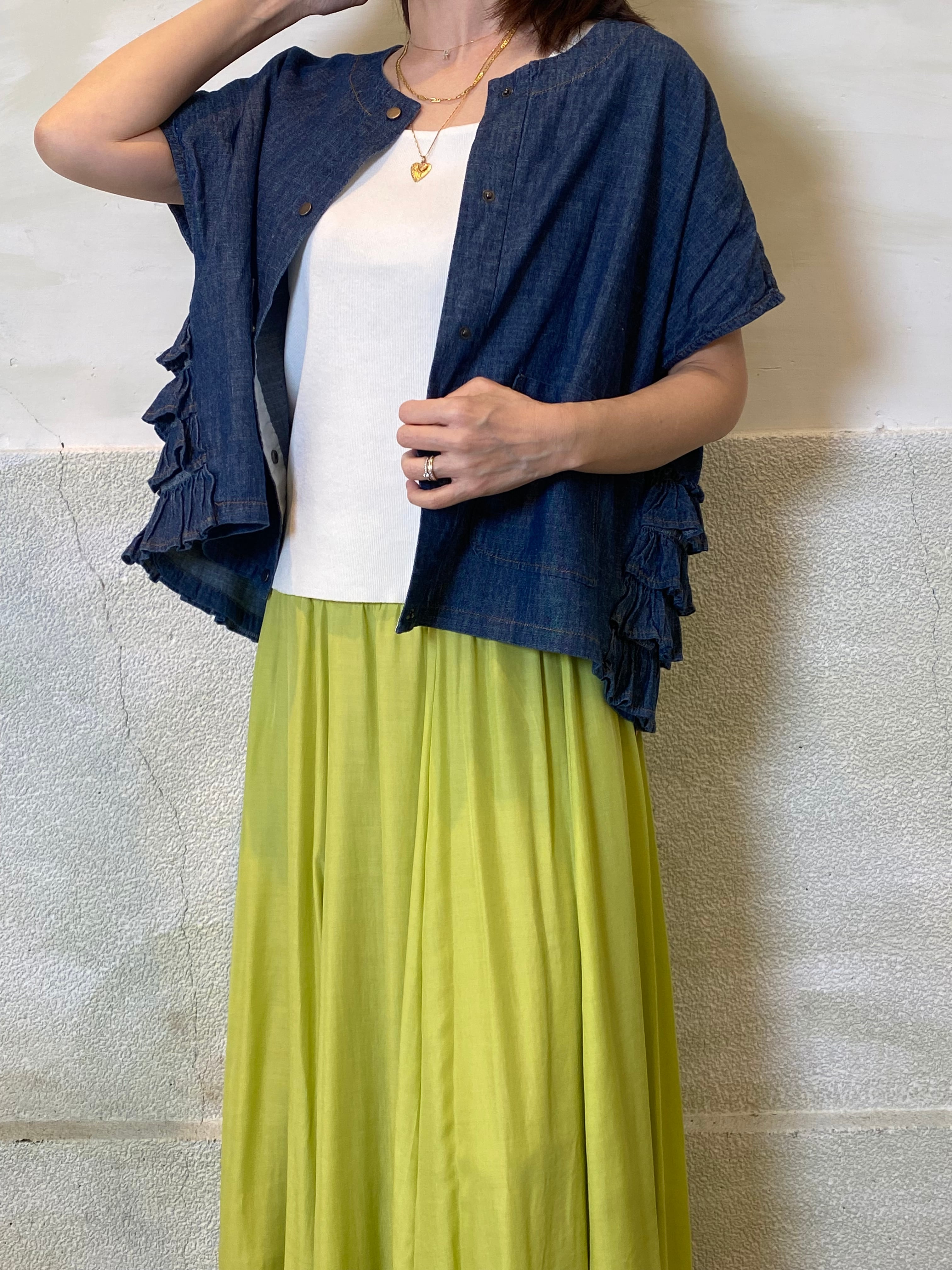 ワンピースやシャツ、カットソーとのレイヤードもバランスよく決まります。