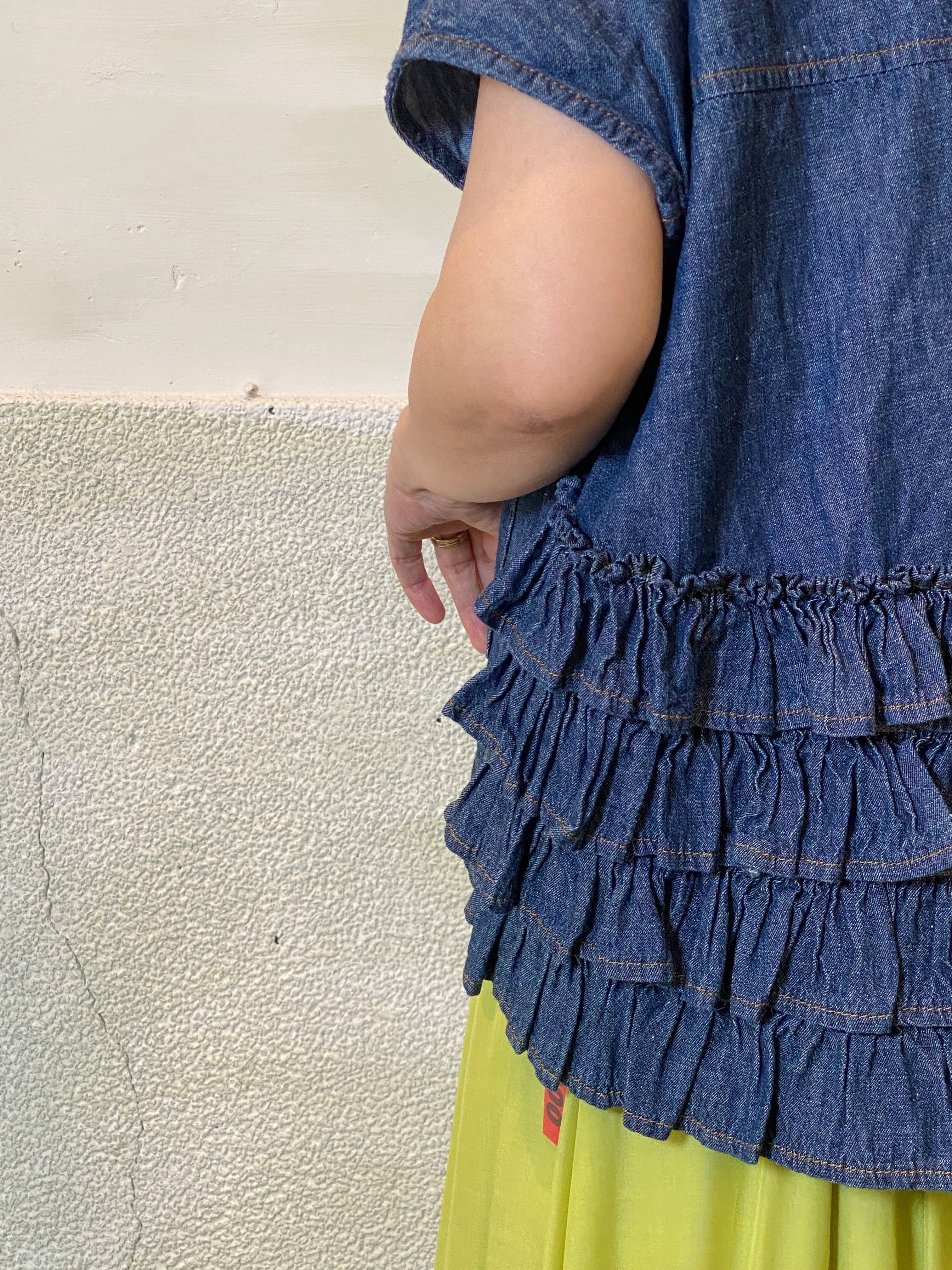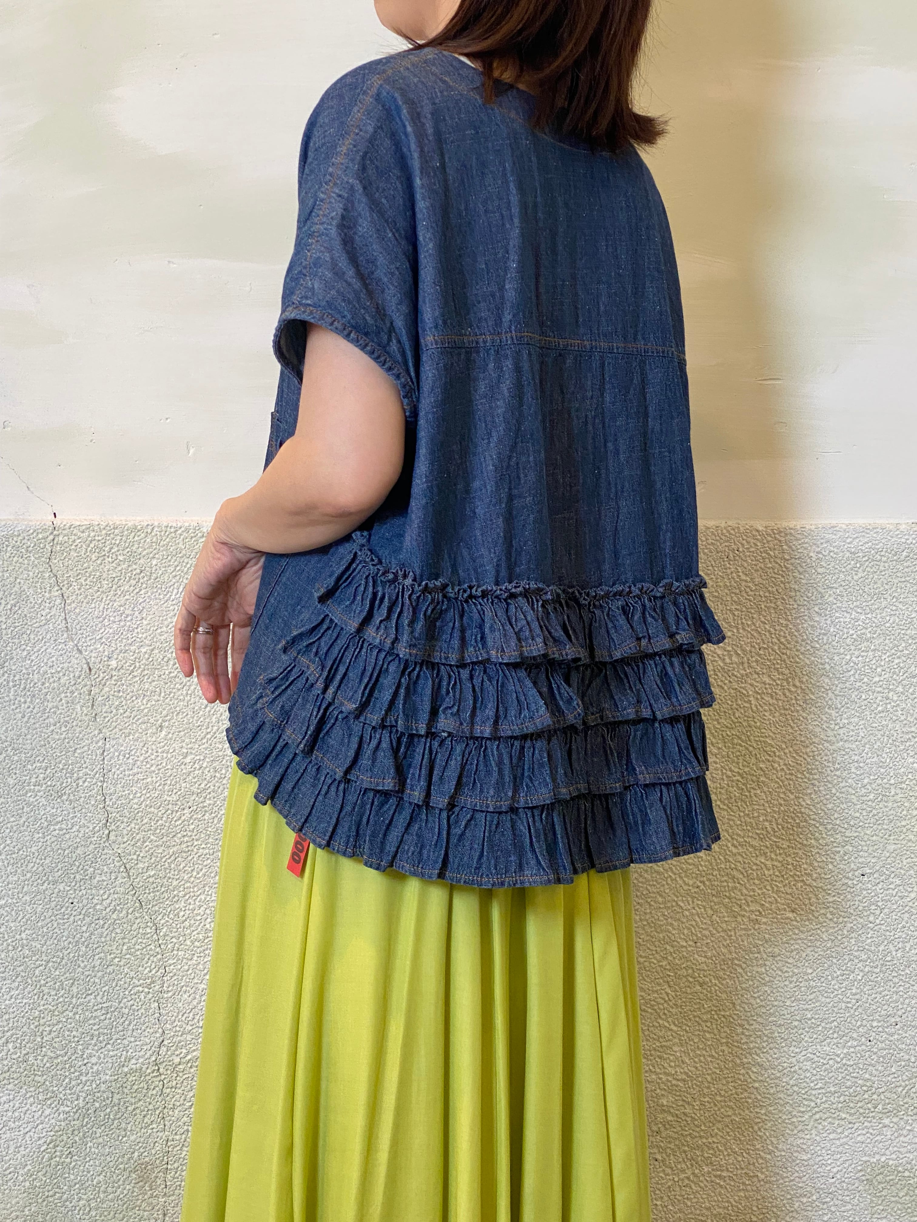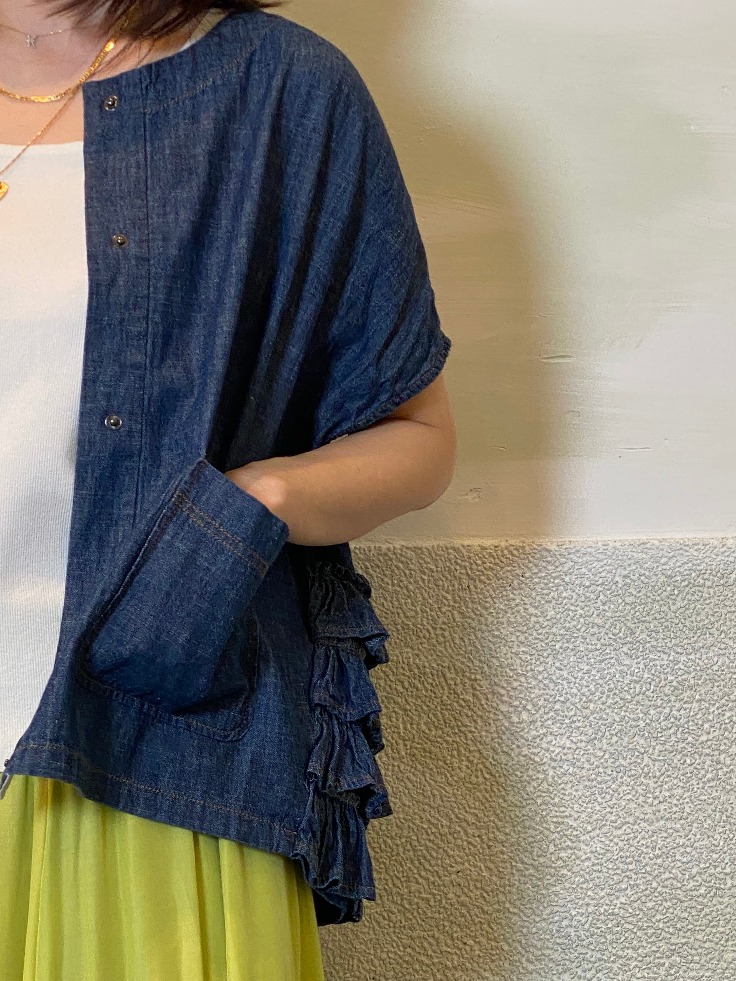 ワンピースやシャツ、カットソーとのレイヤードもバランスよく決まります。