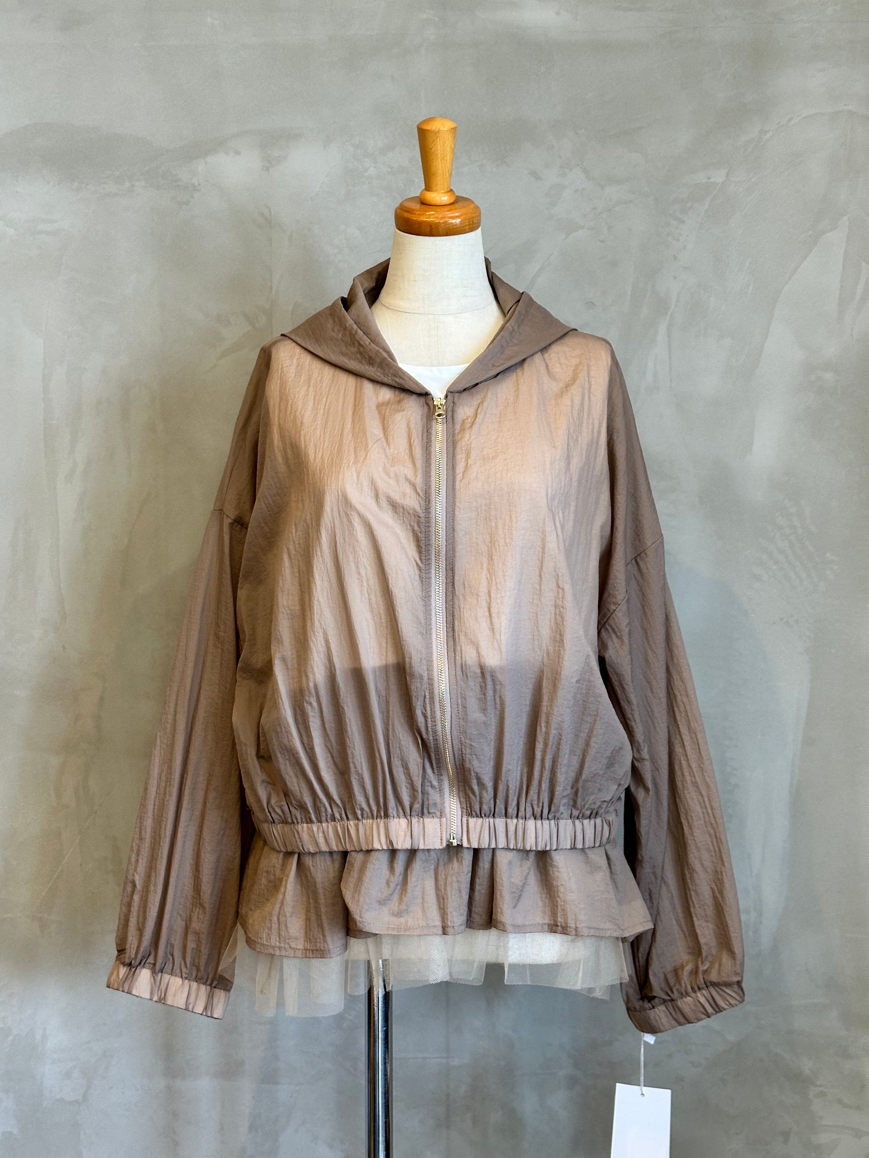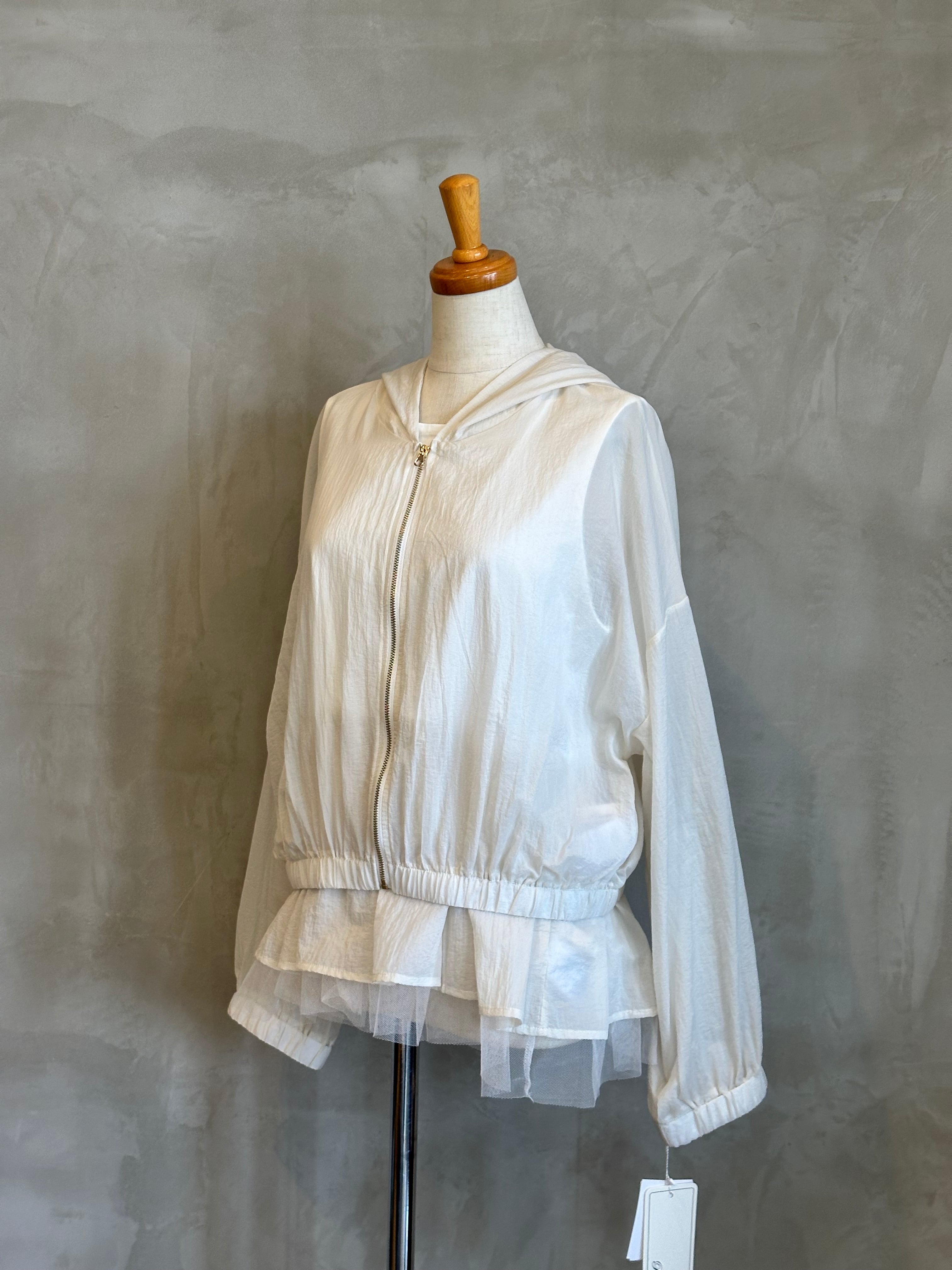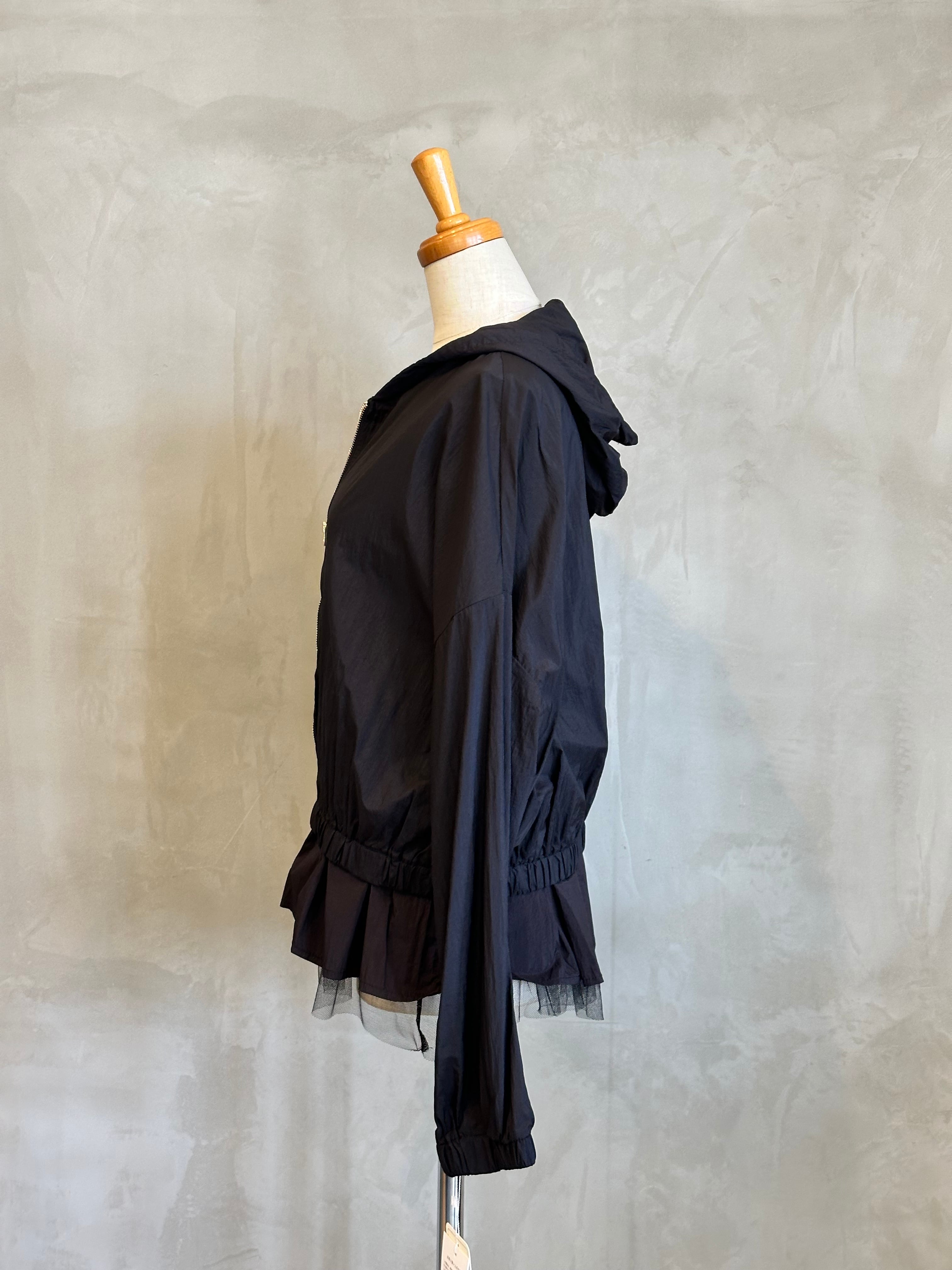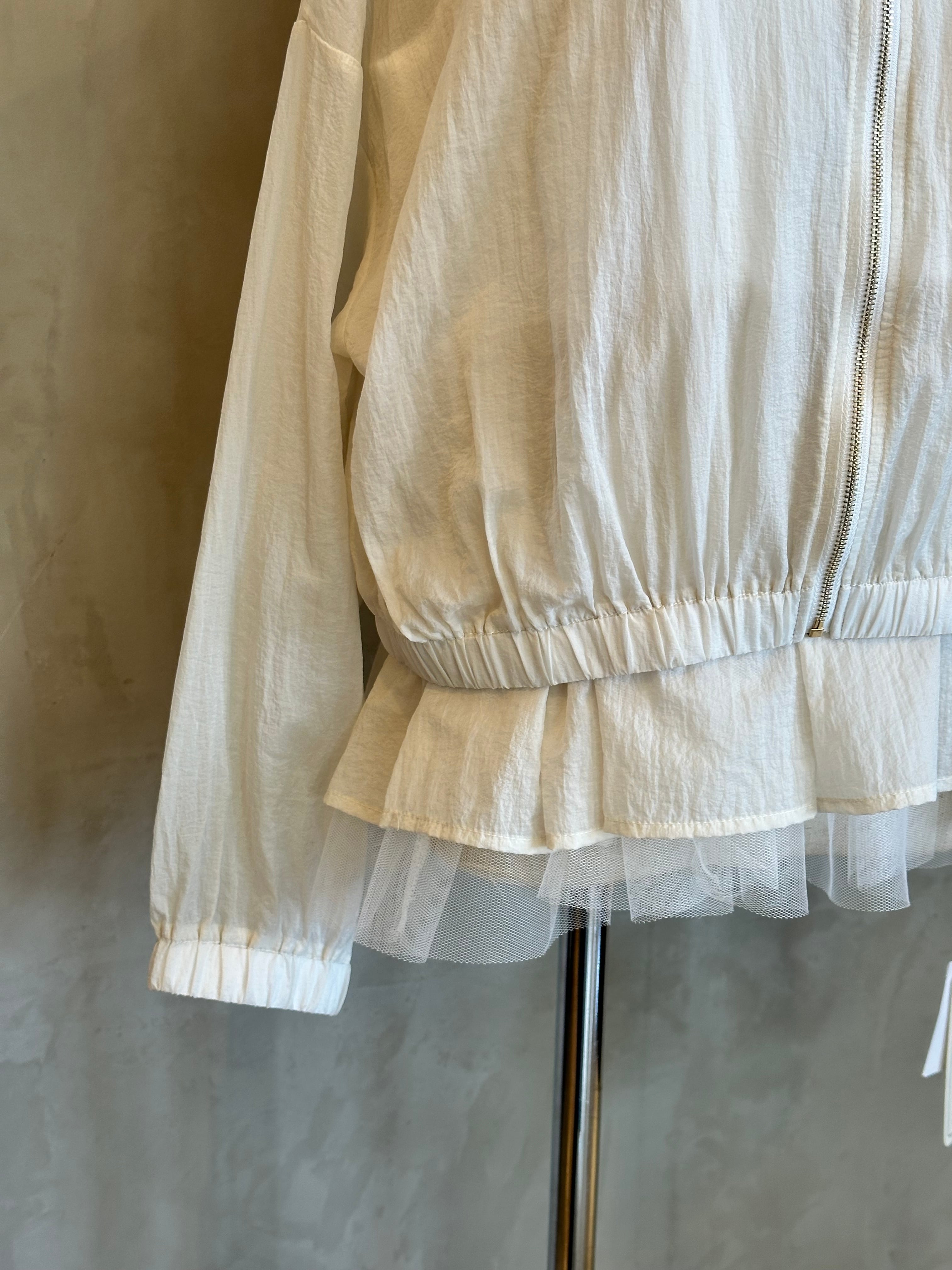 チュールの裾が華やかさを演出するインナーと、スタイリッシュなブルゾンのセットアイテム。