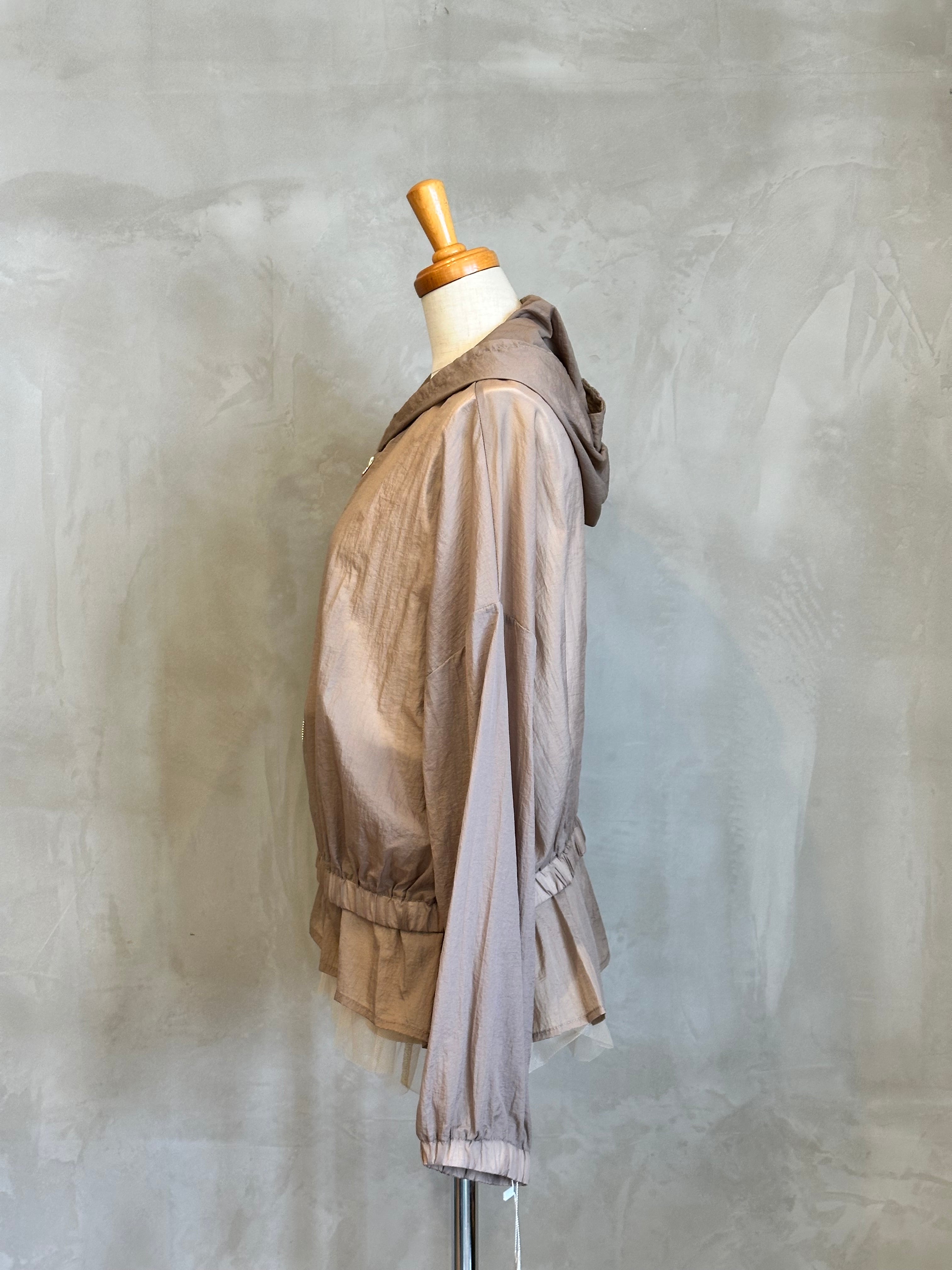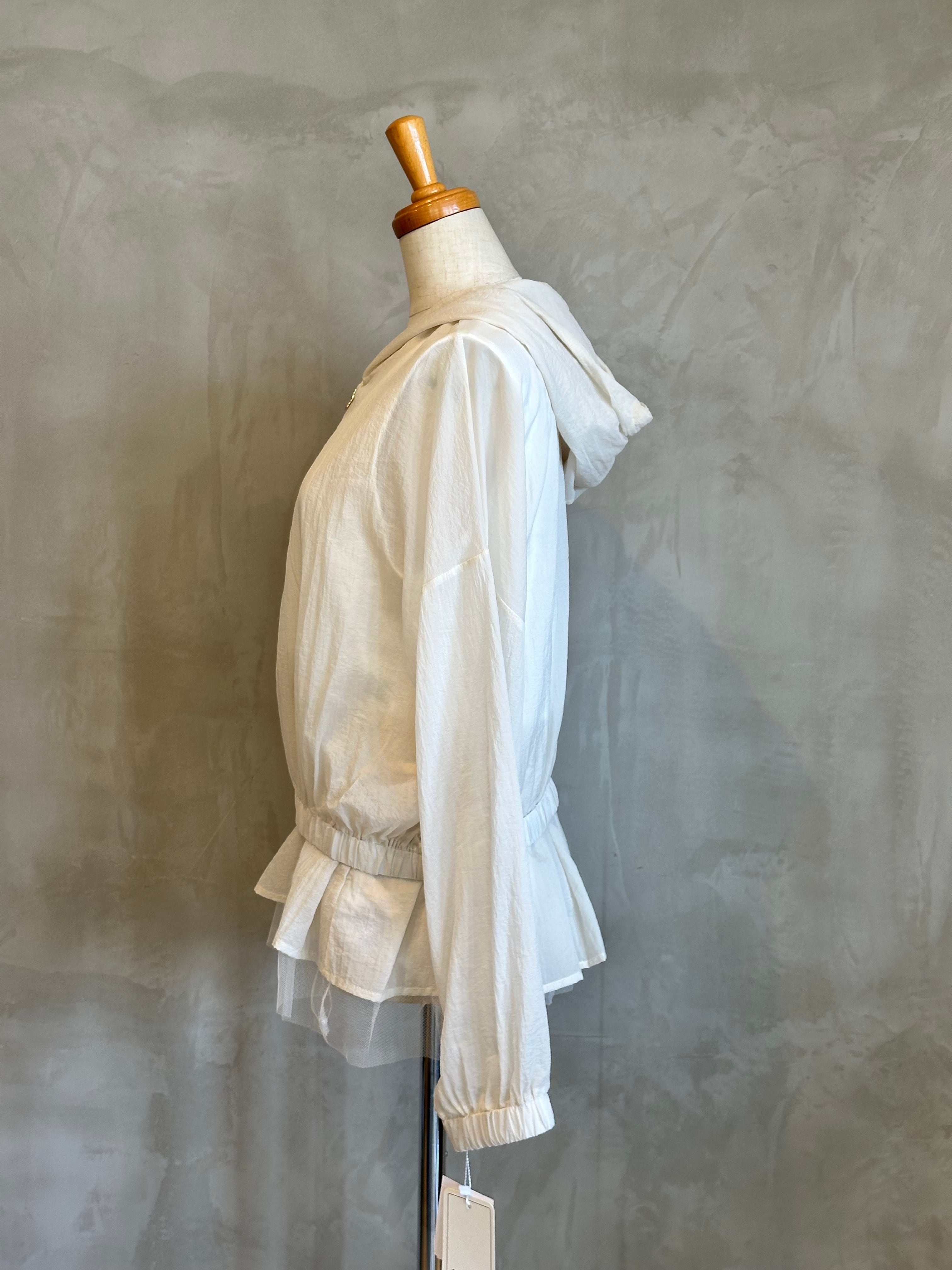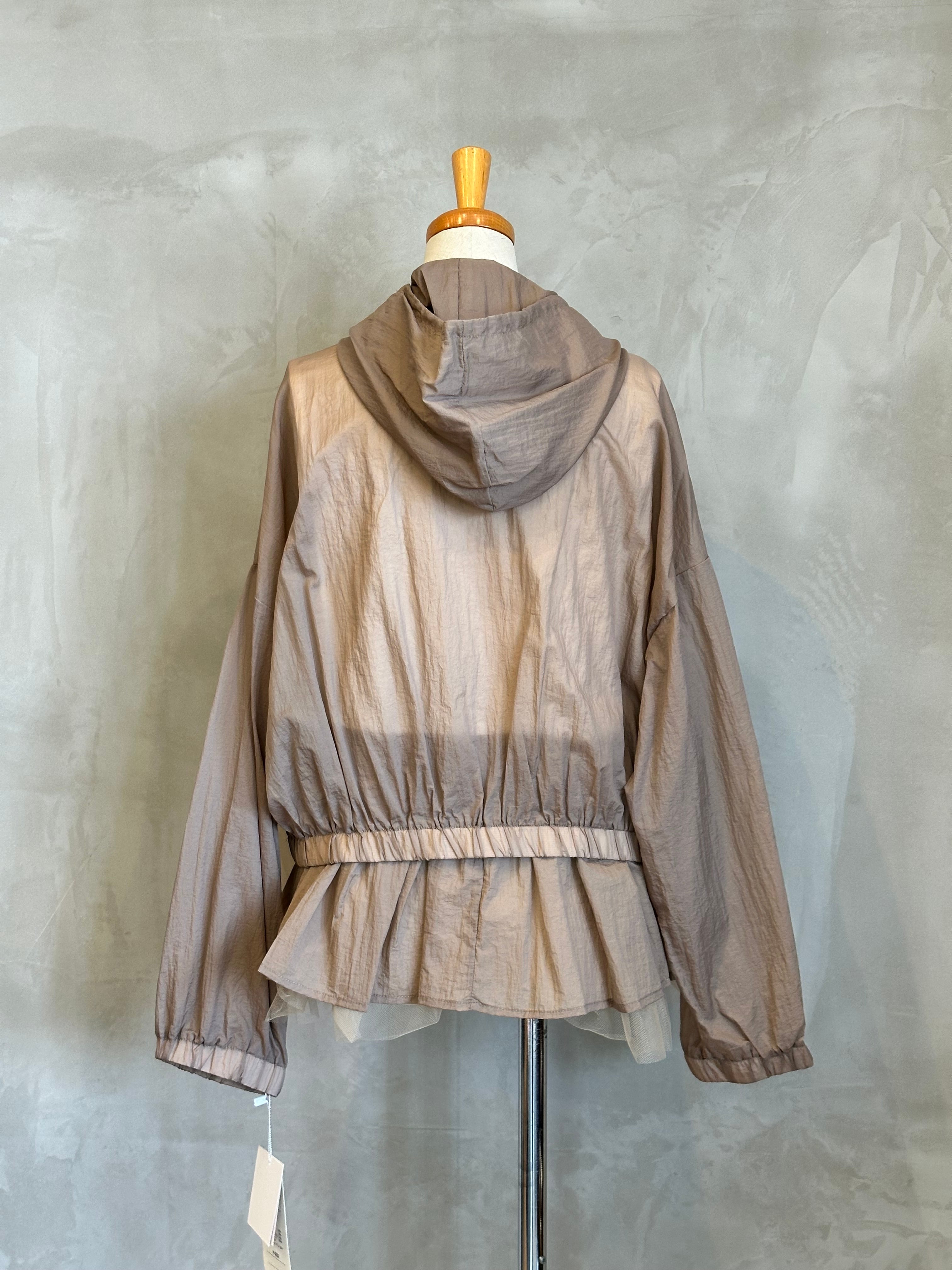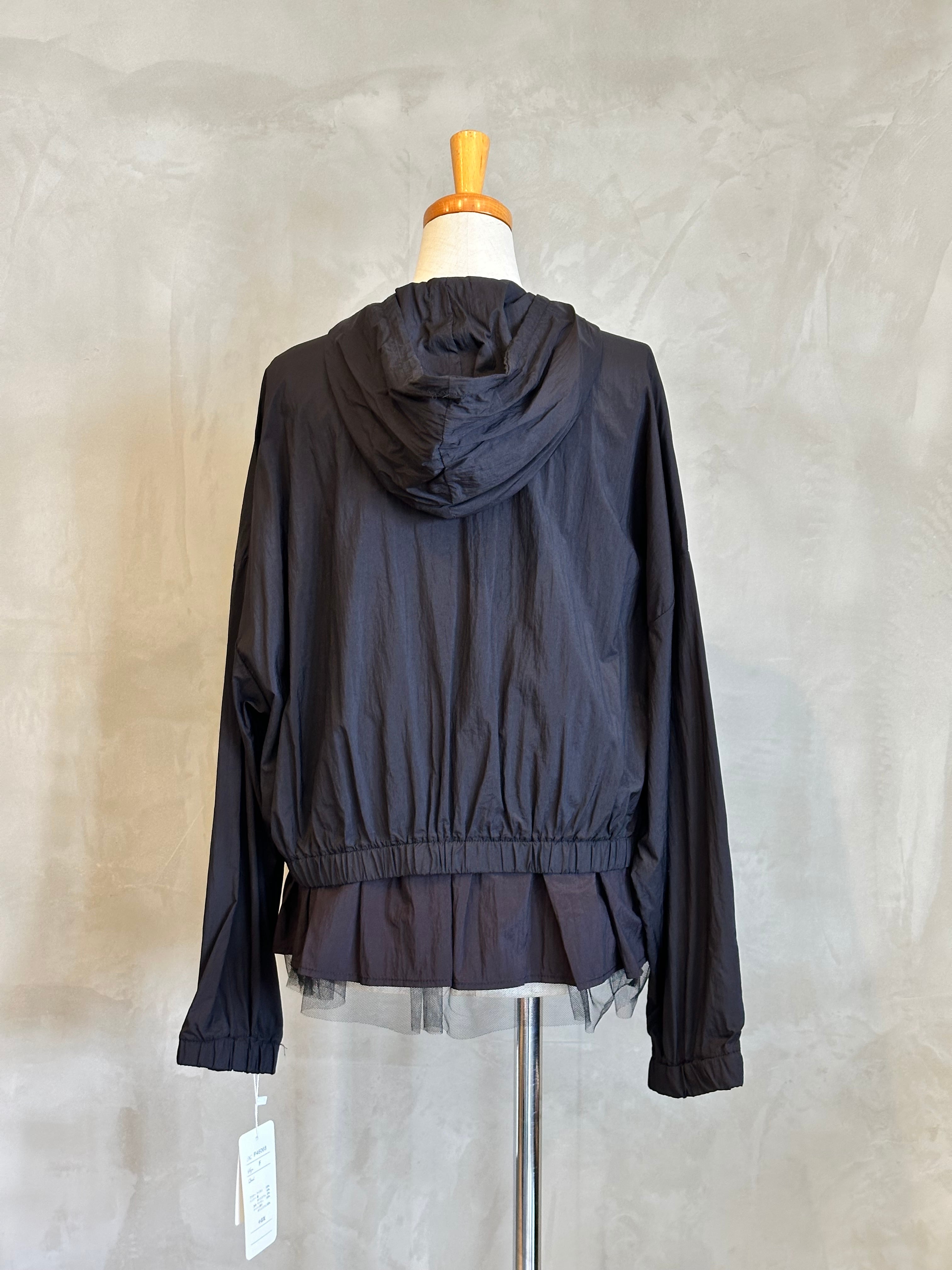 チュールの裾が華やかさを演出するインナーと、スタイリッシュなブルゾンのセットアイテム。