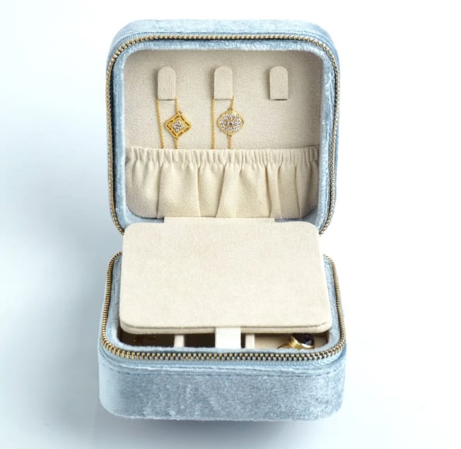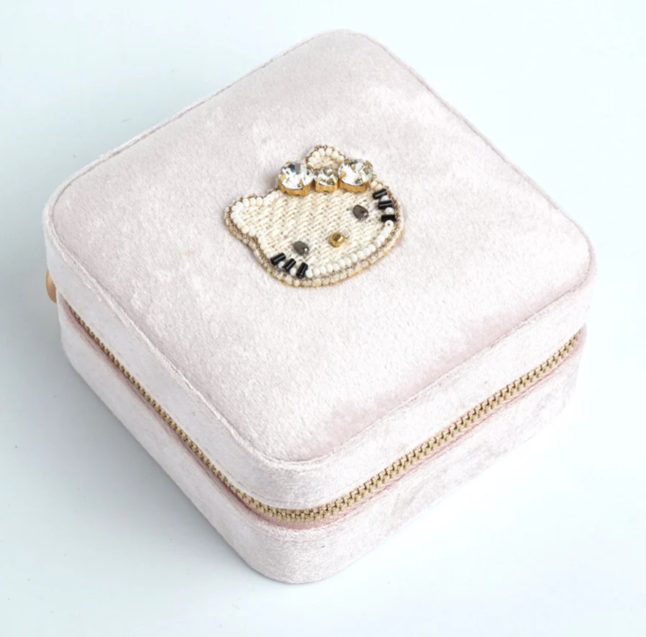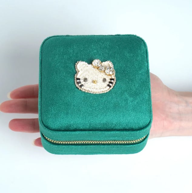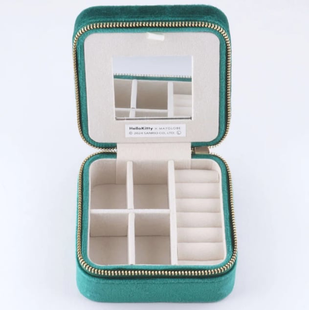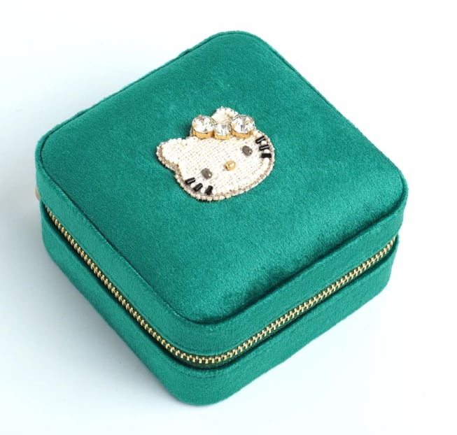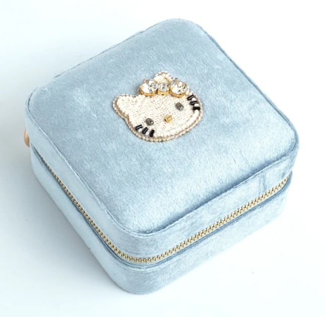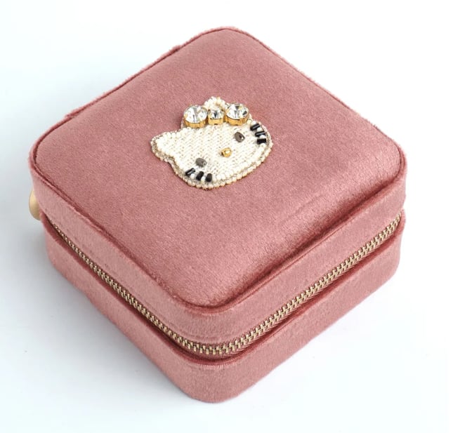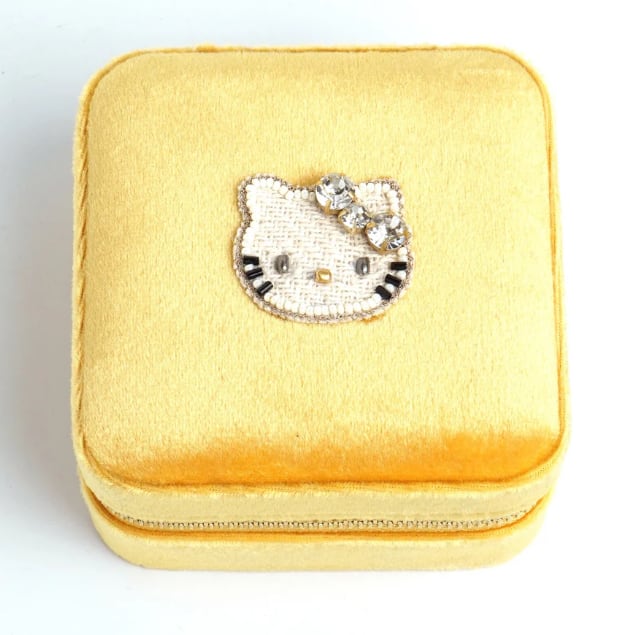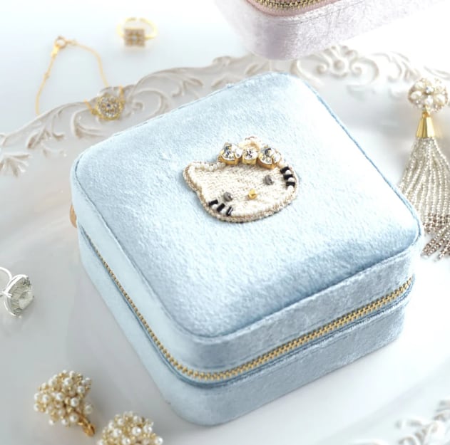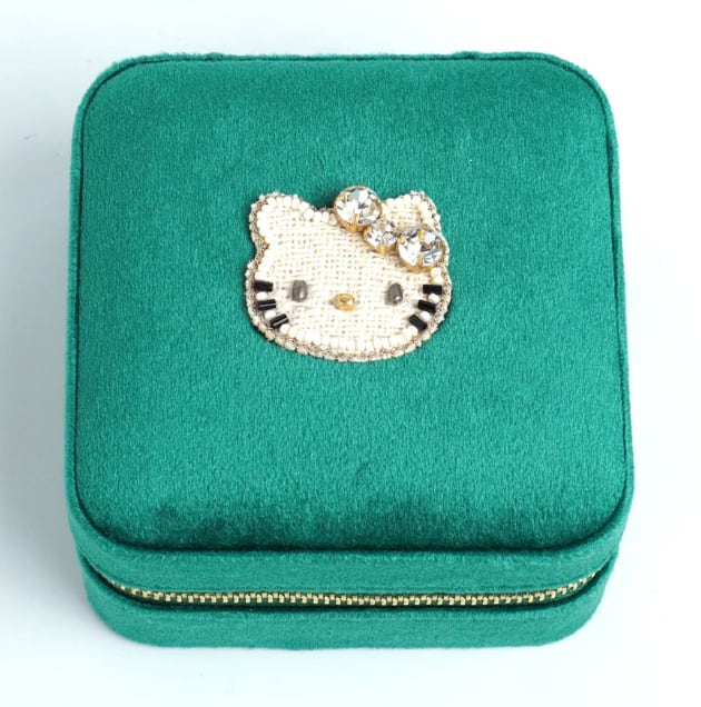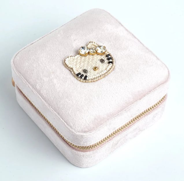 ビーズ刺繍でデザインされたハローキティのジュエリーBOX。ハローキティモチーフは小さくてもかわいさはそのまま。華やかなカラーのジュエリーボックスはお気に入りのアクセサリーを入れて見た目も中身も楽しめるアイテムです。大容量でいろんなパートがあるのでどのようなアクセサリーでも収納に困りません。ご旅行や出張など、アクセサリーを持ち運ぶのにとっても便利。ファスナー式でしっかりと口が開くので、取り出しやすいのも嬉しいポイント。ボックスは高級感のあるベルベットを採用。お気に入りのジュエリーを大切に保管できます。