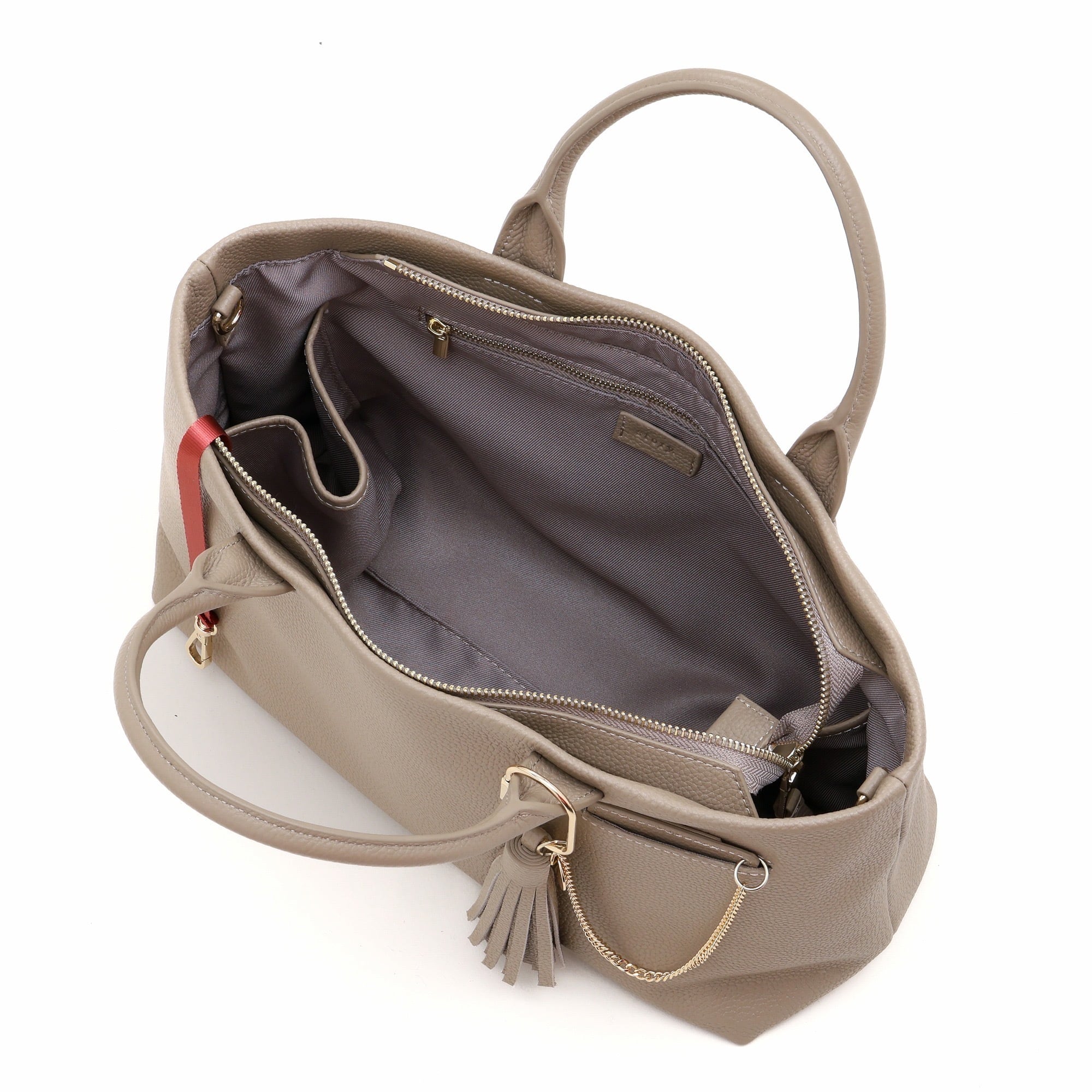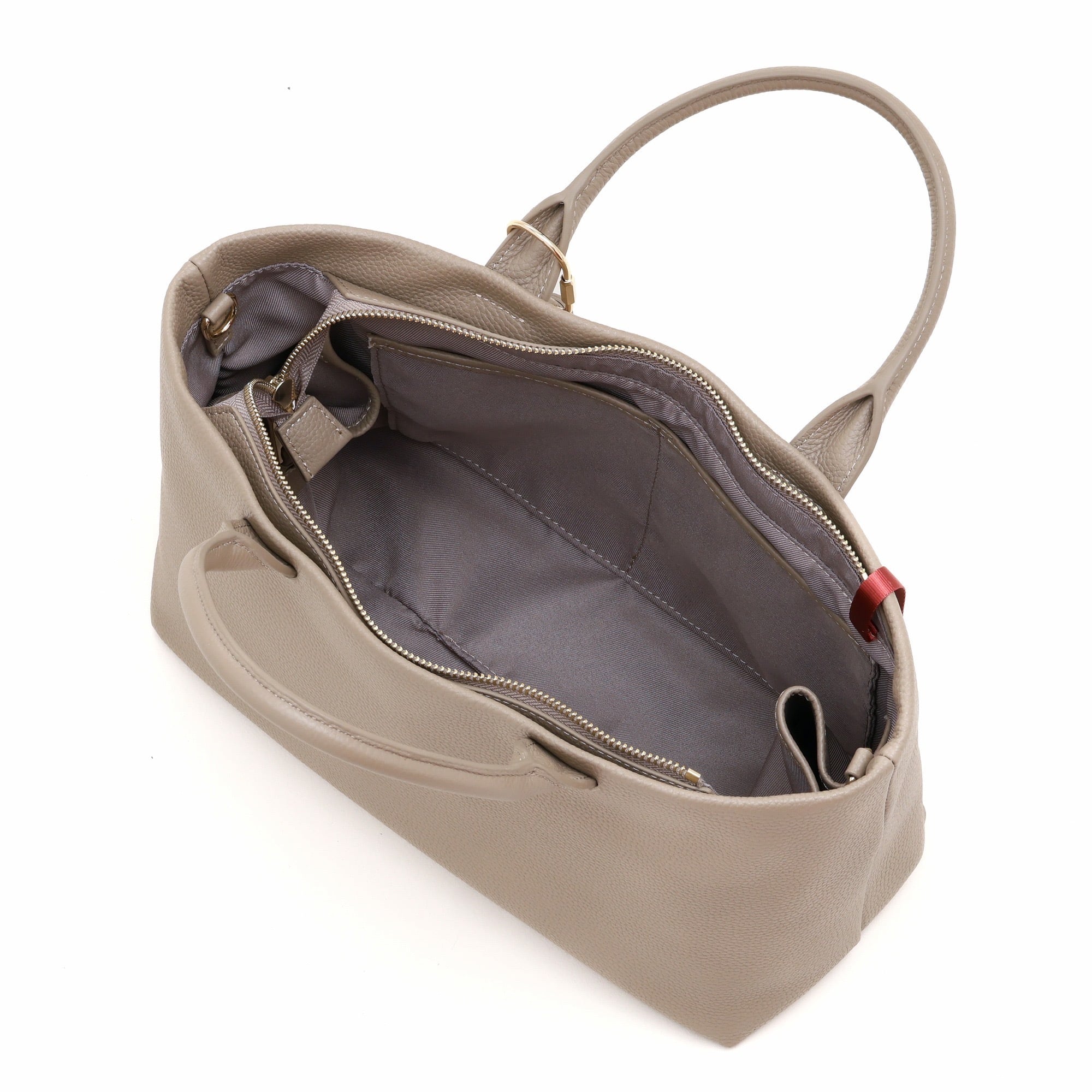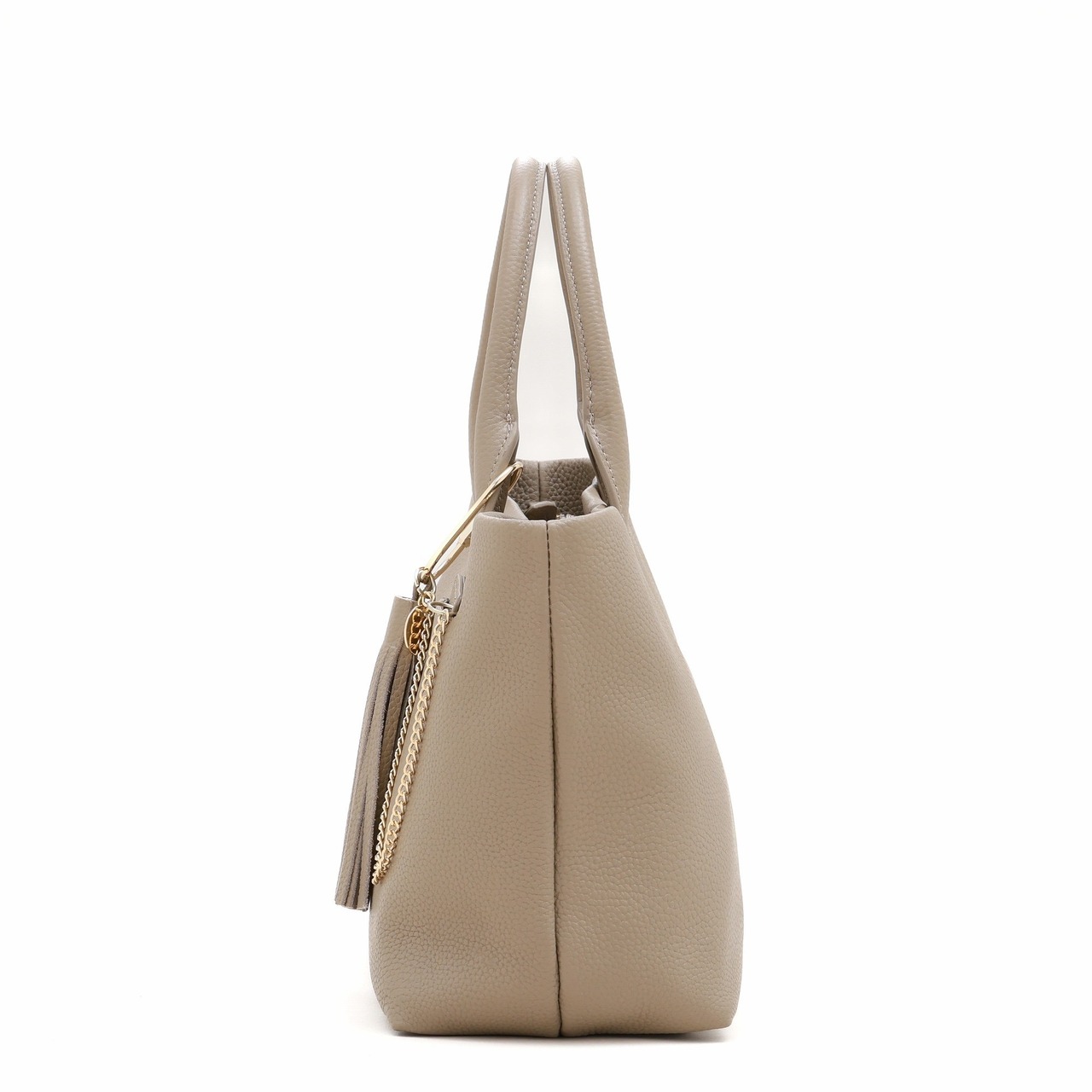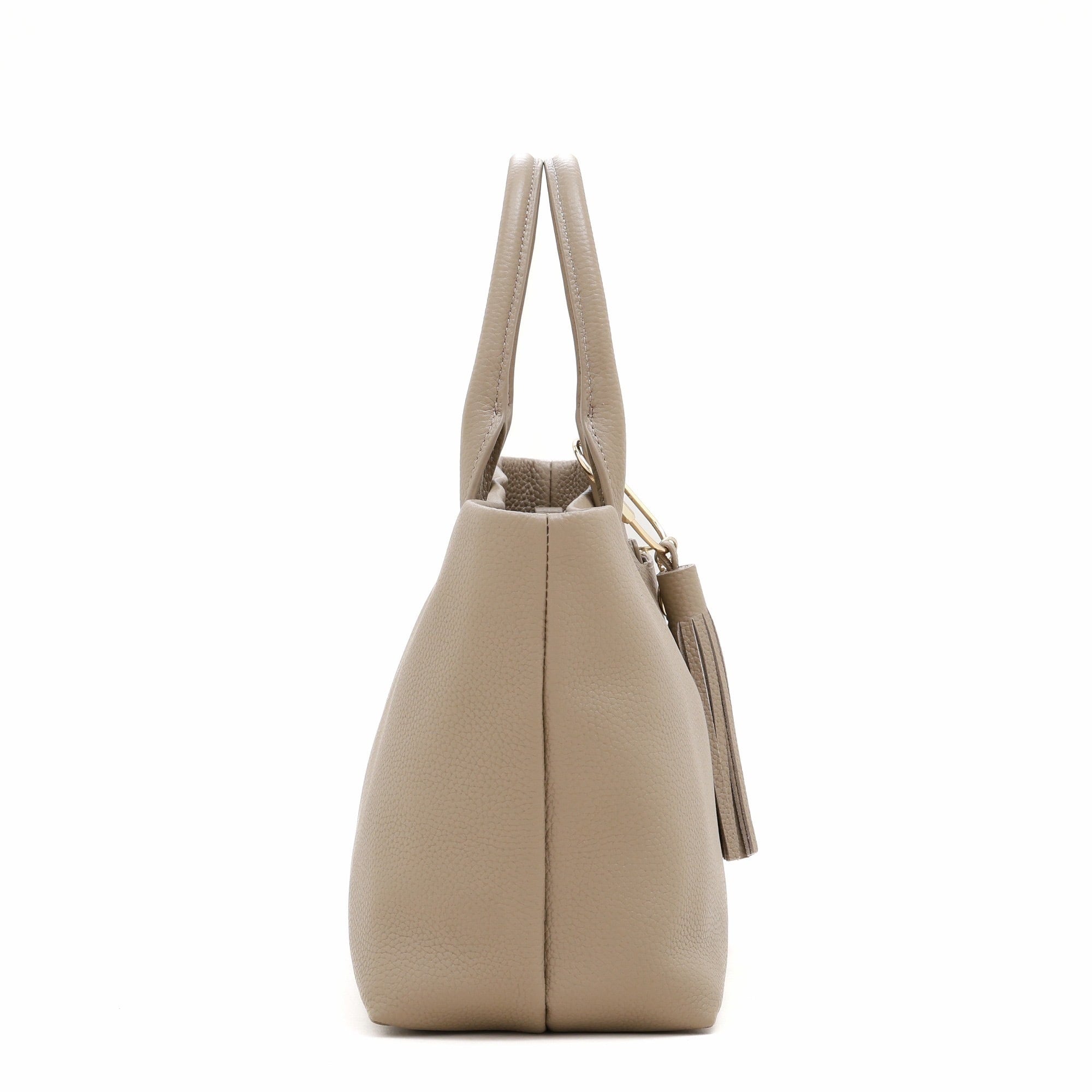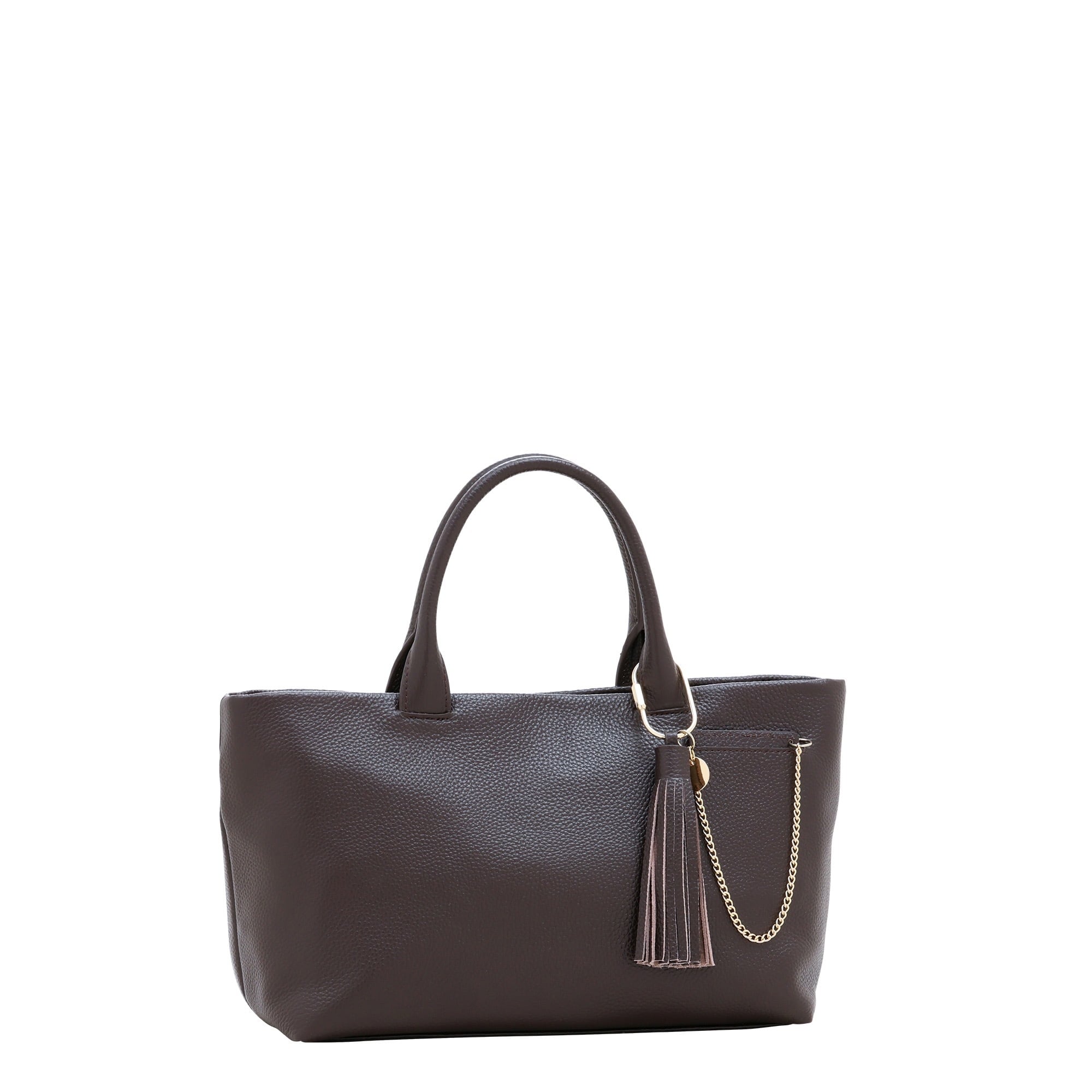 色々なシーンに馴染みやすいように本体は金具レスに仕上げ、ブランドチャームのみアクセントに加えました。