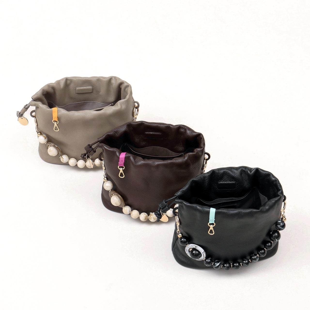 色々なシーンに馴染みやすいように本体は金具レスに仕上げ、ブランドチャームのみアクセントに加えました。