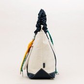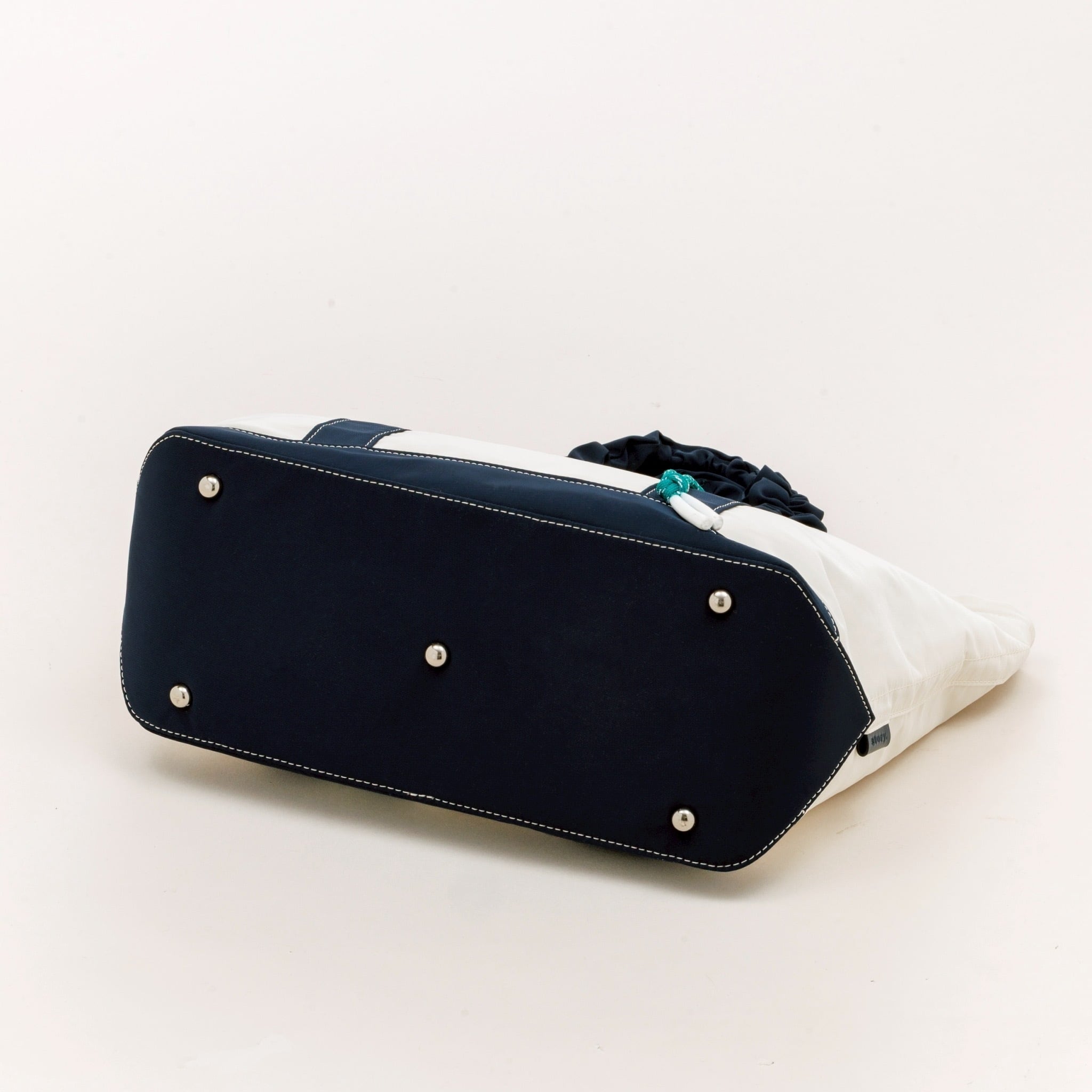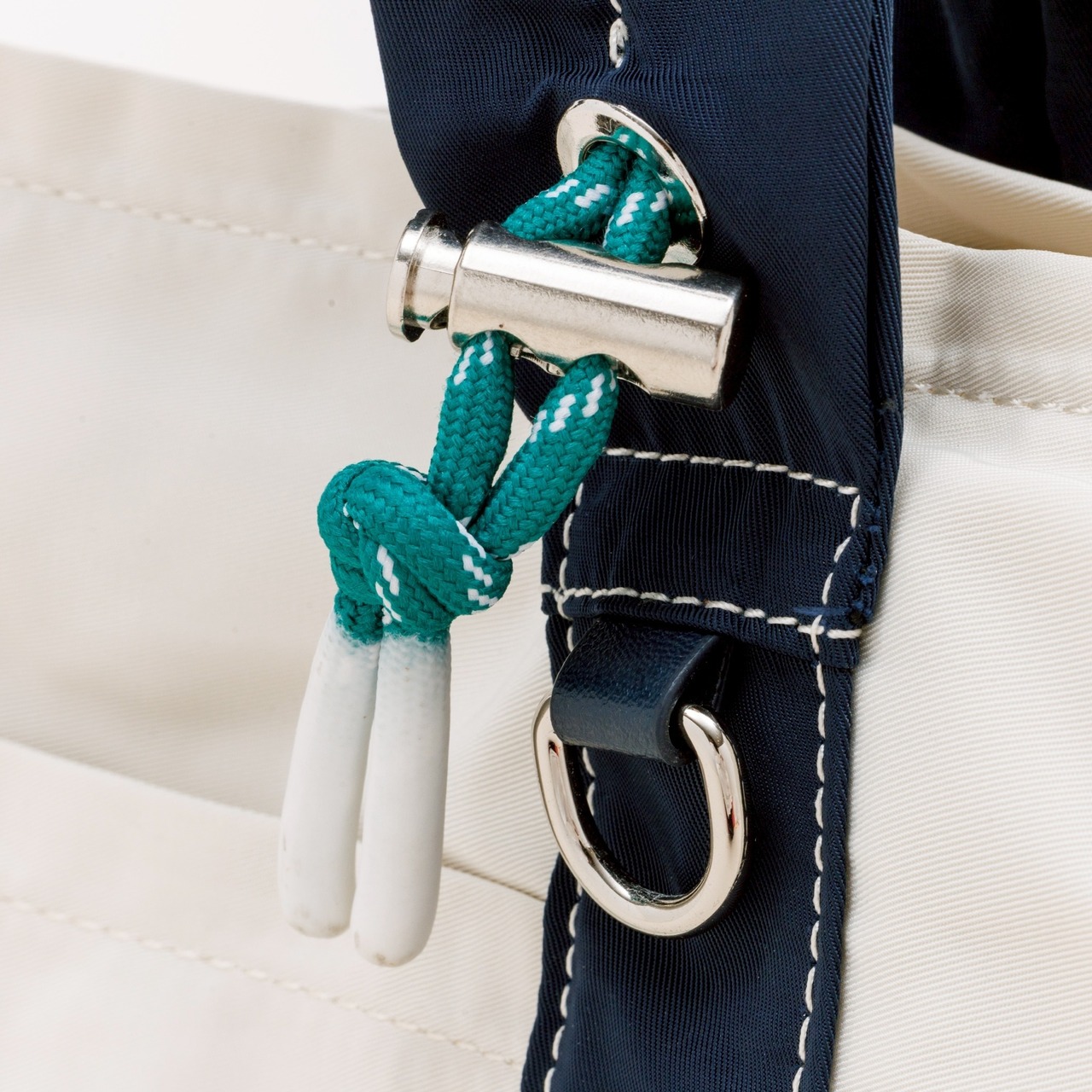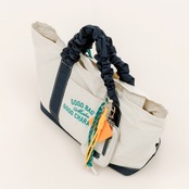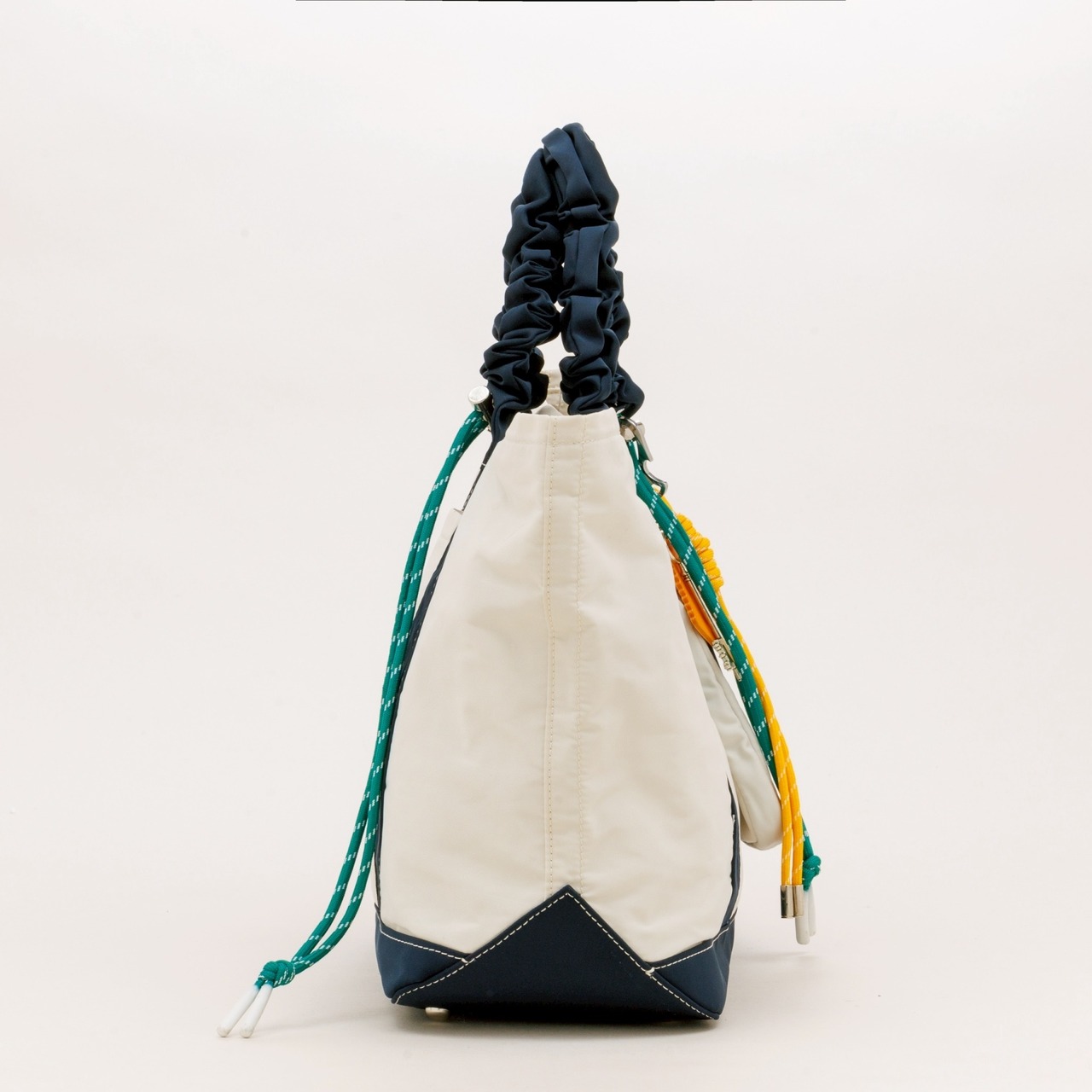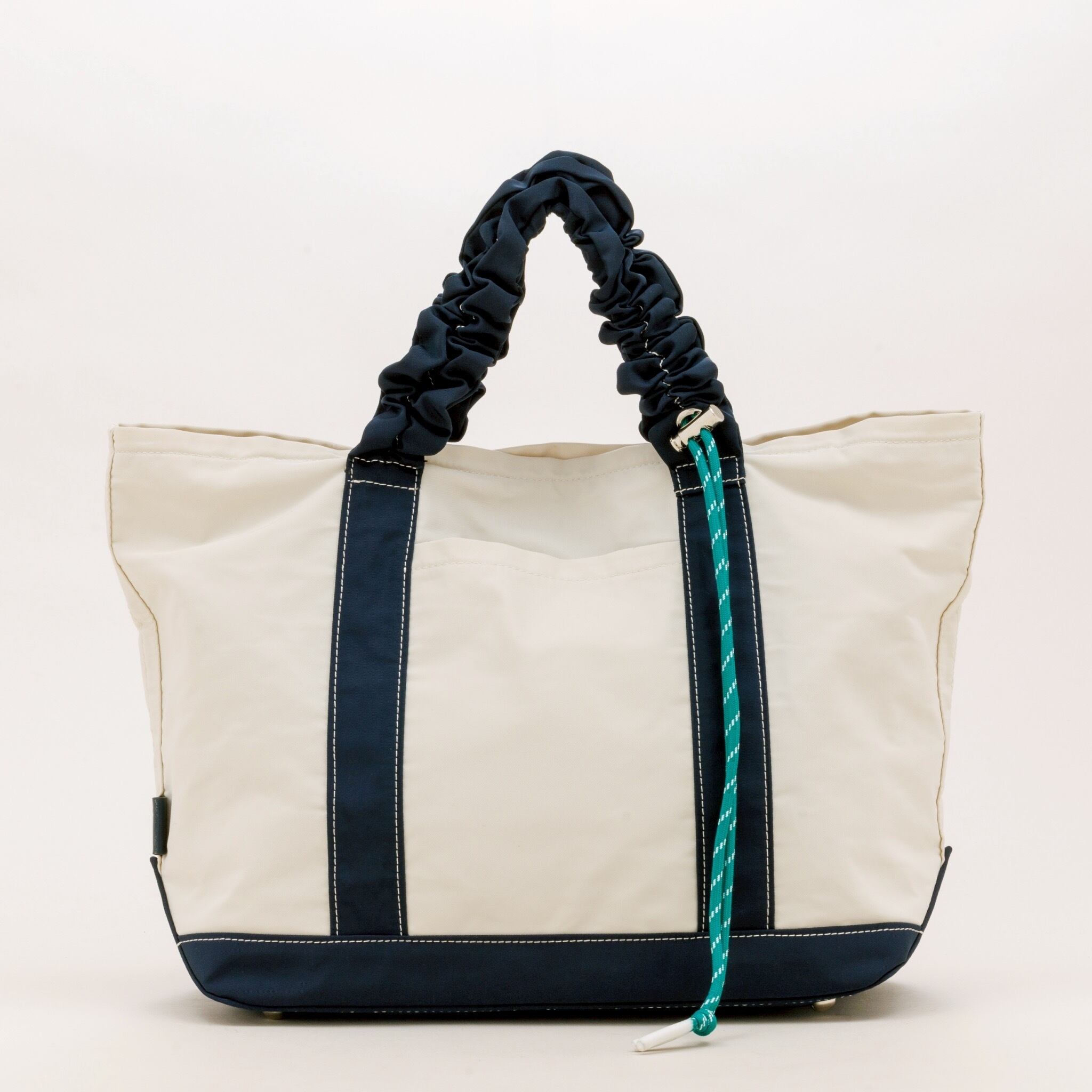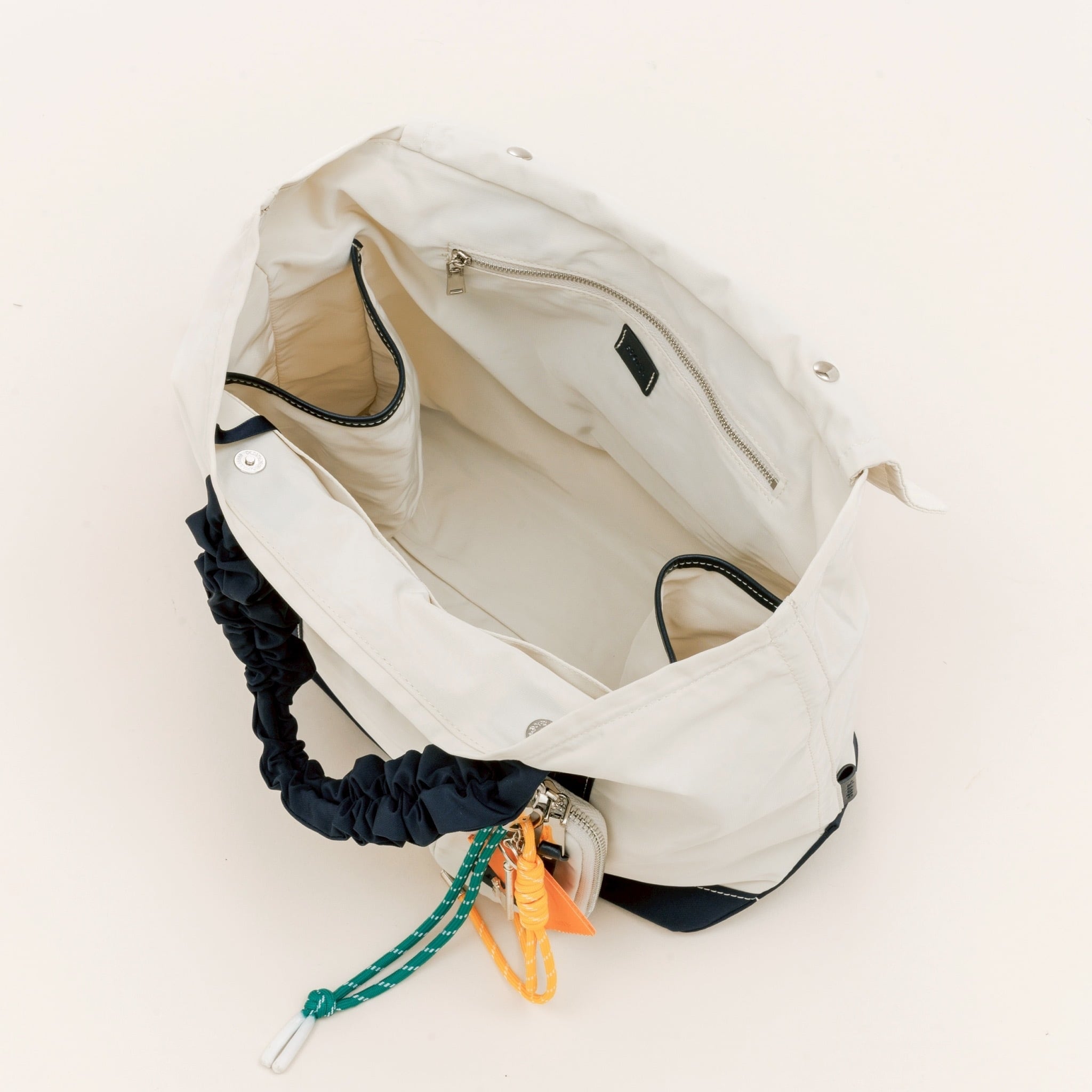 クラシックなワークバッグながらもシャーリングハンドルや素材感、配色を効かせた小物使いで女性らしさもキープ。