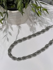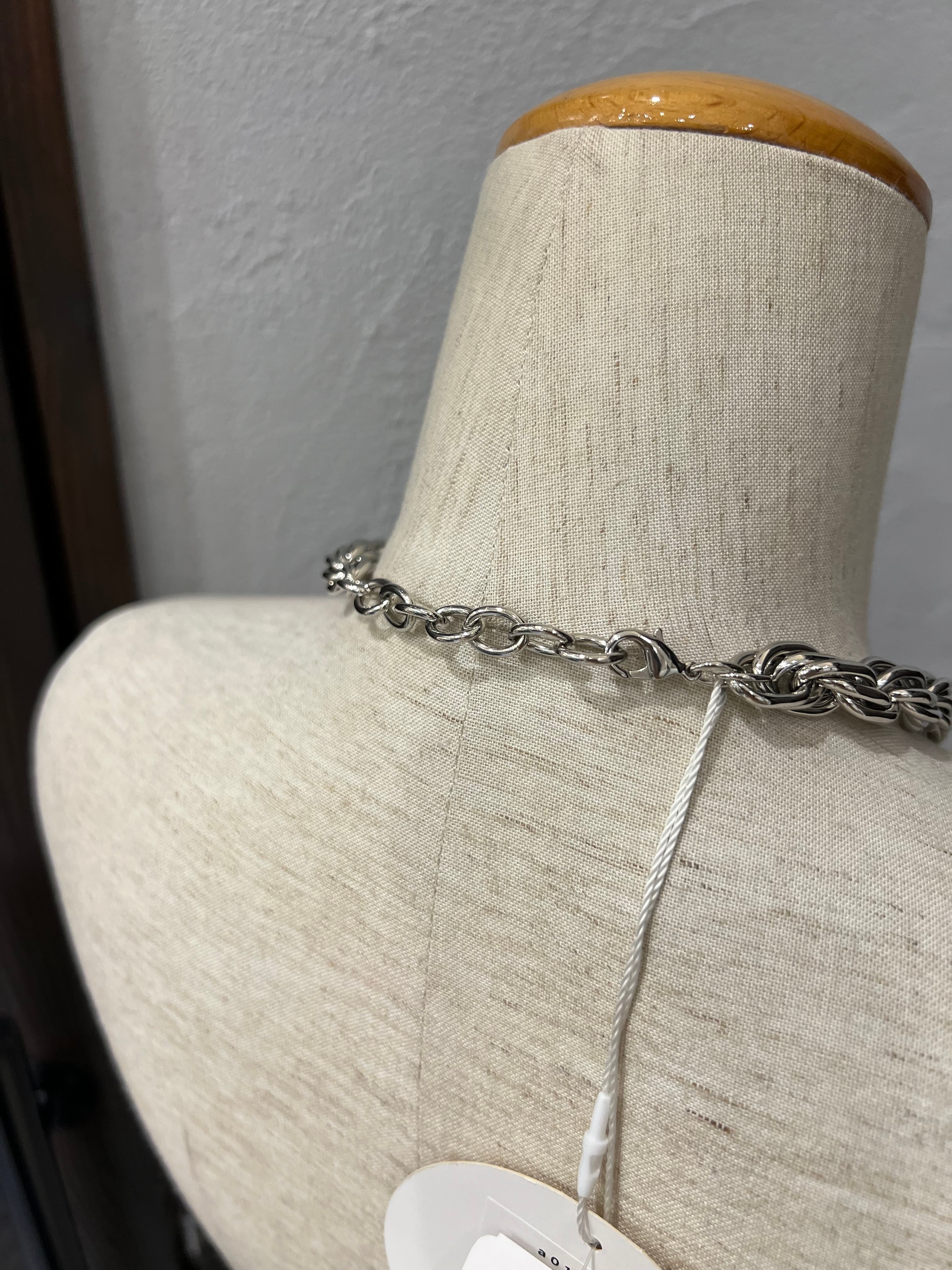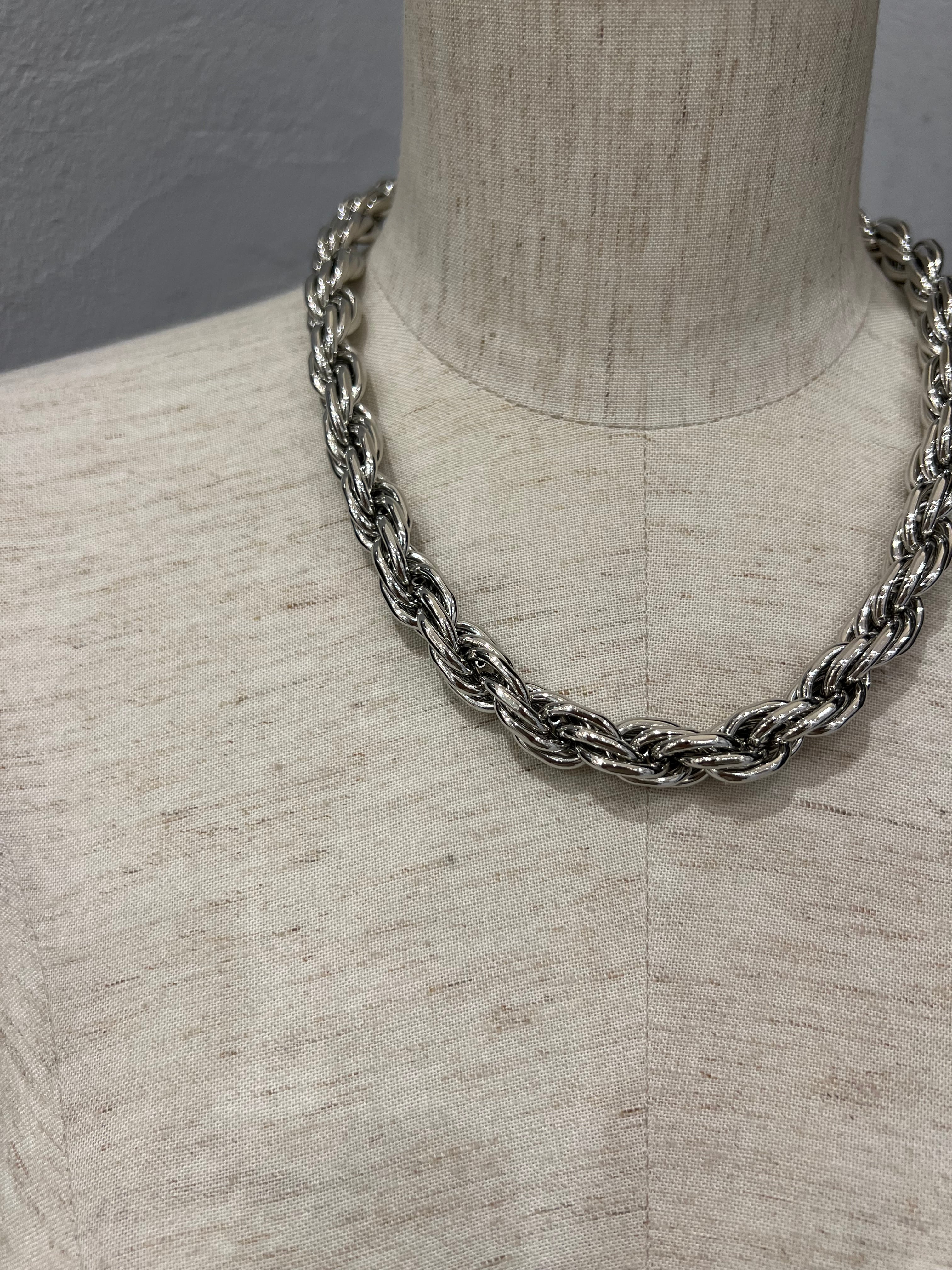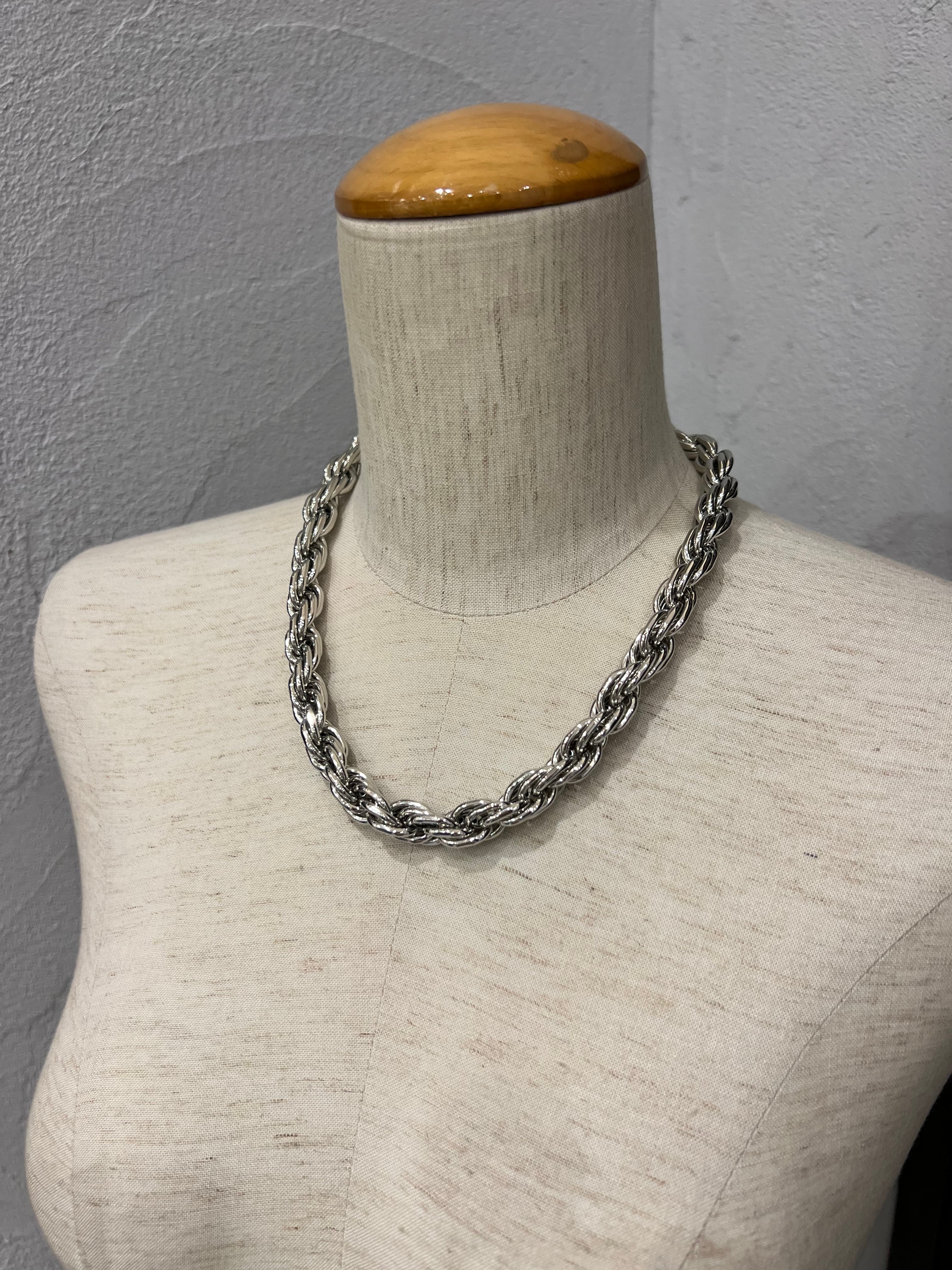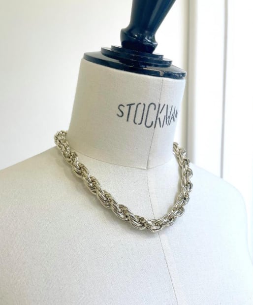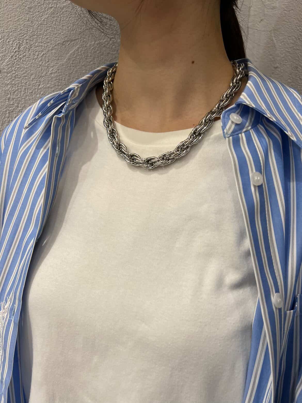 ボリューム感のあるねじれチェーンネックレスは、大人カジュアルスタイルのアクセントにピッタリ。ポイントが上重心になることでスタイルアップ効果も狙えます。