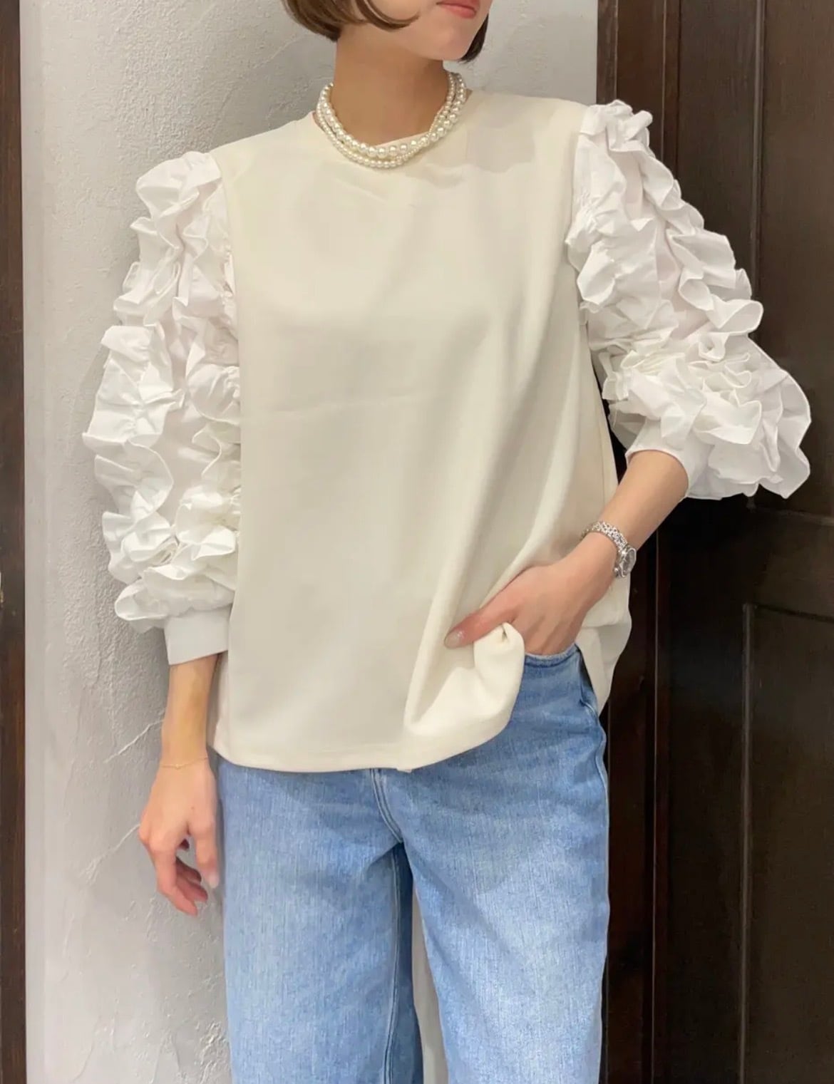 大小のパールが重なりスタイリングをぐっと華やかに仕上げてくれます。