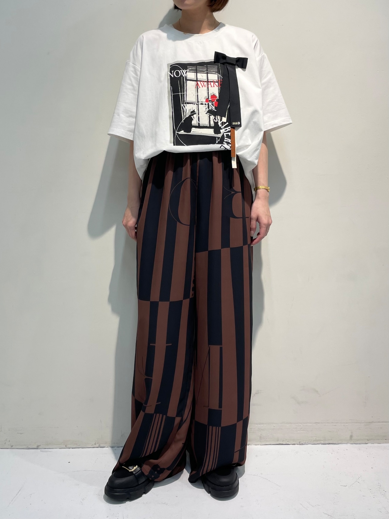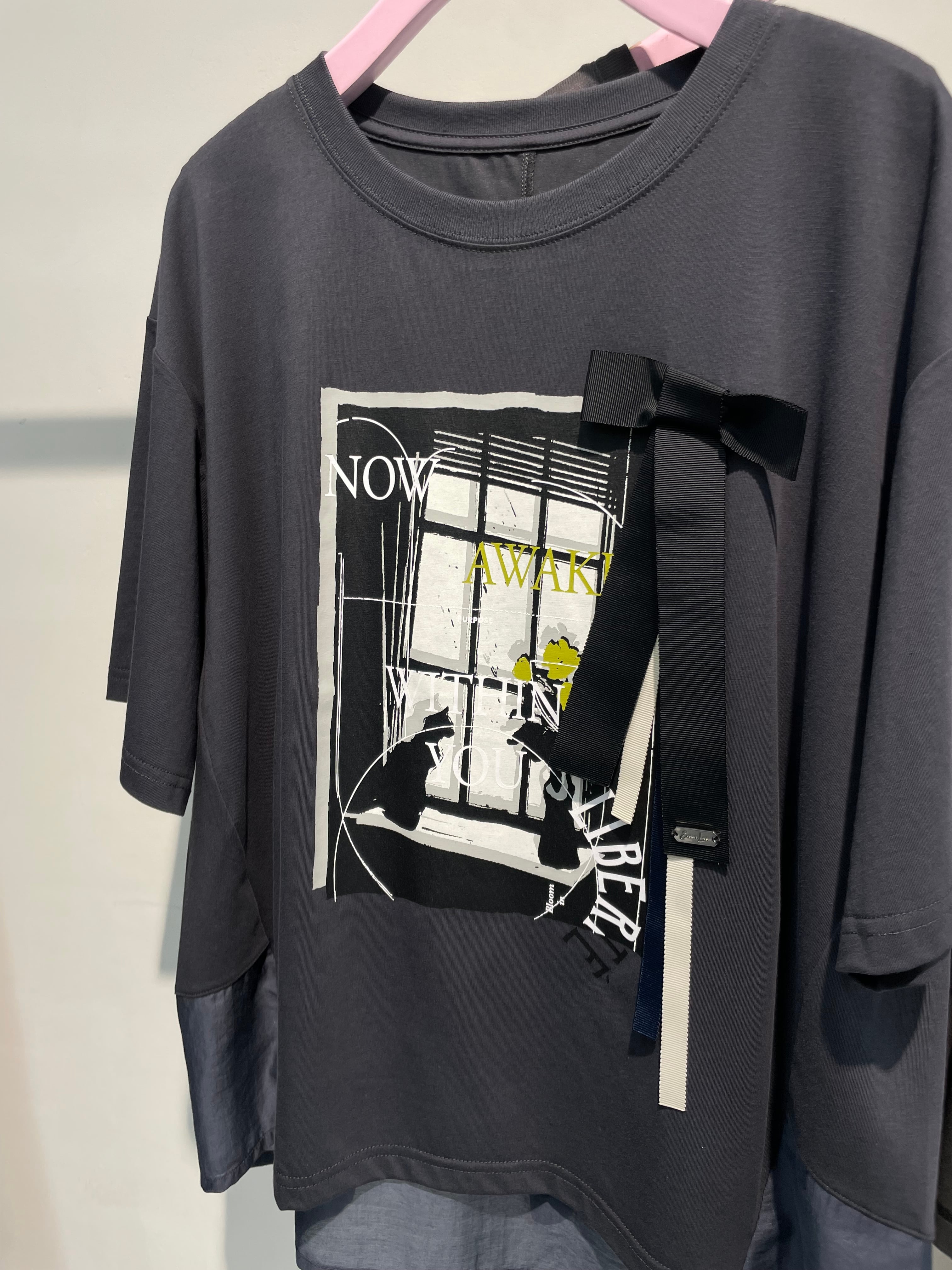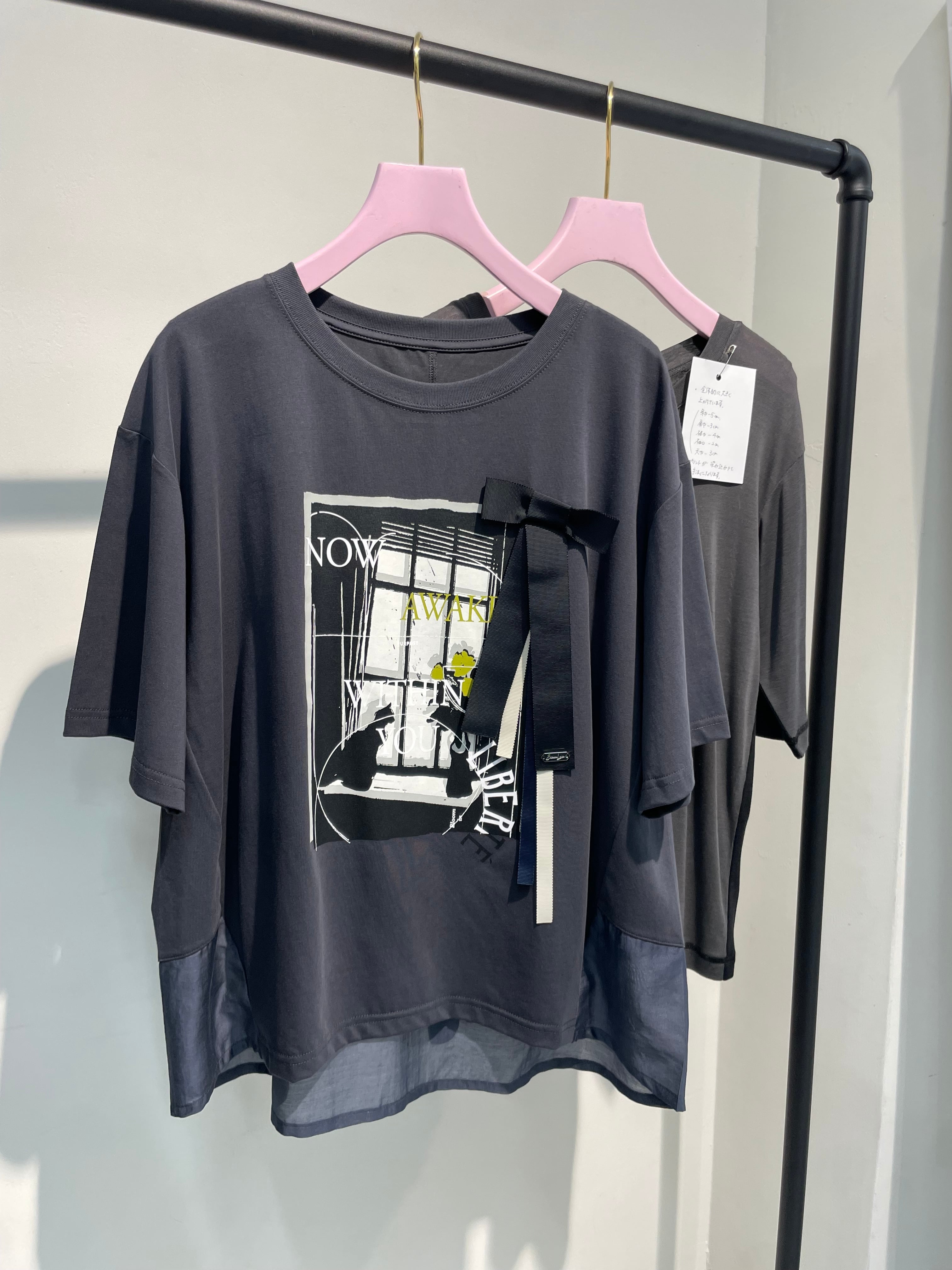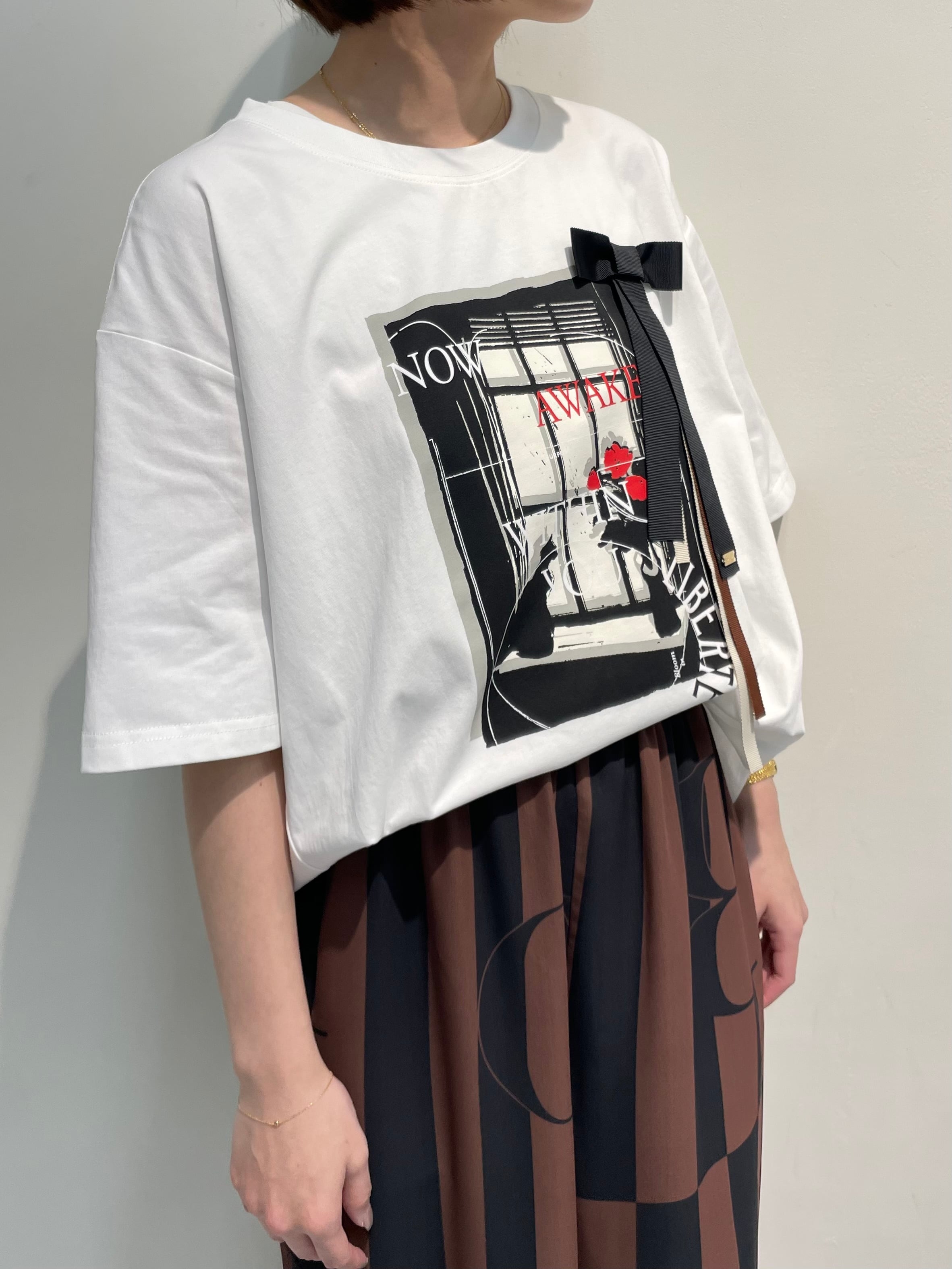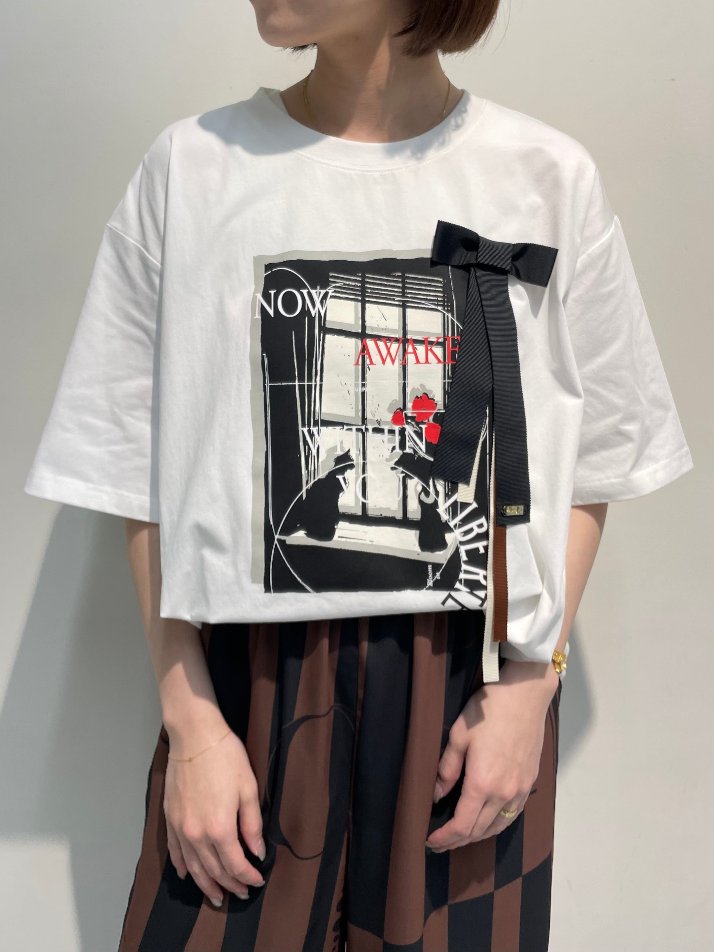 リボンやアートプリントが大人可愛いアクセントになり、シンプルなTシャツに飽きがちな夏のスタイリングに新鮮さを添えてくれる一枚です。