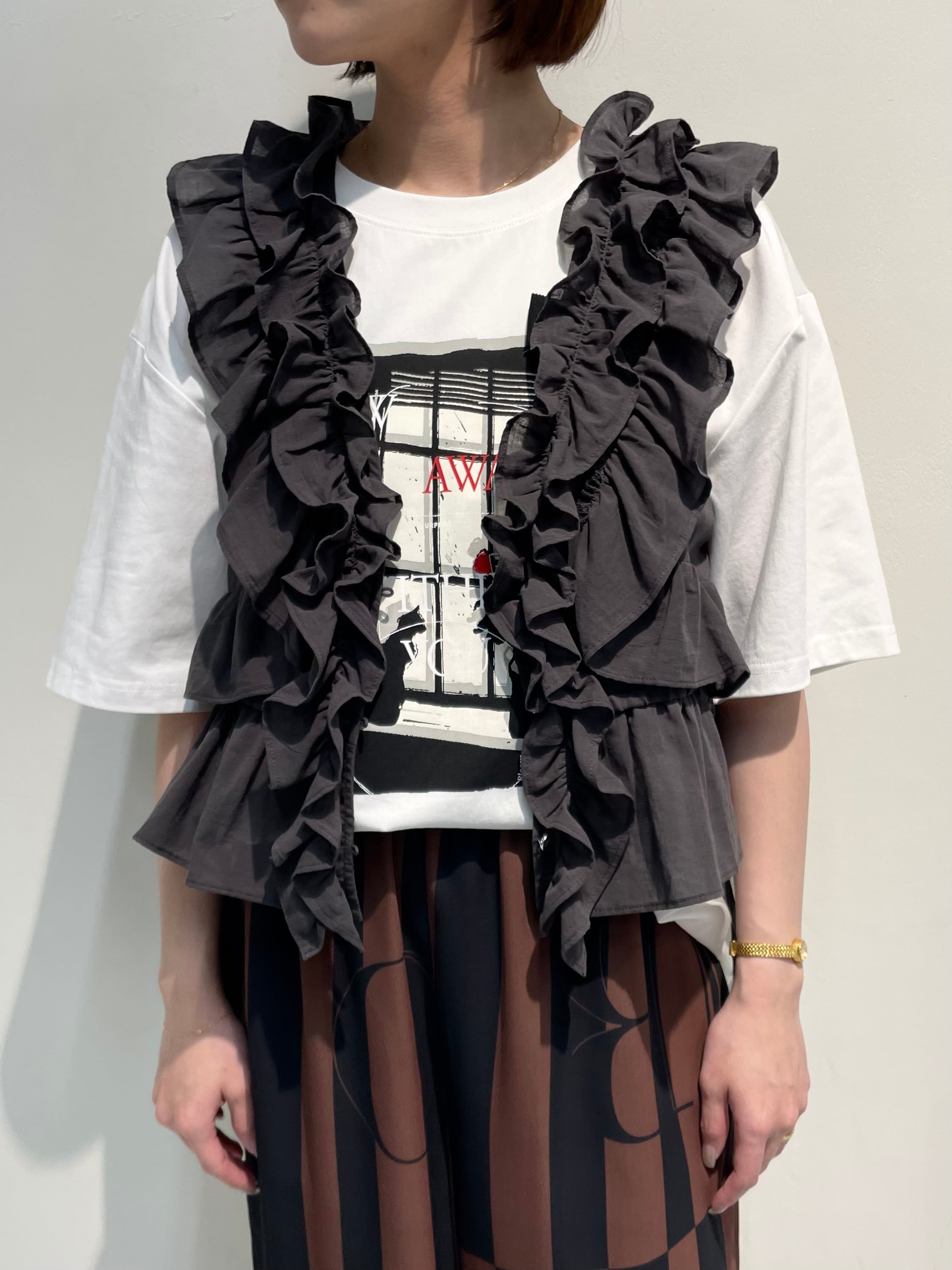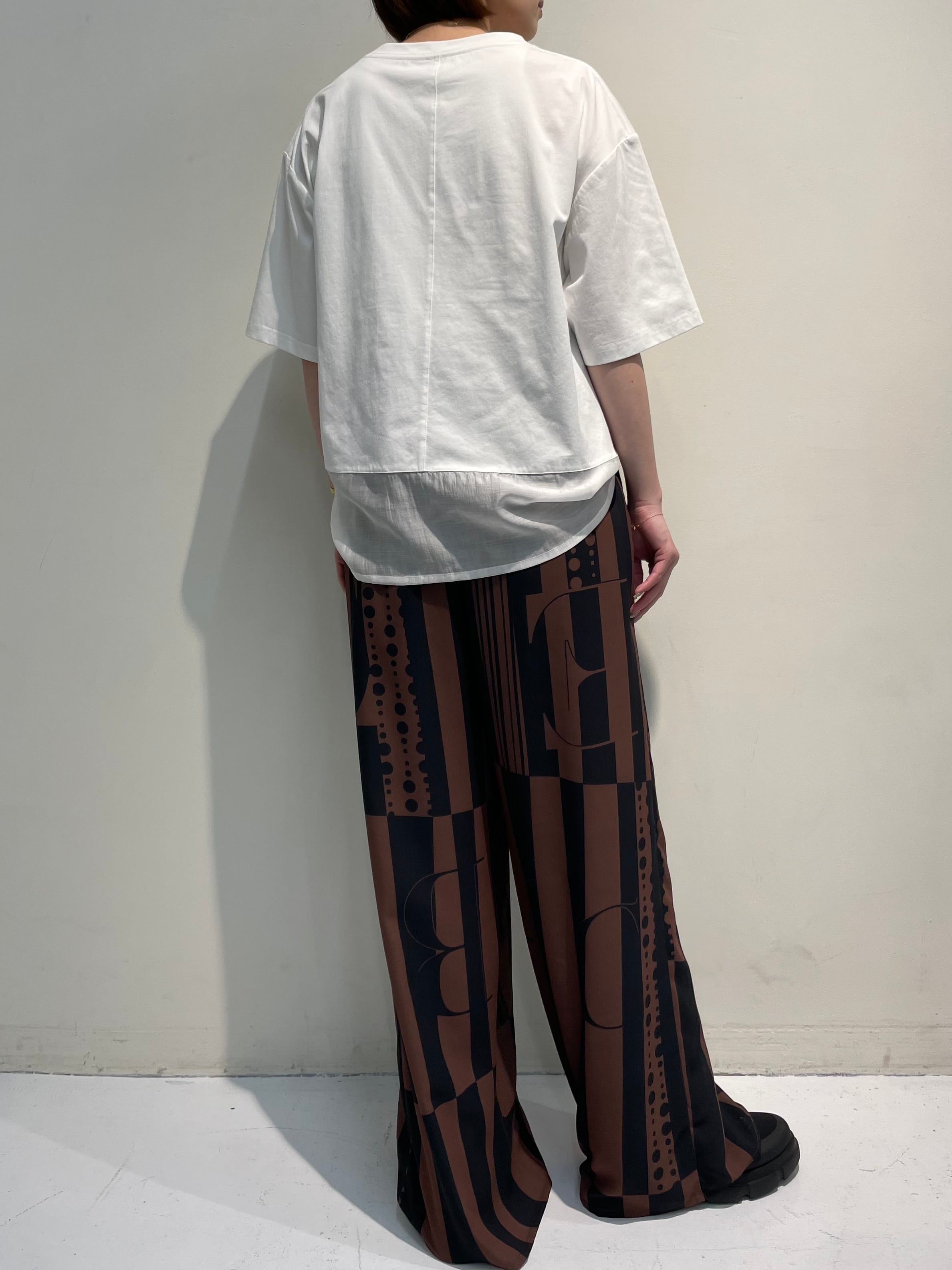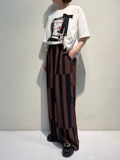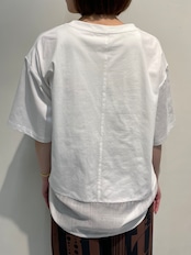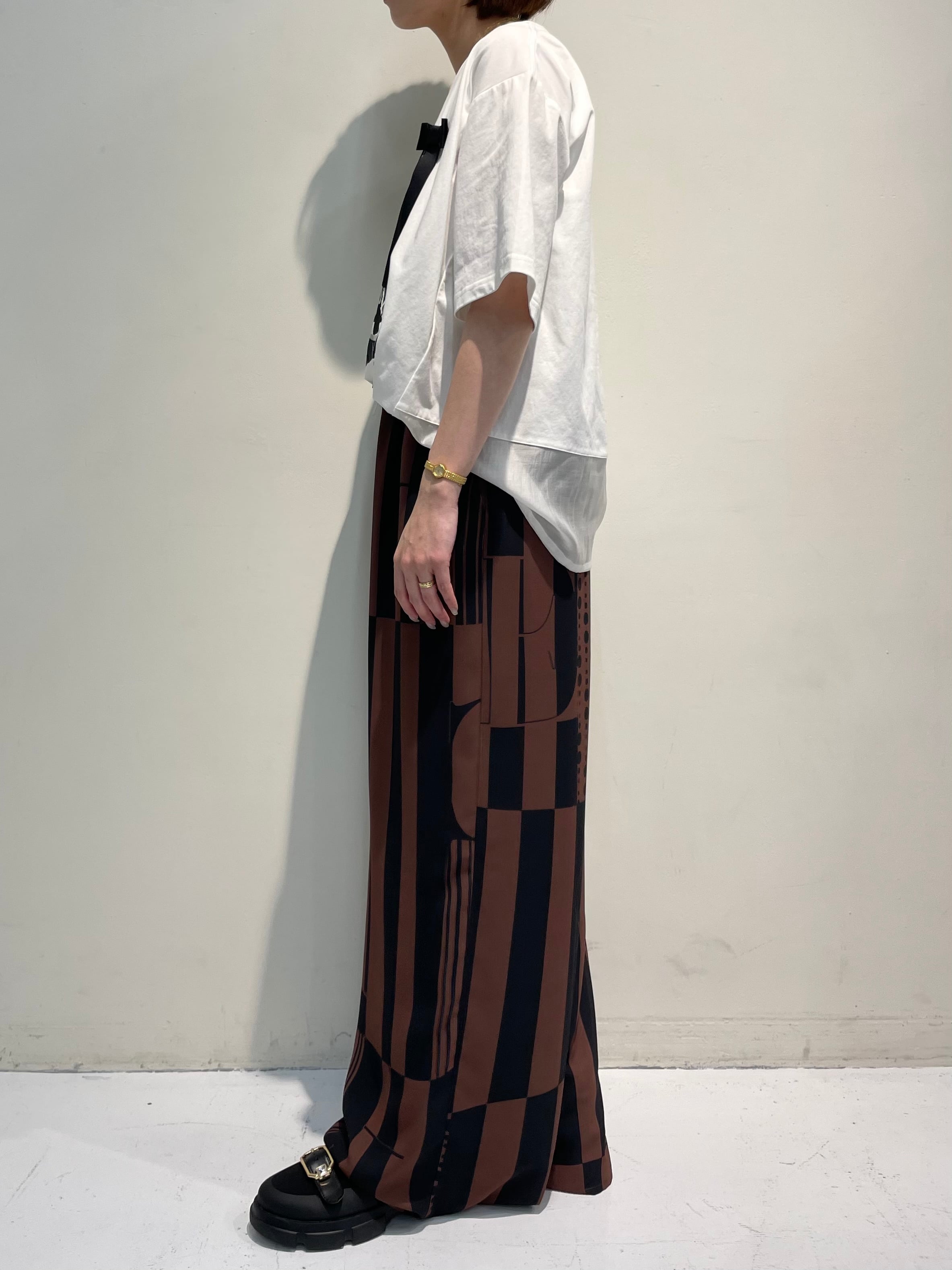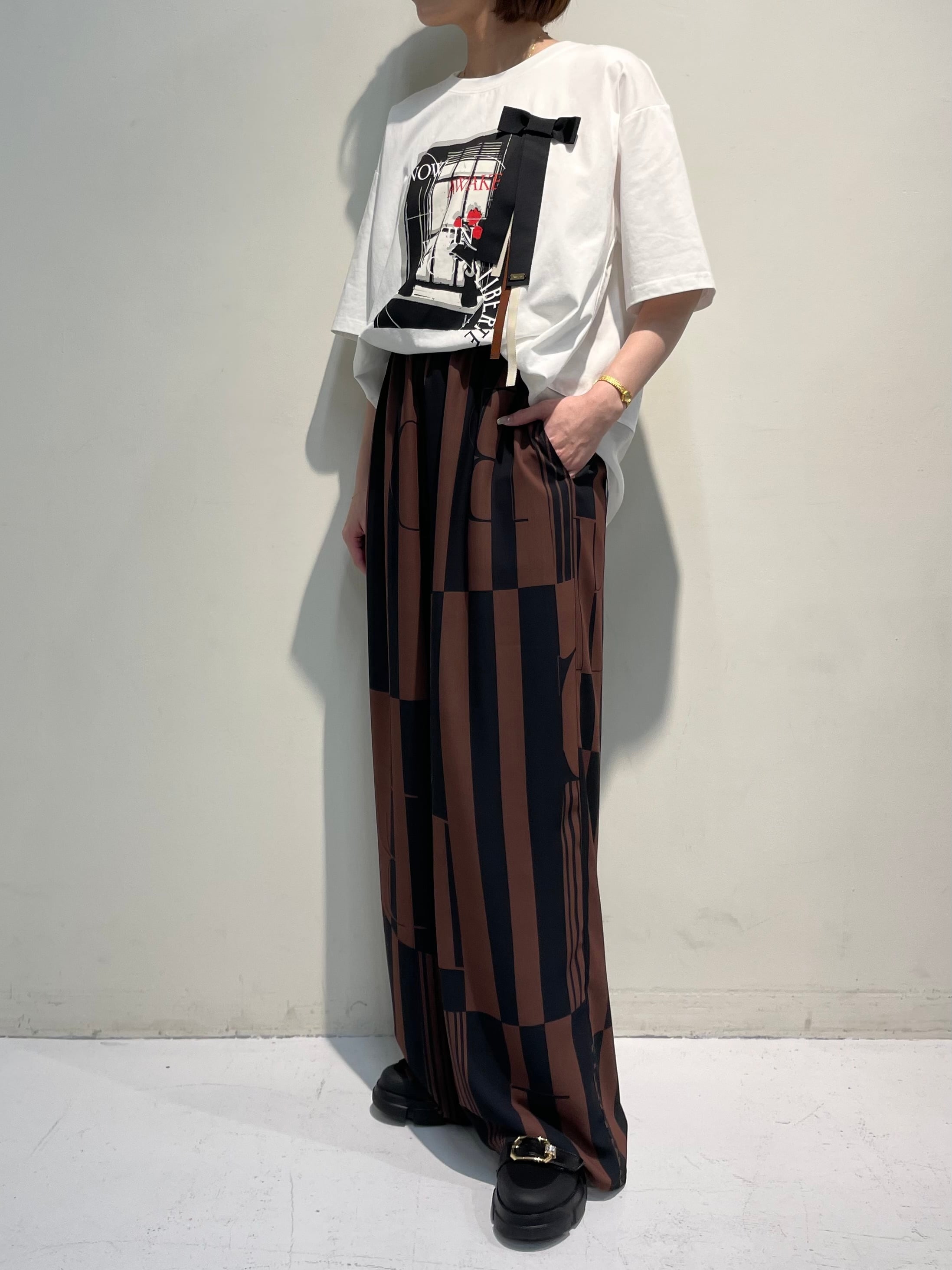 リボンやアートプリントが大人可愛いアクセントになり、シンプルなTシャツに飽きがちな夏のスタイリングに新鮮さを添えてくれる一枚です。