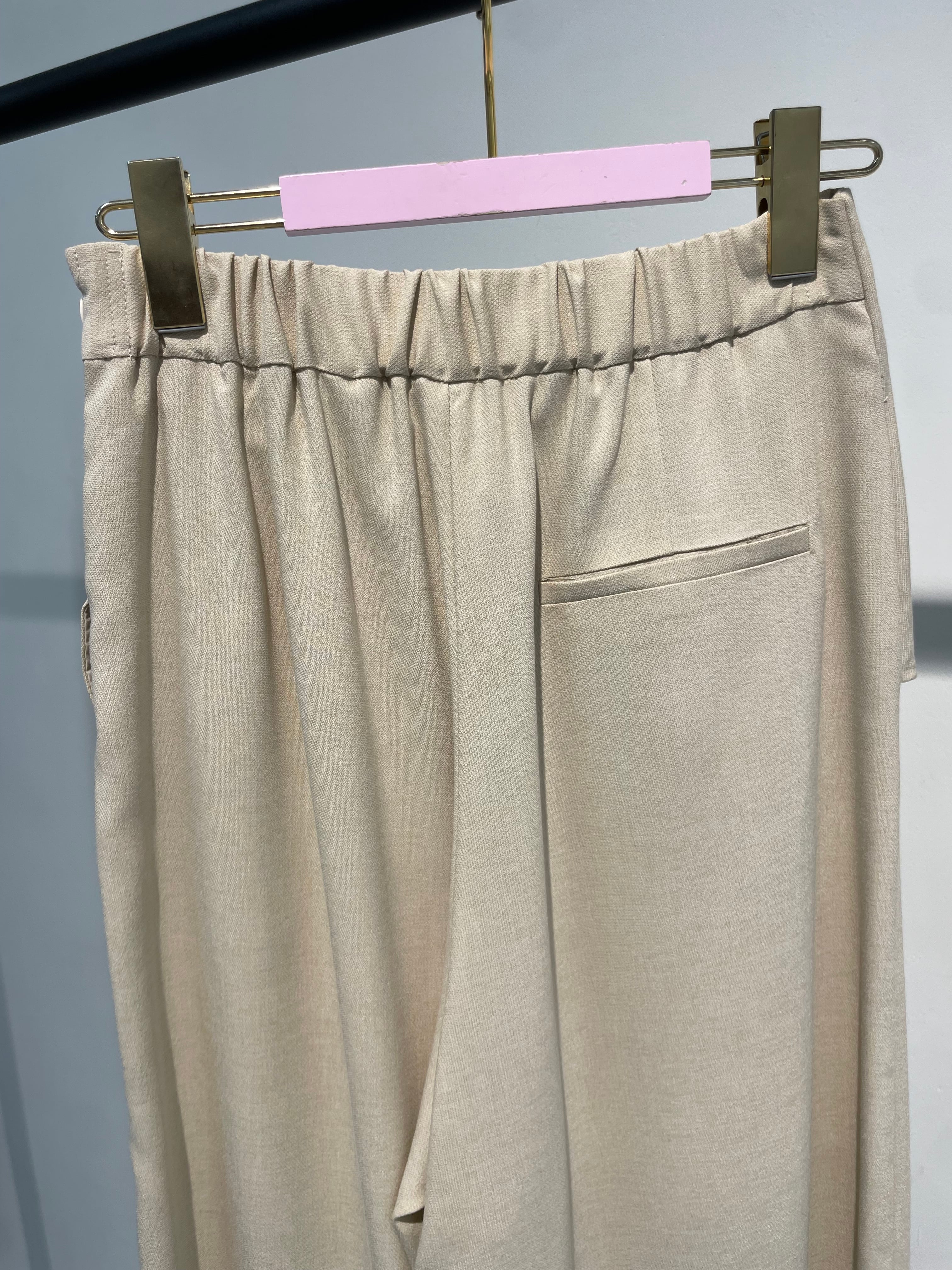 ウエストはサイドファスナー仕様でフロントはすっきり、後ろゴムで履き心地も快適。