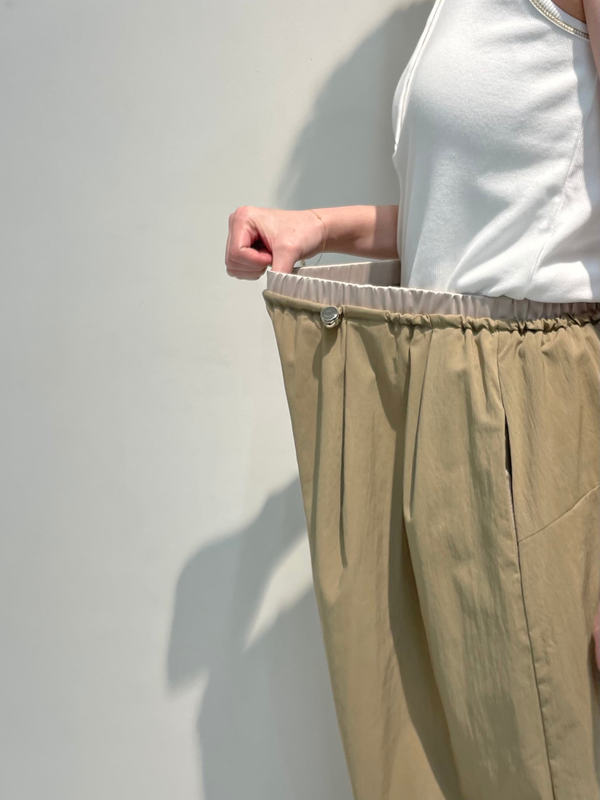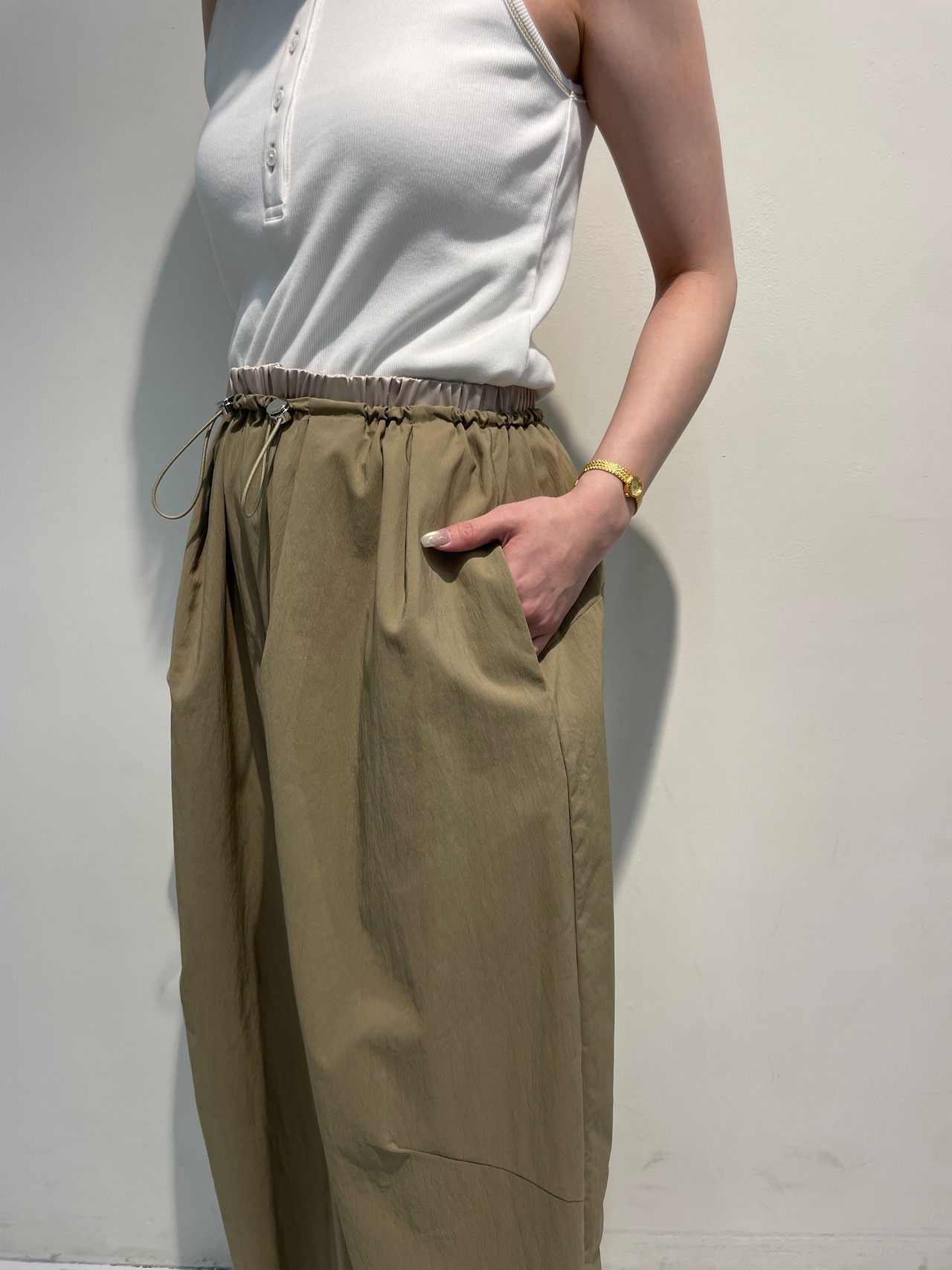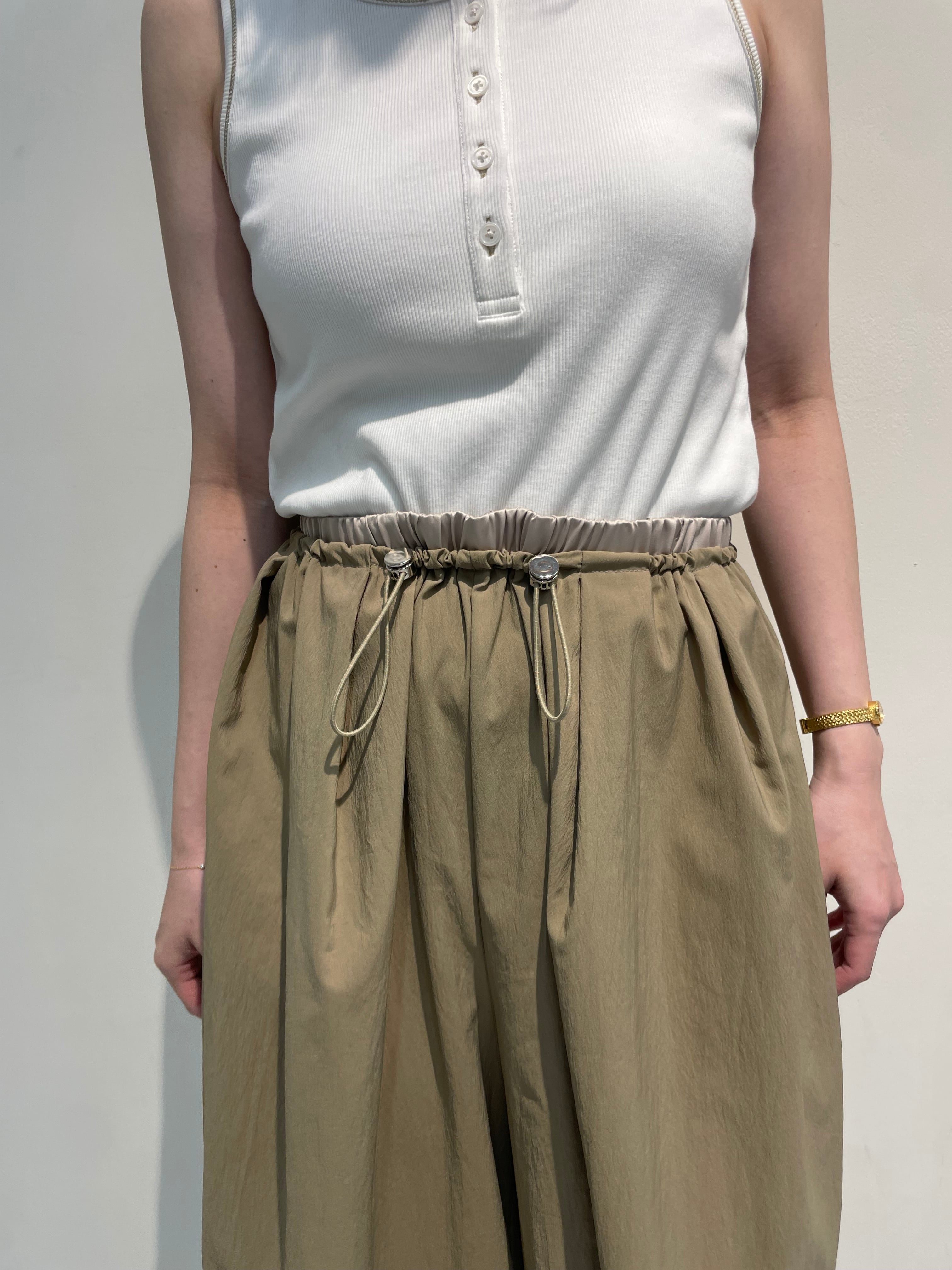 ウエストは総ゴム仕様に加え、ドロストで簡単にサイズ調整が可能。