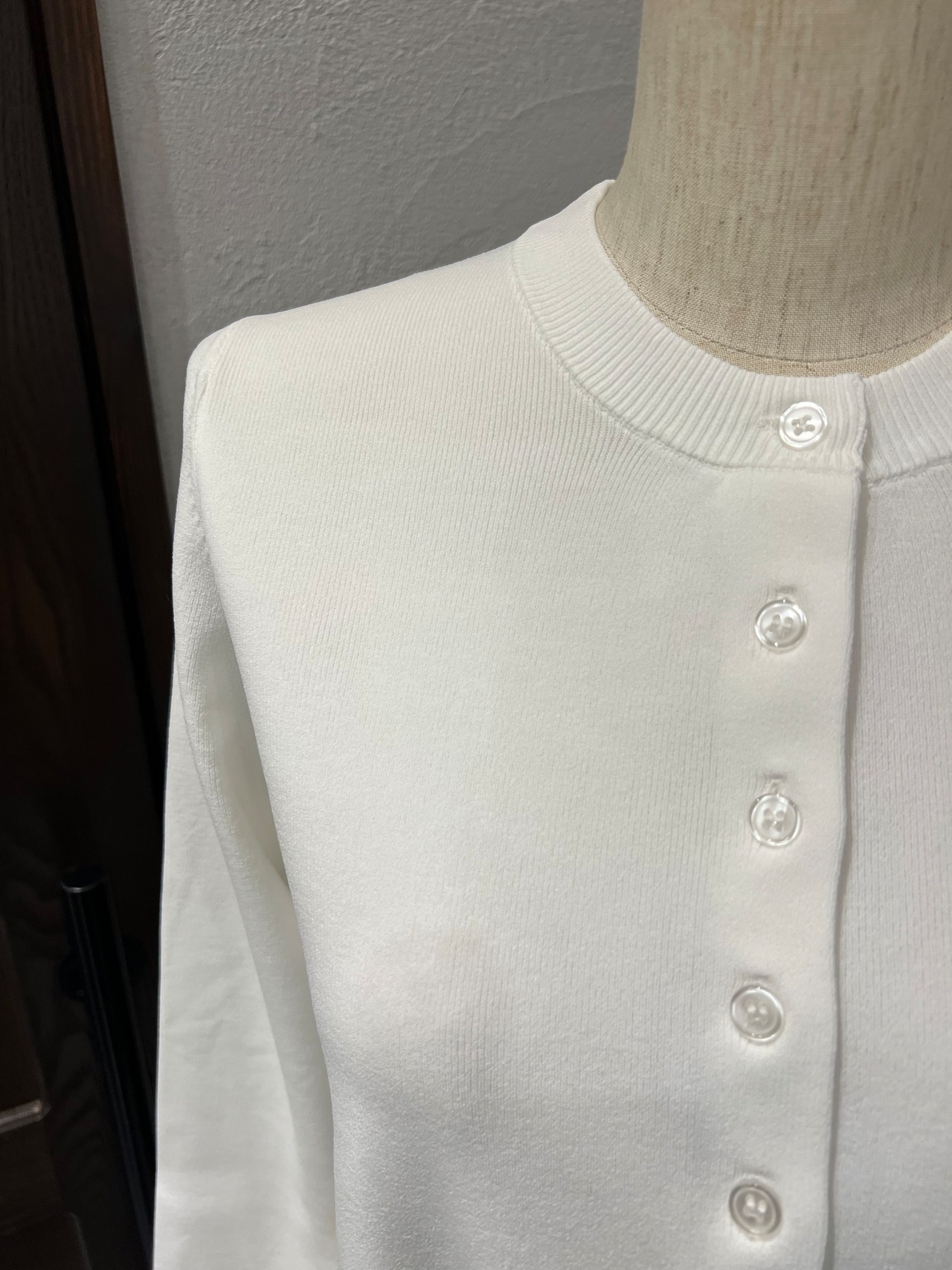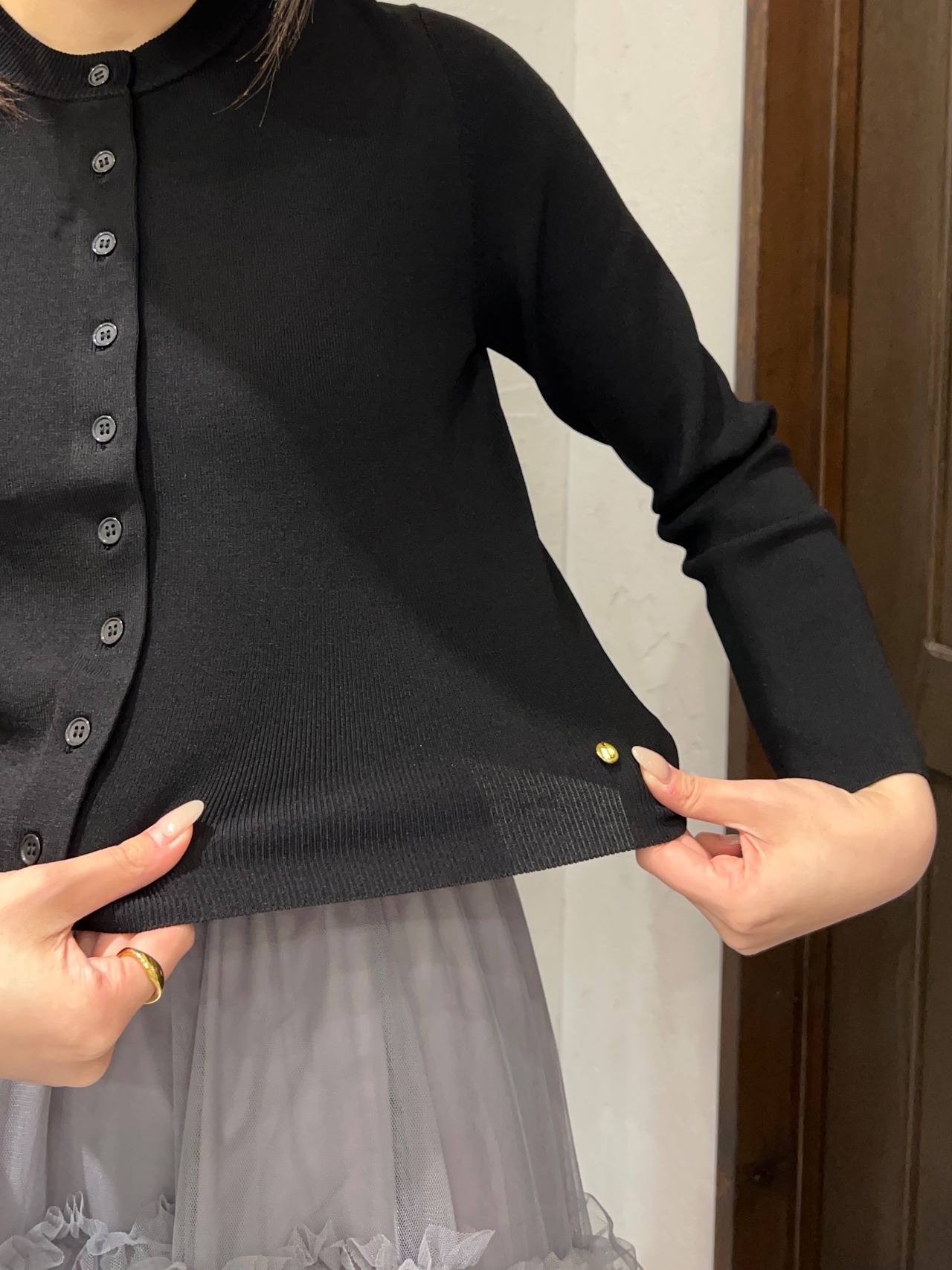 フロントのボタンデザインがさりげないアクセントになり、1枚で着ても羽織としても活躍します。