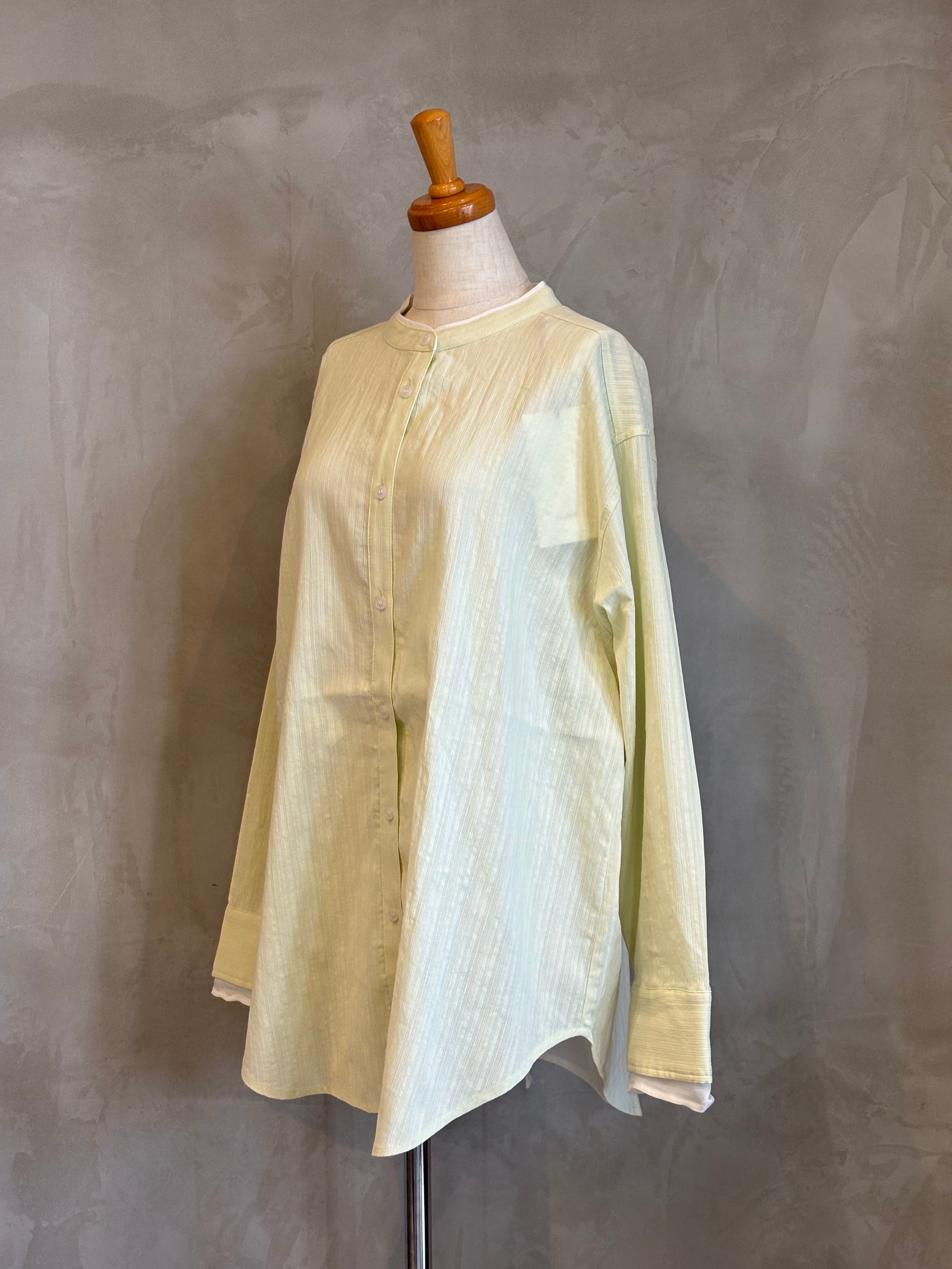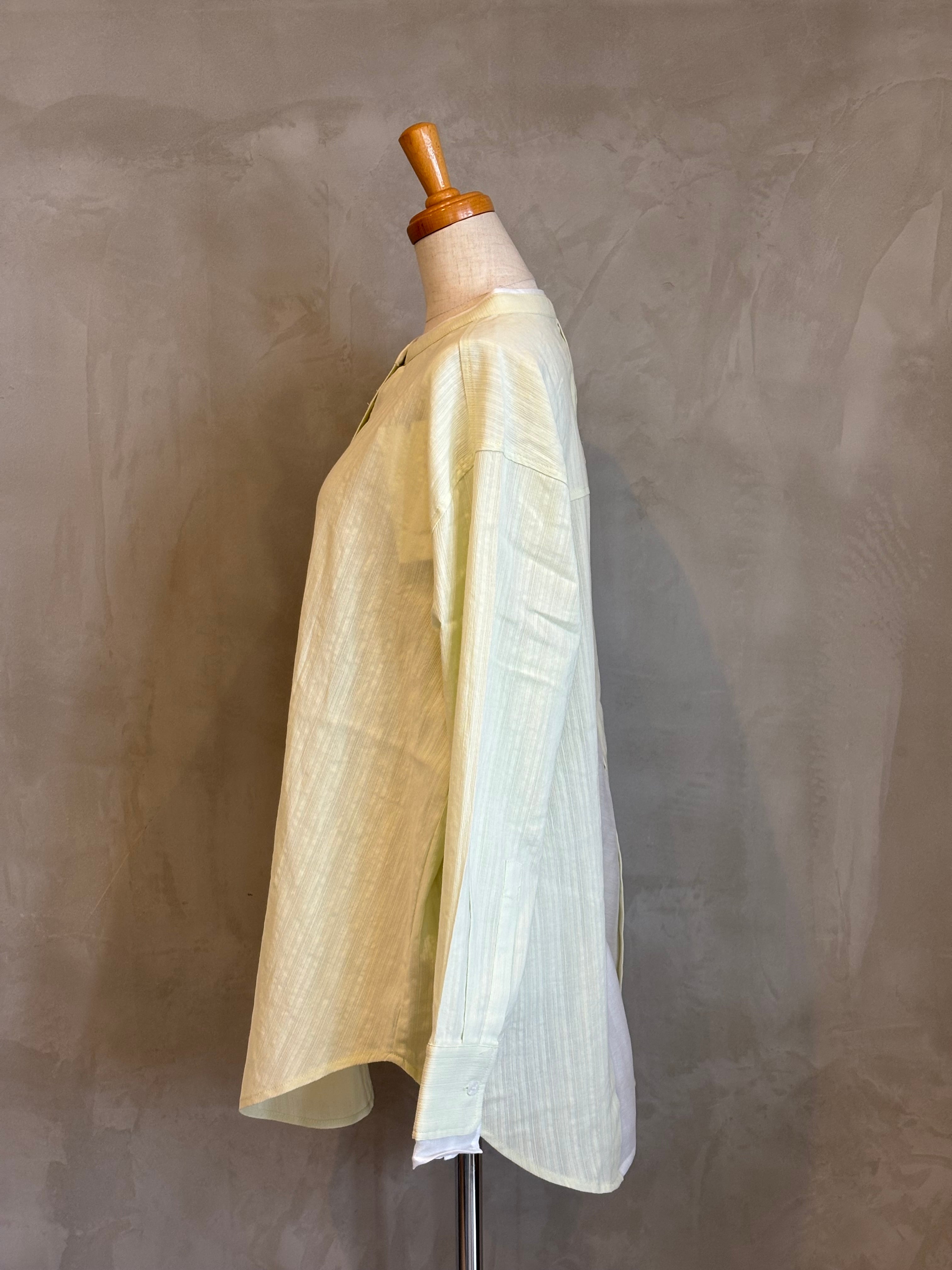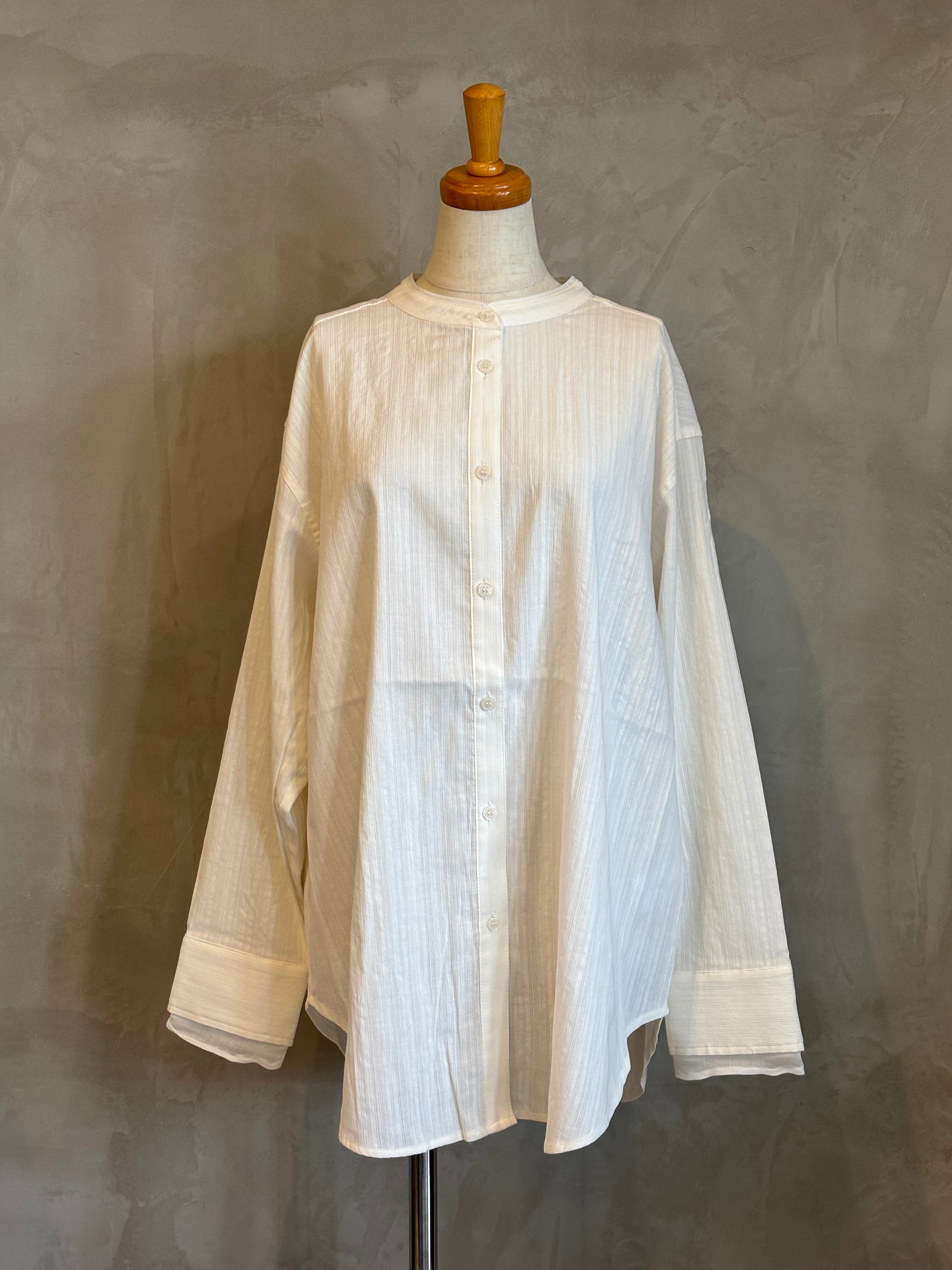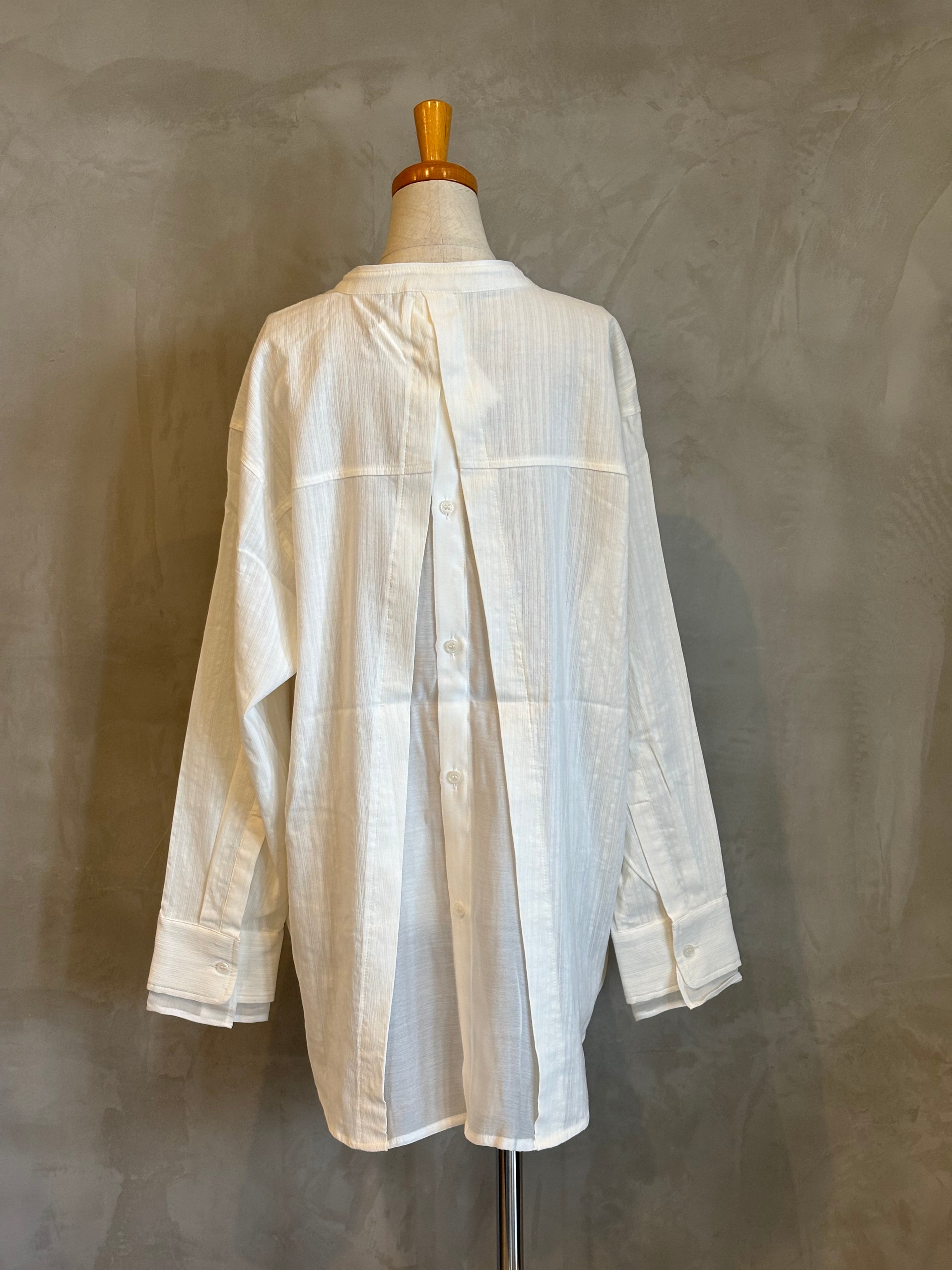 透け感のあるシアー素材を後ろヨーク下と袖口にドッキングした異素材ミックスシャツ