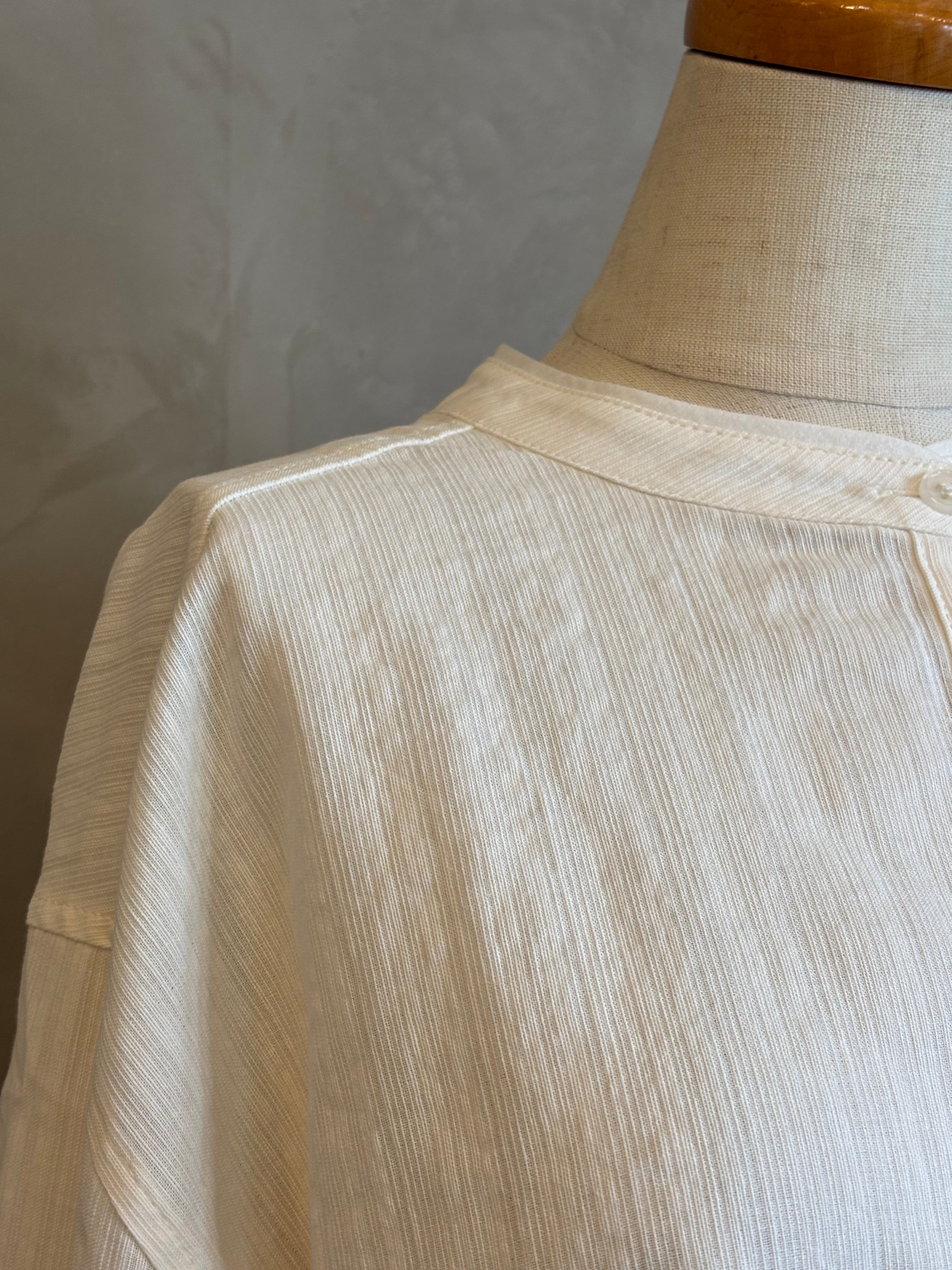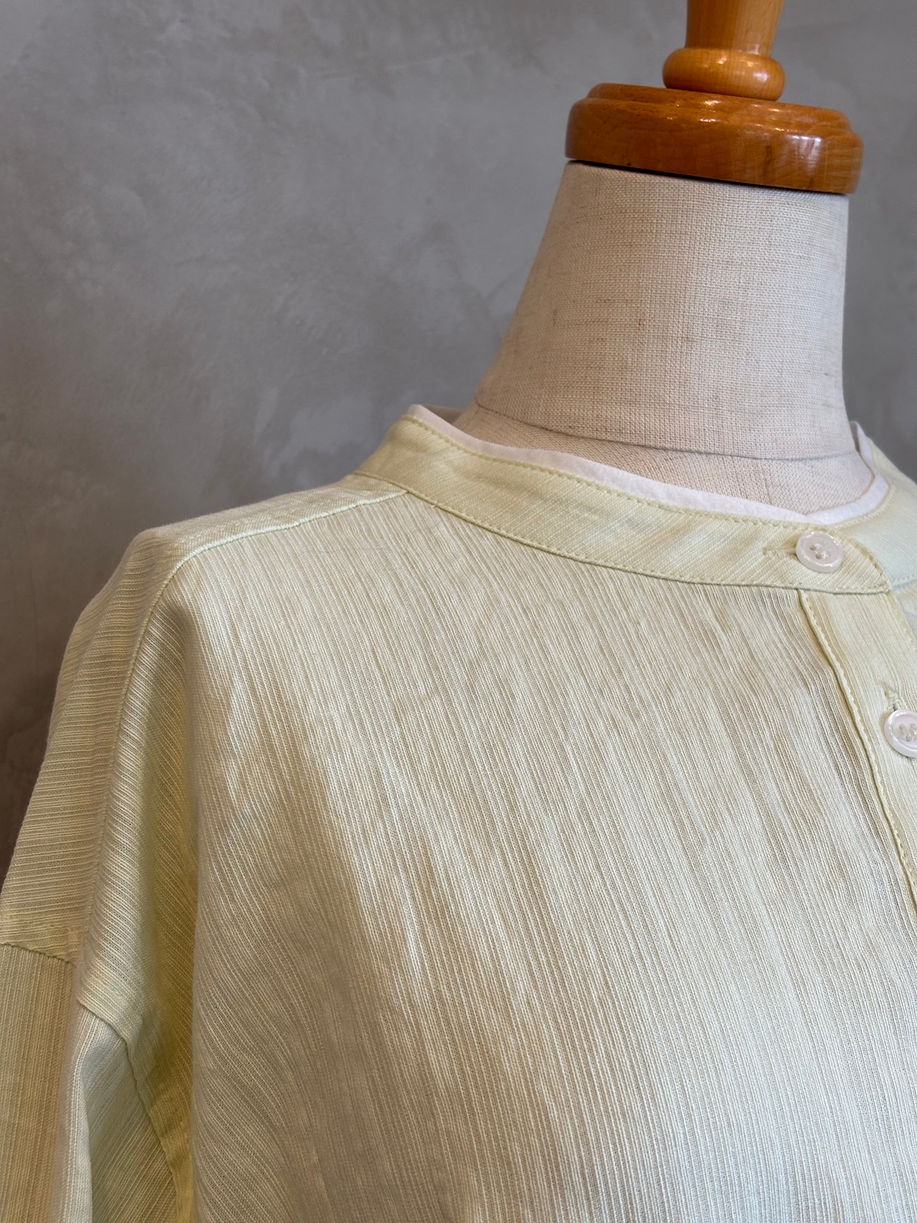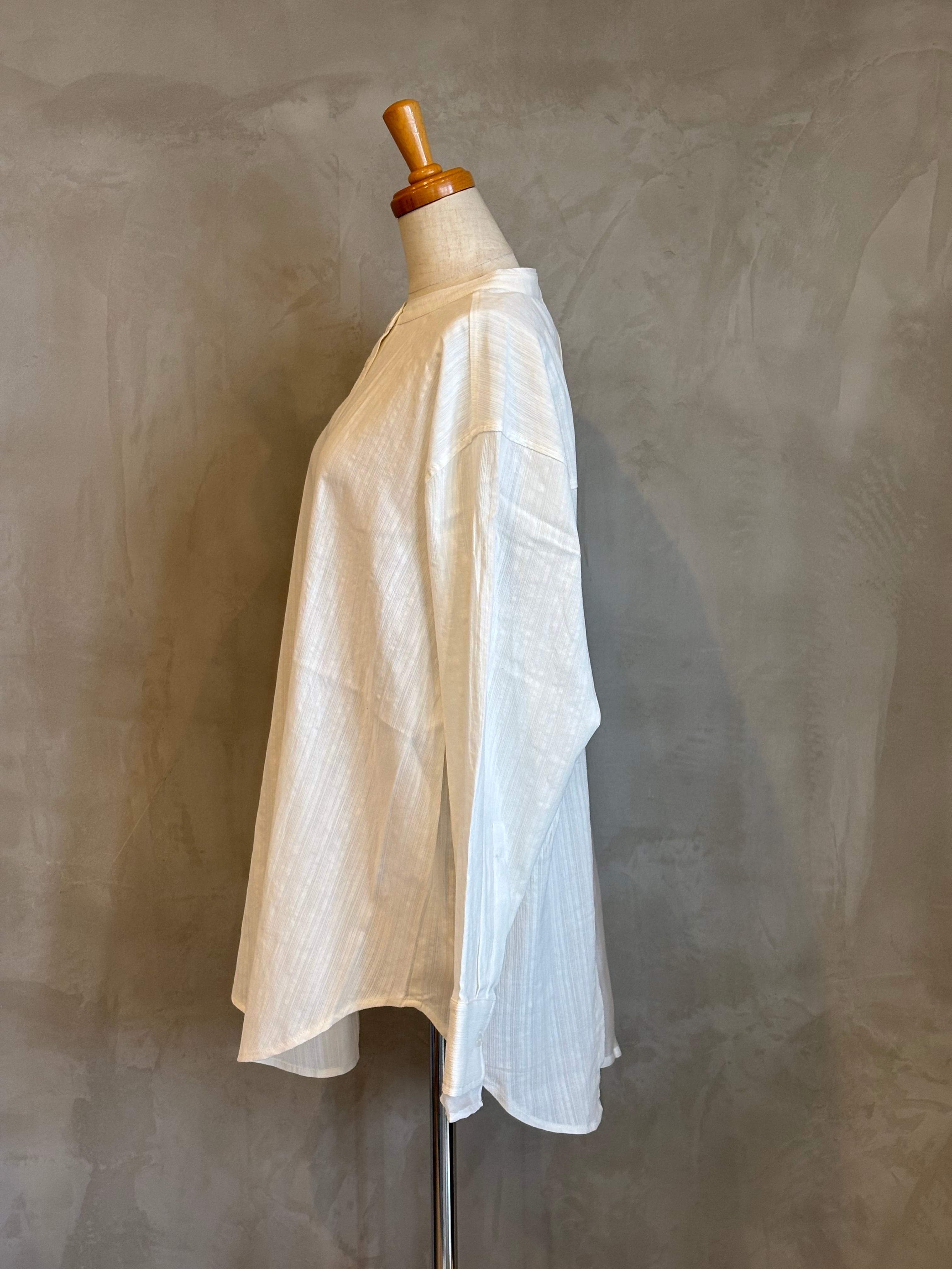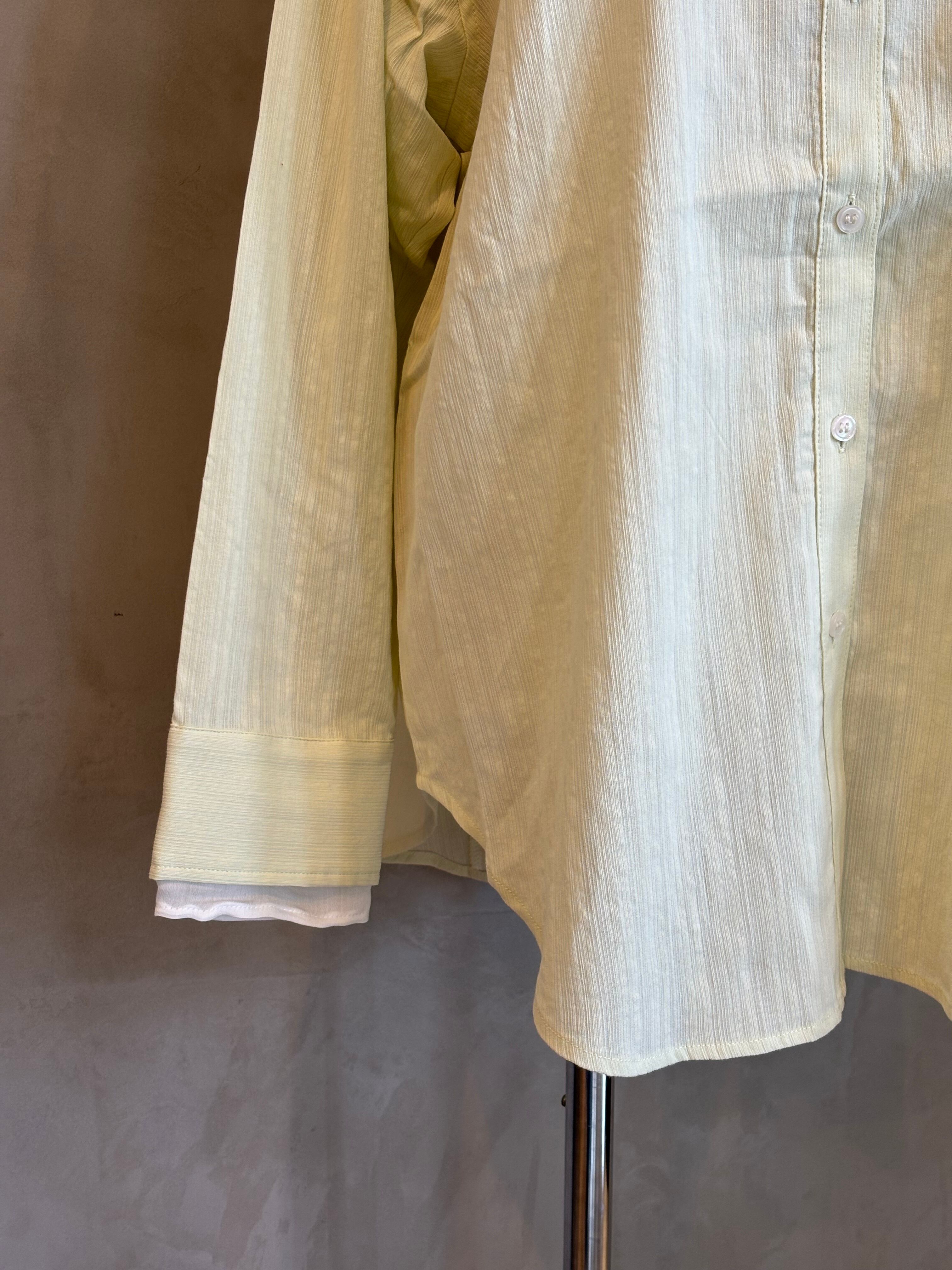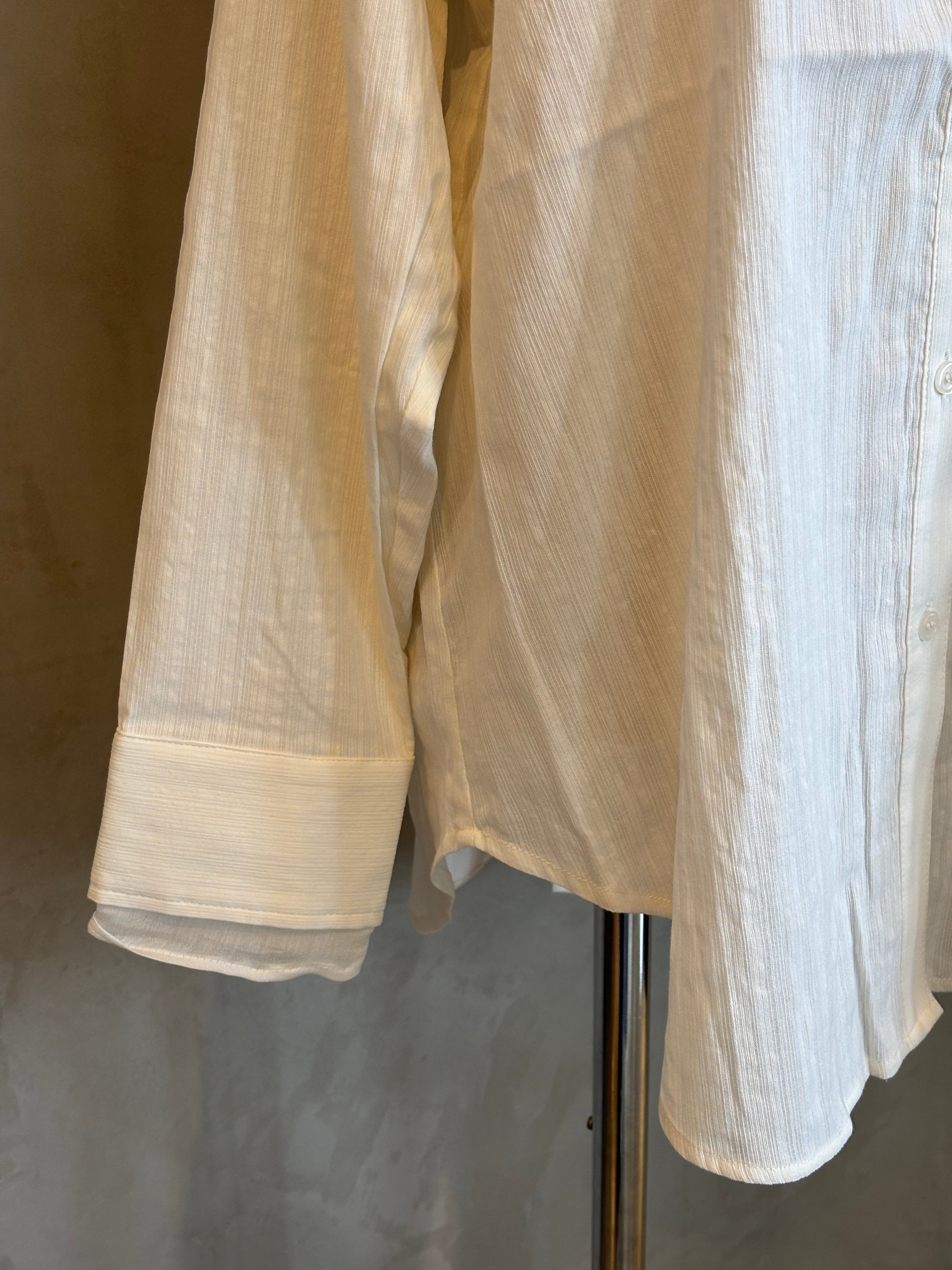 透け感のあるシアー素材を後ろヨーク下と袖口にドッキングした異素材ミックスシャツ
