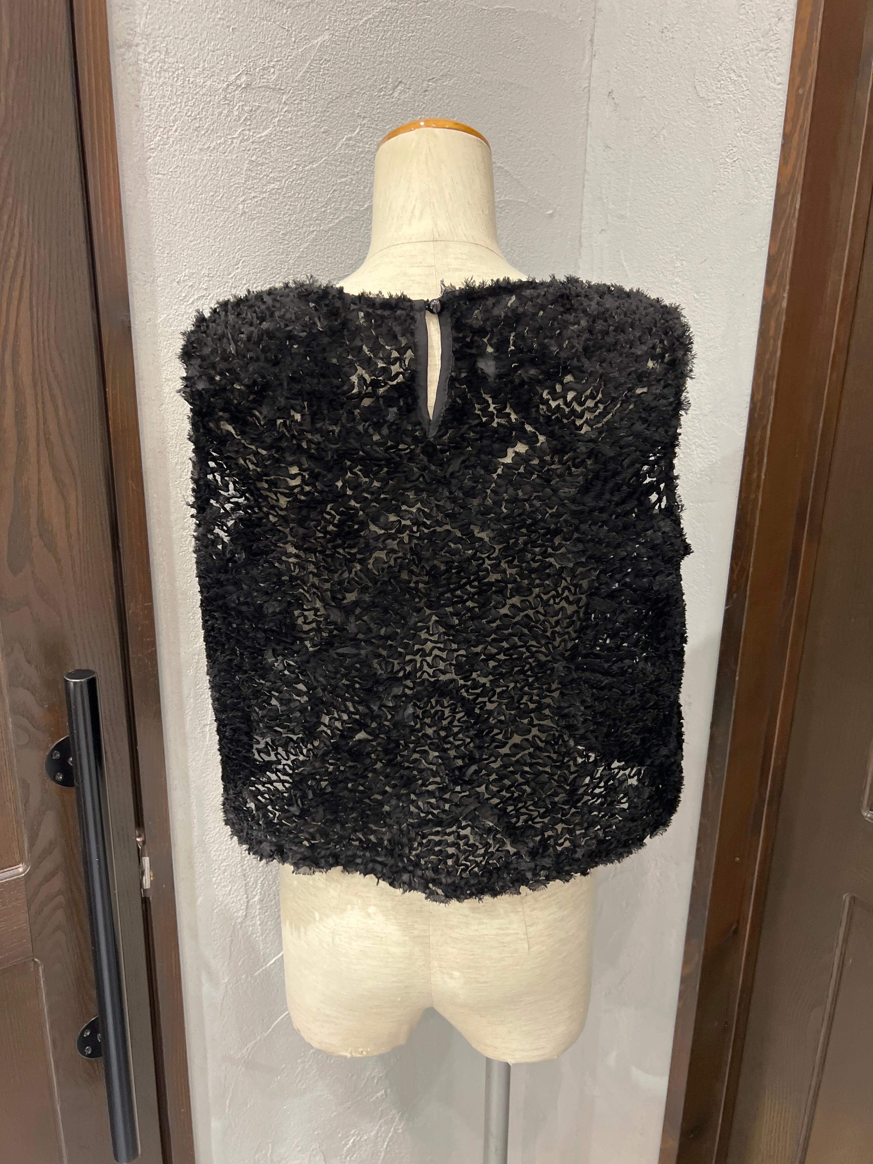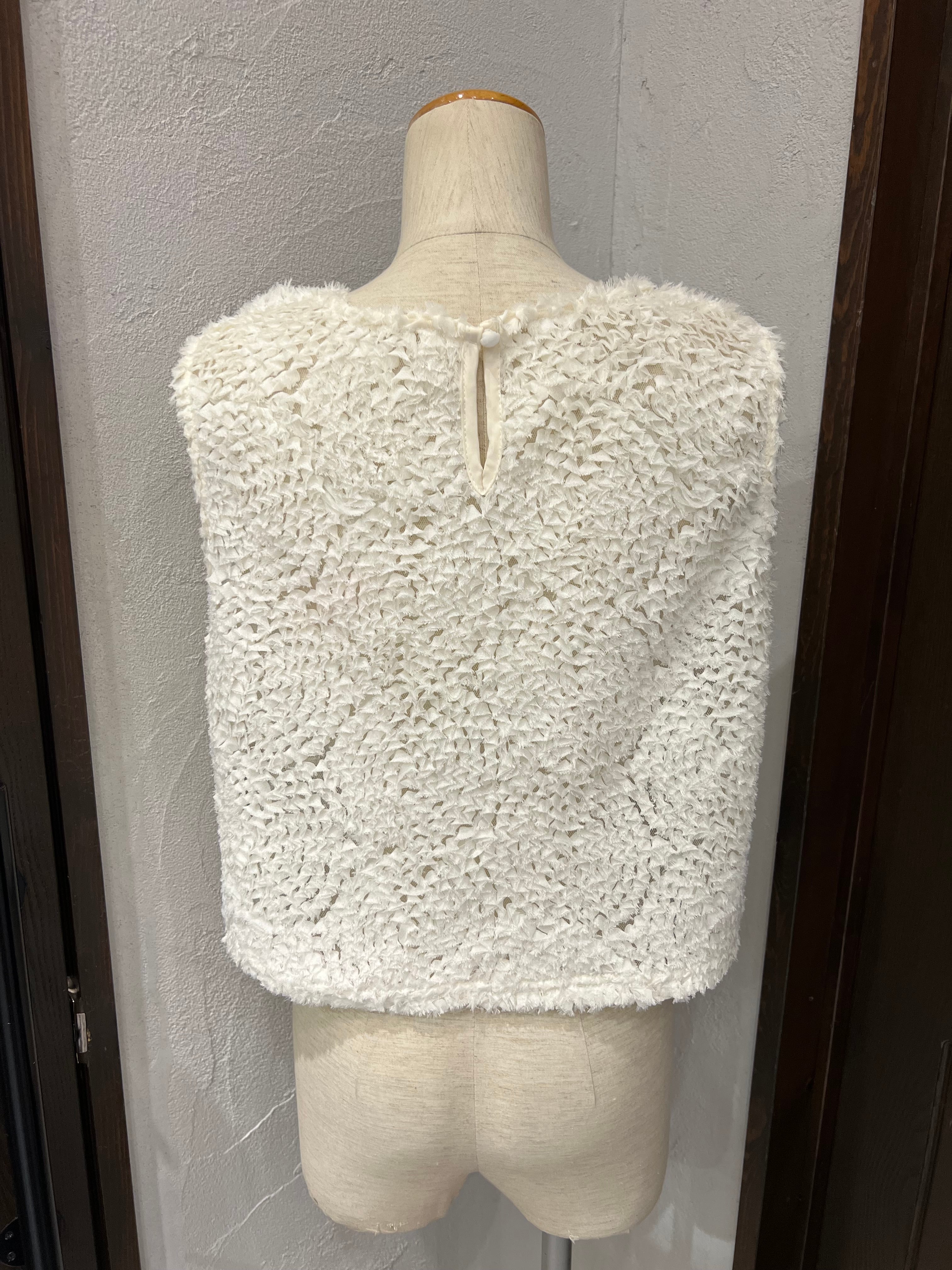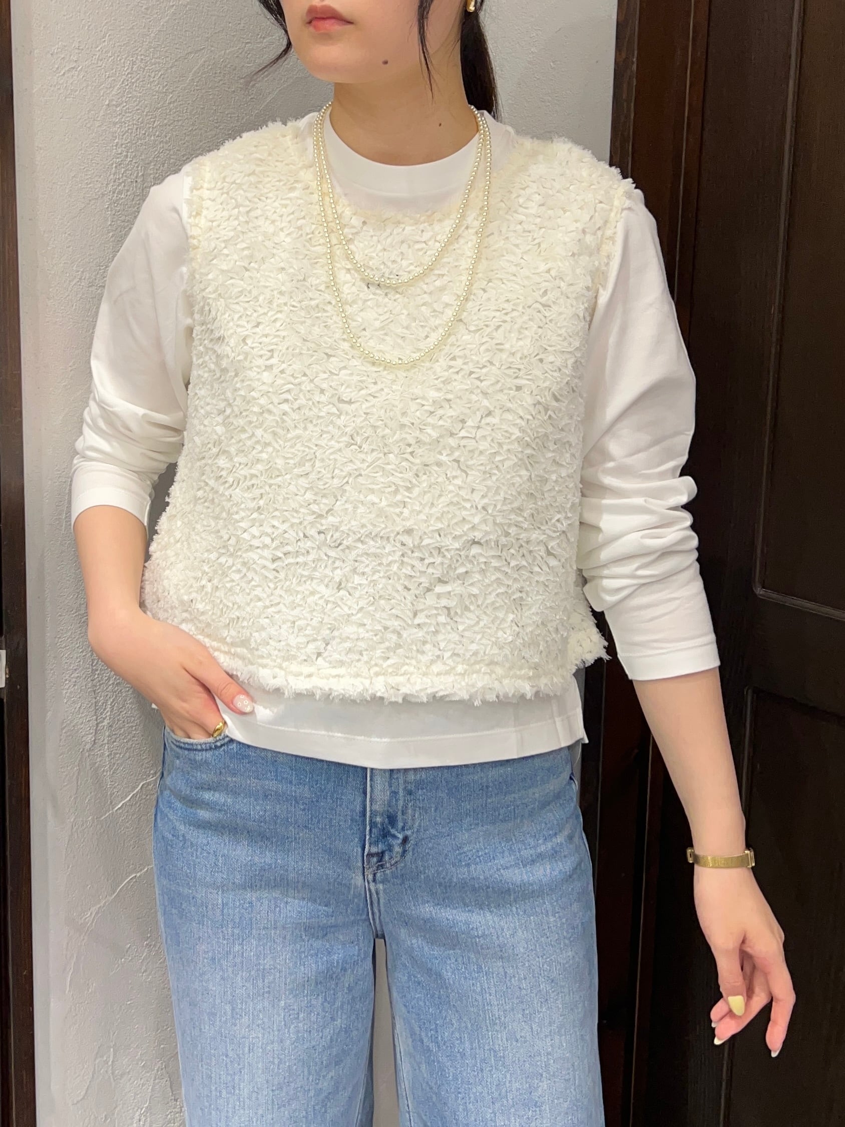 立体感のあるフリンジ素材が目を惹く、華やかトップス。