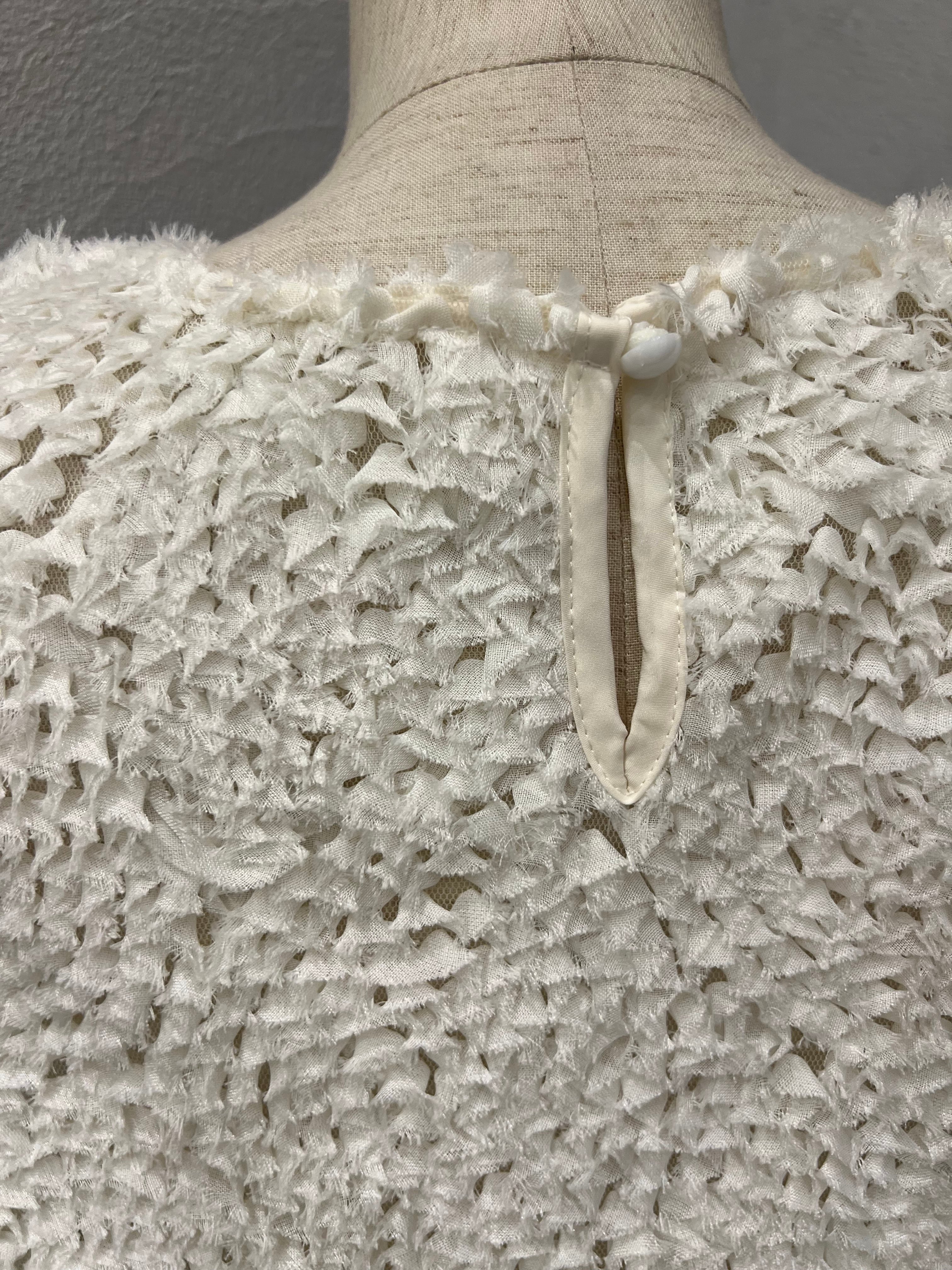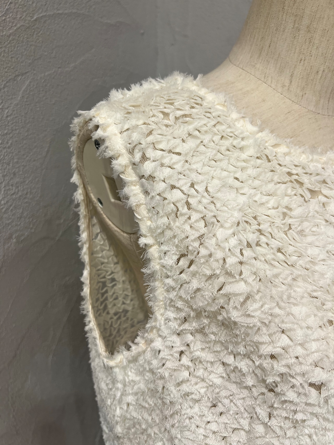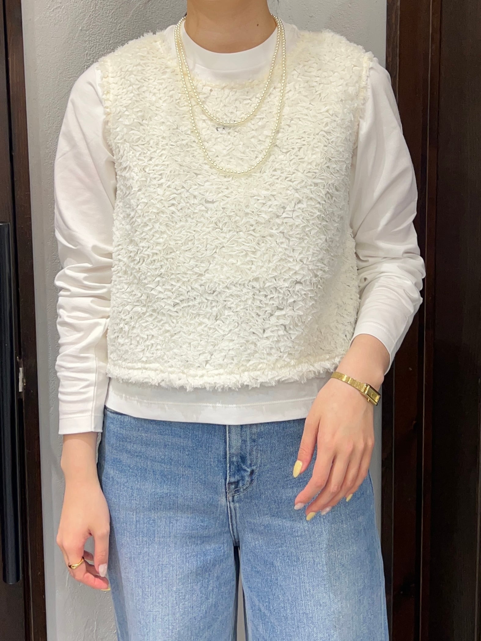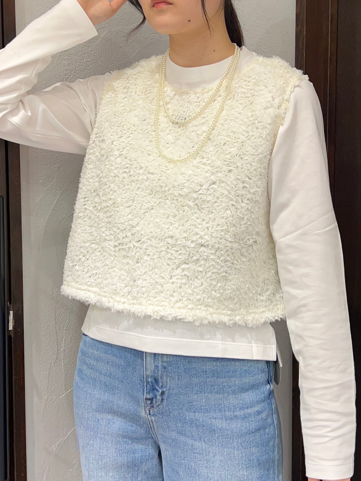 立体感のあるフリンジ素材が目を惹く、華やかトップス。