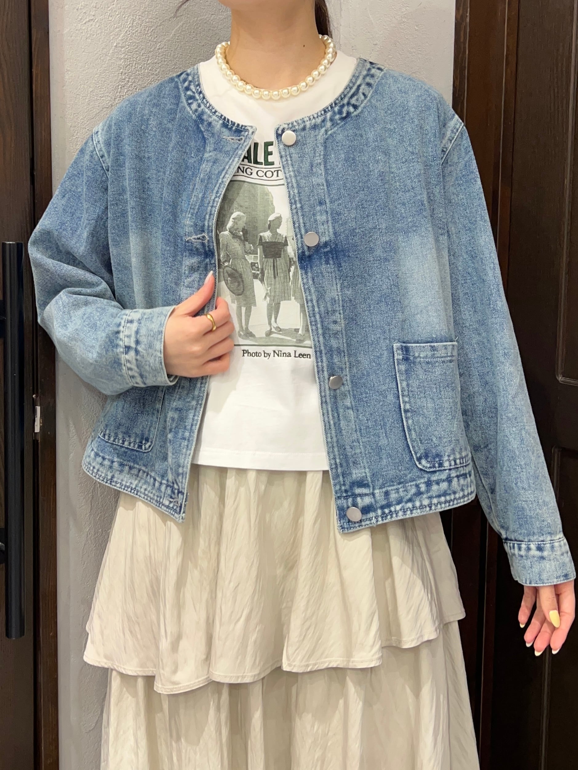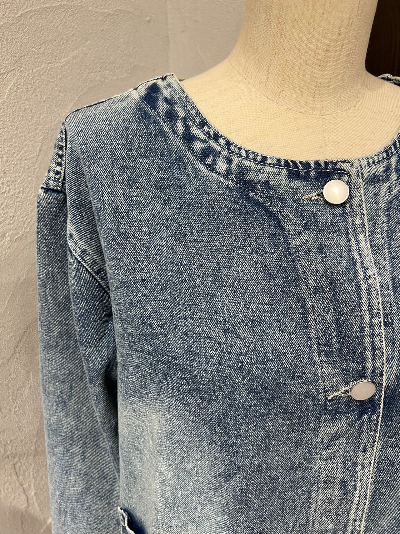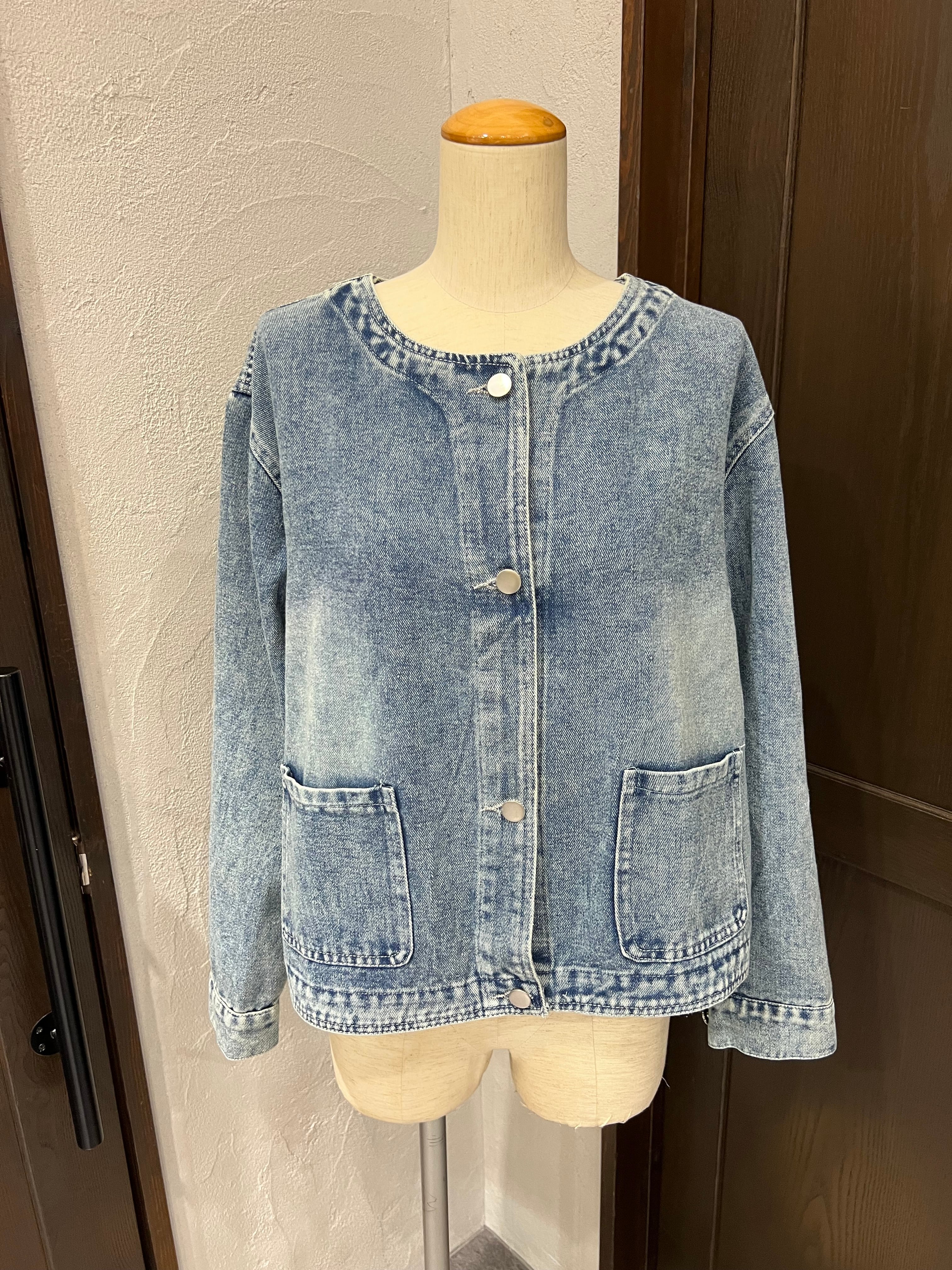 生地も柔らかく軽いノーカラーデニムジャケット。