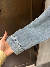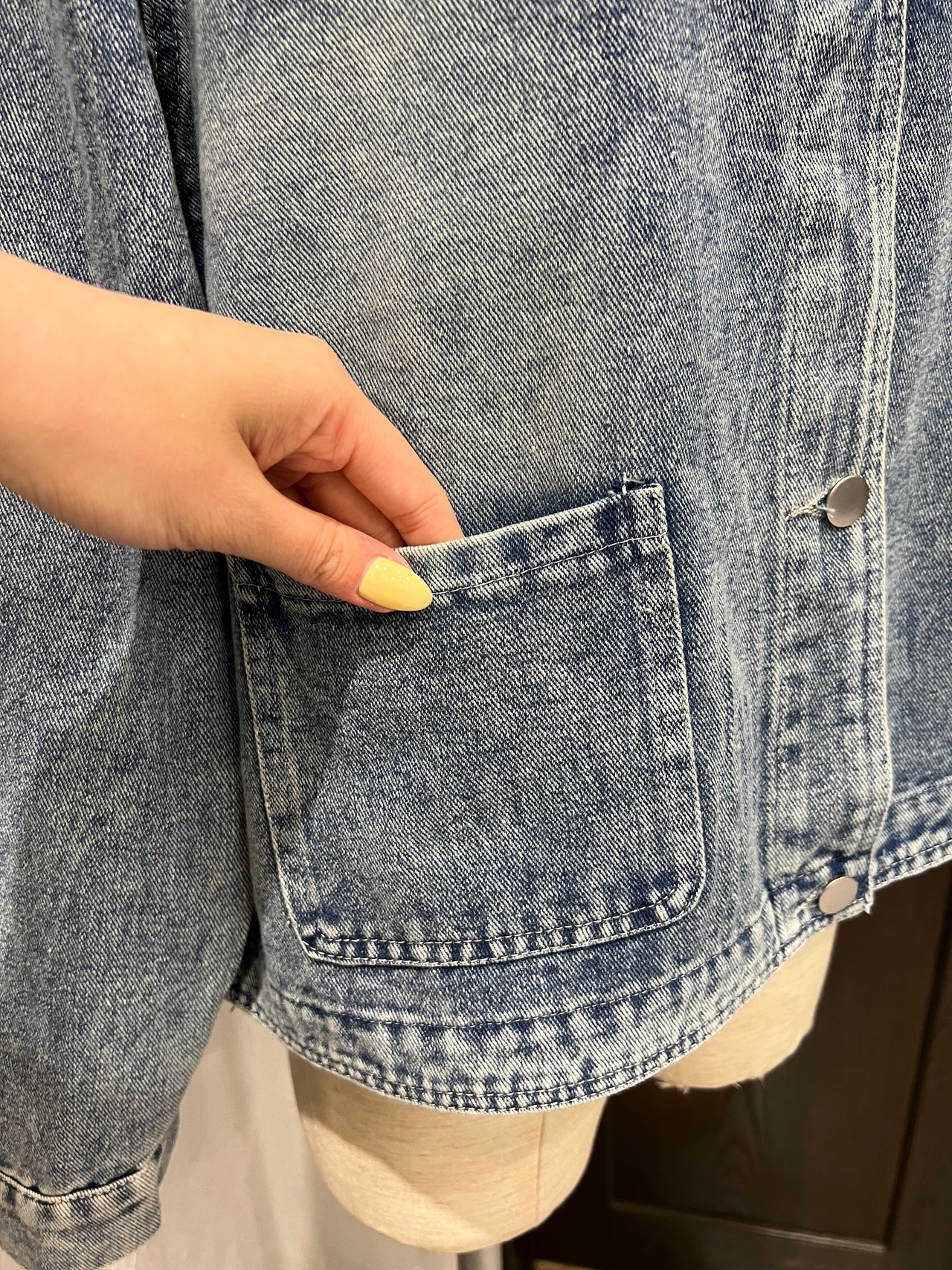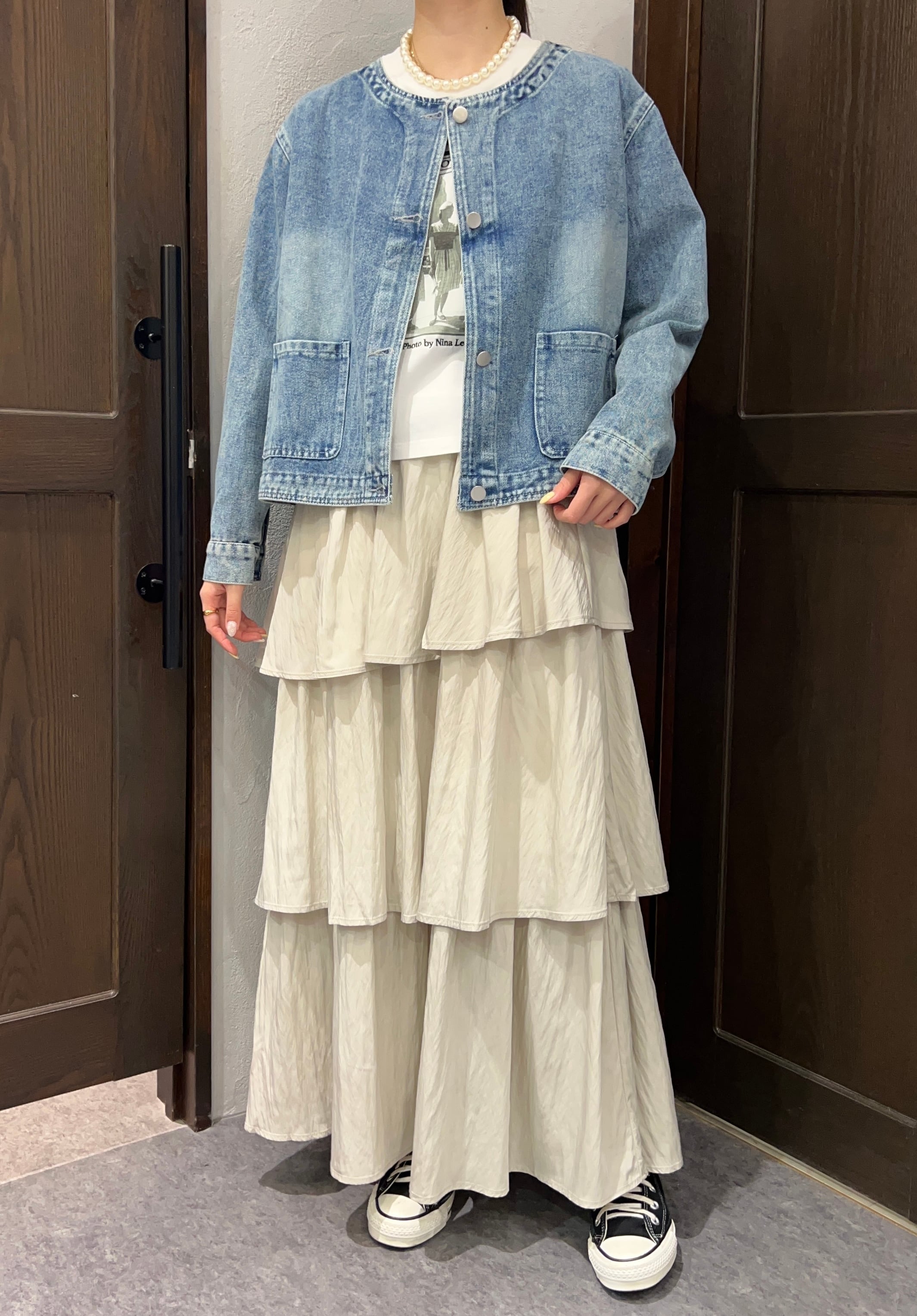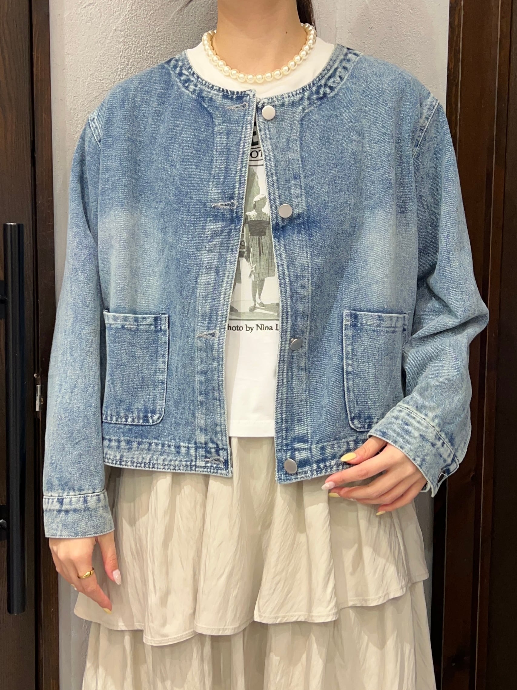 生地も柔らかく軽いノーカラーデニムジャケット。