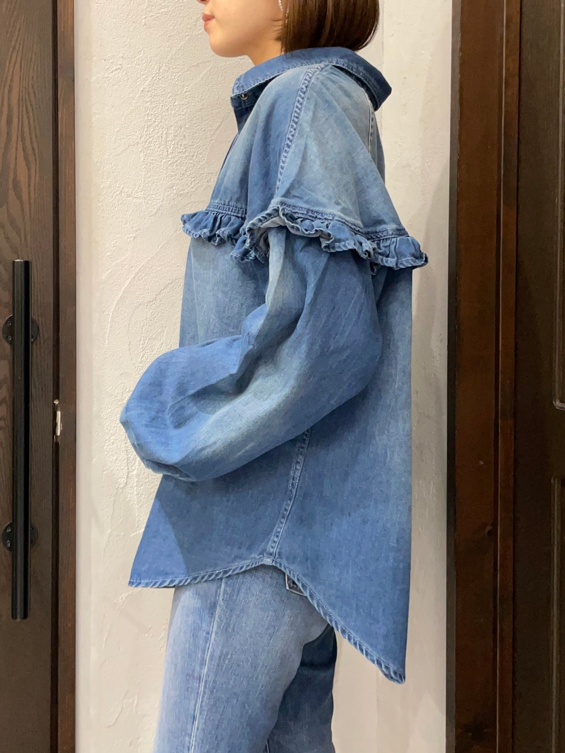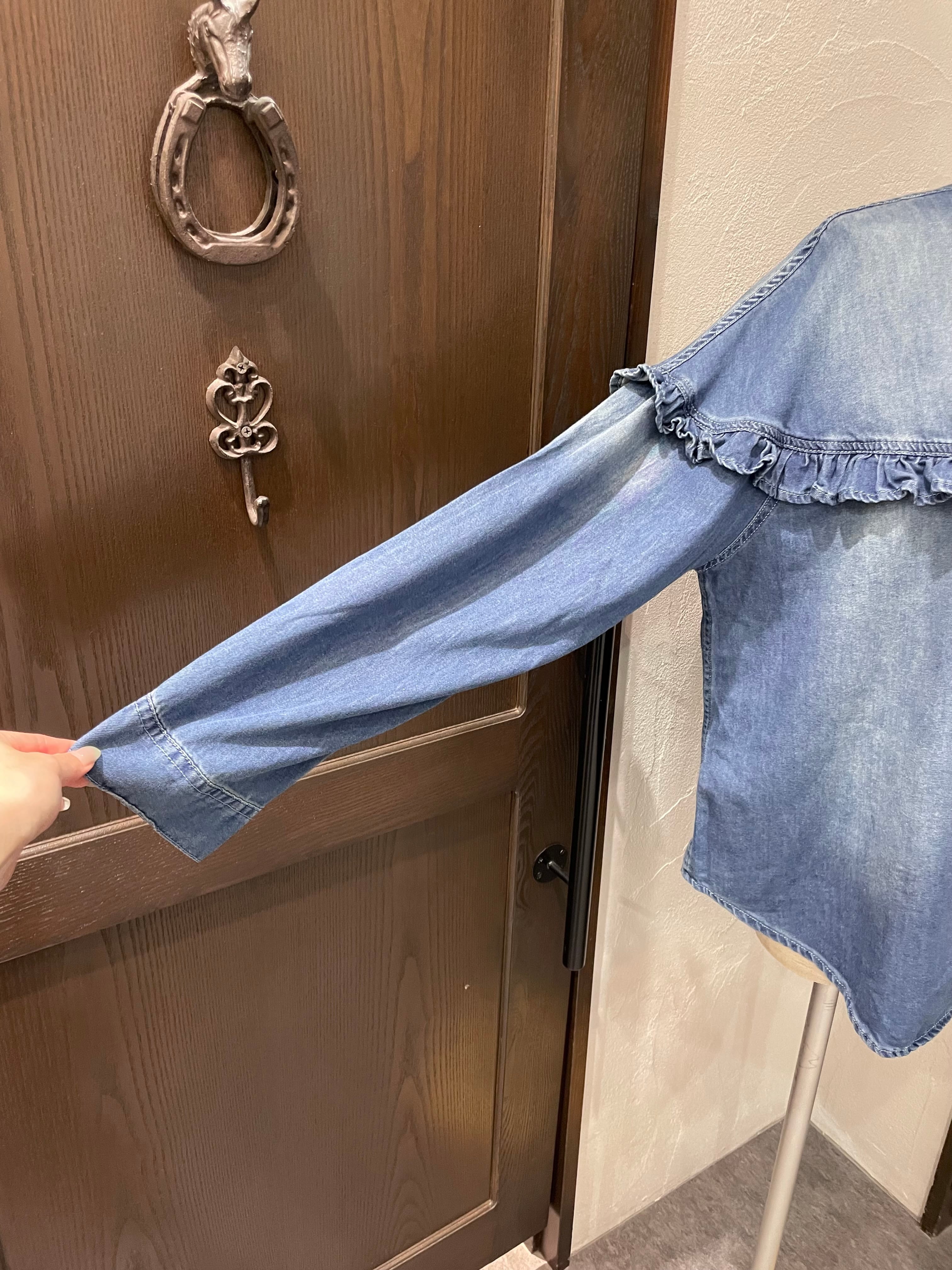 綿100%のデニム素材を使用した、ナチュラルな着心地が魅力のフリルデザインシャツ。