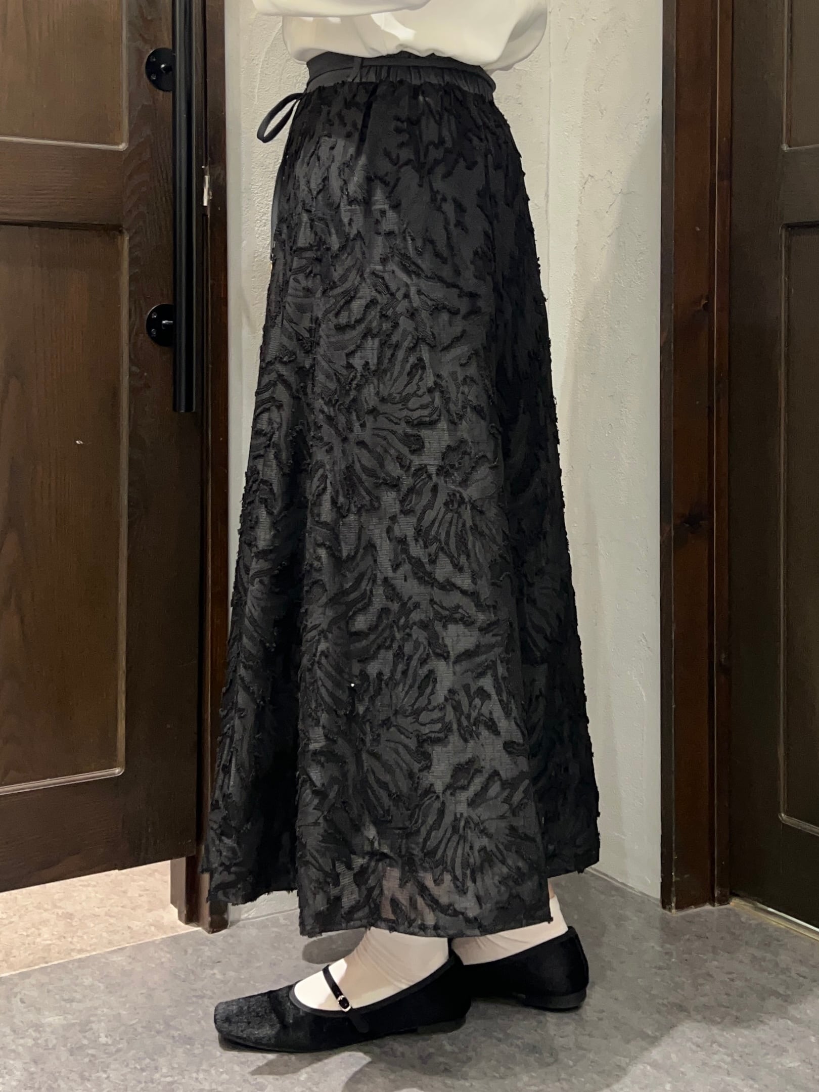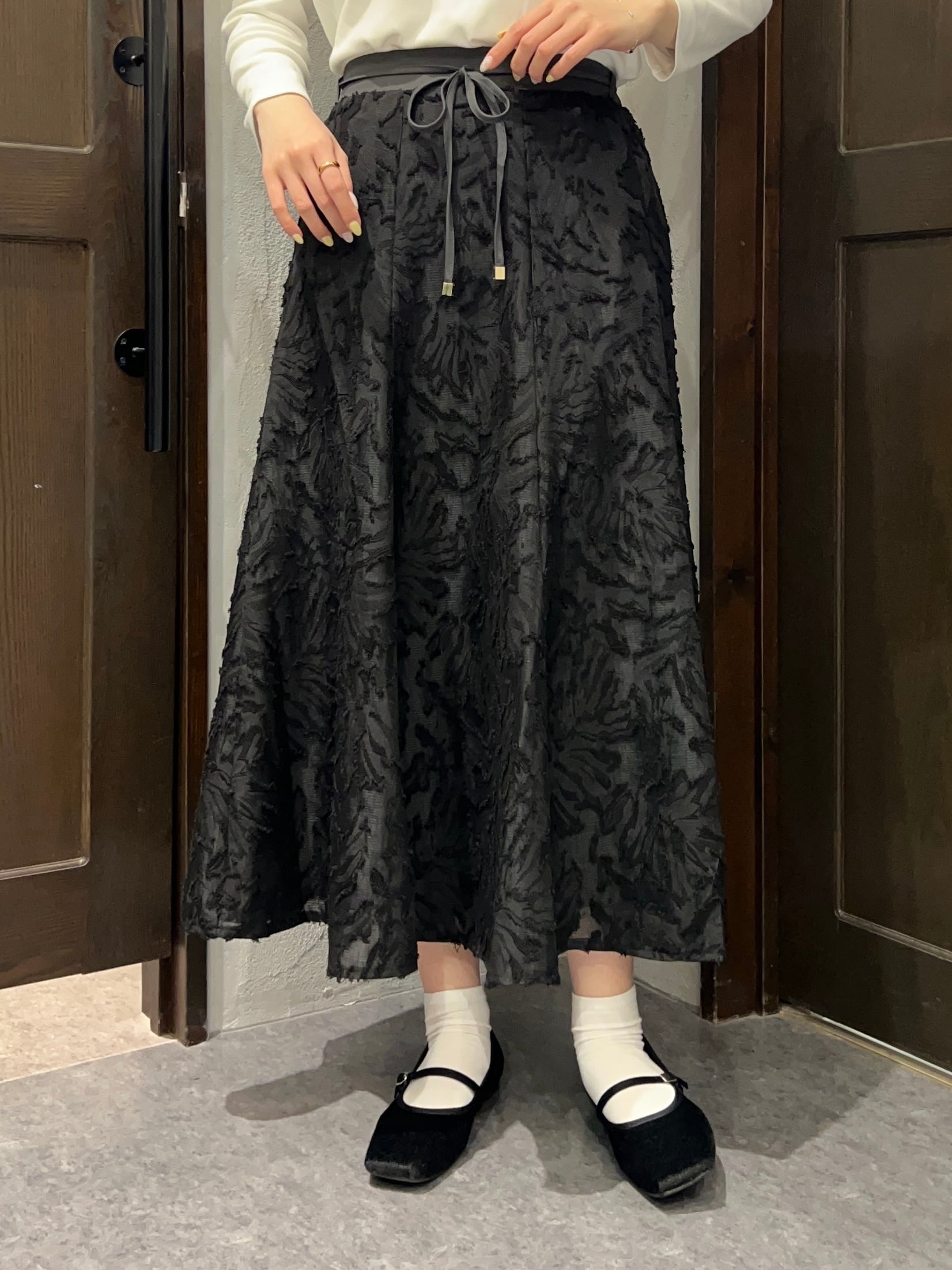 立体感のあるジャガード素材が目を惹く、上品なフレアスカート。