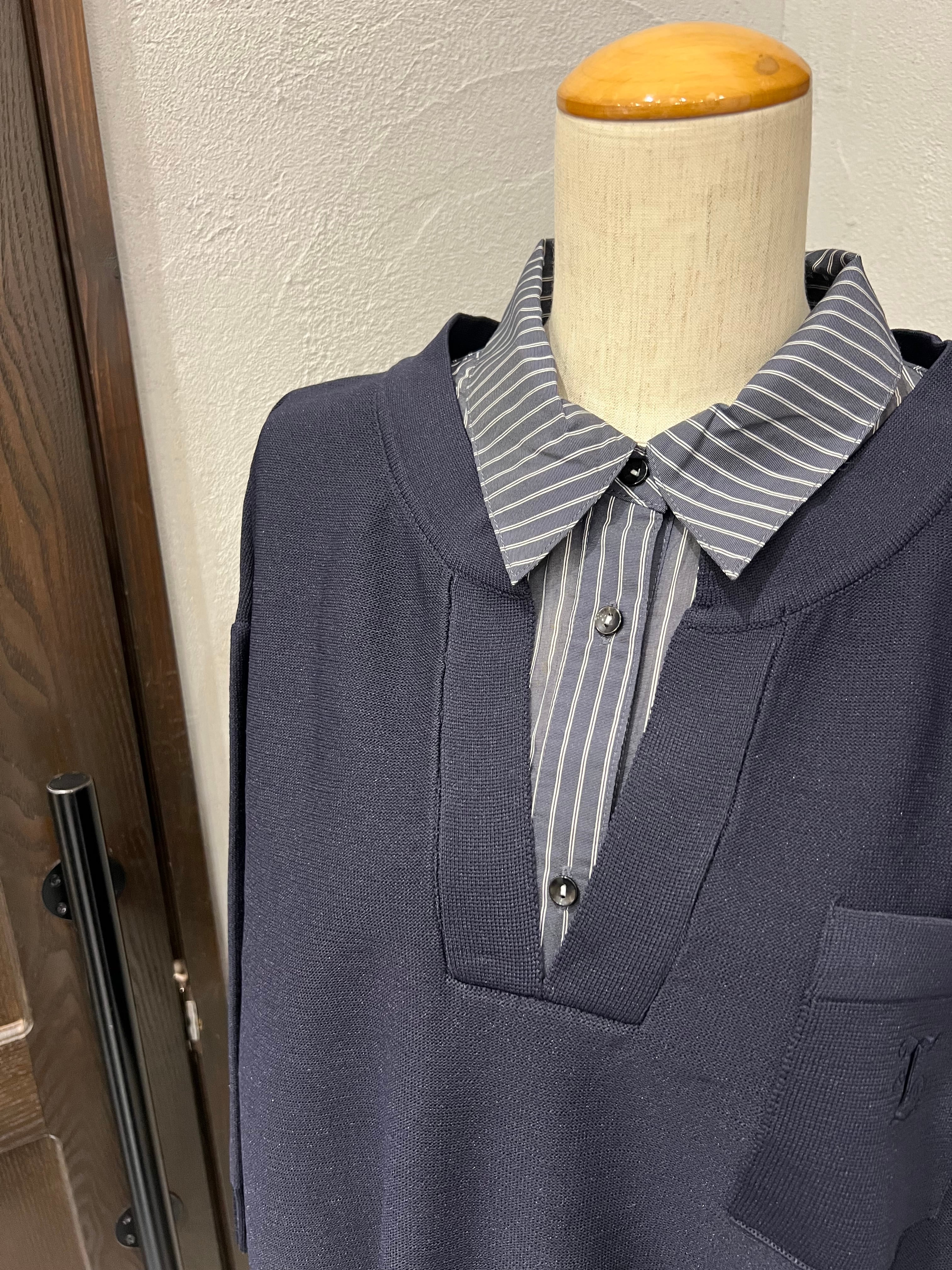 爽やかなストライプのシャツをレイヤードした様なニットトップス