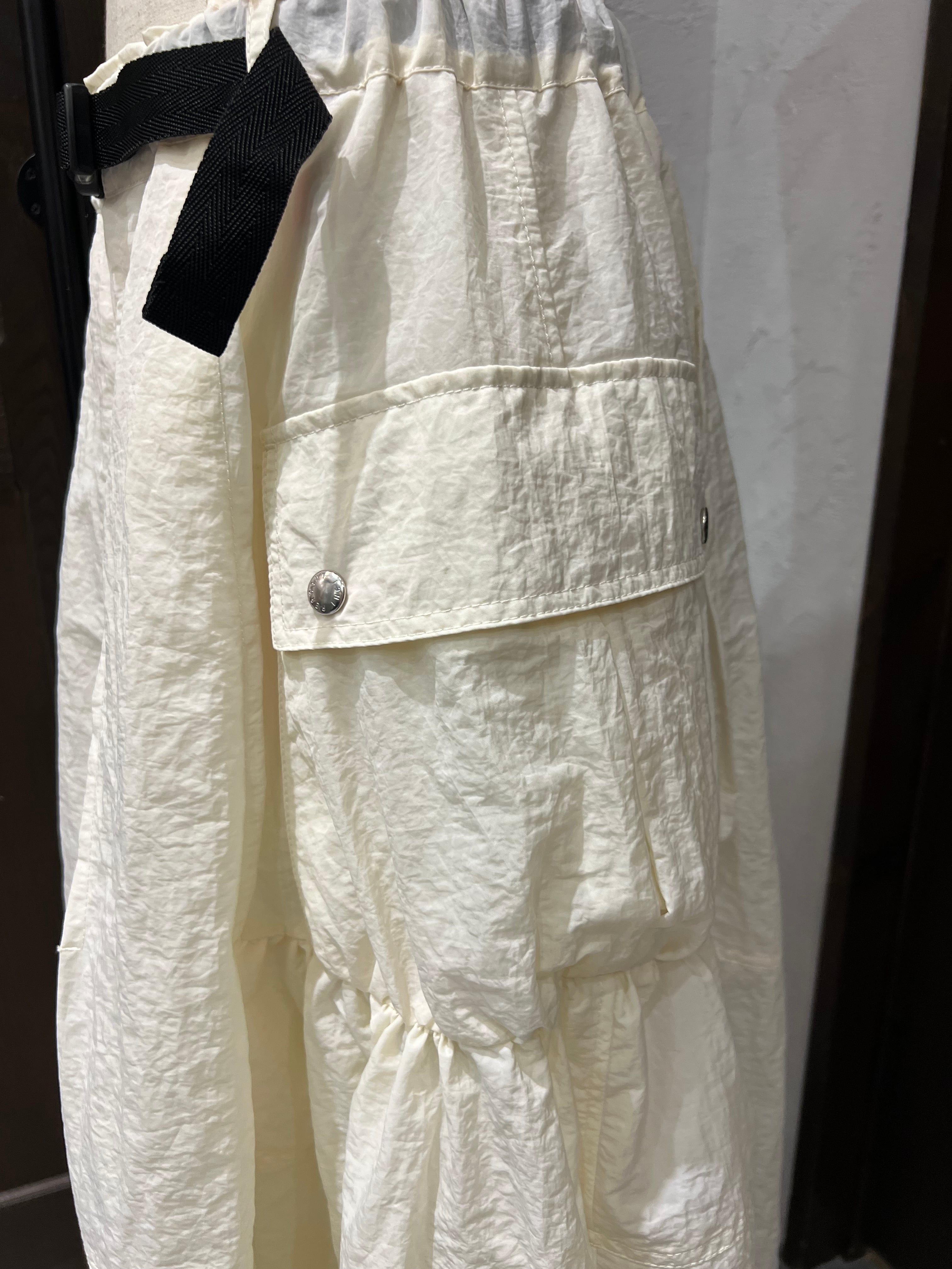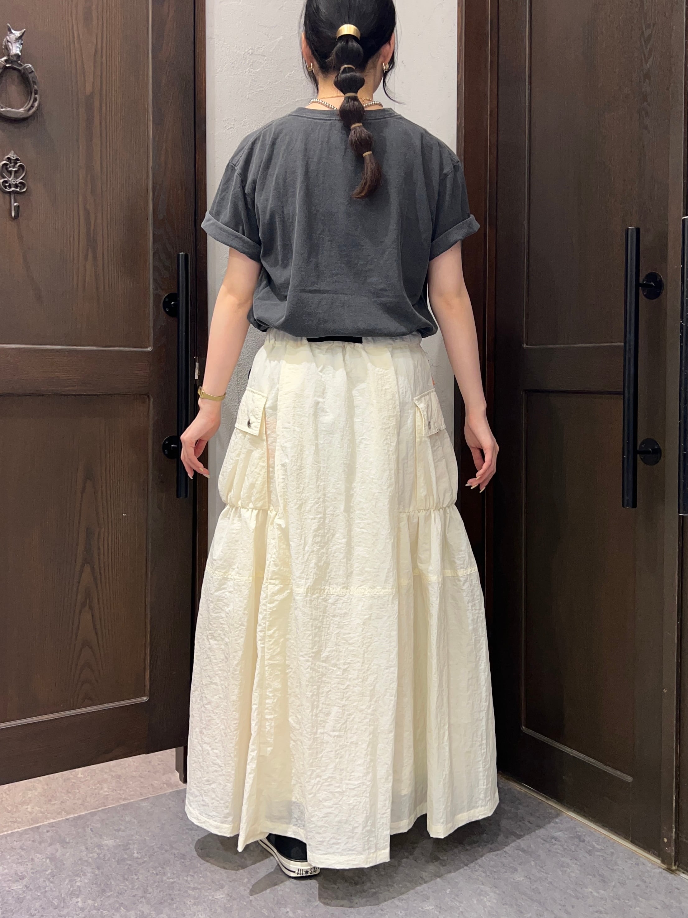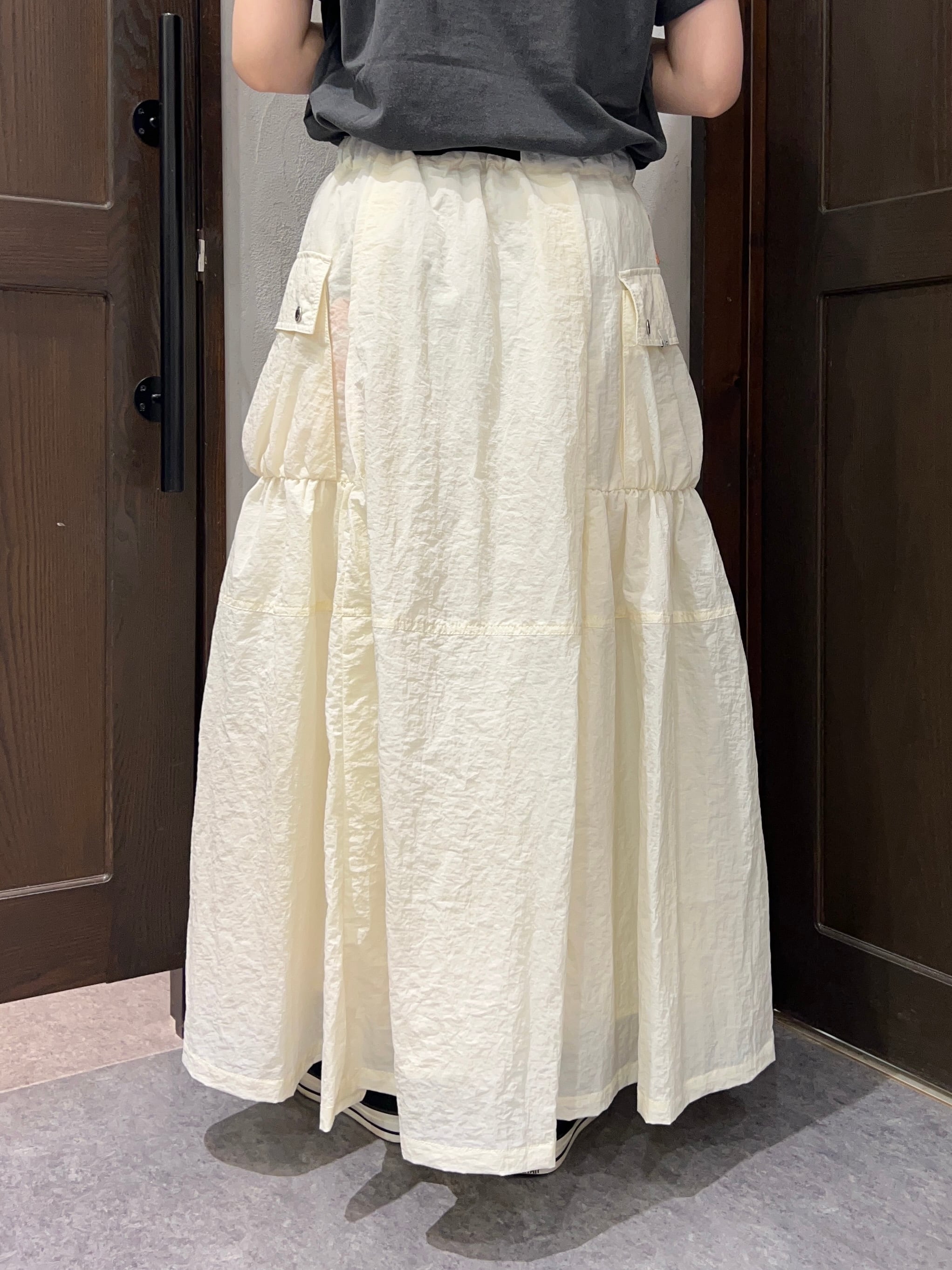 サイドには立体感のある大きめポケットを施し、下にはギャザーを寄せており、シンプルながらも程よいアクセントに。裾にかけてふんわり広がるシルエットで、動くたびにやわらかな揺れ感が楽しめます。