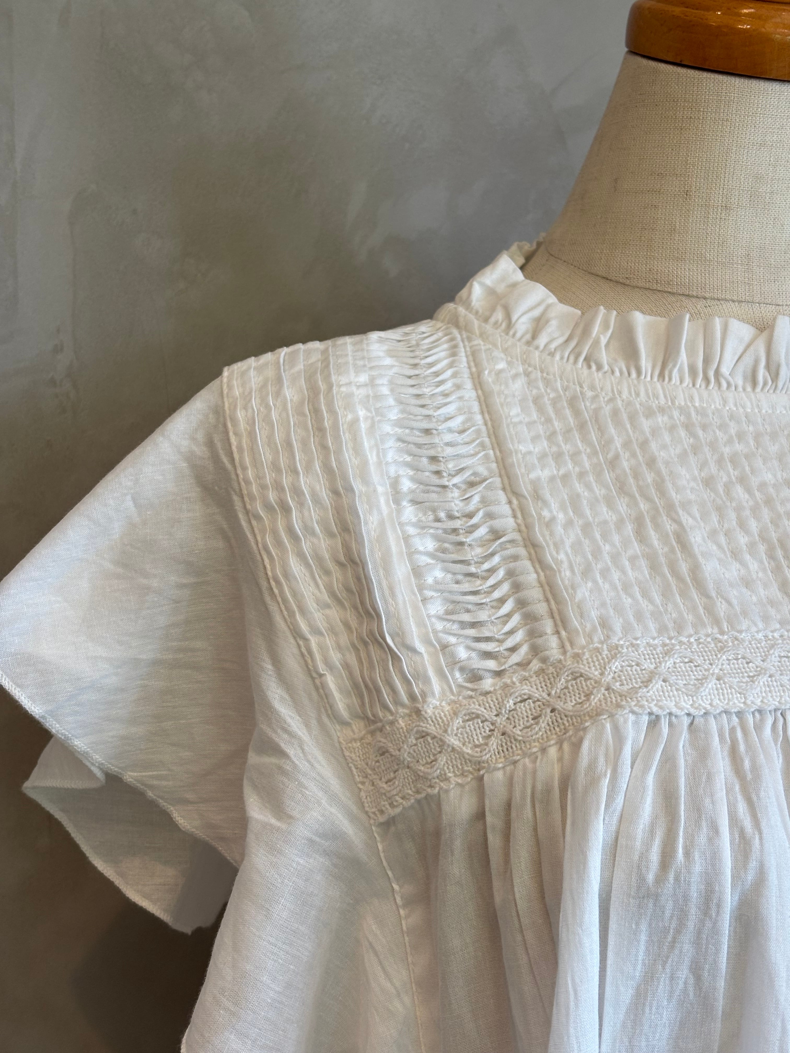 繊細なピンタックと胸元のレースが華やかな印象を与えるブラウス。
