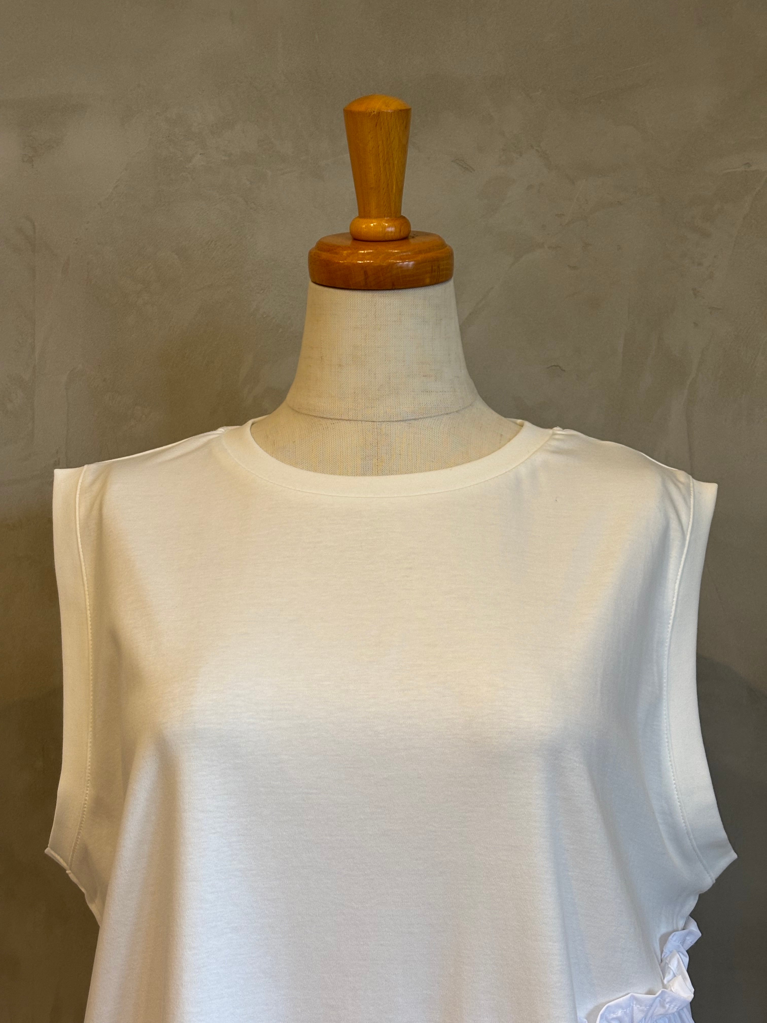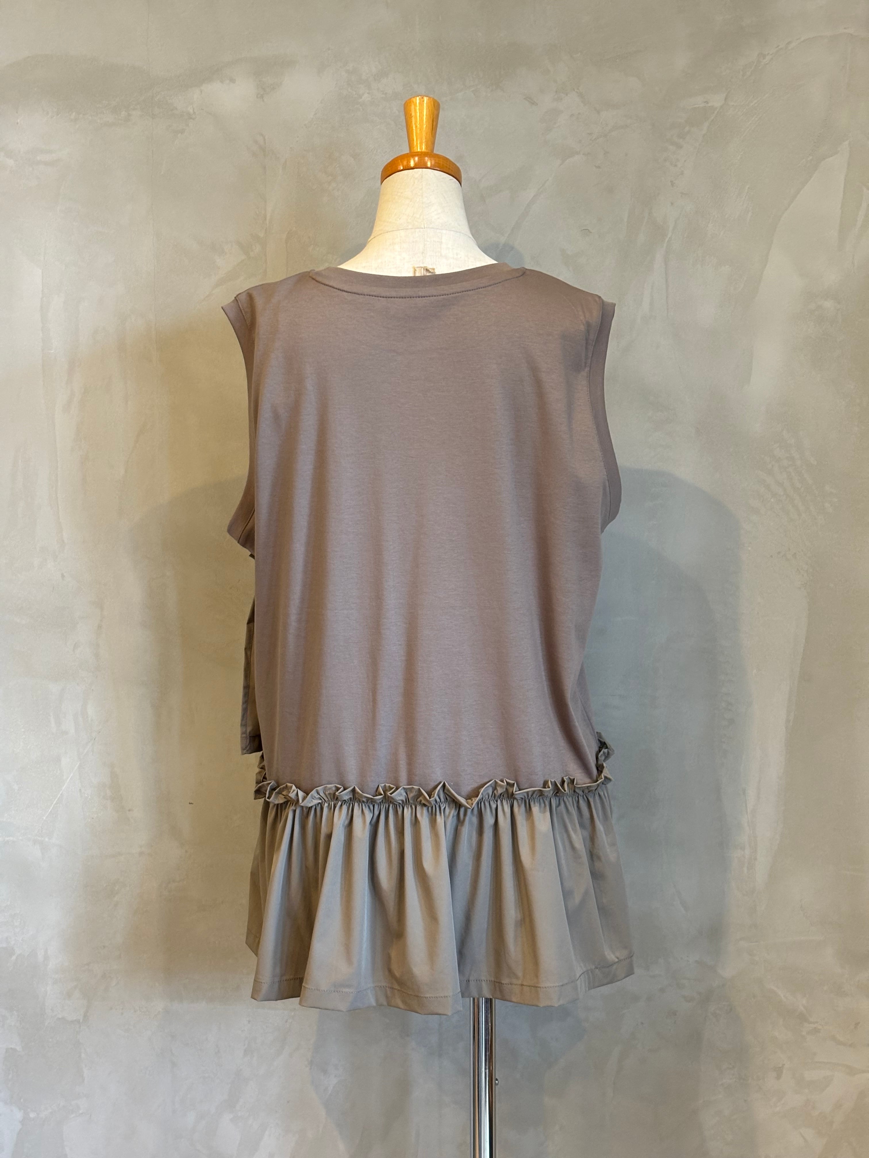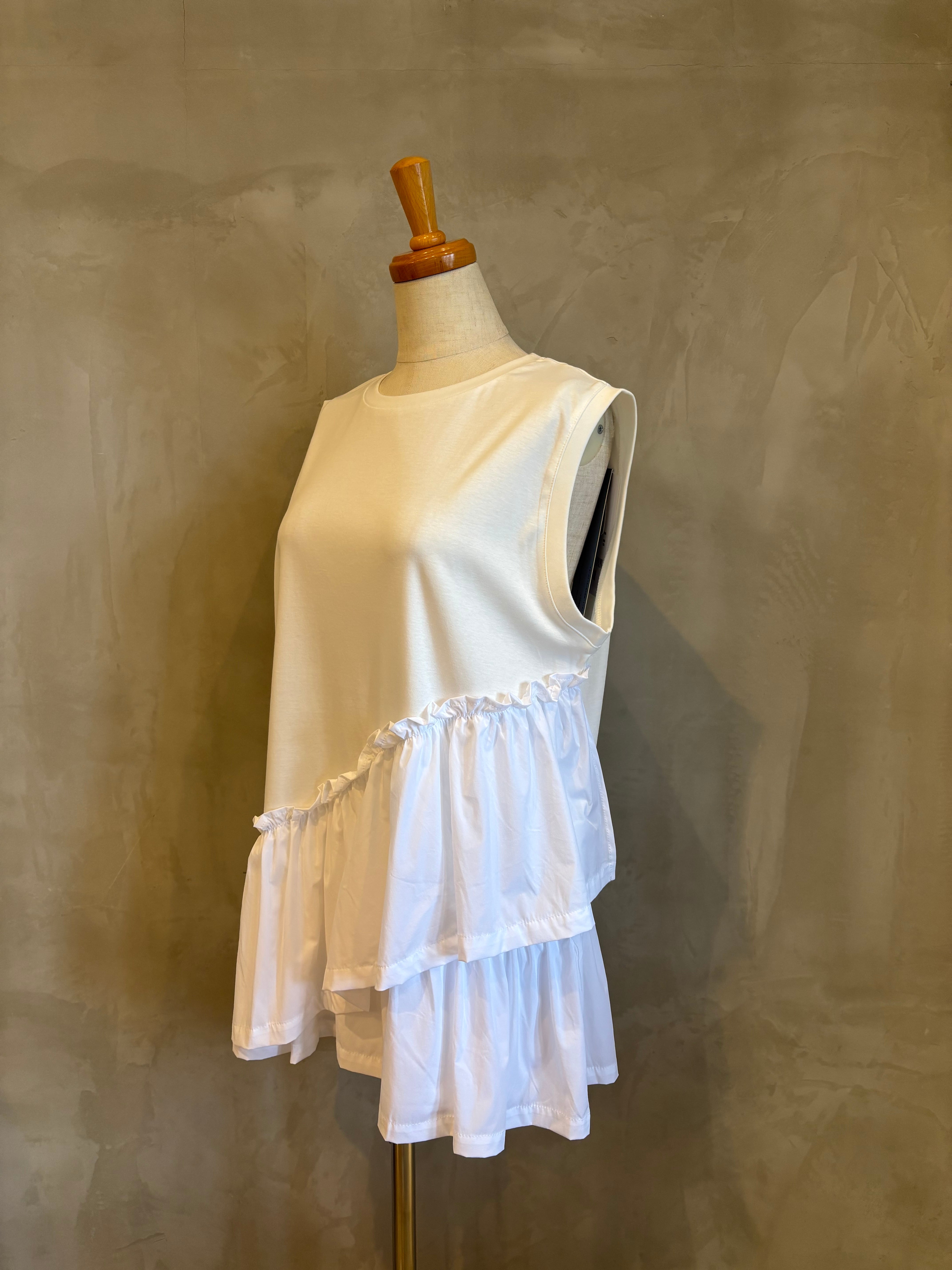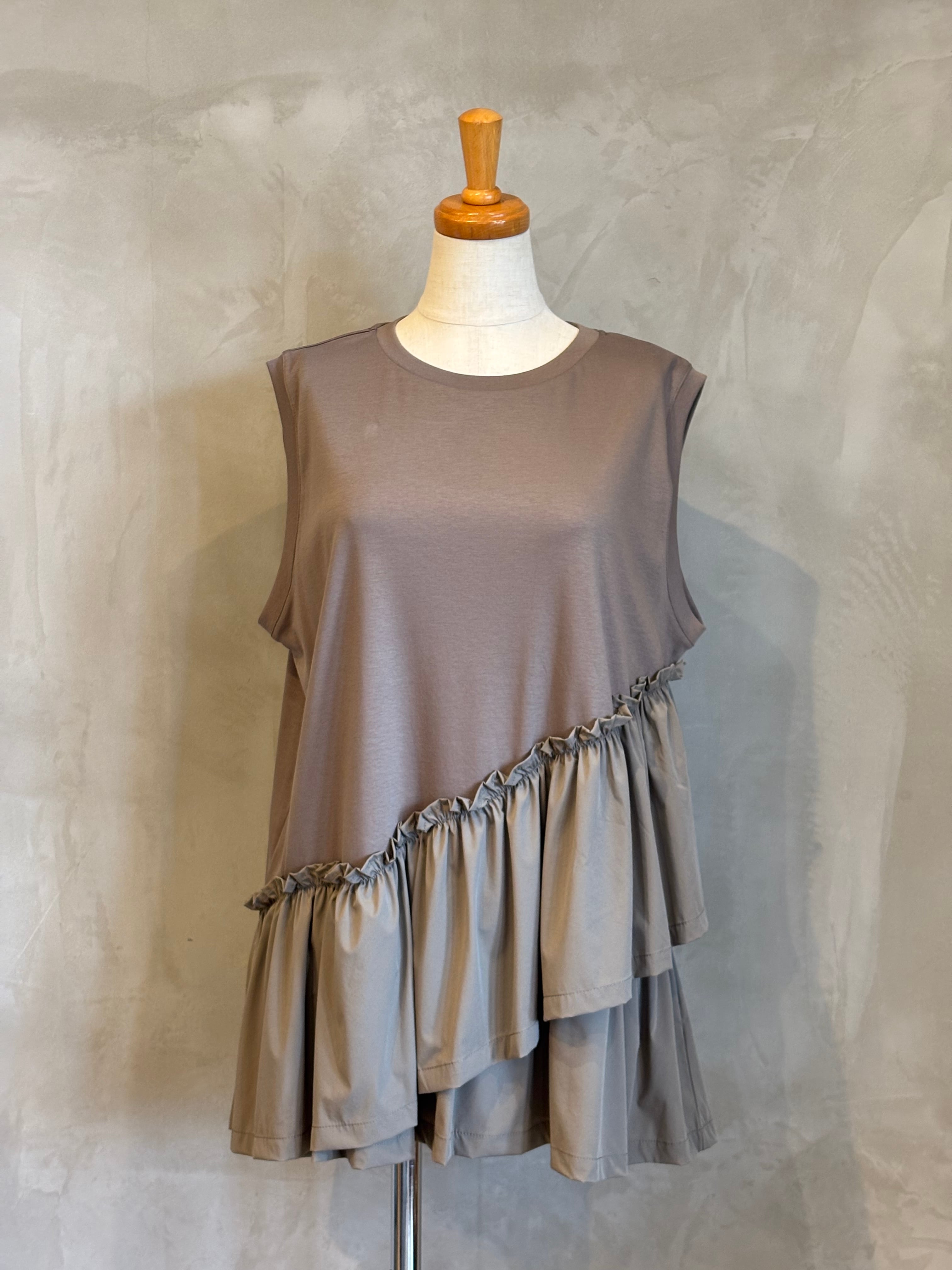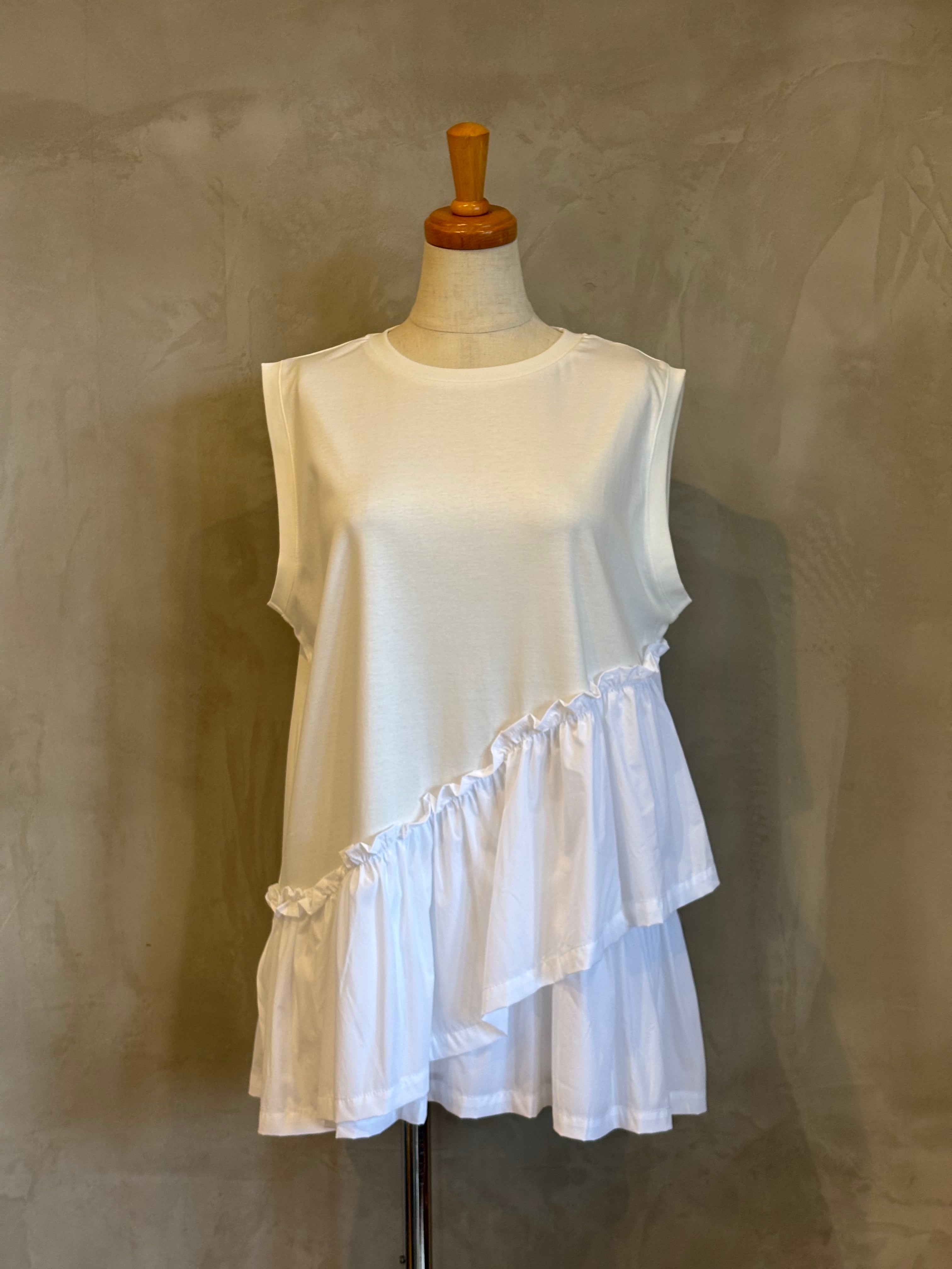 ベーシックなタンクにフリルを合わせることで程よく甘さを入れたデザインになっています。