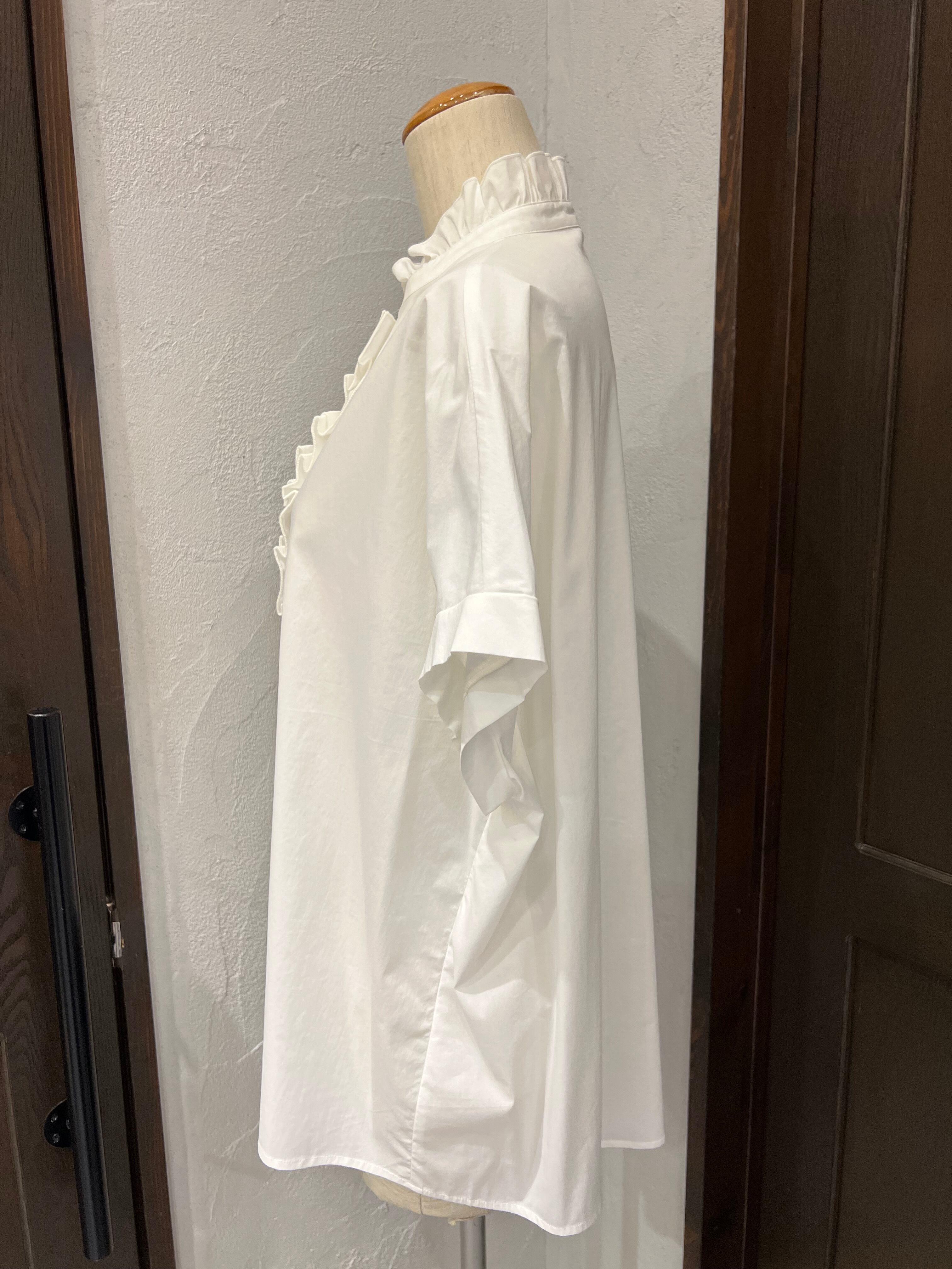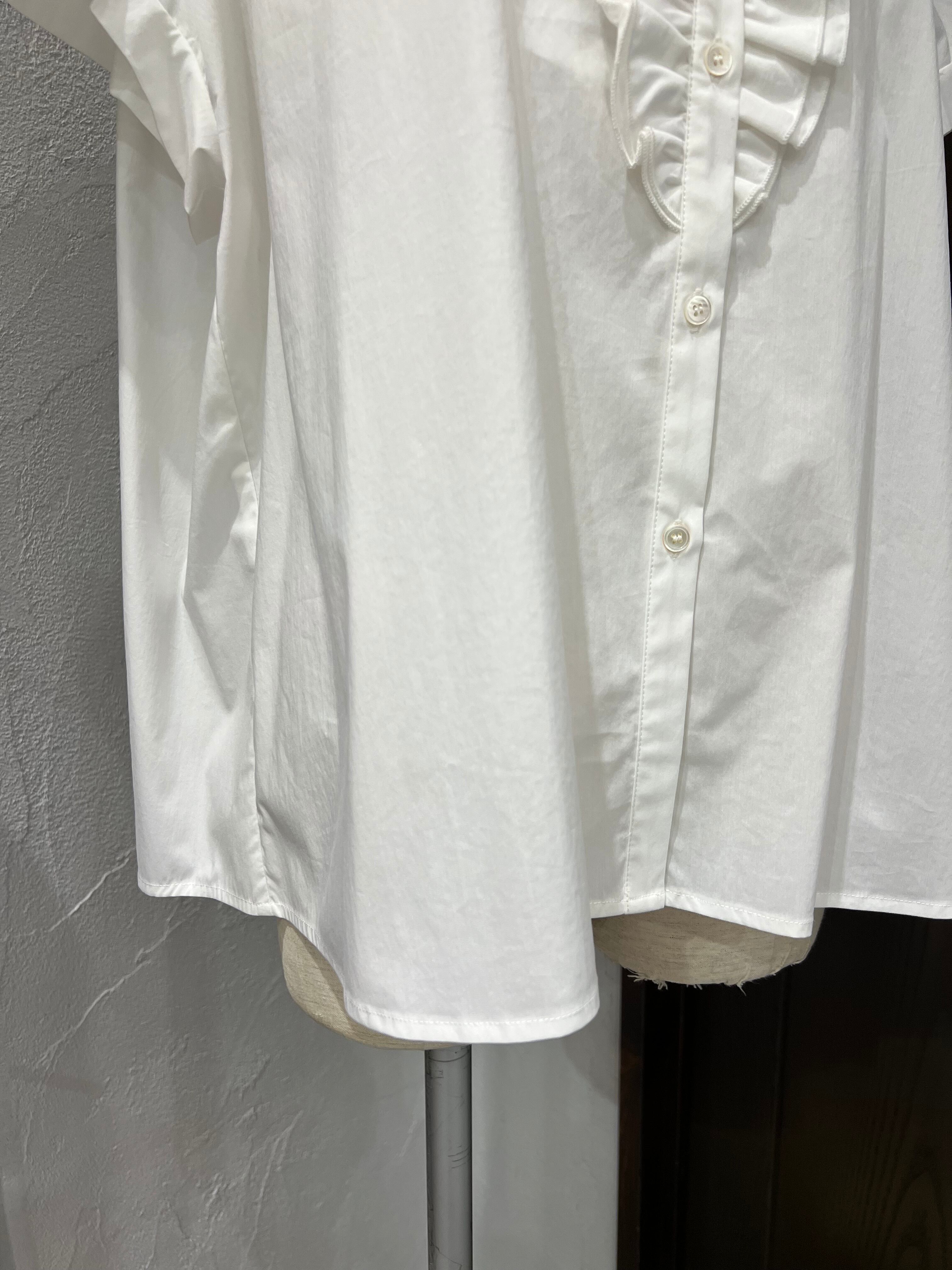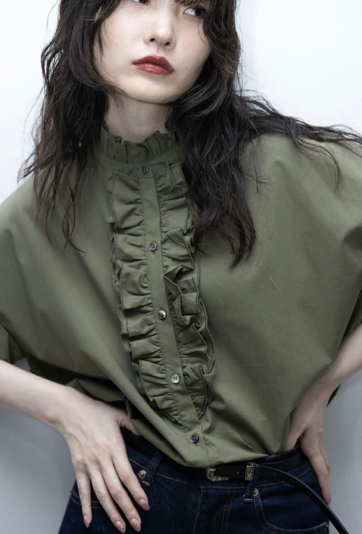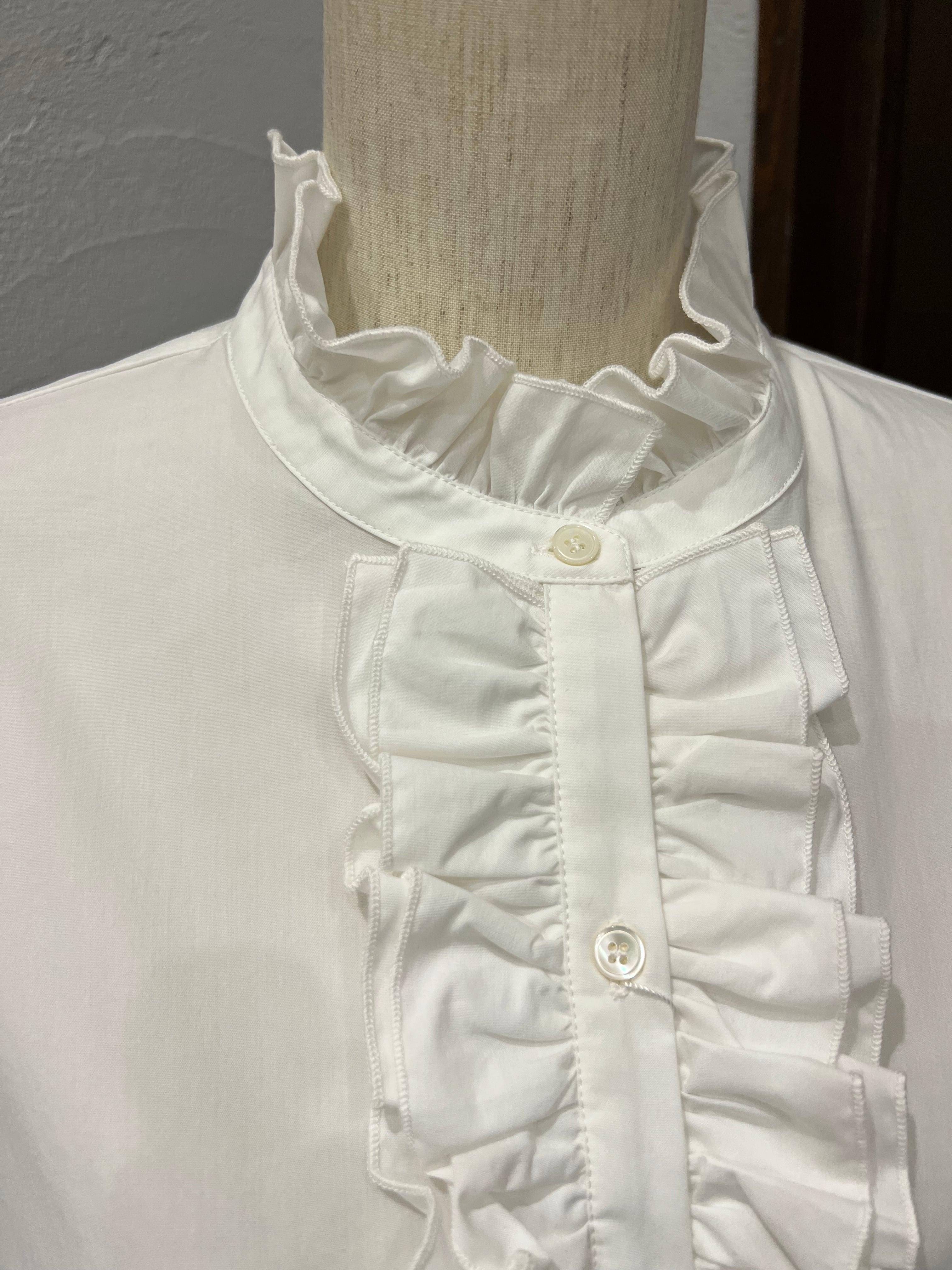 フロント部分には立体的なフリル(ラッフル)が施されており、シンプルなシルエットの中に華やかさと個性をプラス。襟元はややスタンド気味で、クラシックな雰囲気も感じられる一着です。ボタンはフロント中央に配置され、着脱しやすい仕様になっています。