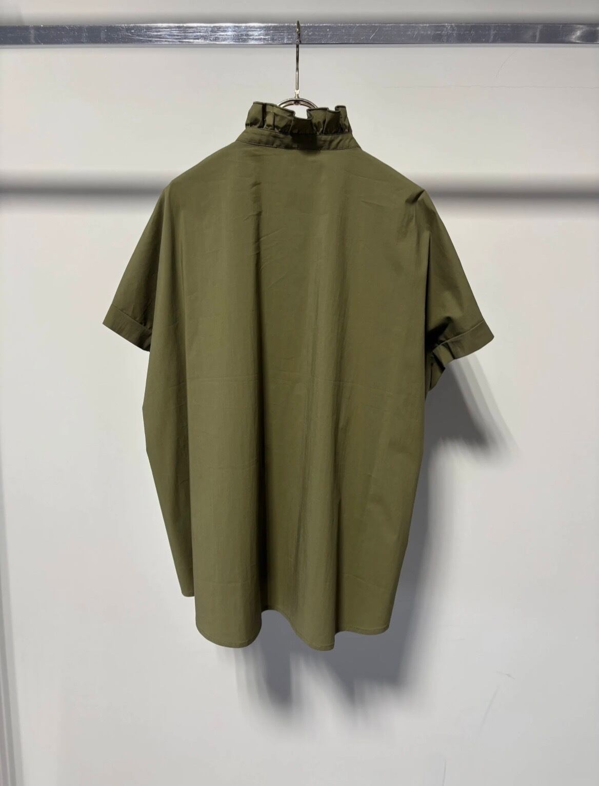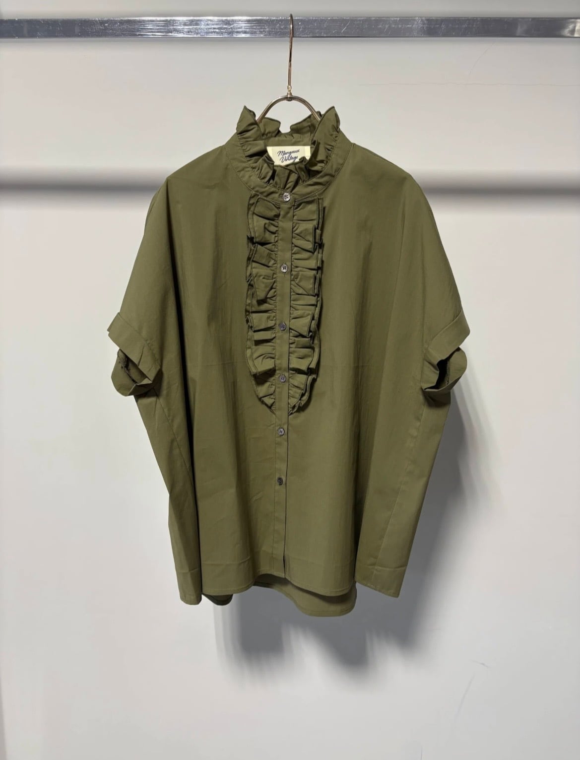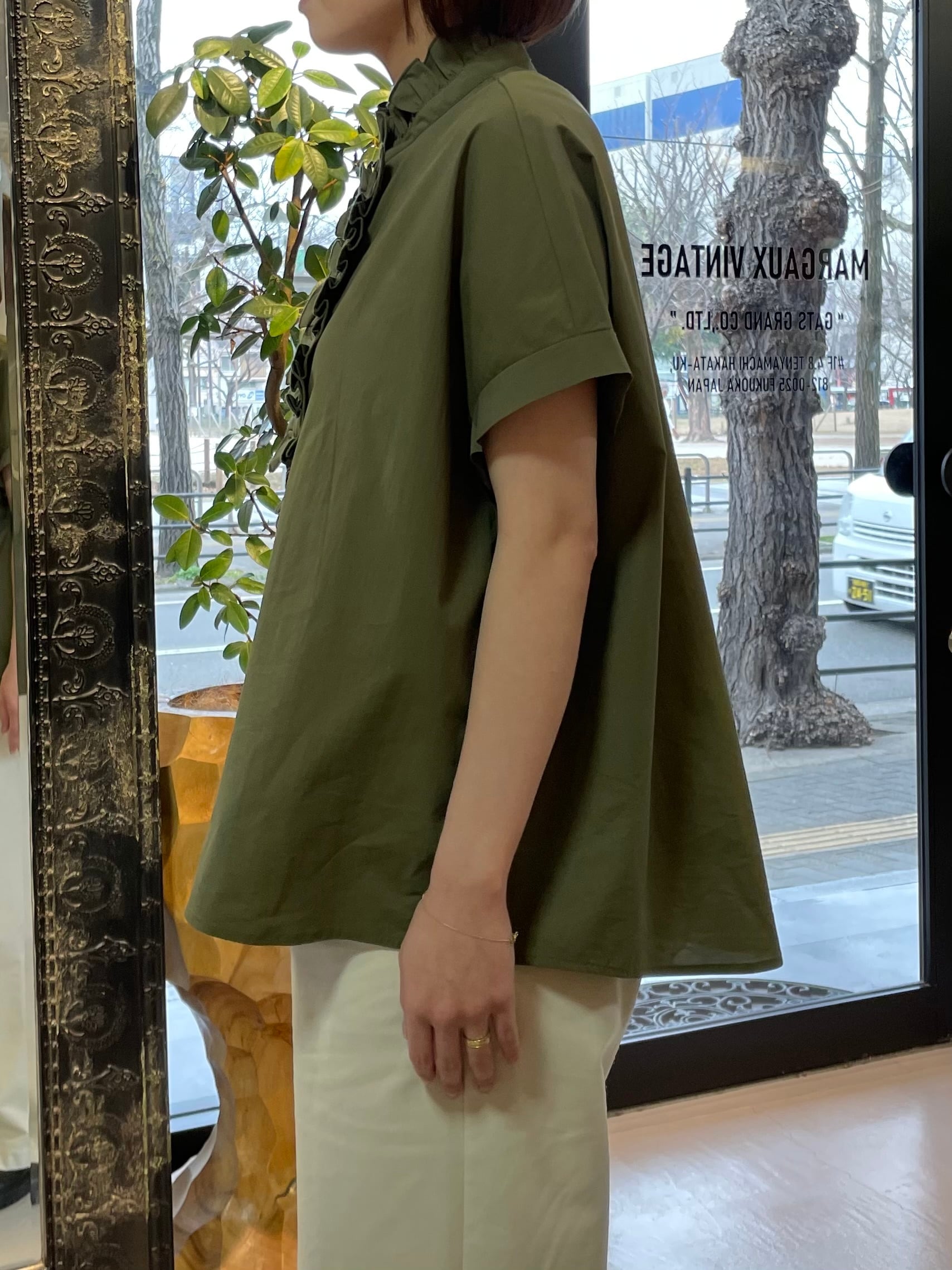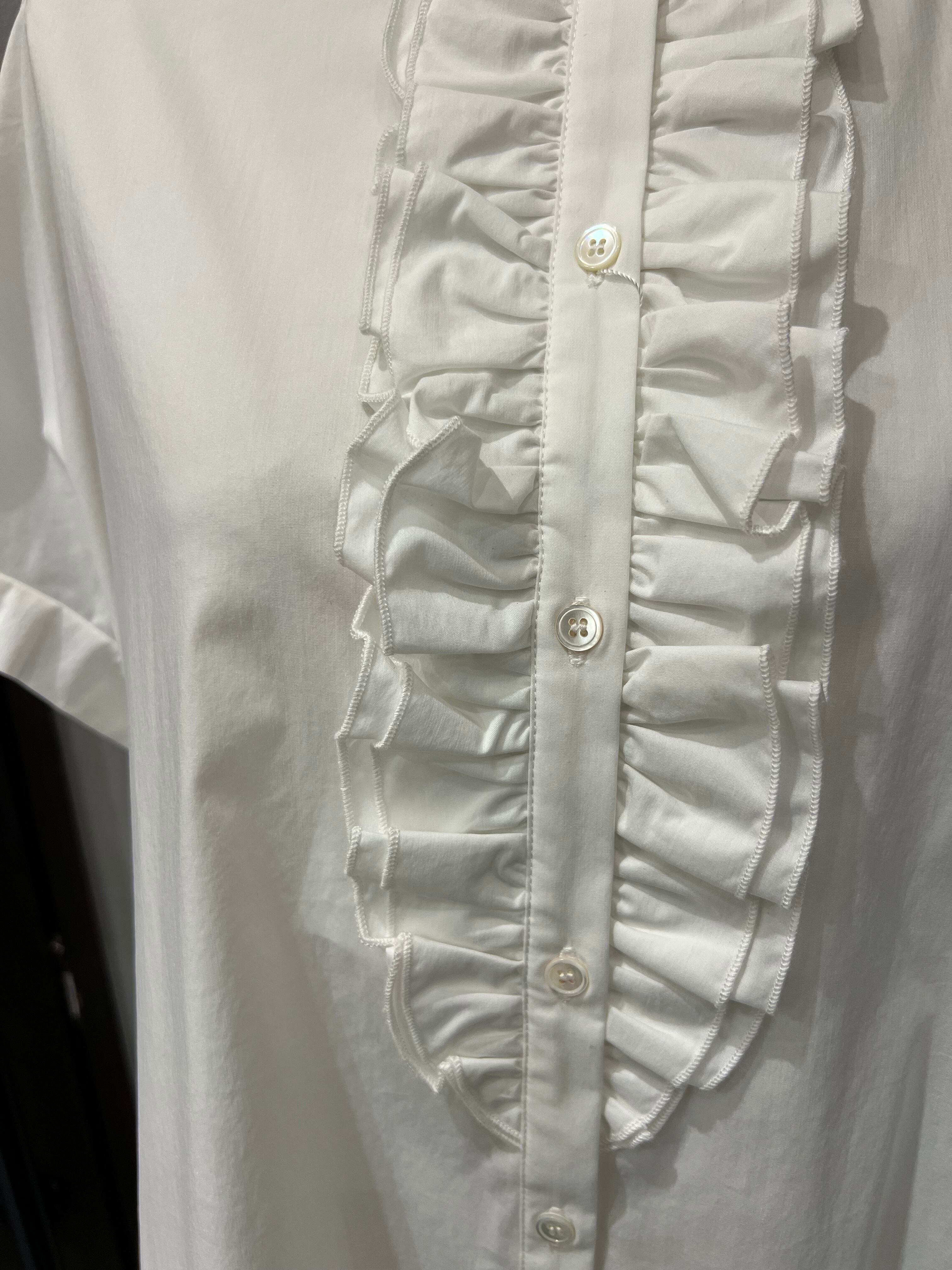フロント部分には立体的なフリル(ラッフル)が施されており、シンプルなシルエットの中に華やかさと個性をプラス。襟元はややスタンド気味で、クラシックな雰囲気も感じられる一着です。ボタンはフロント中央に配置され、着脱しやすい仕様になっています。
