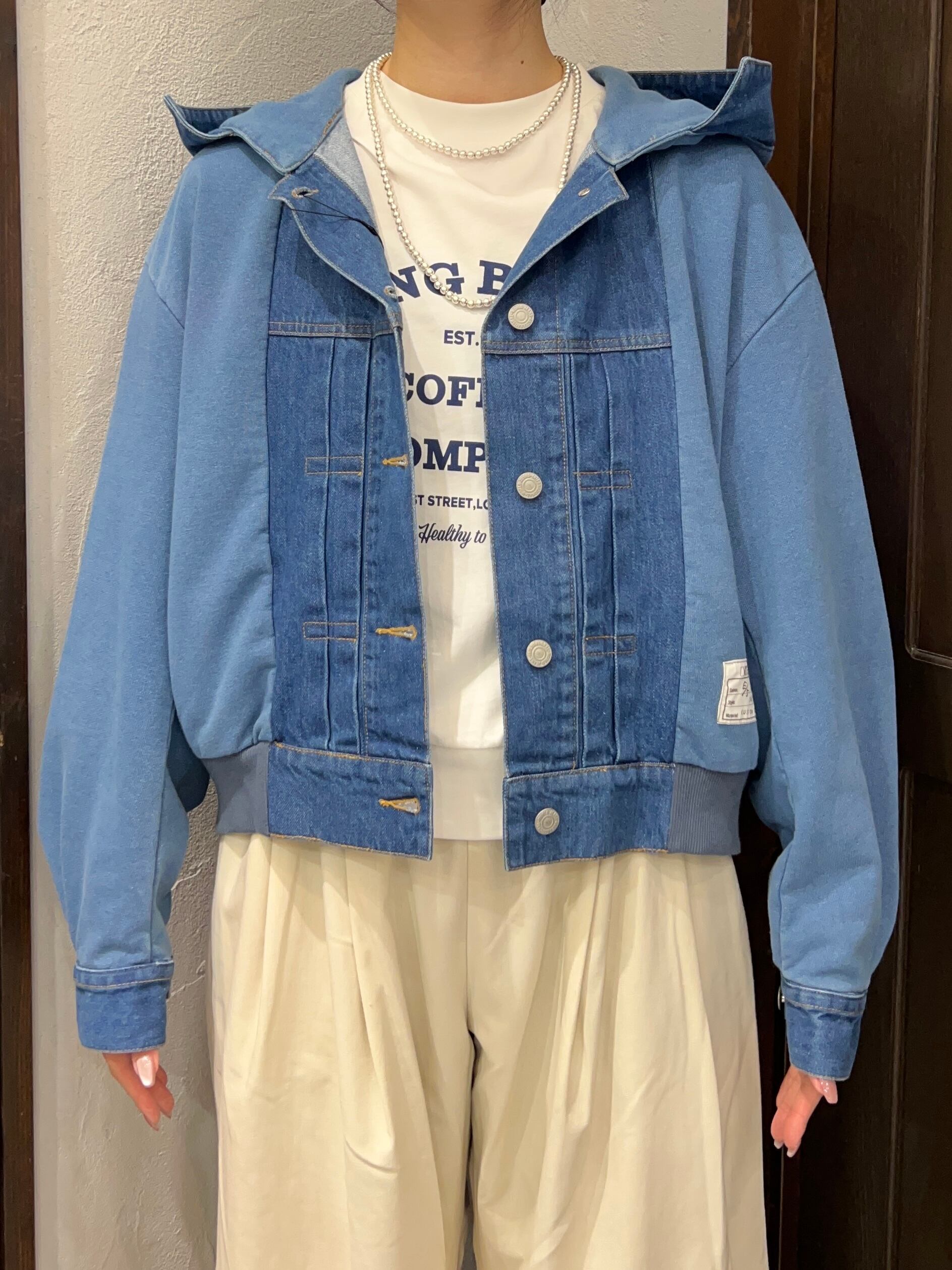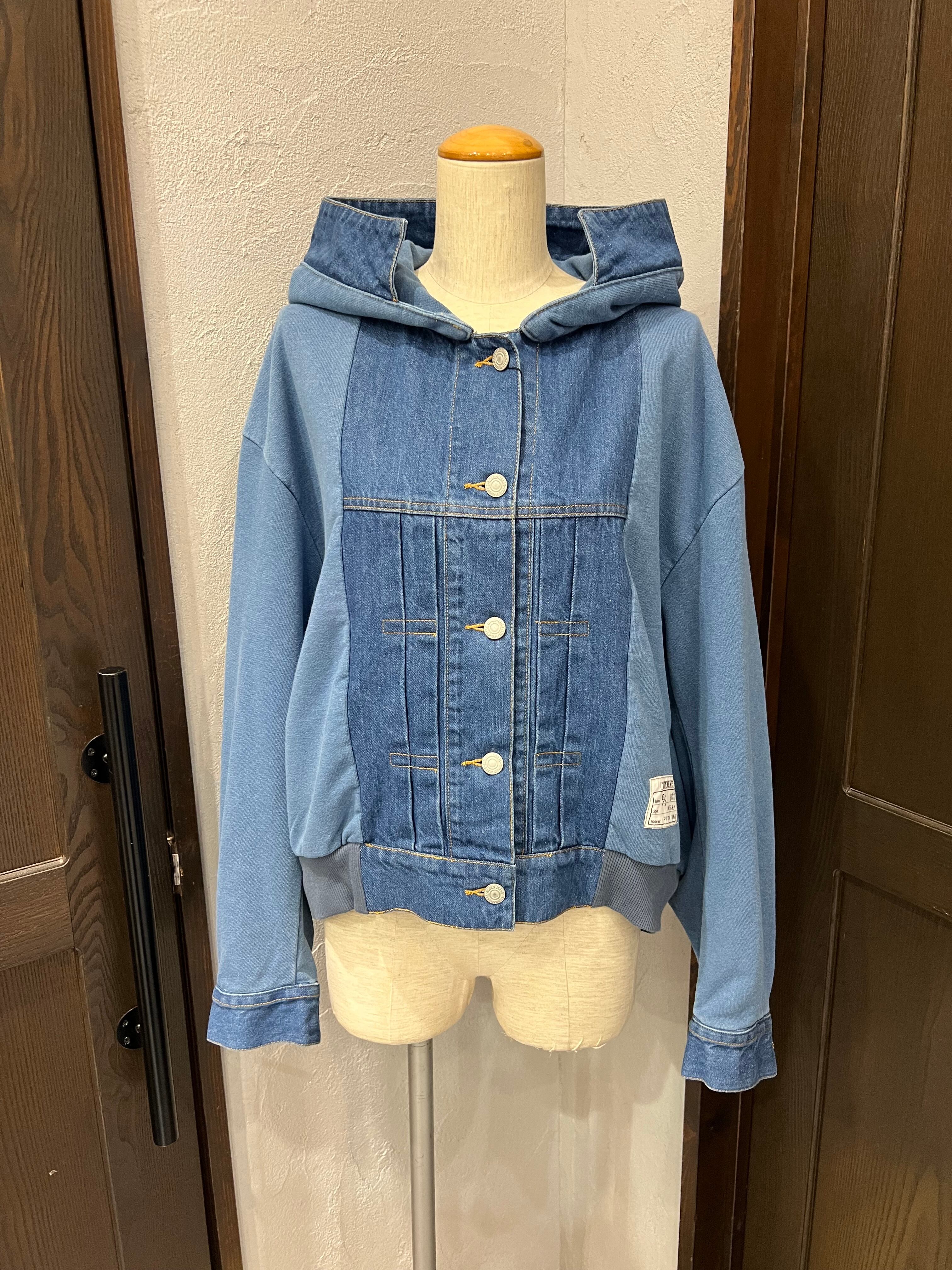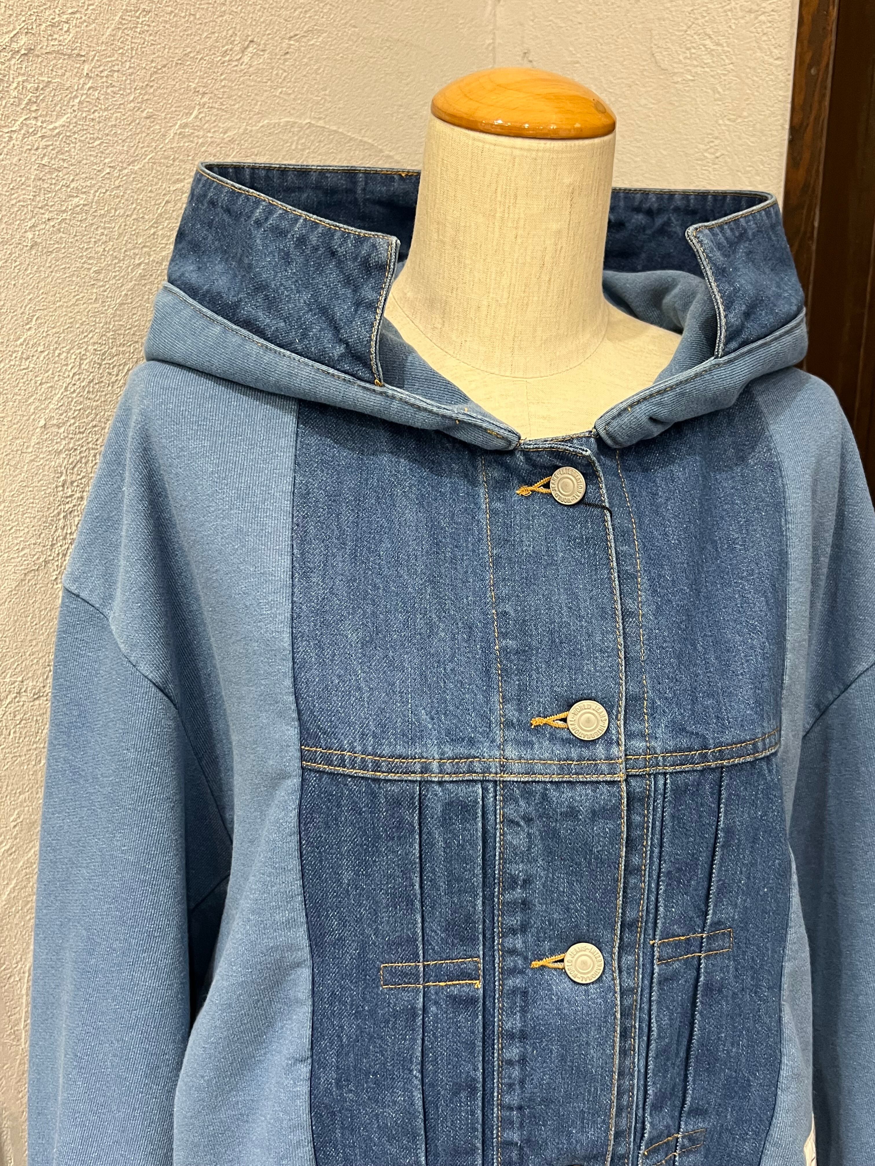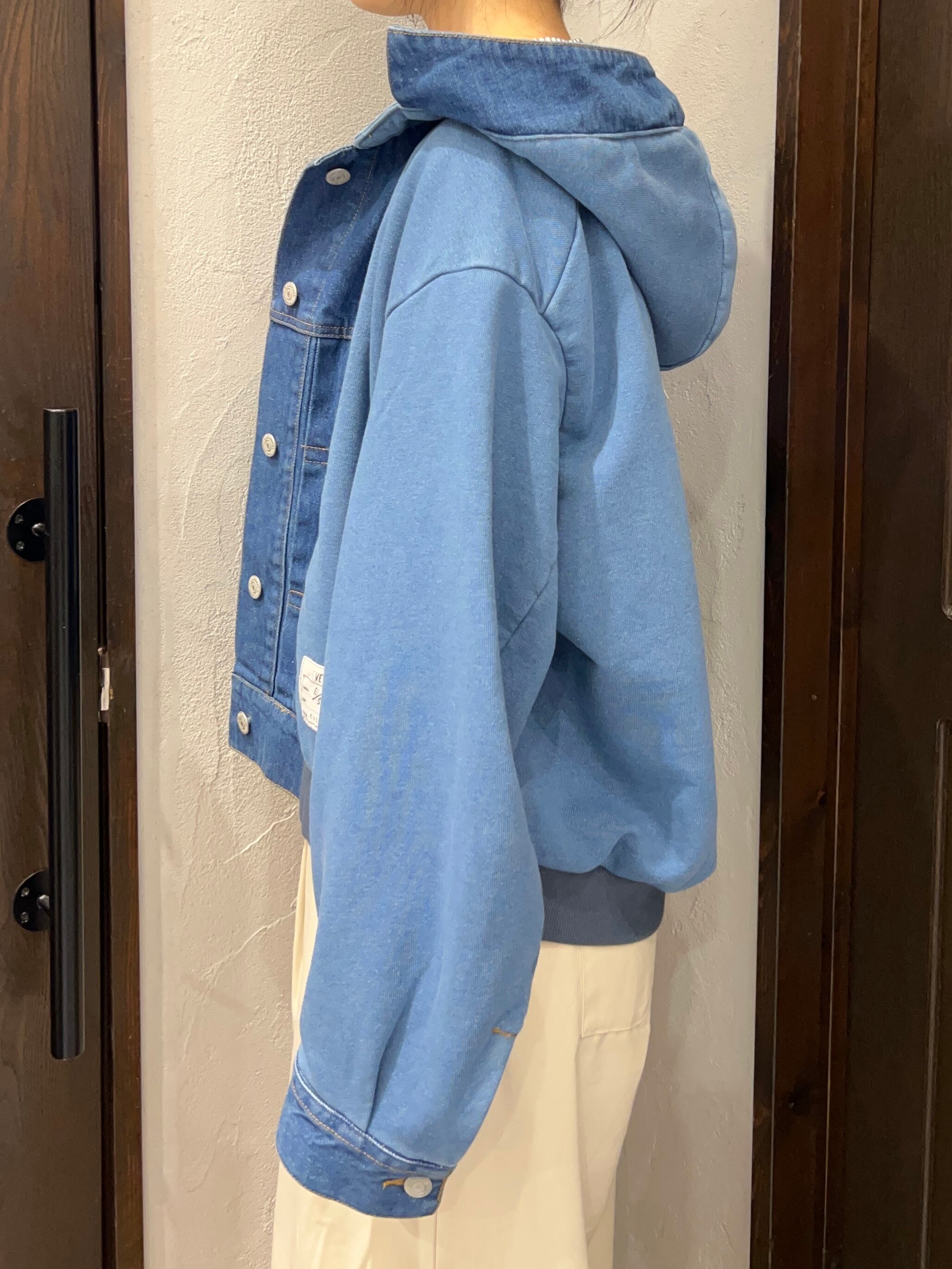 デニム素材と裏毛(スウェット)素材を組み合わせたフーディージャケット。