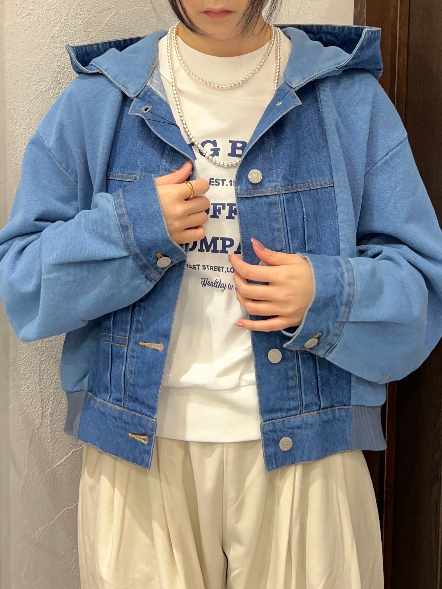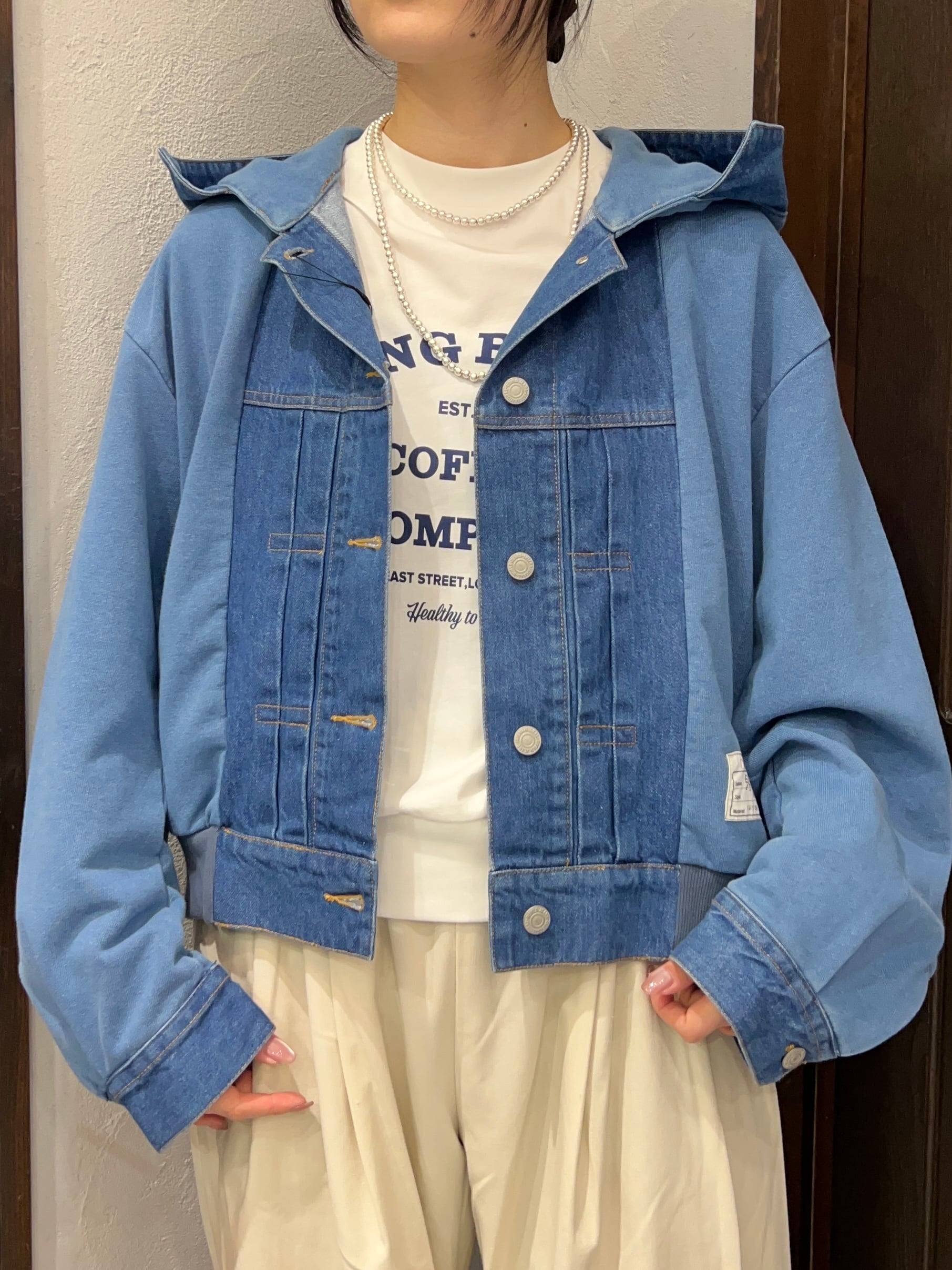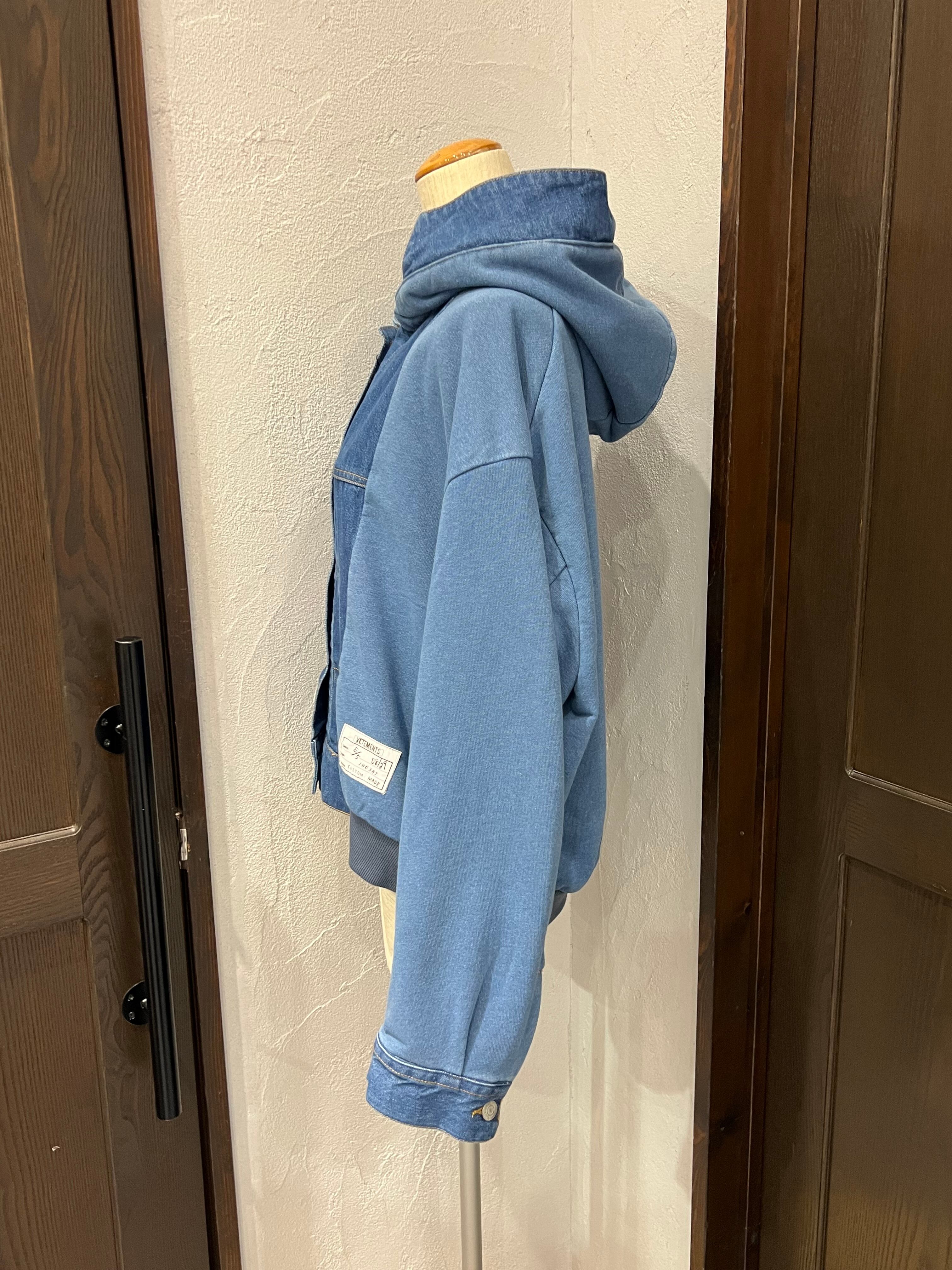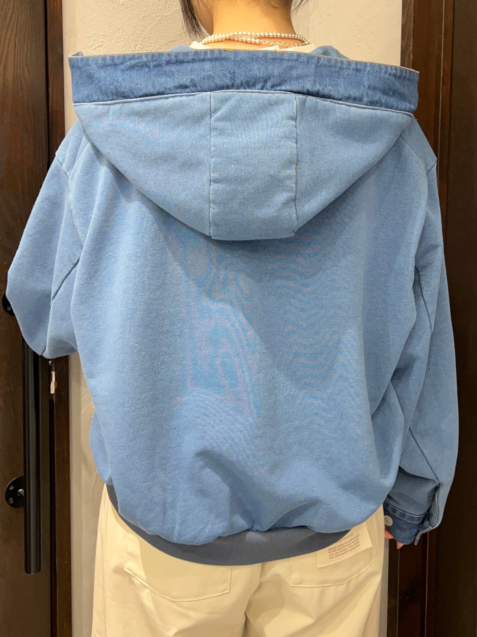 デニム素材と裏毛(スウェット)素材を組み合わせたフーディージャケット。