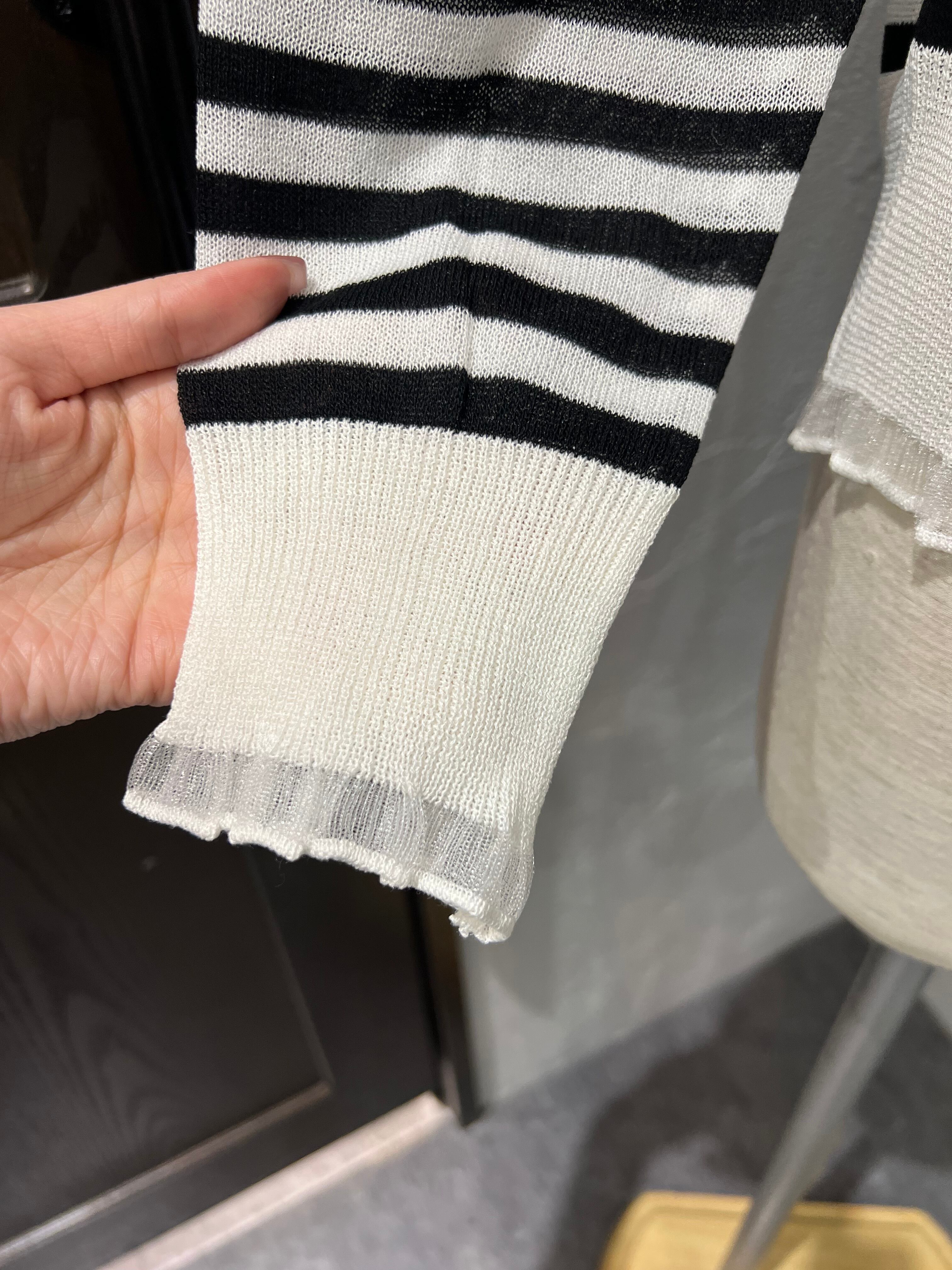 素材はやや薄手で軽やかな着心地。季節の変わり目や冷房対策にもぴったりです。袖口と裾にはさりげないフリルデザインが施され、柔らかくフェミニンな印象に仕上がっています。コンパクトな丈感なので、ワンピースやハイウエストボトムともバランスよくコーディネート可能です。