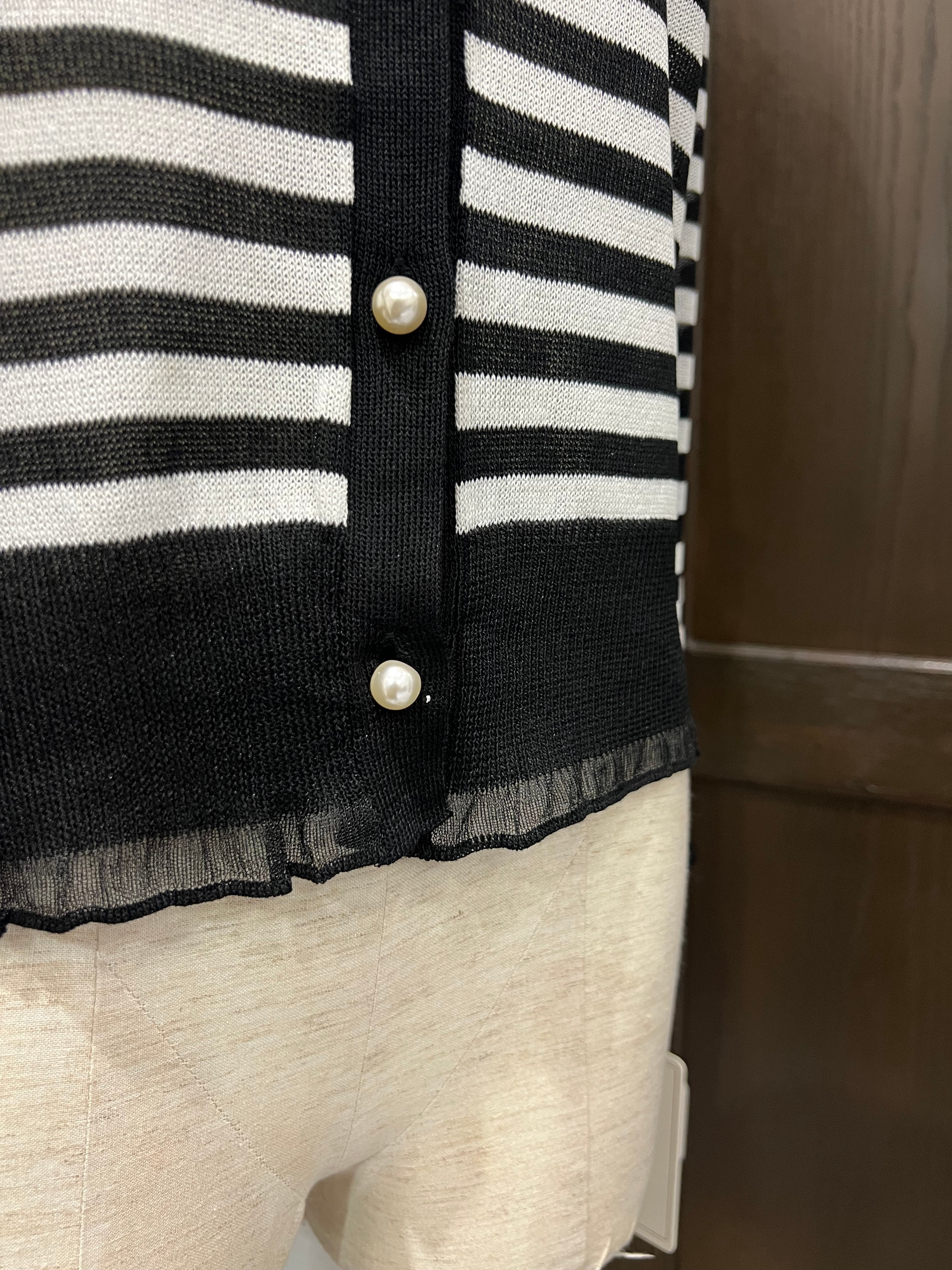 ボーダー柄が目を引く、上品で着回しやすいニットカーディガンです。ブラック×ホワイトのクラシックな配色で、カジュアルにもきれいめにも合わせやすい一枚。フロントはパール調ボタンで、シンプルながら女性らしい華やかさをプラスしています。