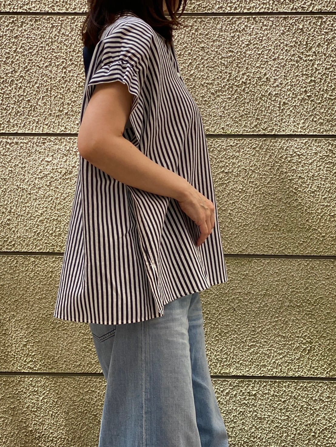 バックリボンが可愛らしさを引き立てる、BLUE FRONCEのストライプシャツ。フレンチスリーブデザインで、リラックス感がありながらも、女の子らしい華やかさを演出します。サイドに施されたボタンで調整が可能なため、シルエットを変える楽しみも広がります。 肌触りの良い生地を使用しており、快適な着用感が魅力。デイリーなコーディネートにフィットし、カジュアルからお出かけまで幅広く活躍するアイテムです。ストライプ柄は、スタイリングにさらなるアクセントを加え、洗練された印象を与えます。