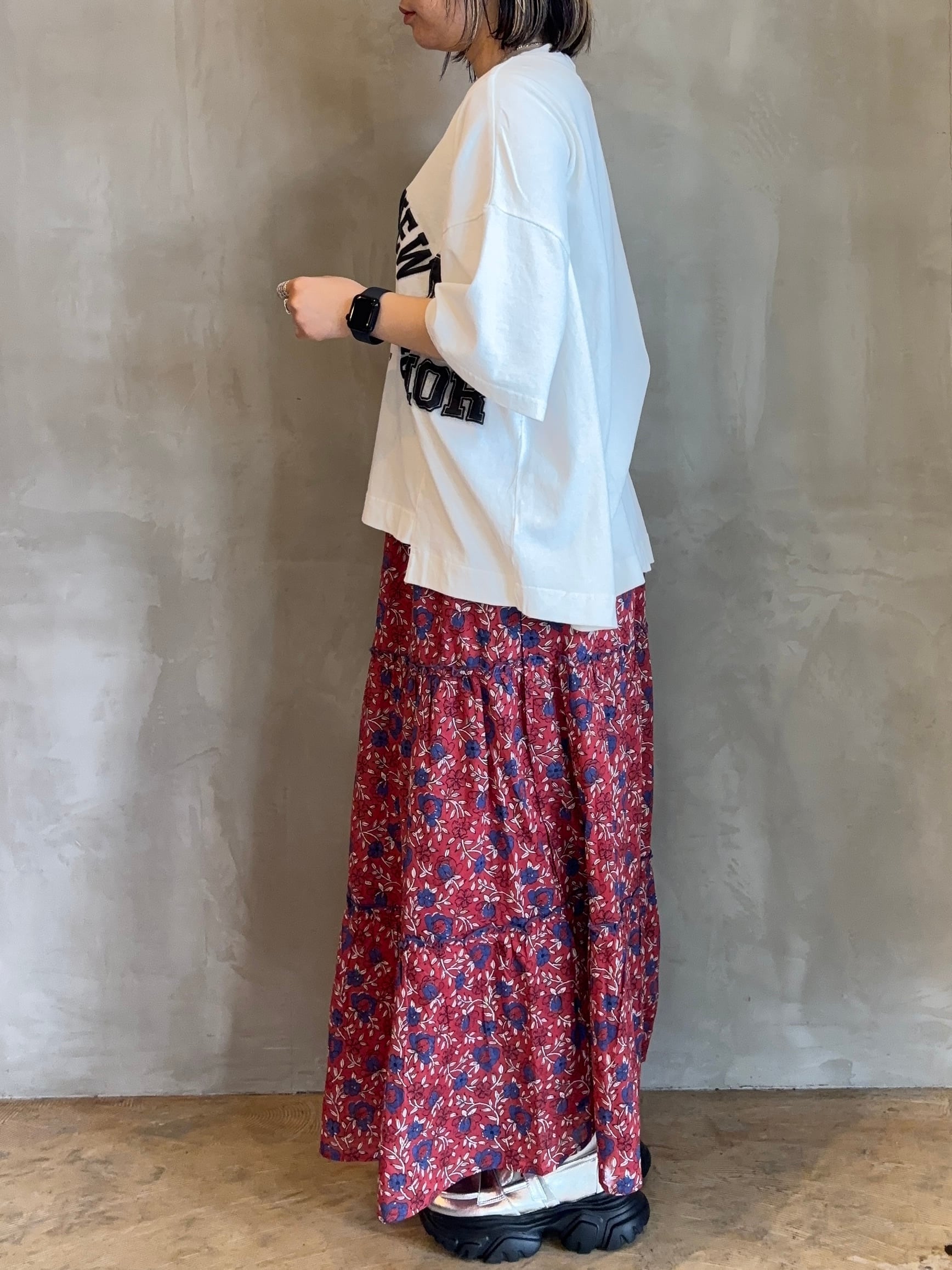 プリントに存在感があるので、シンプルなボトムと合わせるだけでスタイリングが決まります。