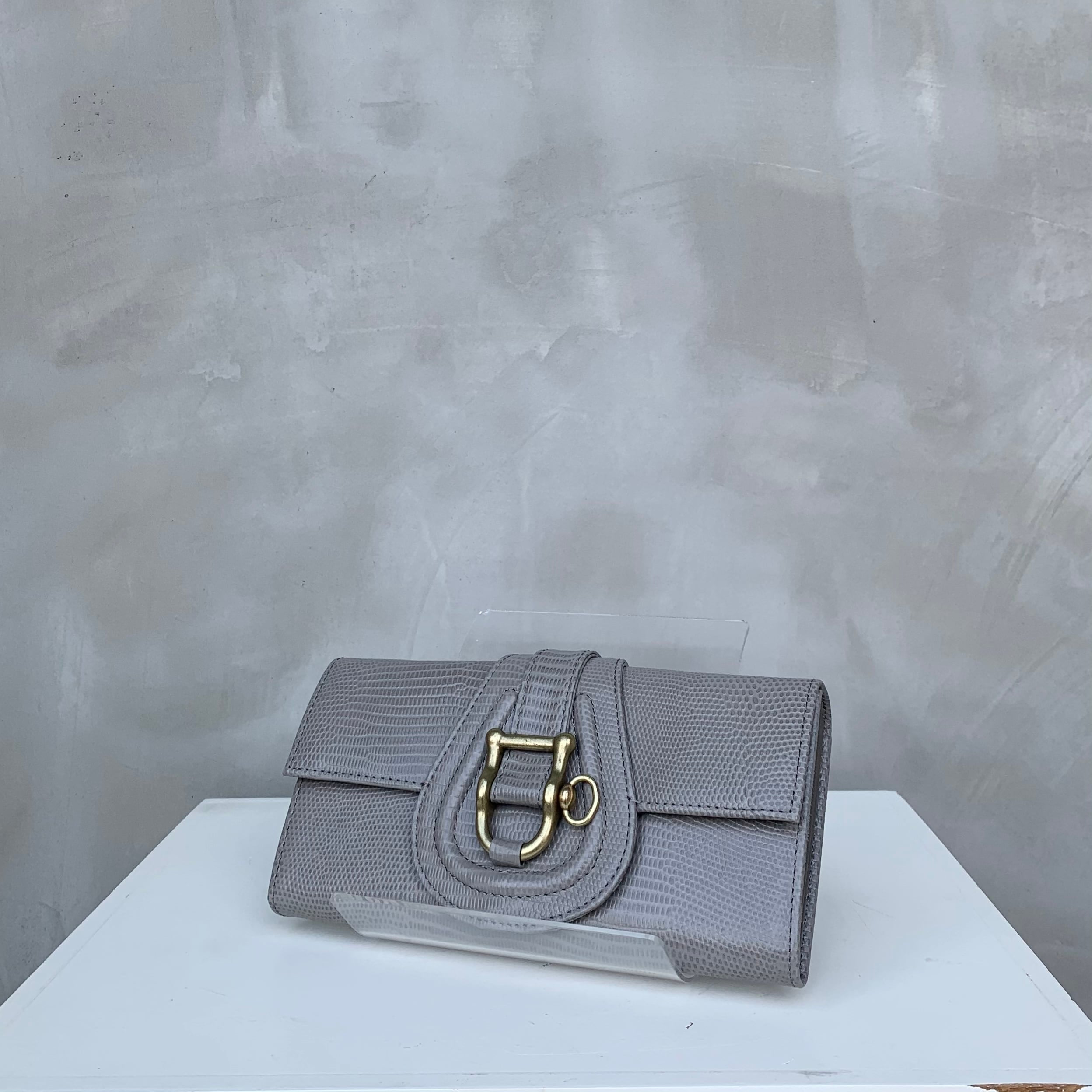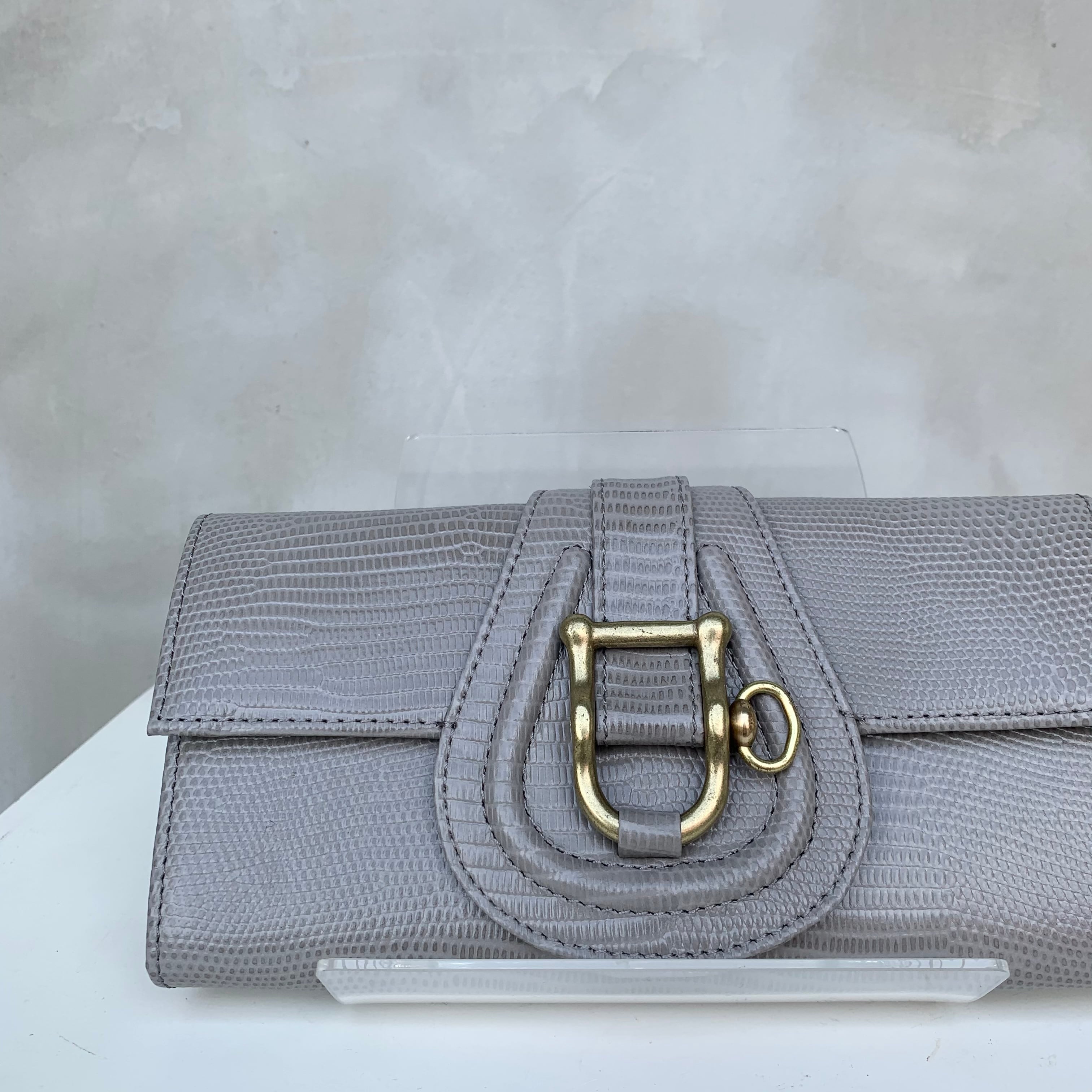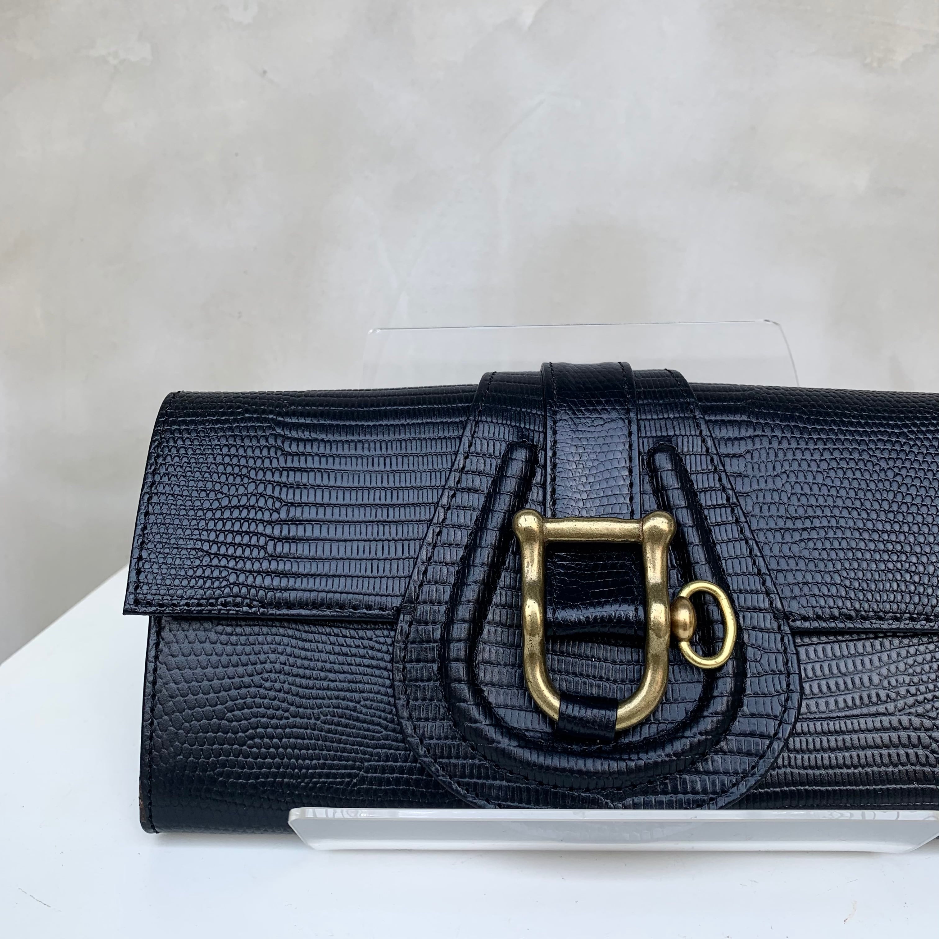馬蹄型のフラップと中央に配された真鍮金具がポイントの長財布。