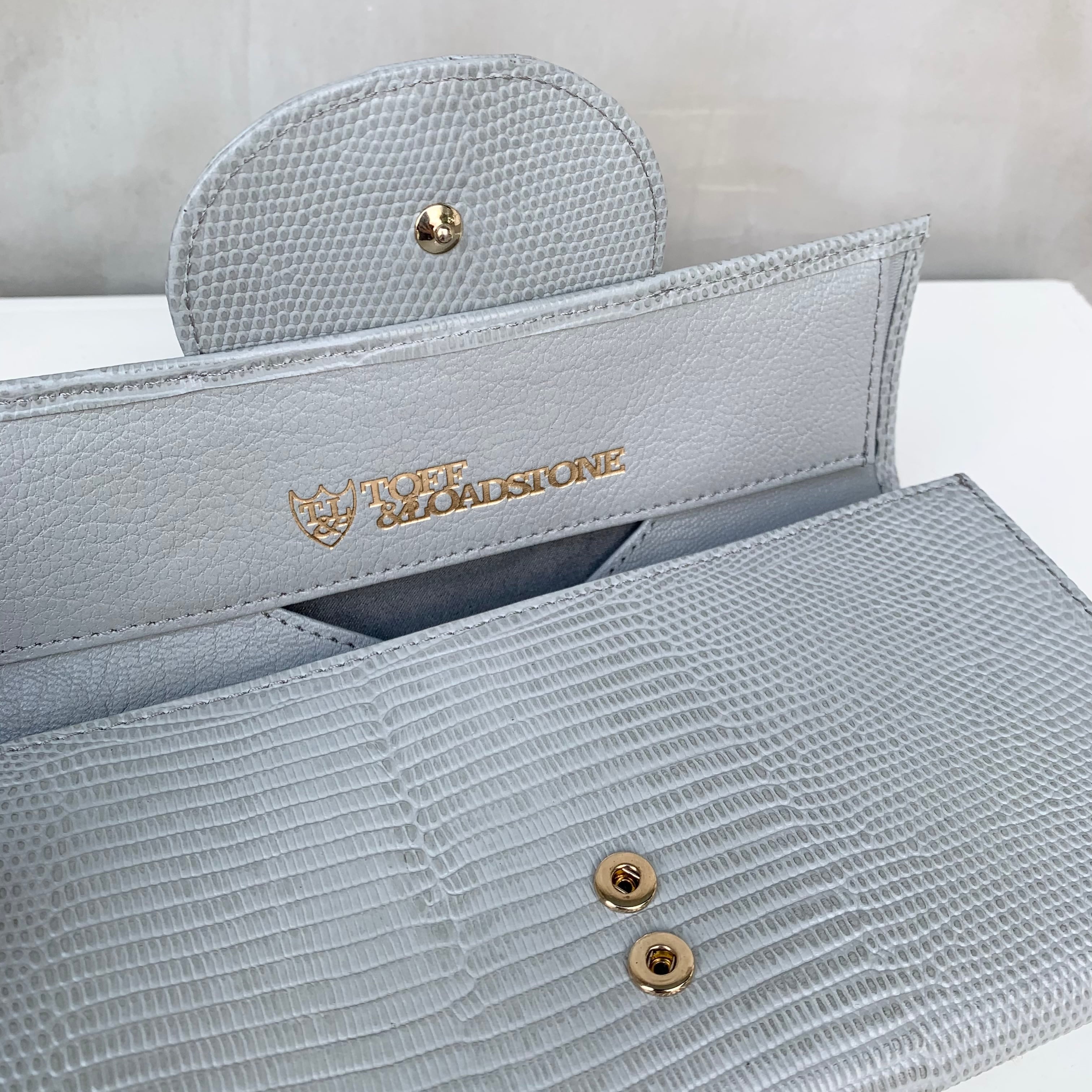 豊かな表情が魅力のリザードの型押し革は、染色をした後に、手塗りで調整をしながら陰影をつけていき、さらに上から透明なフィルムをラミネートするという手間のかかった素材です。