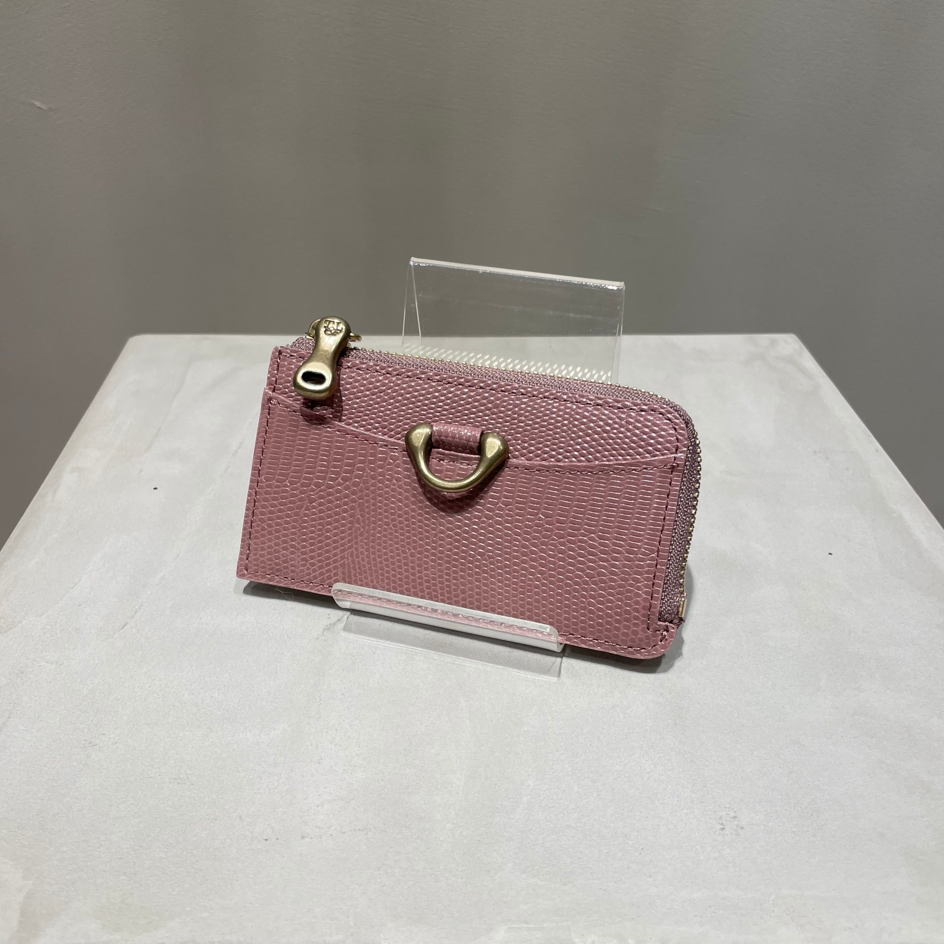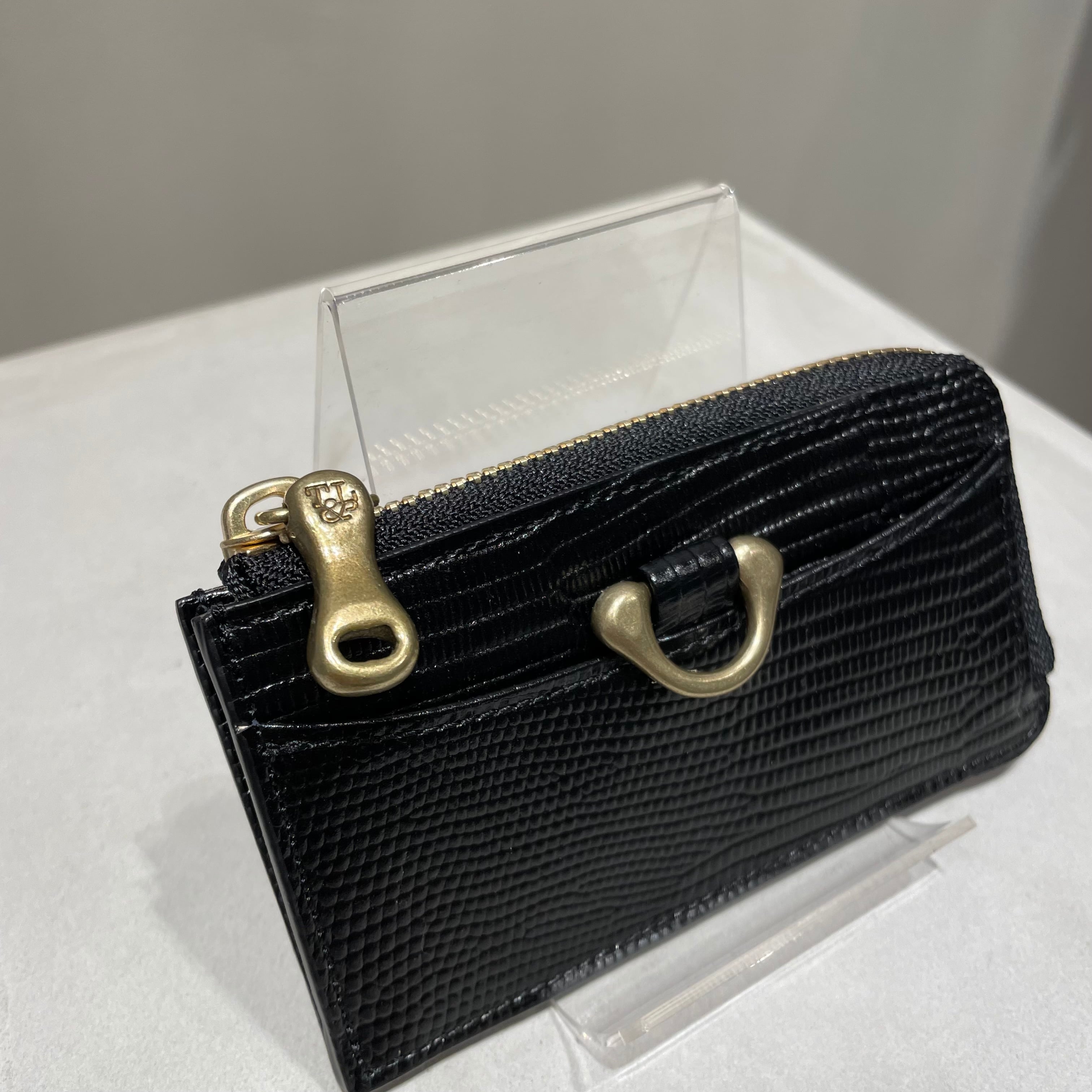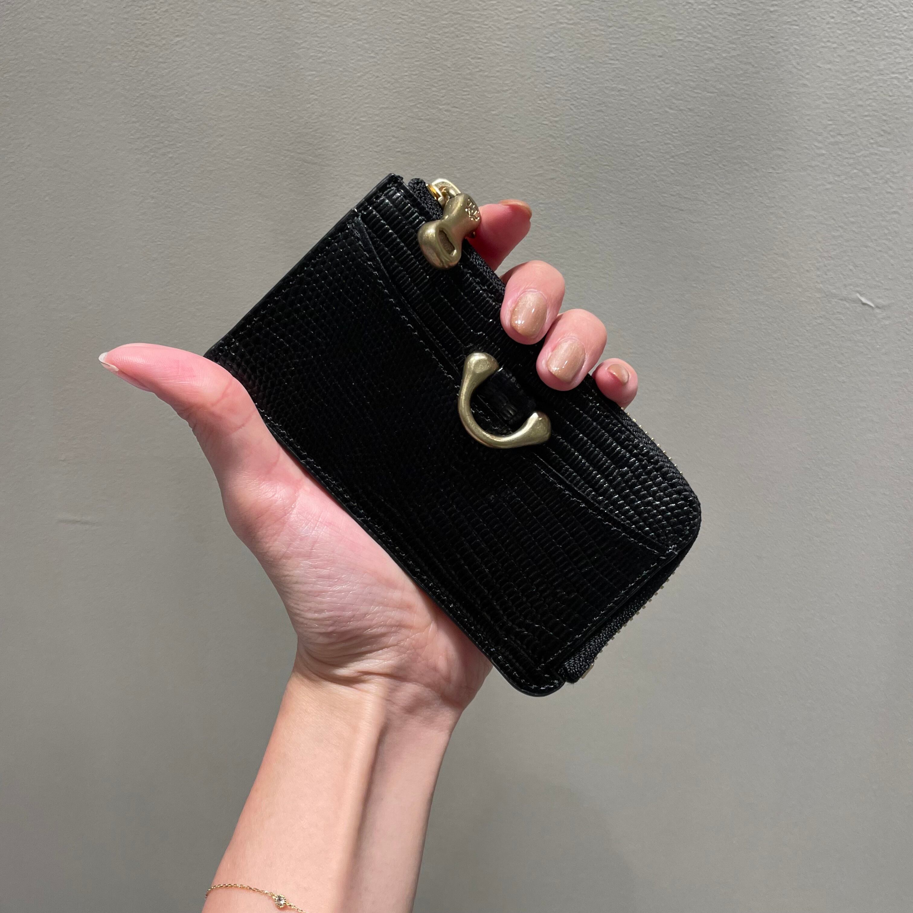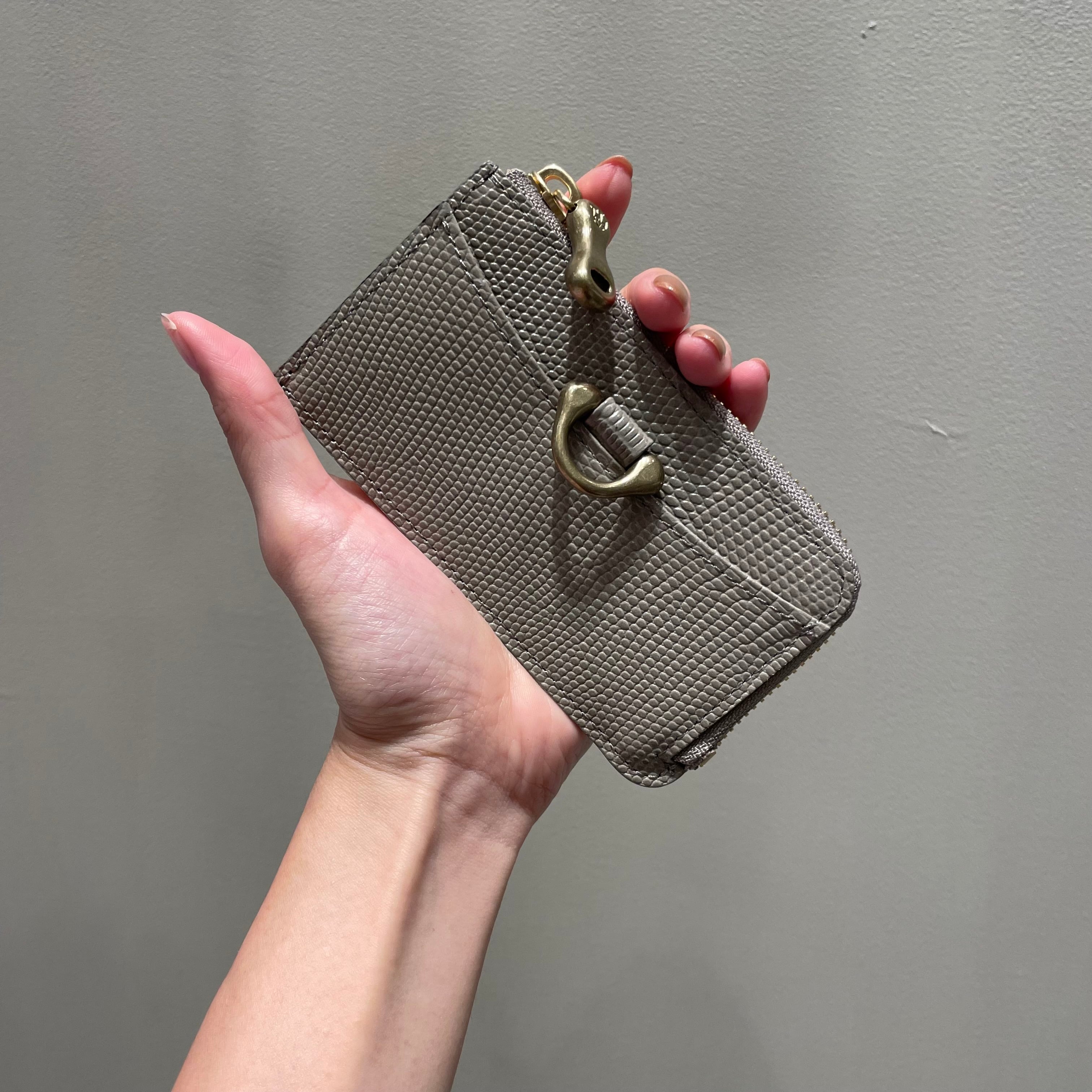 調色された良質なリザード型押し革と真鍮パーツが、コンパクトながら上品な佇まいを感じさせます。