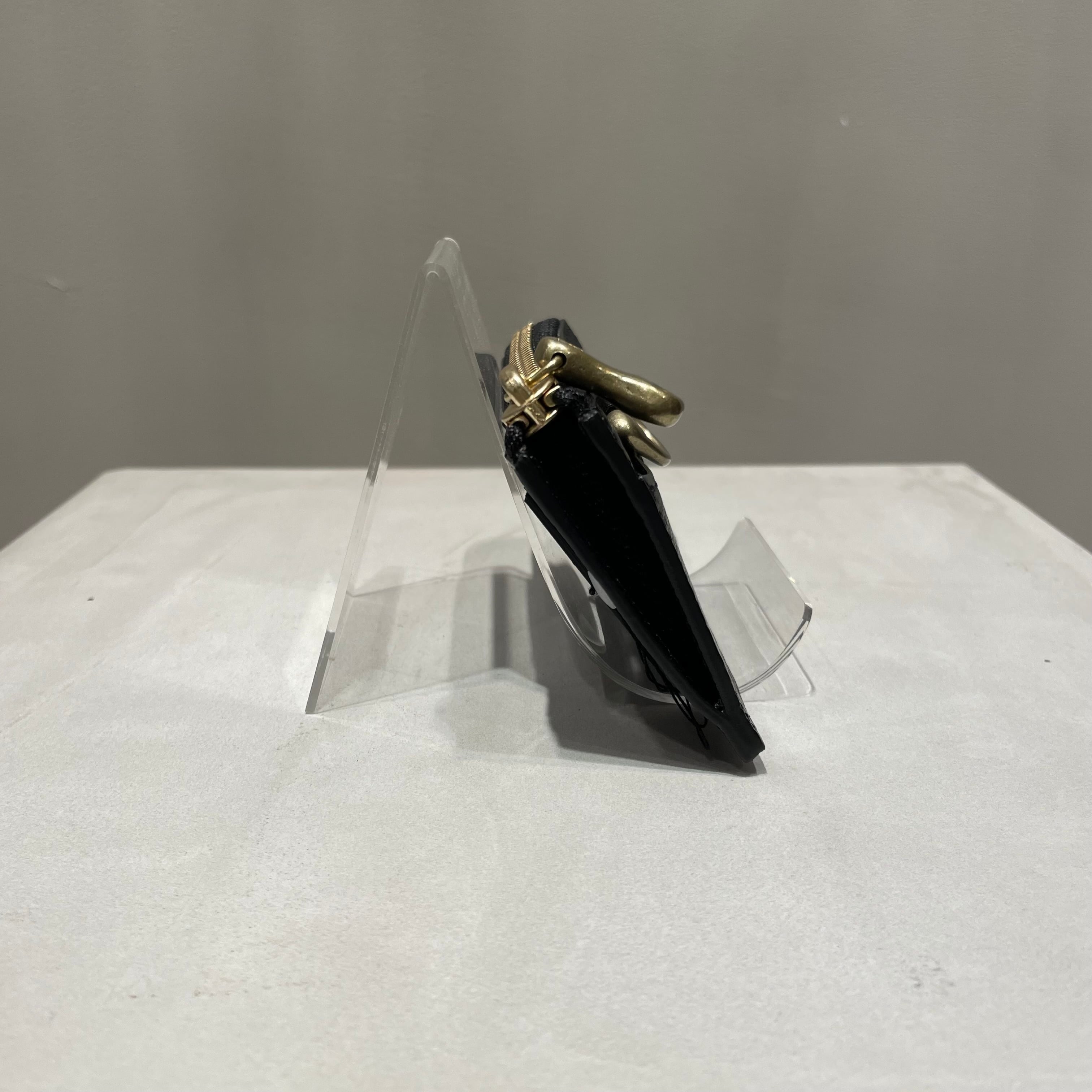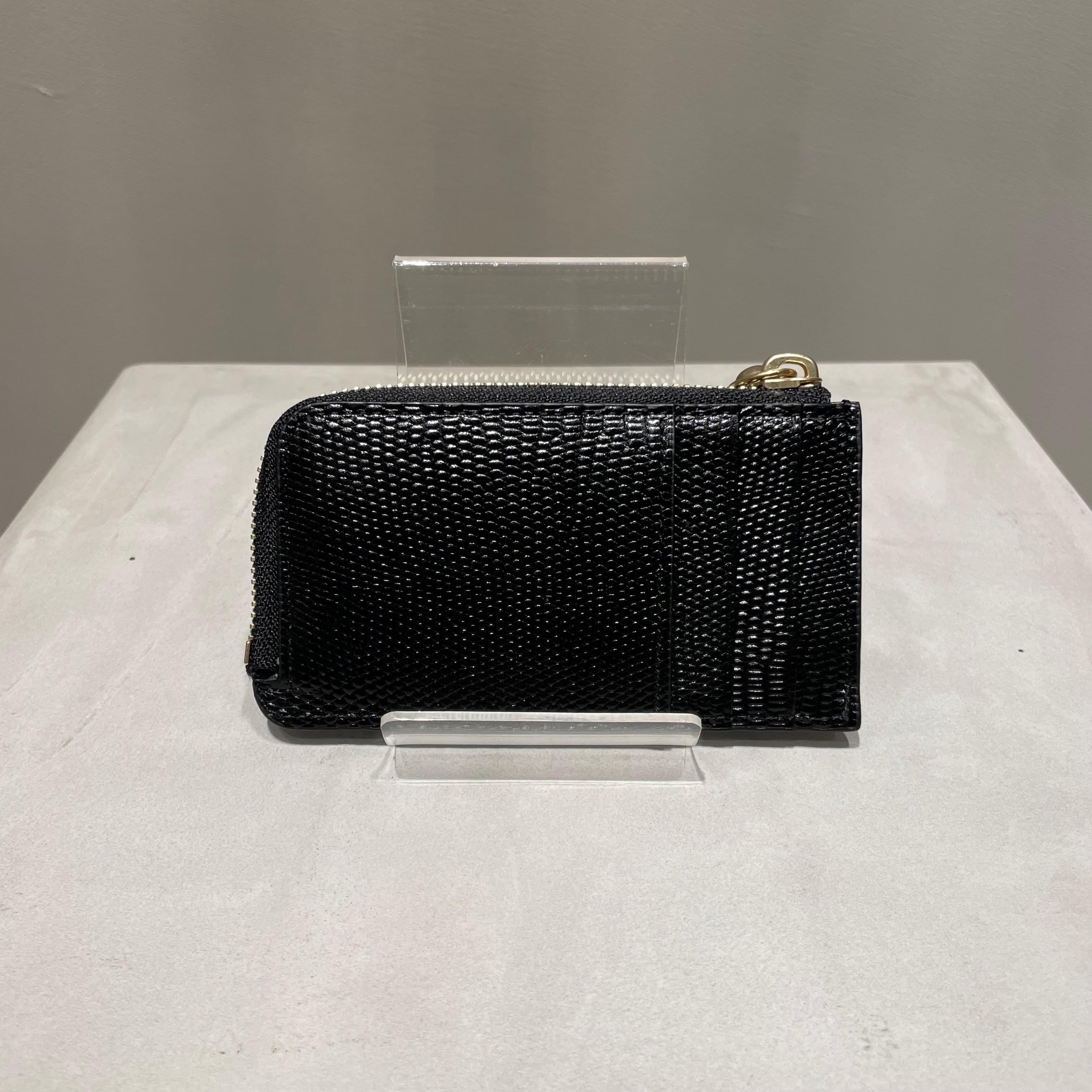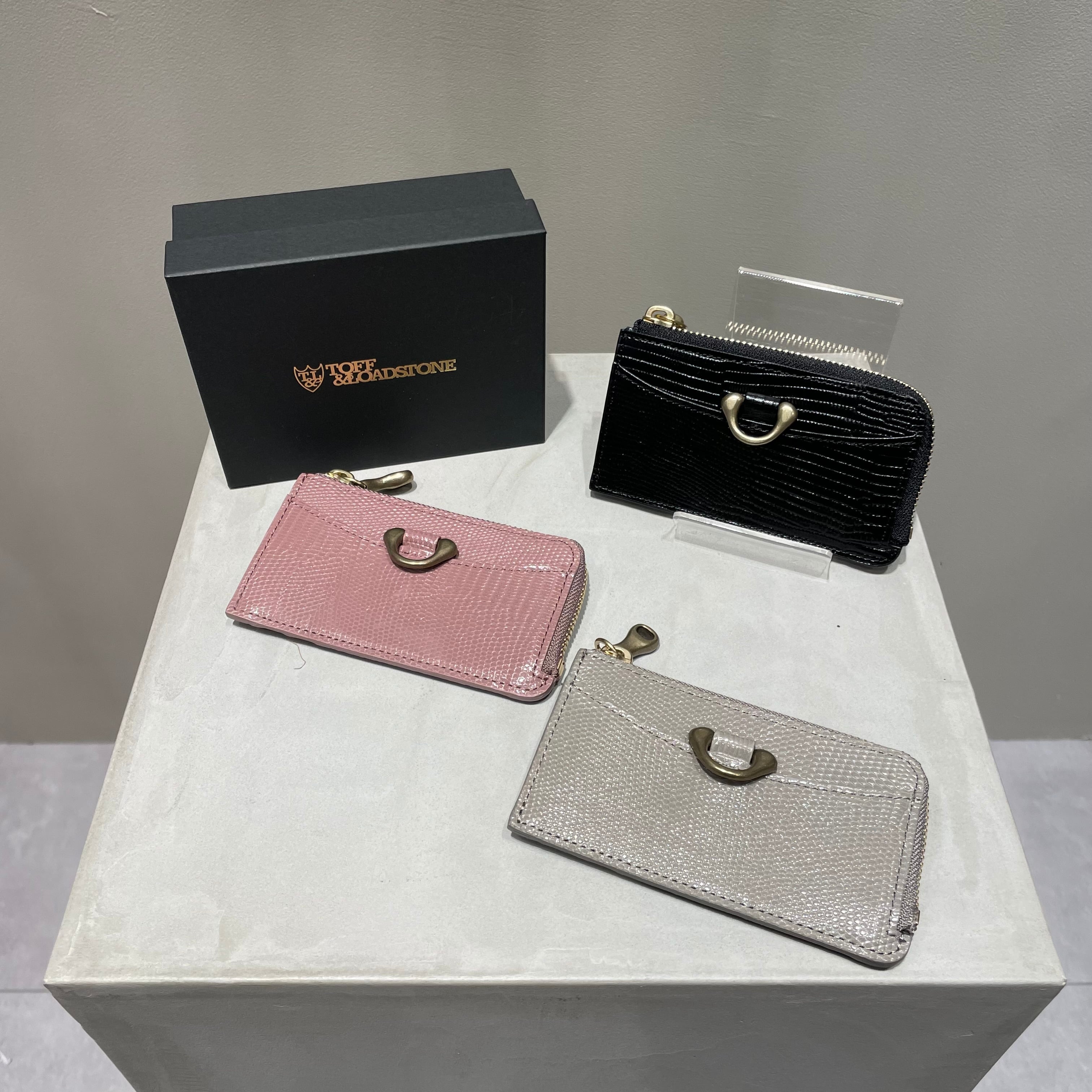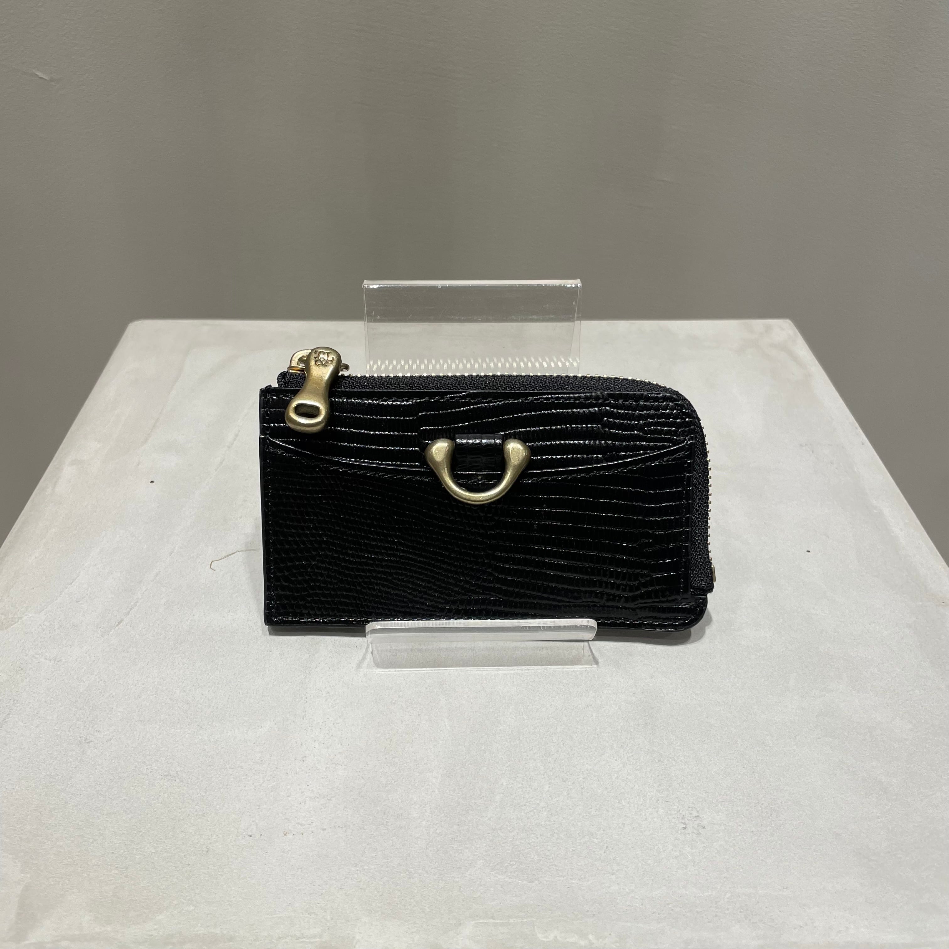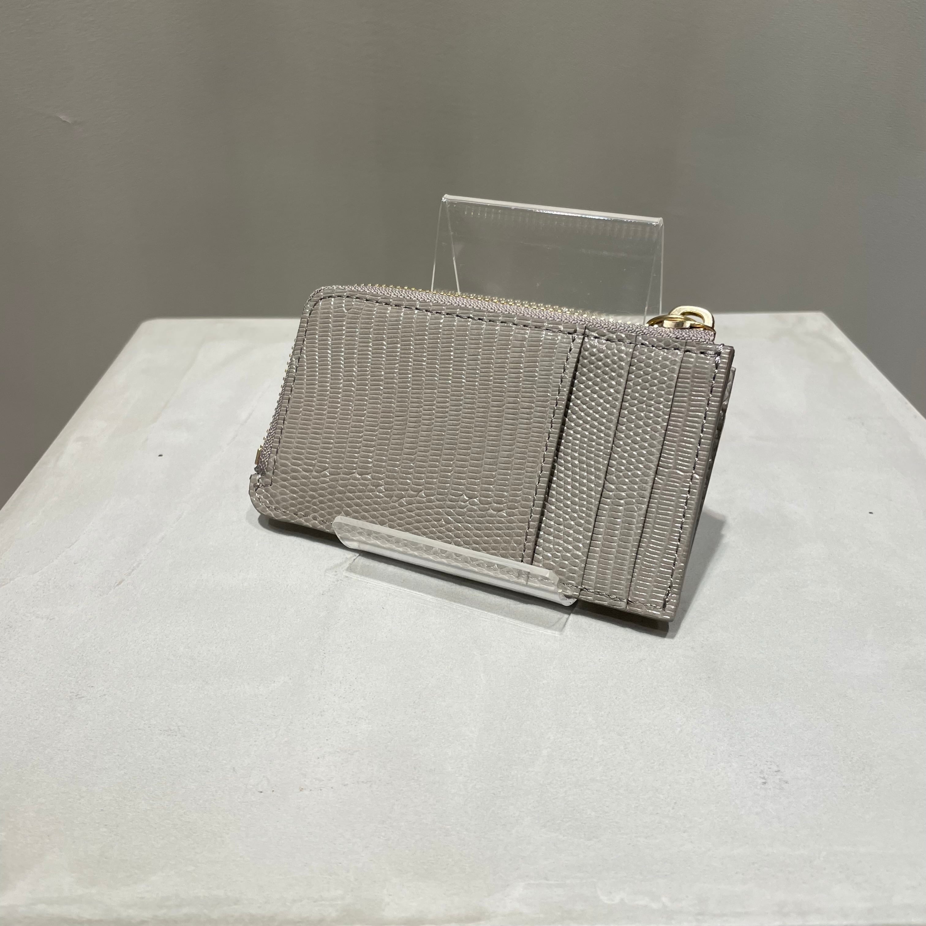 調色された良質なリザード型押し革と真鍮パーツが、コンパクトながら上品な佇まいを感じさせます。