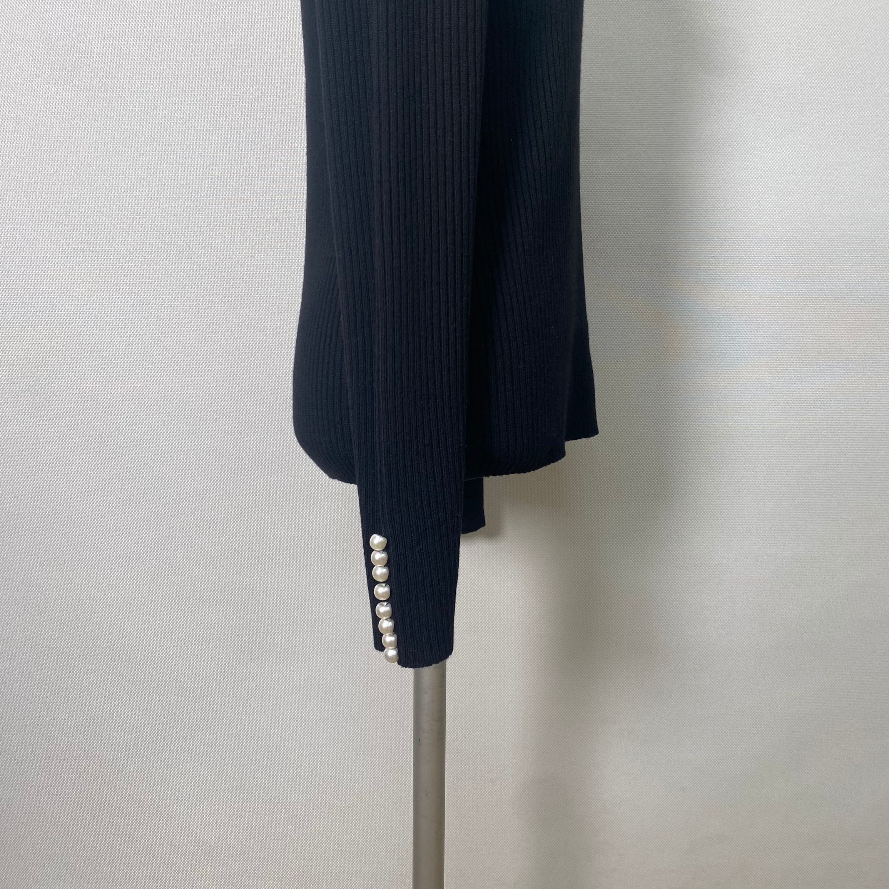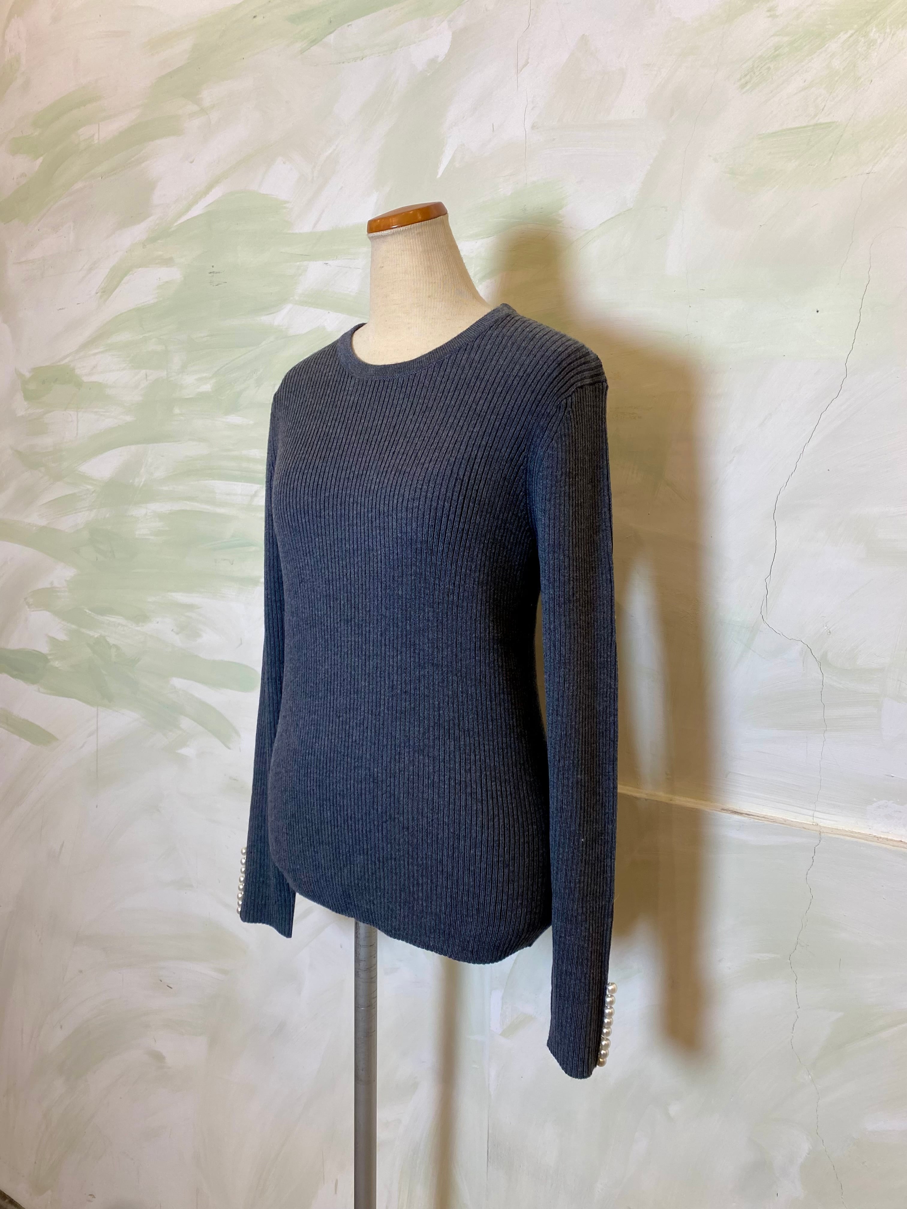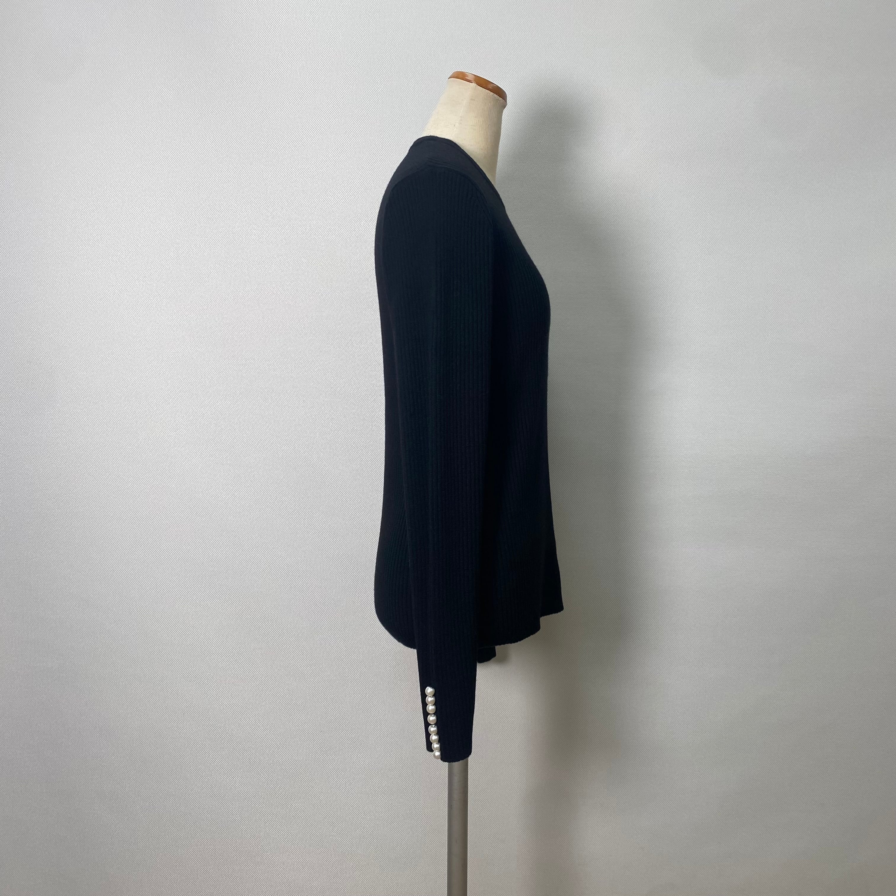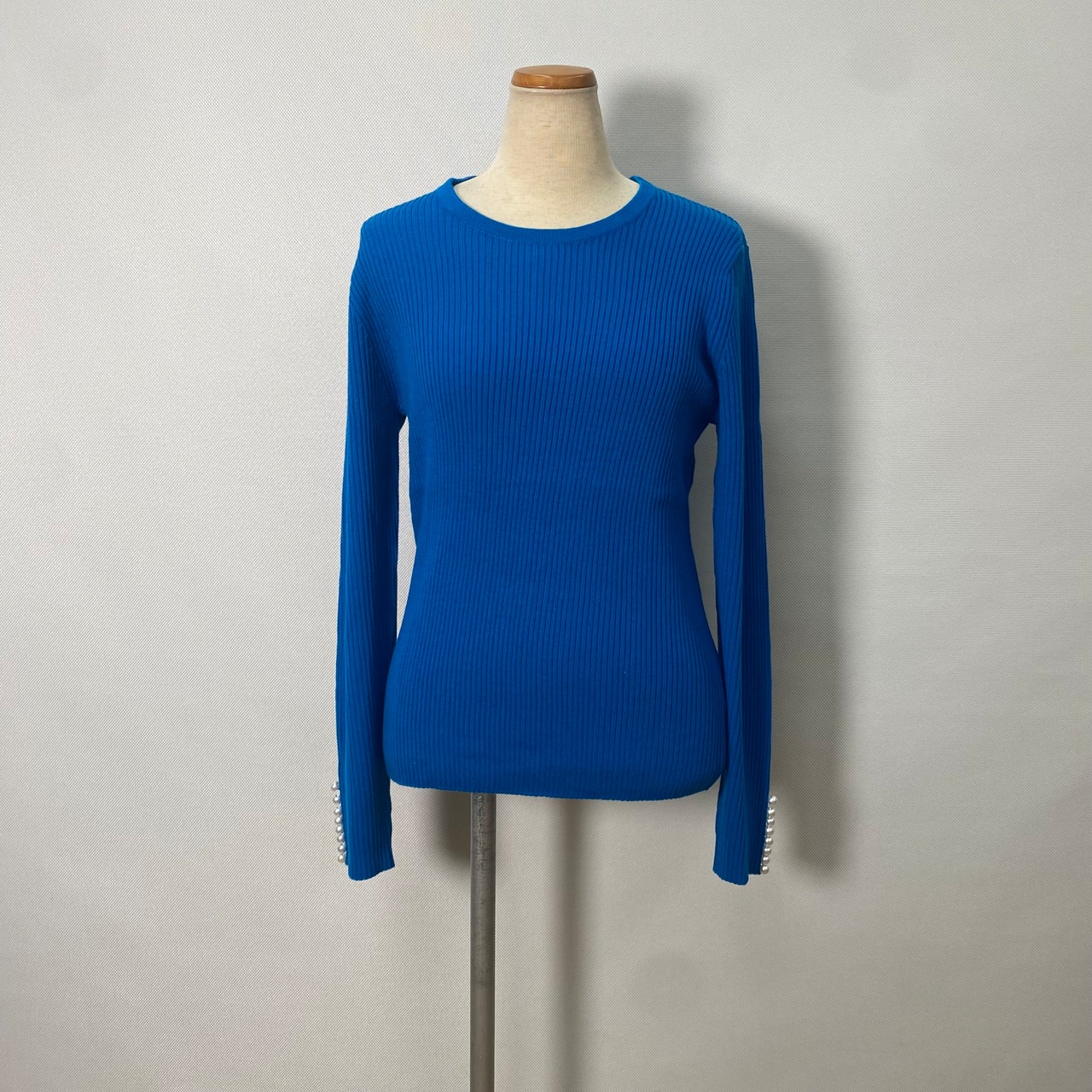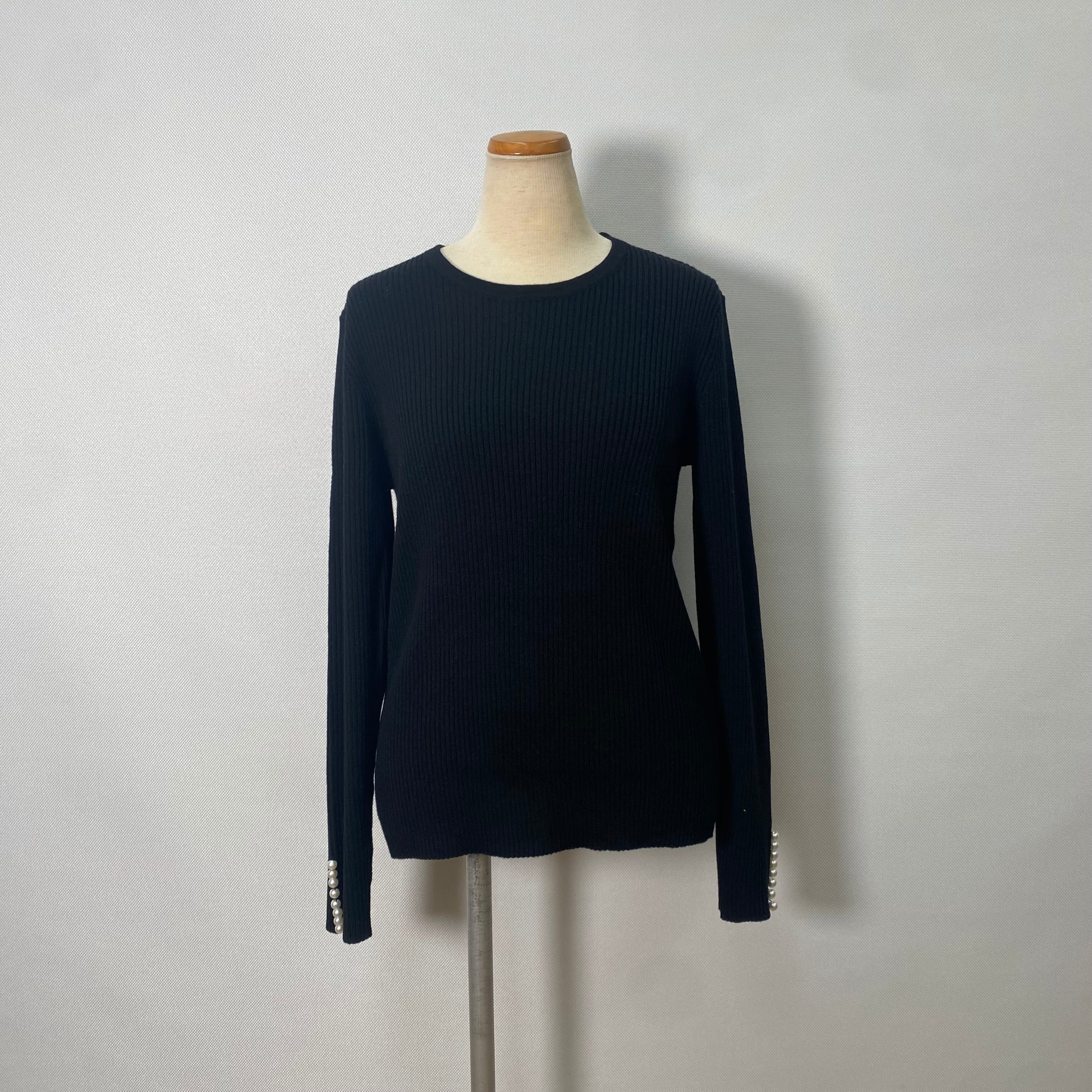 シンプルながら華やかさを演出する、LILLY LYNQUEの袖パールクルーネックリブニットが登場!